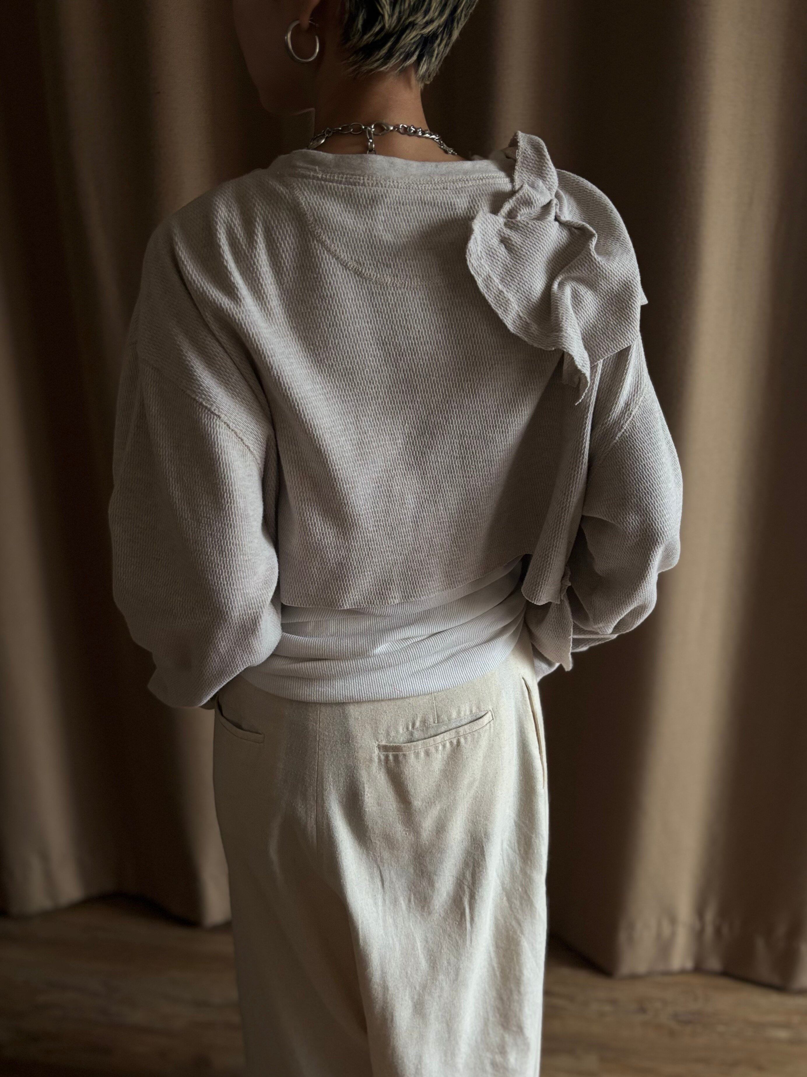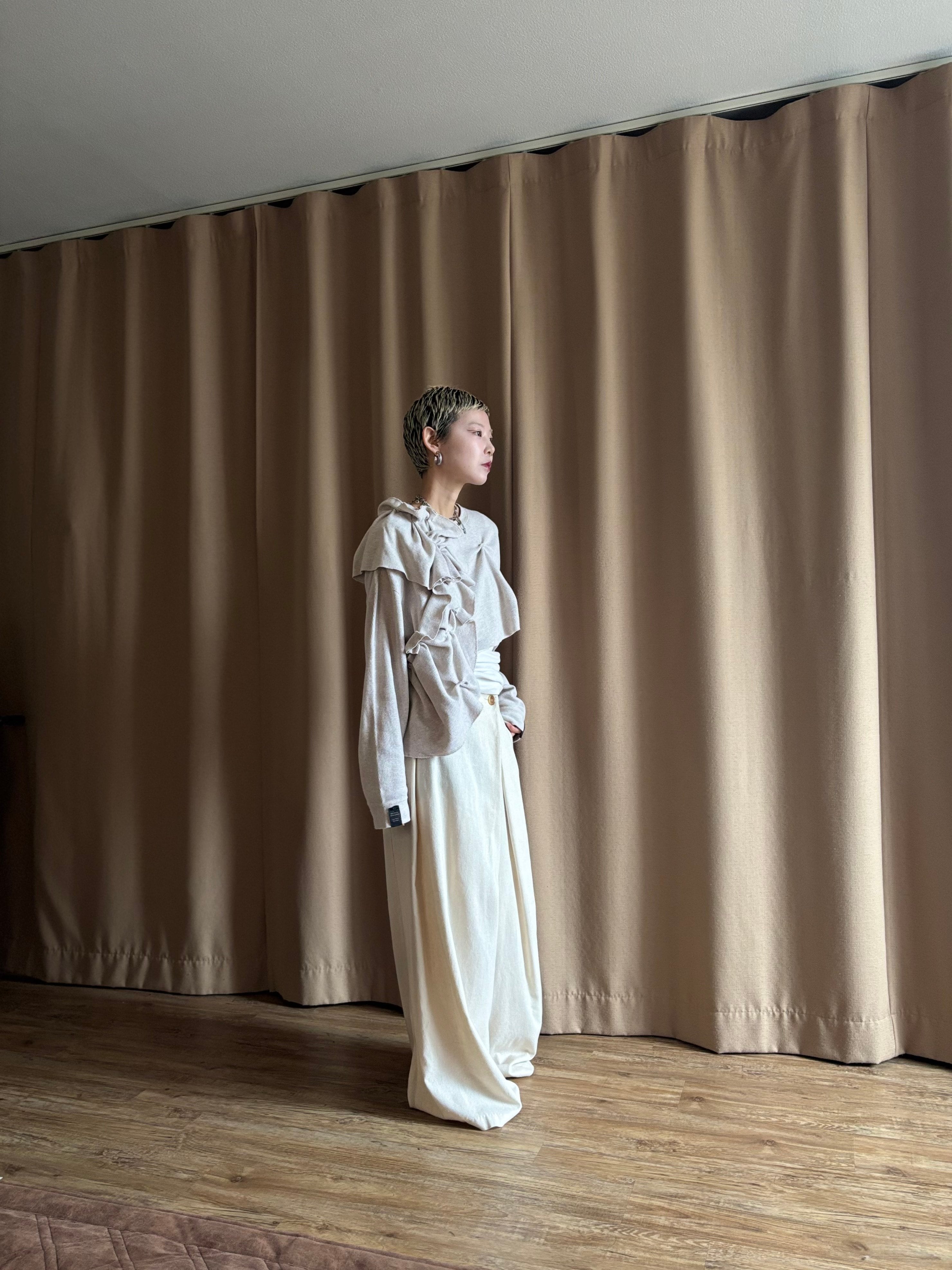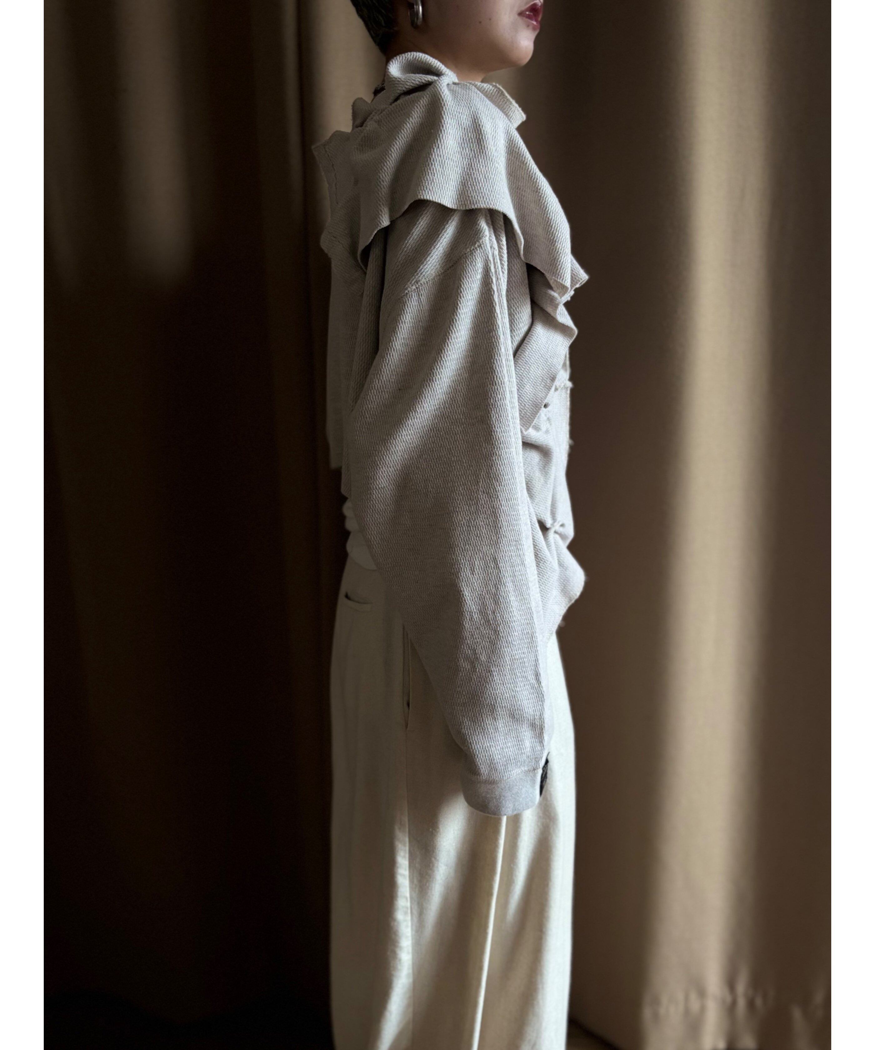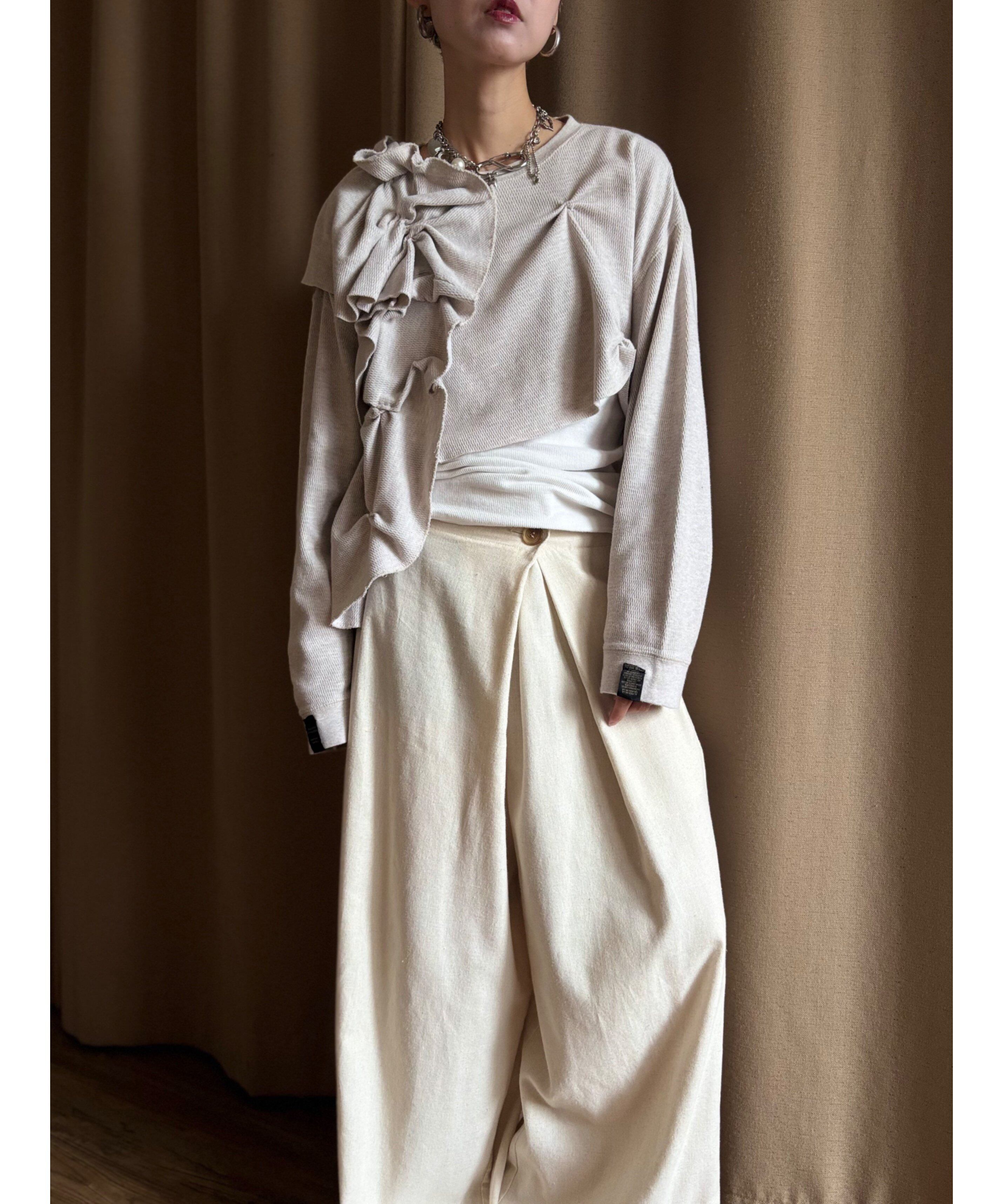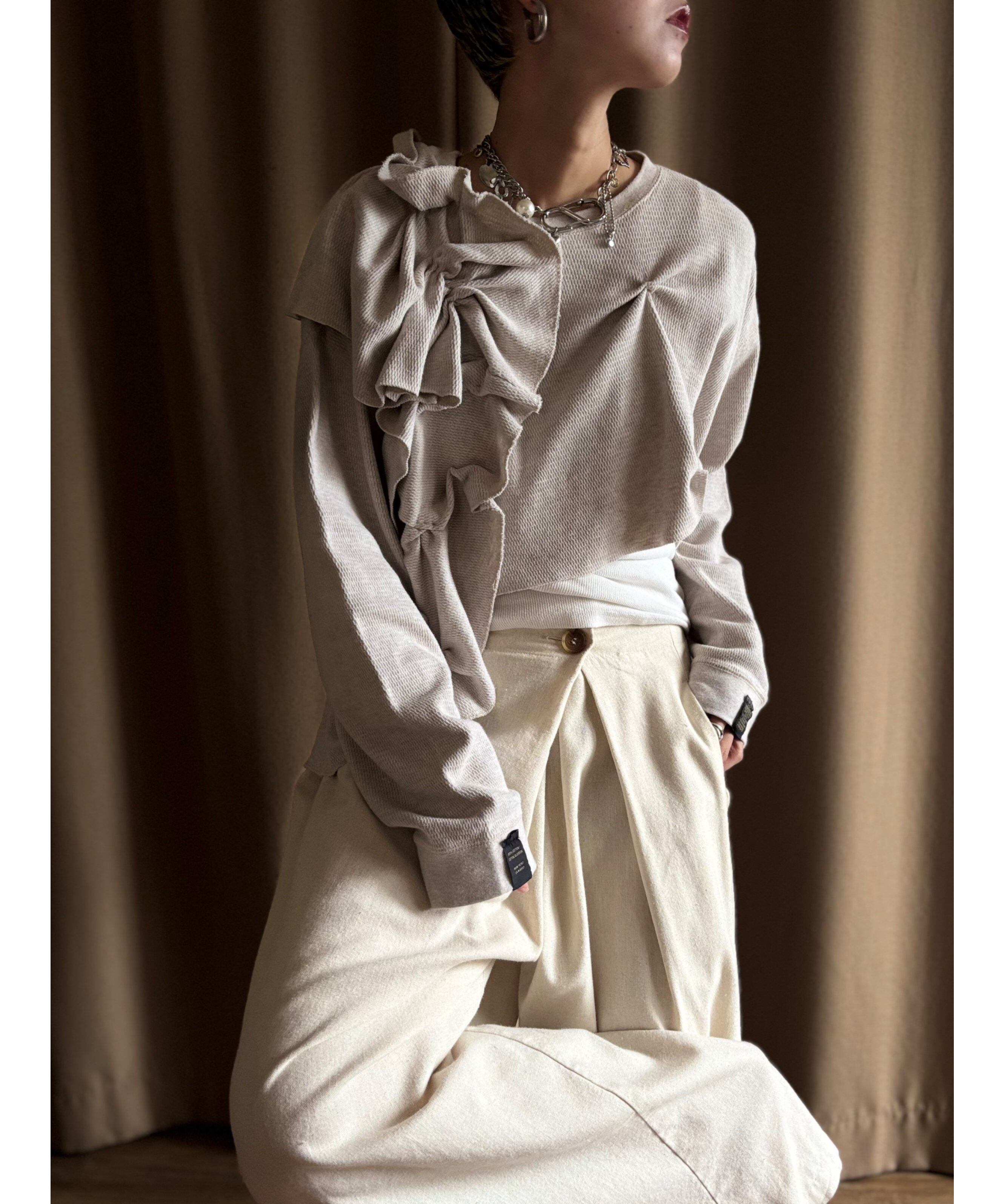 柔らかなサーマル生地が持つカジュアルさに、デザイナーの手仕事によって生み出された構築的なフリルギャザーが唯一無二。