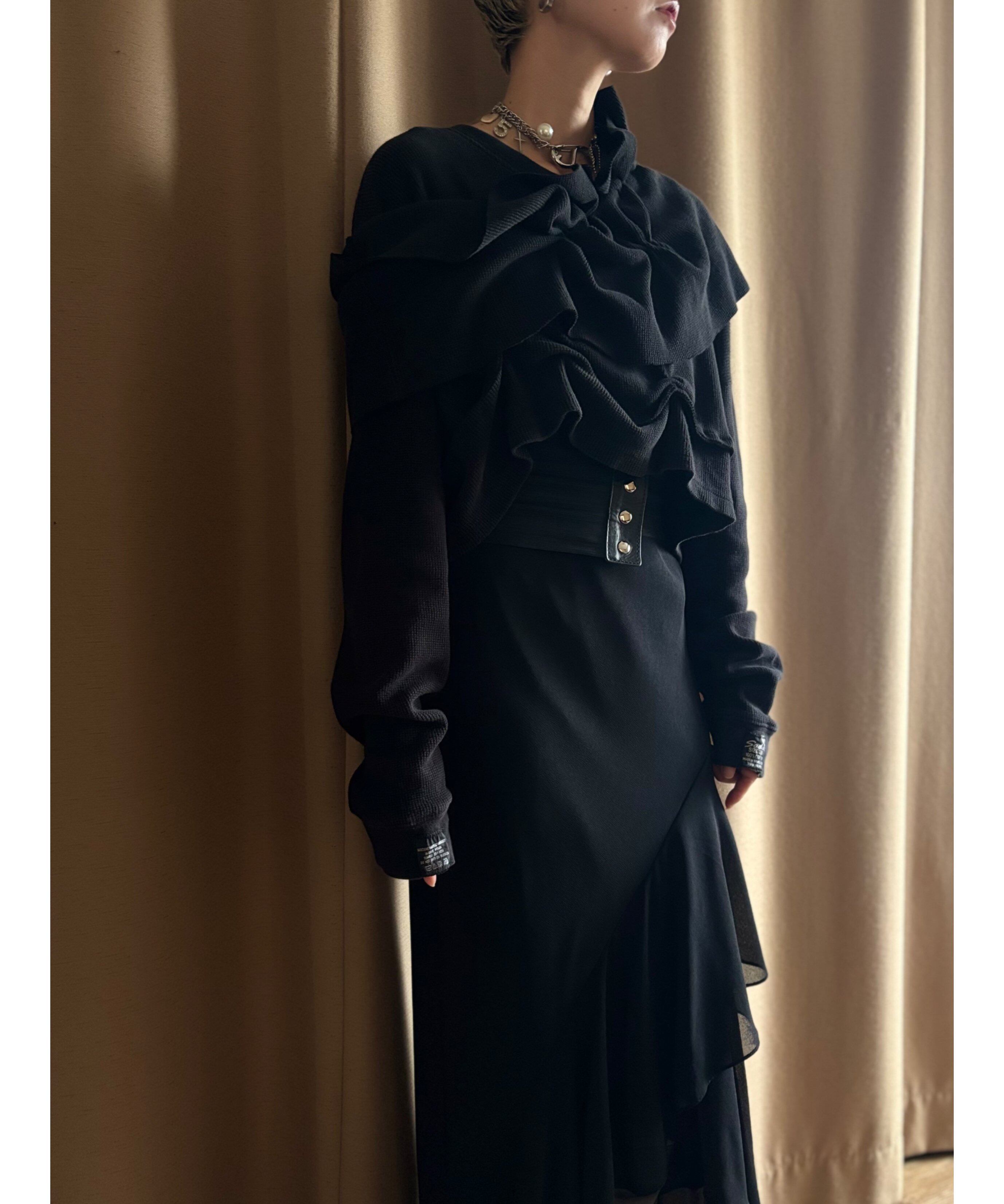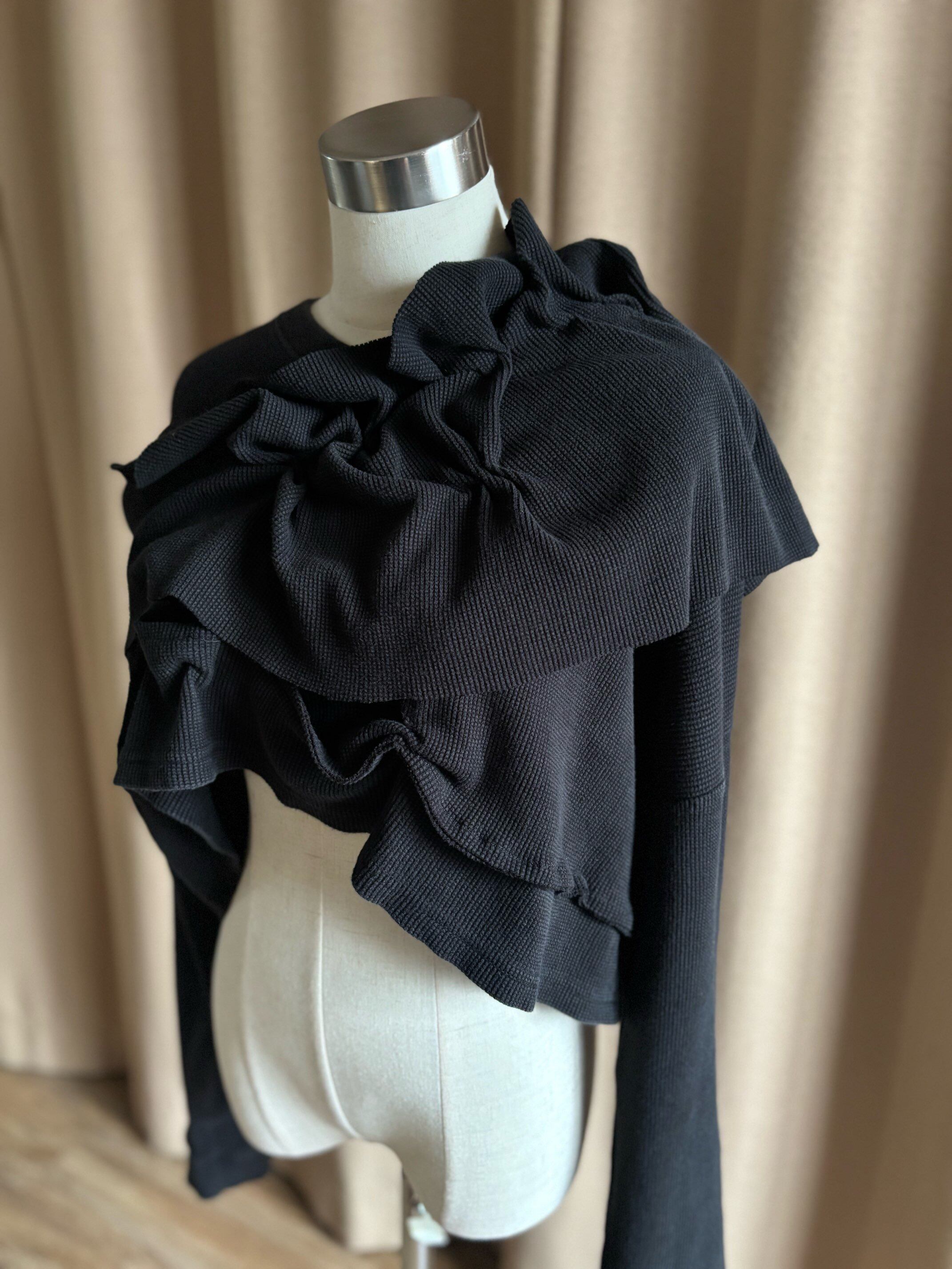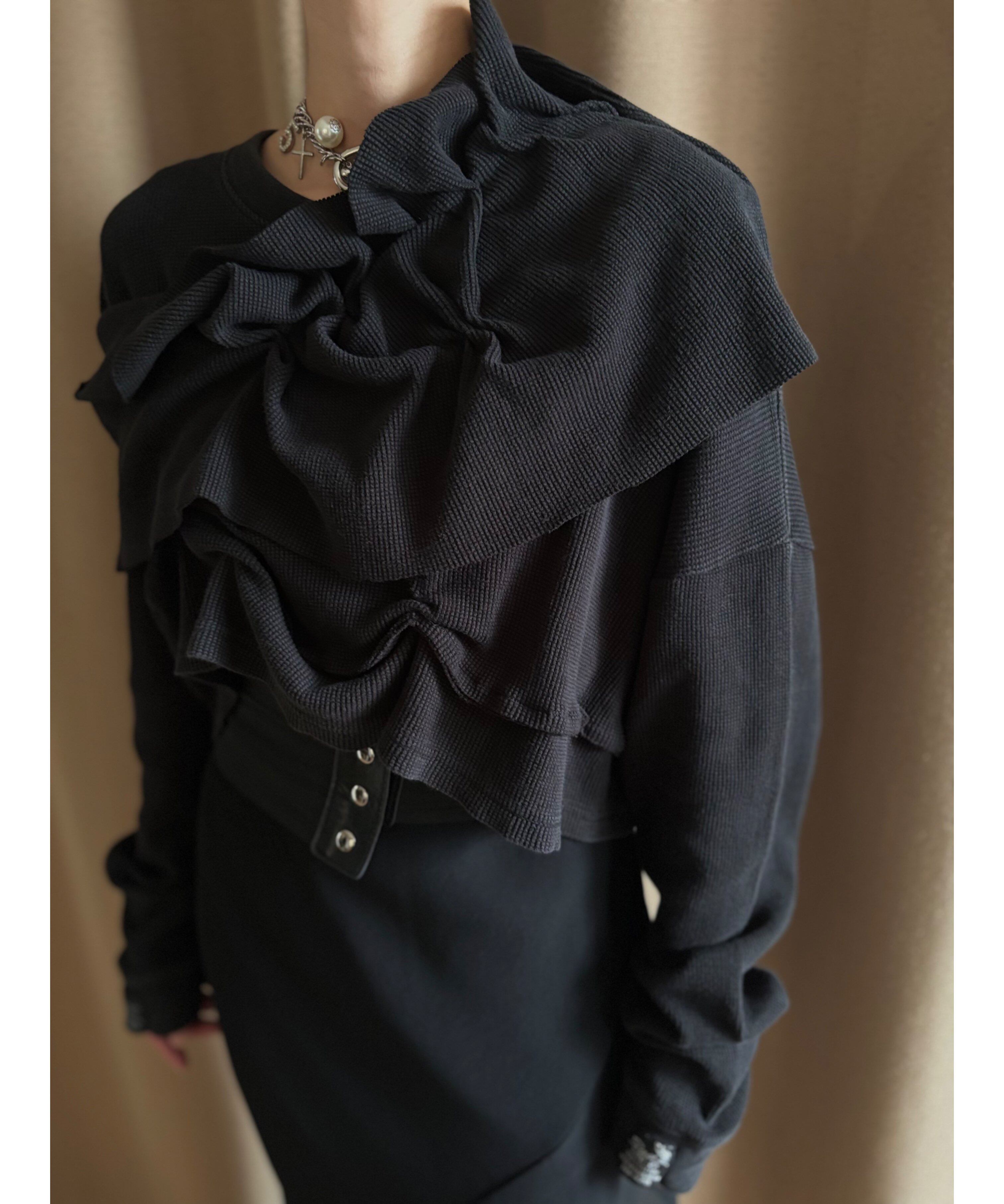 サーマルならではのテクスチャーと、構築的なフリルギャザーが織りなすコンテンポラリーな造形美。
