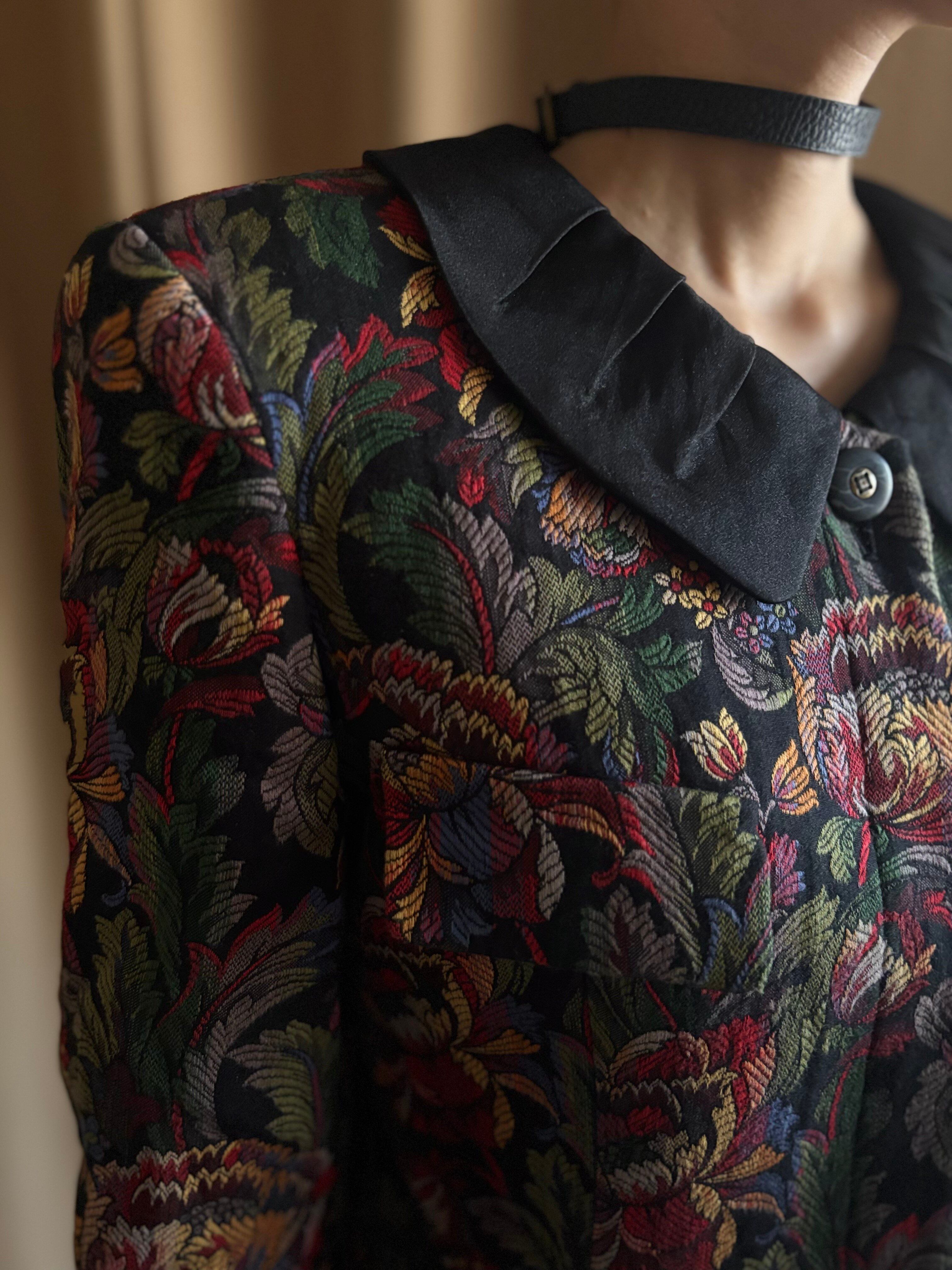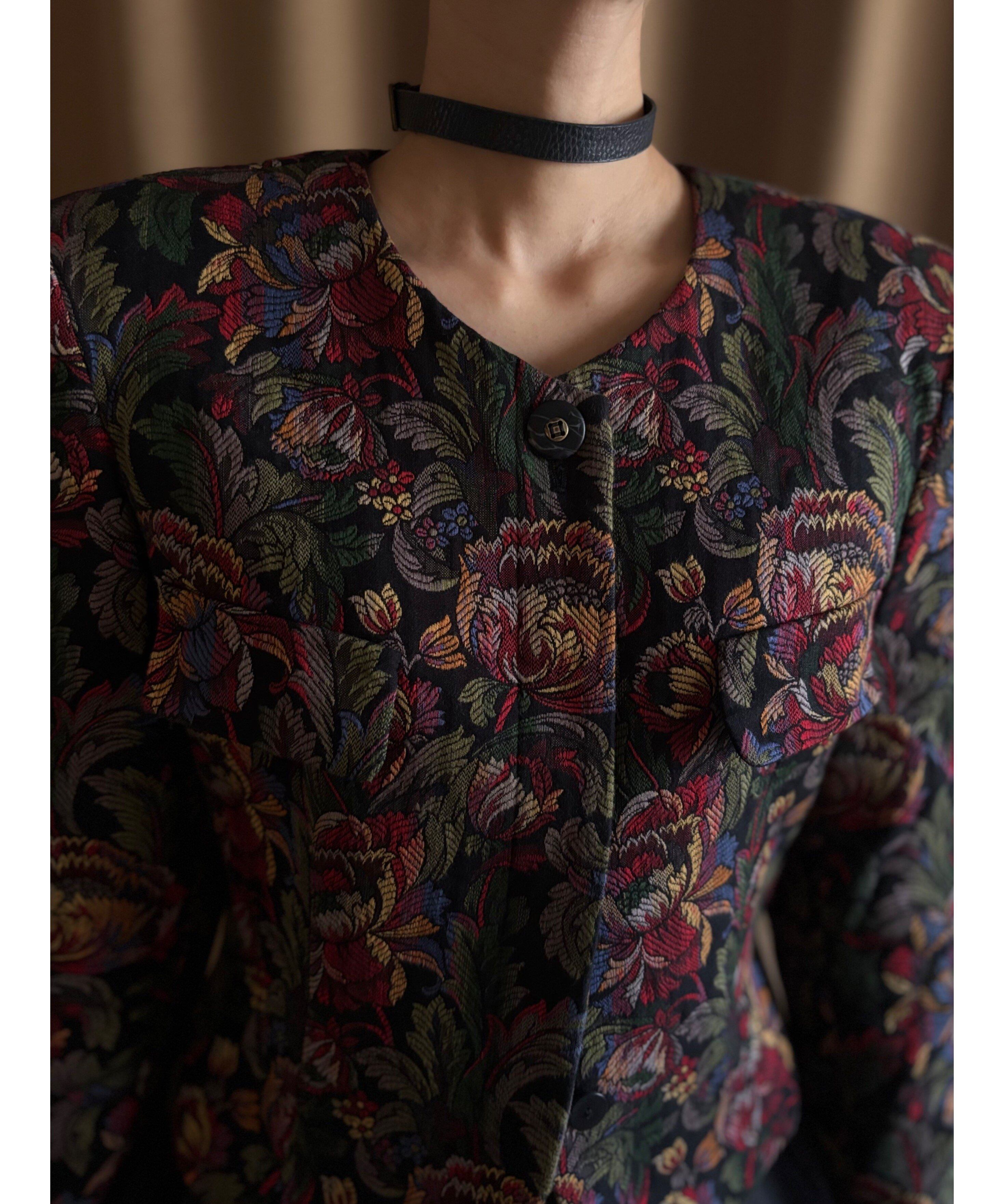 ヴィンテージ調のフラワー刺繍に、ショート丈×パワーショルダーのシルエットでトレンドライクな着こなしに◎