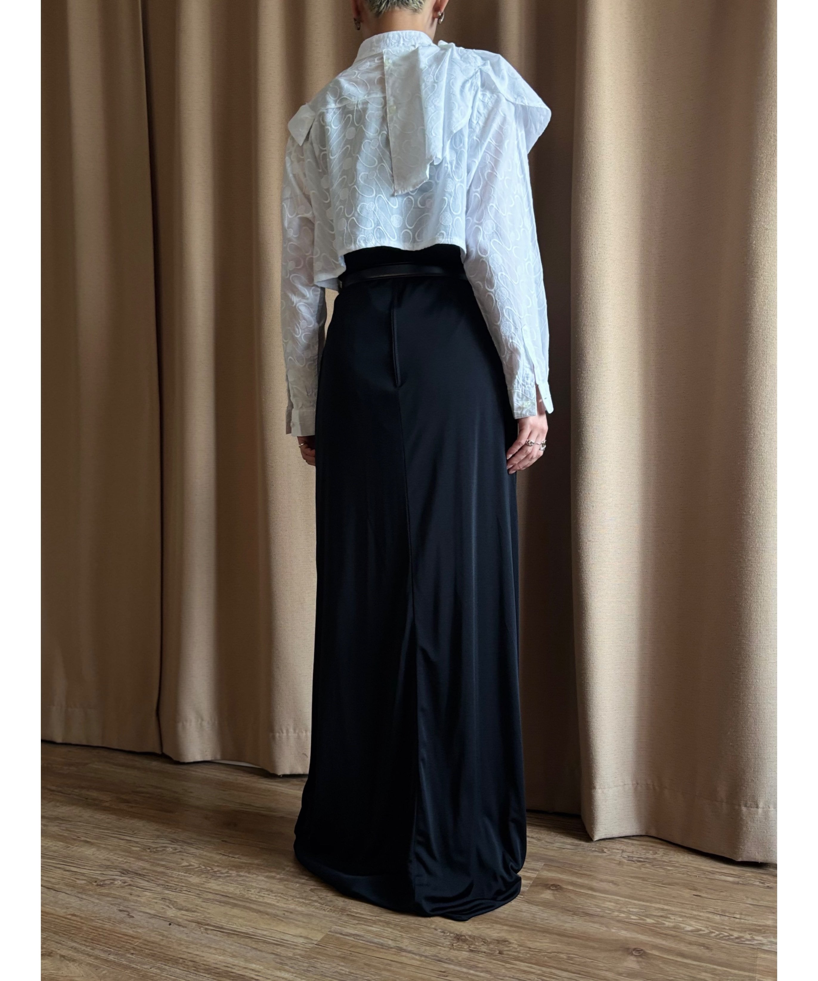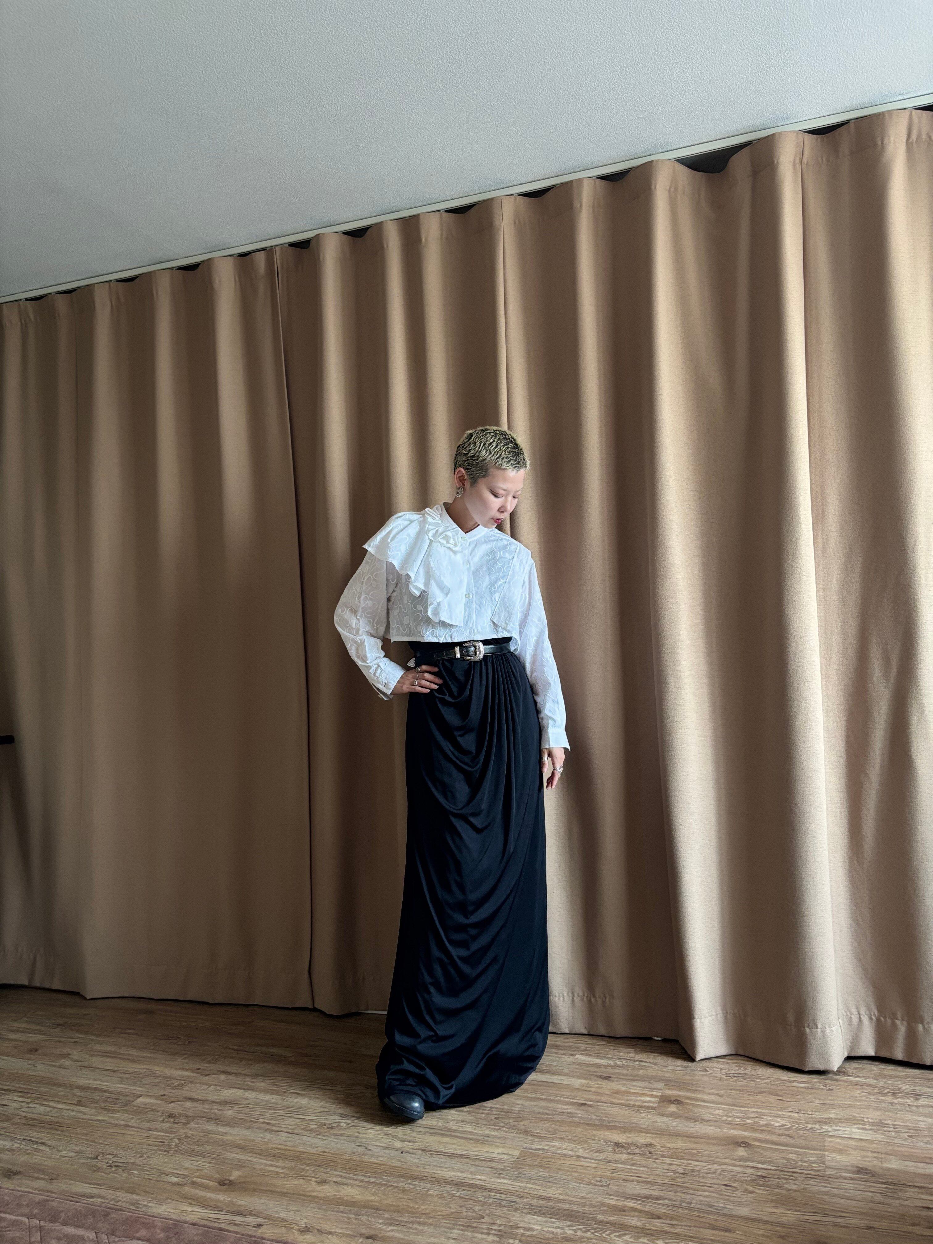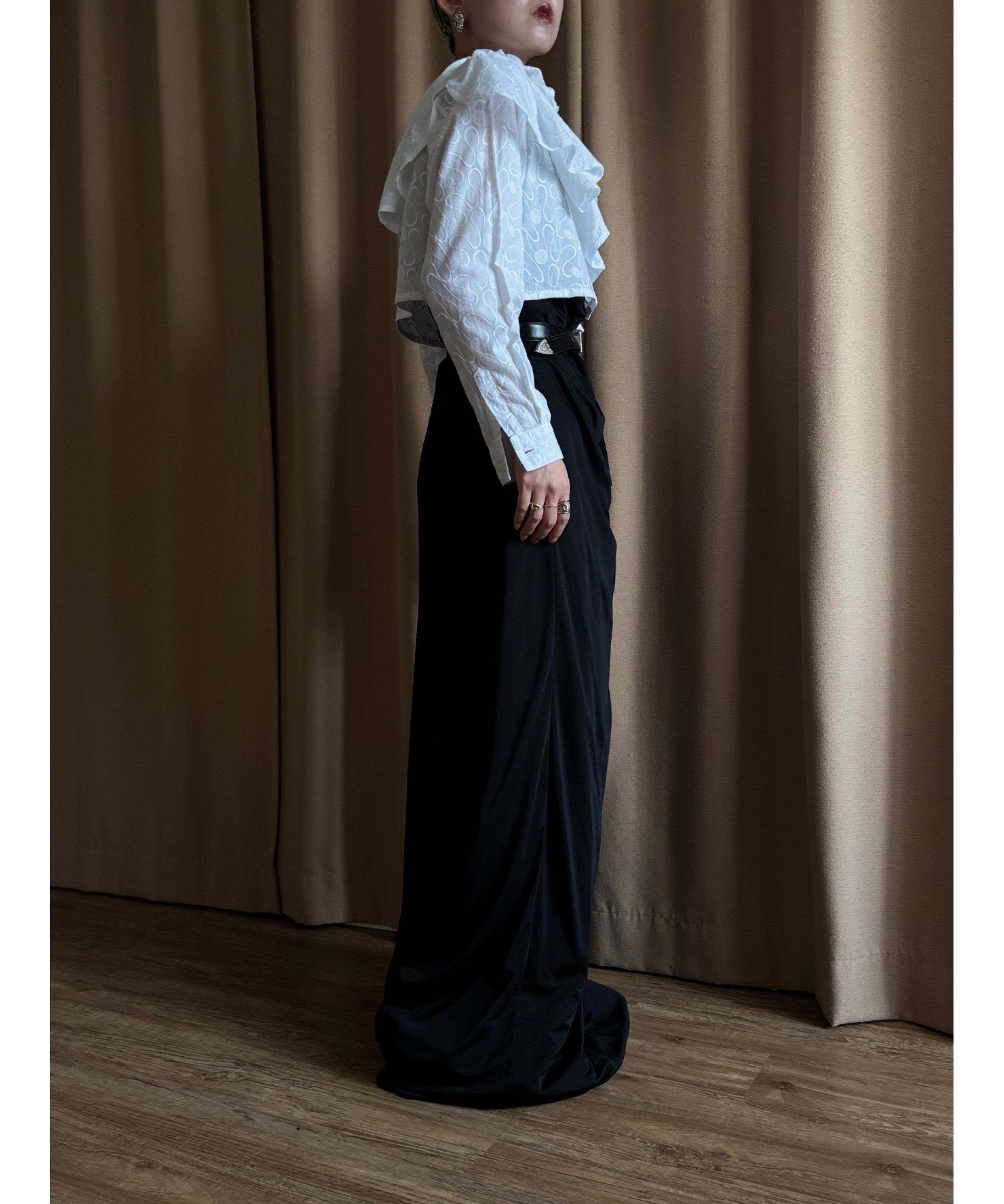 流れるように施されたアシンメトリーフリルは、デザイナーの感覚が垣間見える唯一無二のアートな感性。