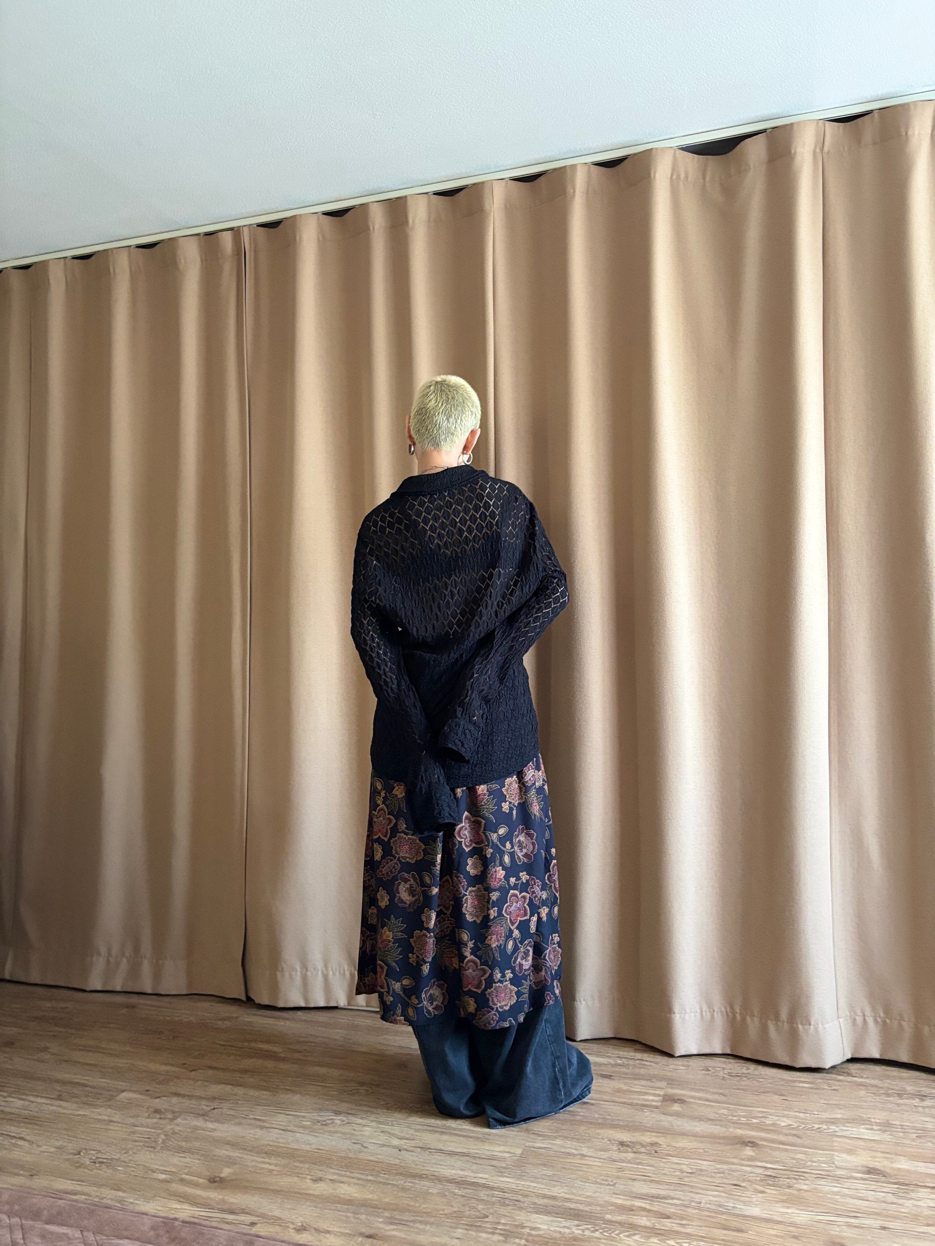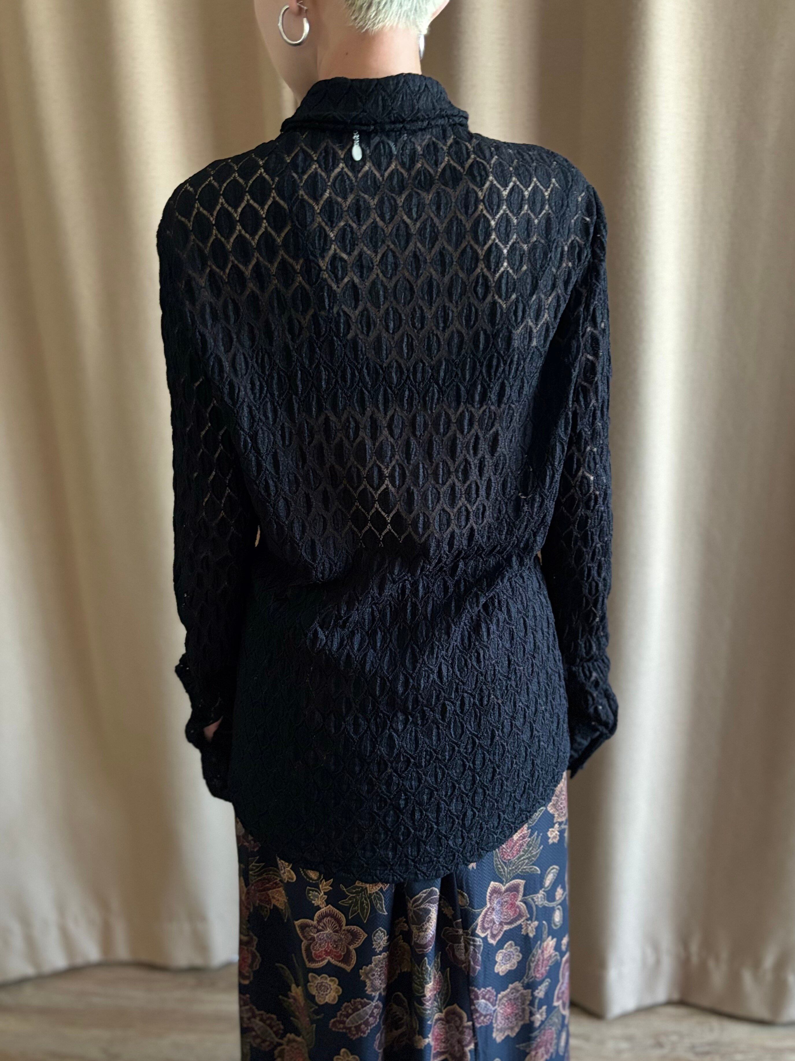 ブラックシャツは伸縮性のあるレースファブリックに、フロントと袖口に施された刺繍ボタンが魅力。