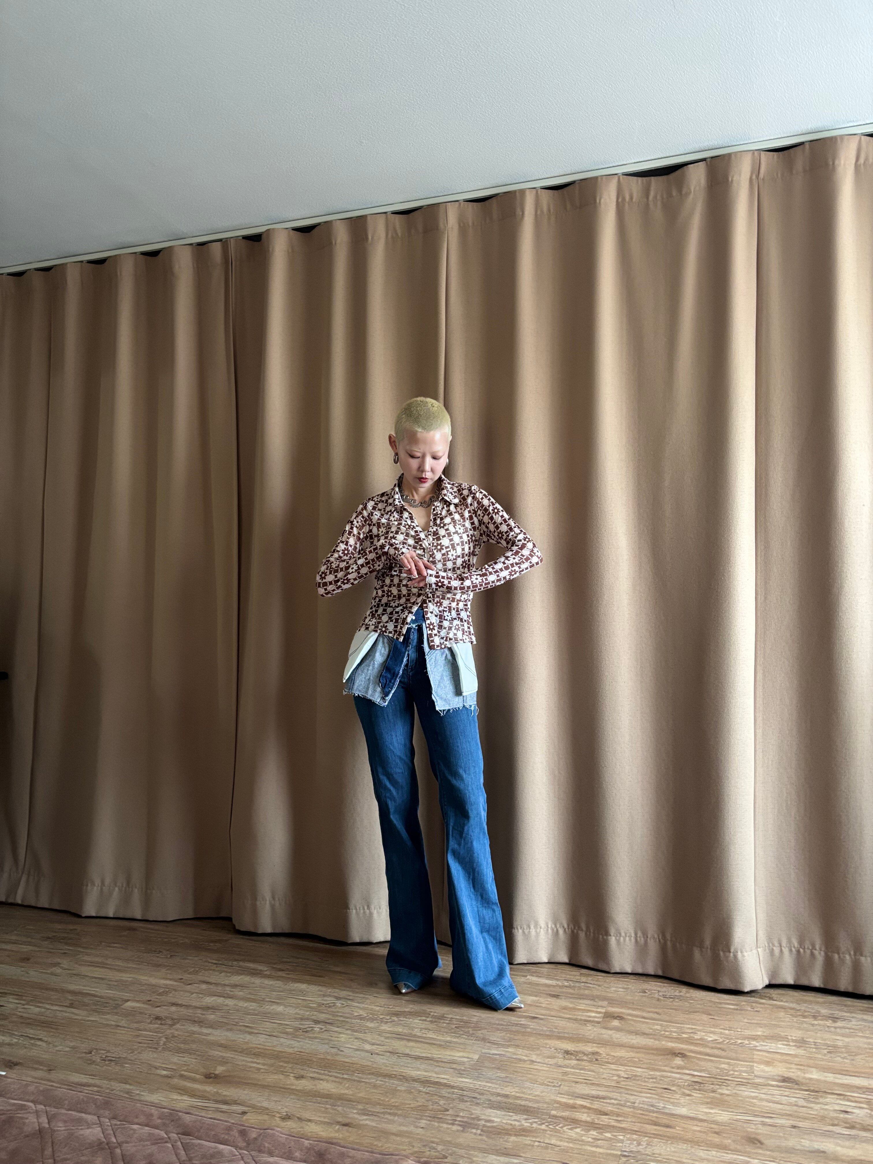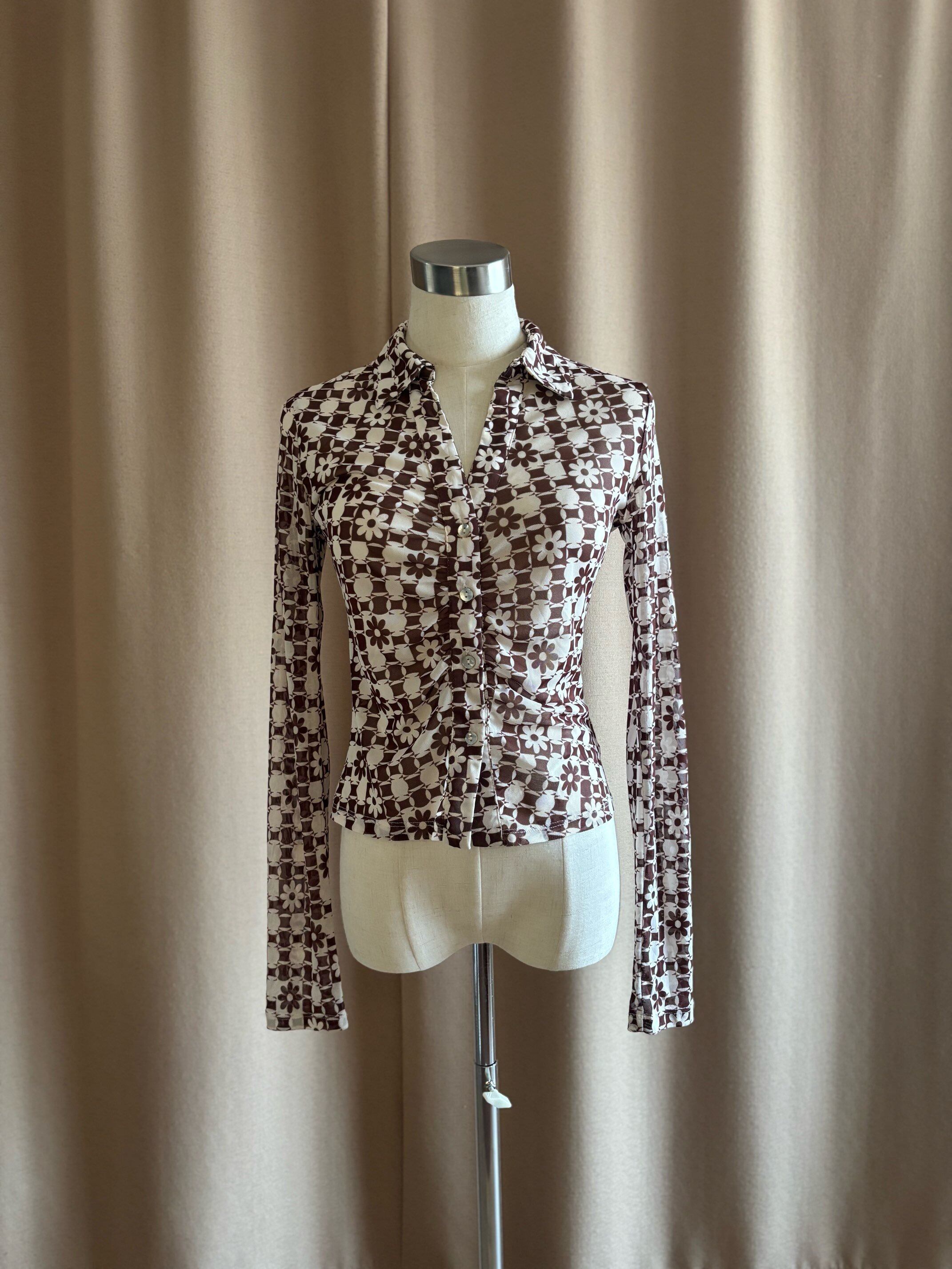 ノスタルジックな総柄で可愛らしさがありながらも、ブラウン×ホワイトの配色に深めに開いたスキッパーデザインで大人レトロな印象に。