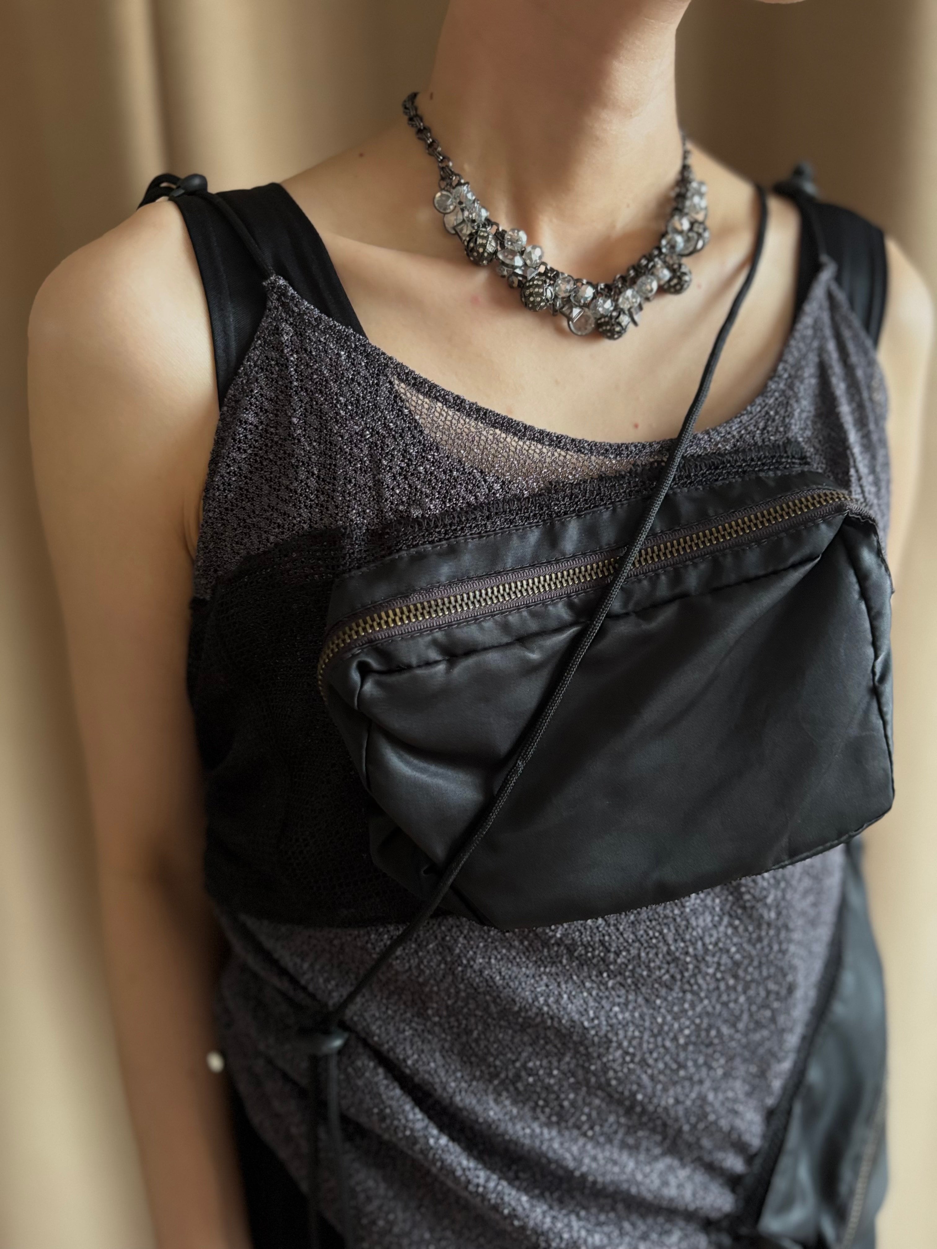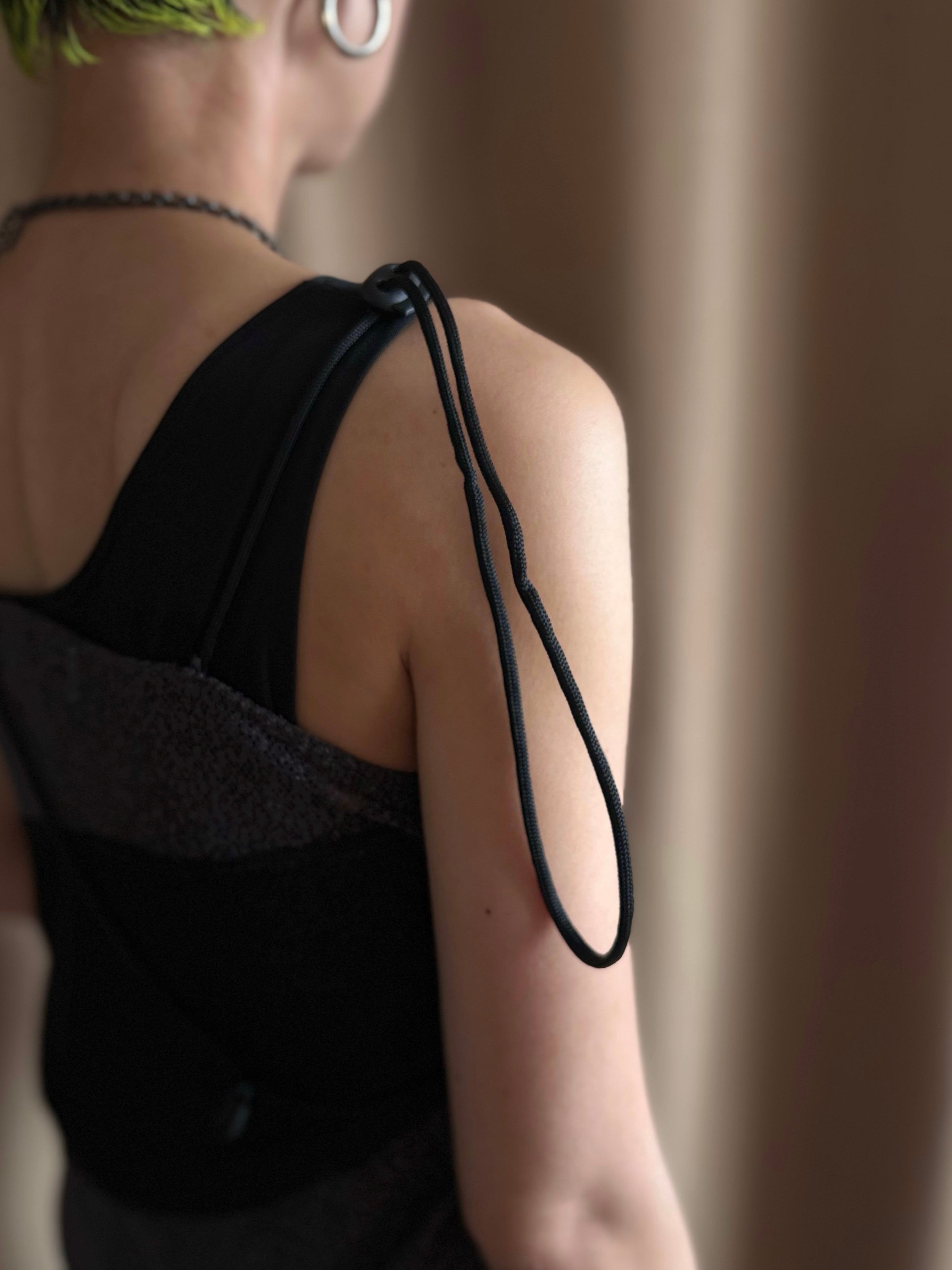 一体になっているリング付きストラップはウエストマークスタイルや、肩掛けスタイルでアイウェアやスマホなどが付けられる仕様に。
