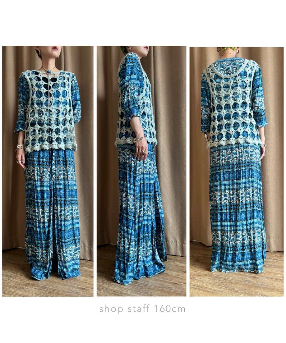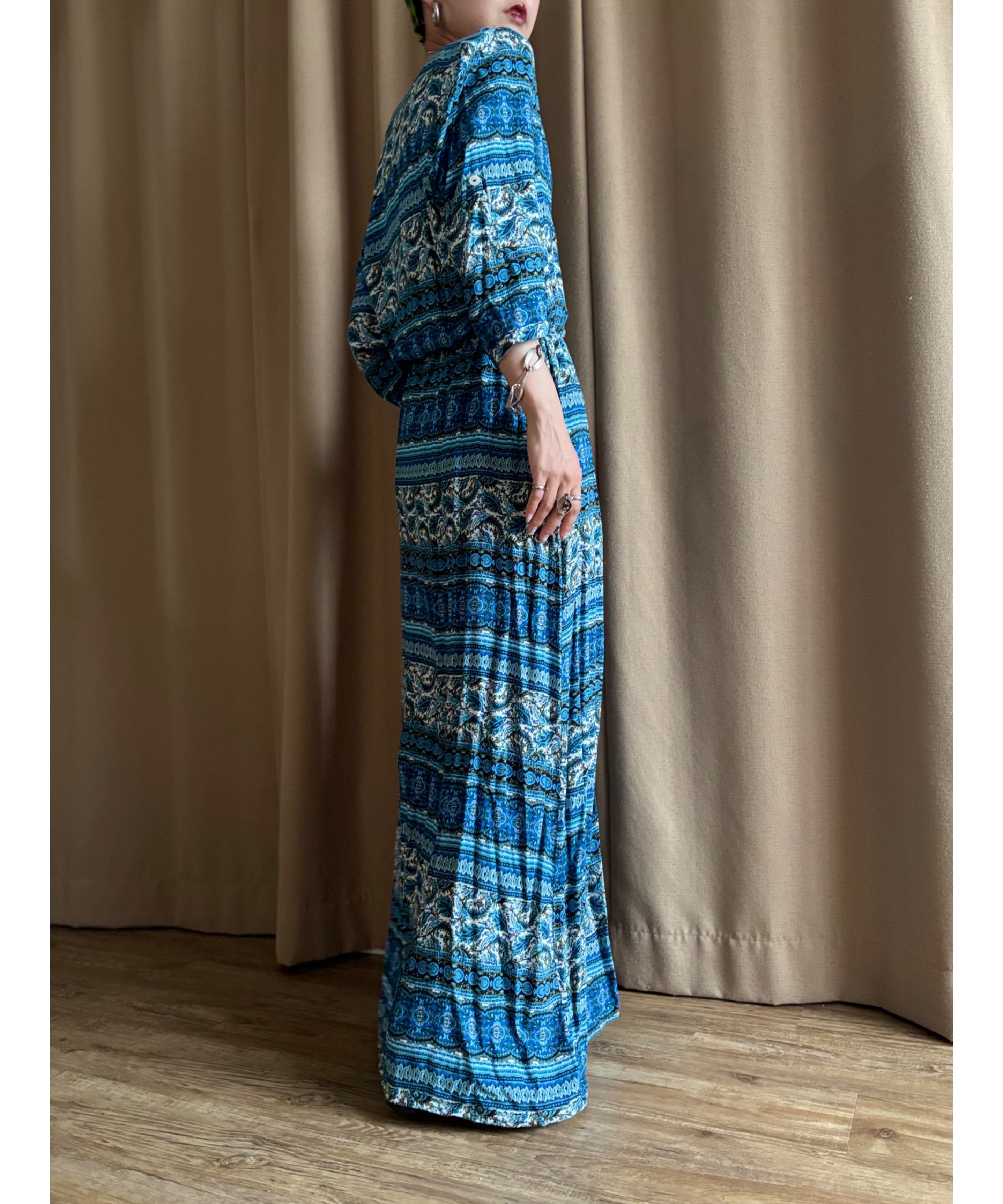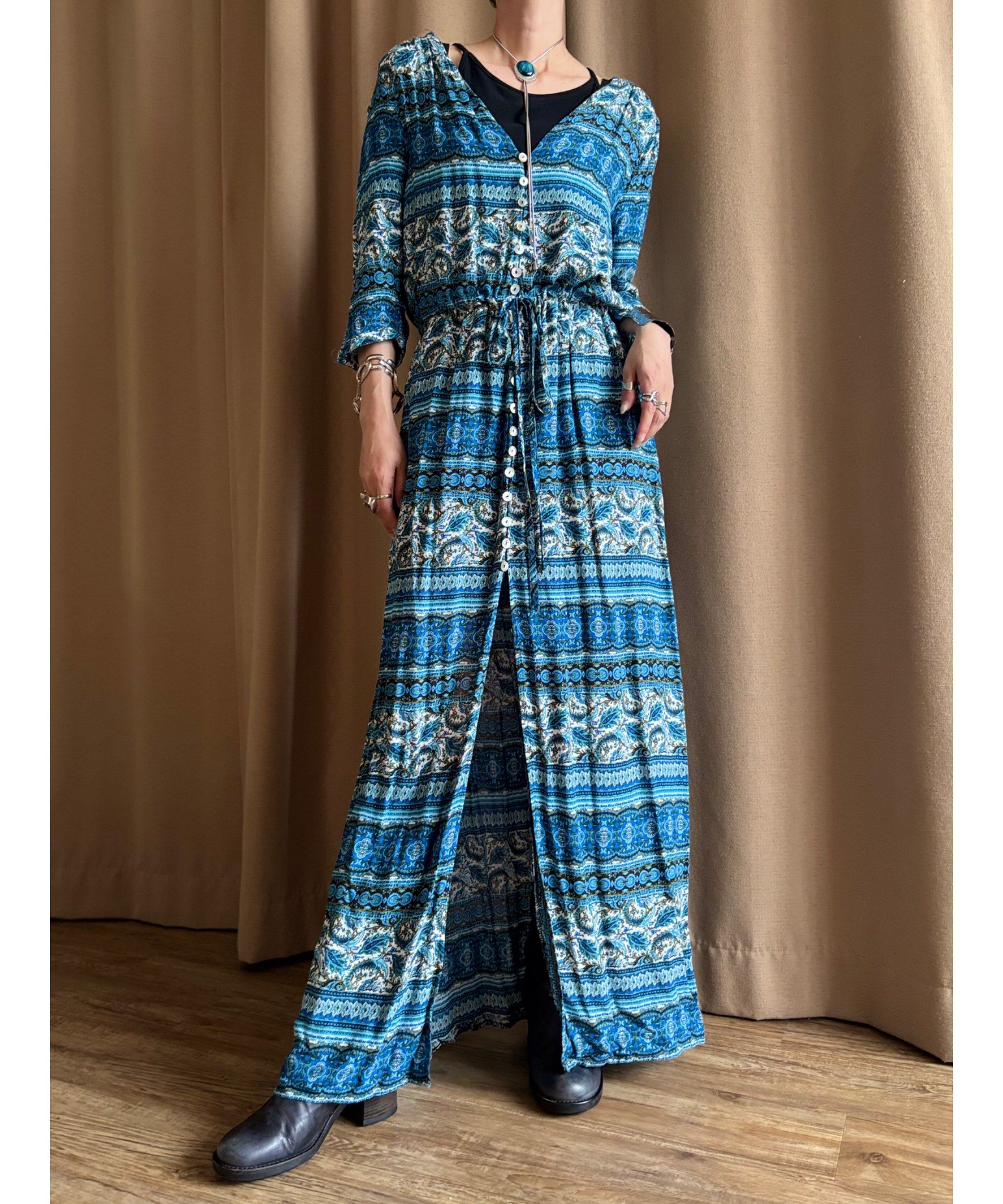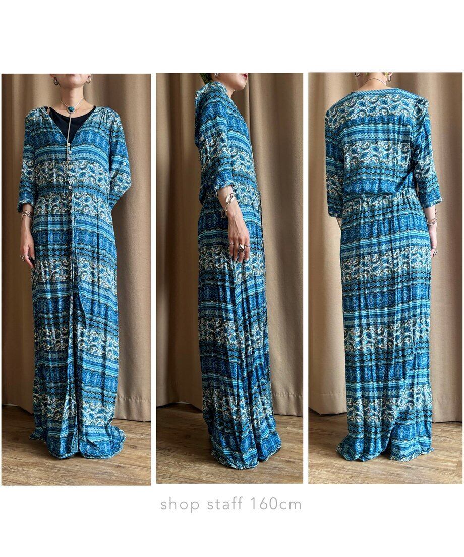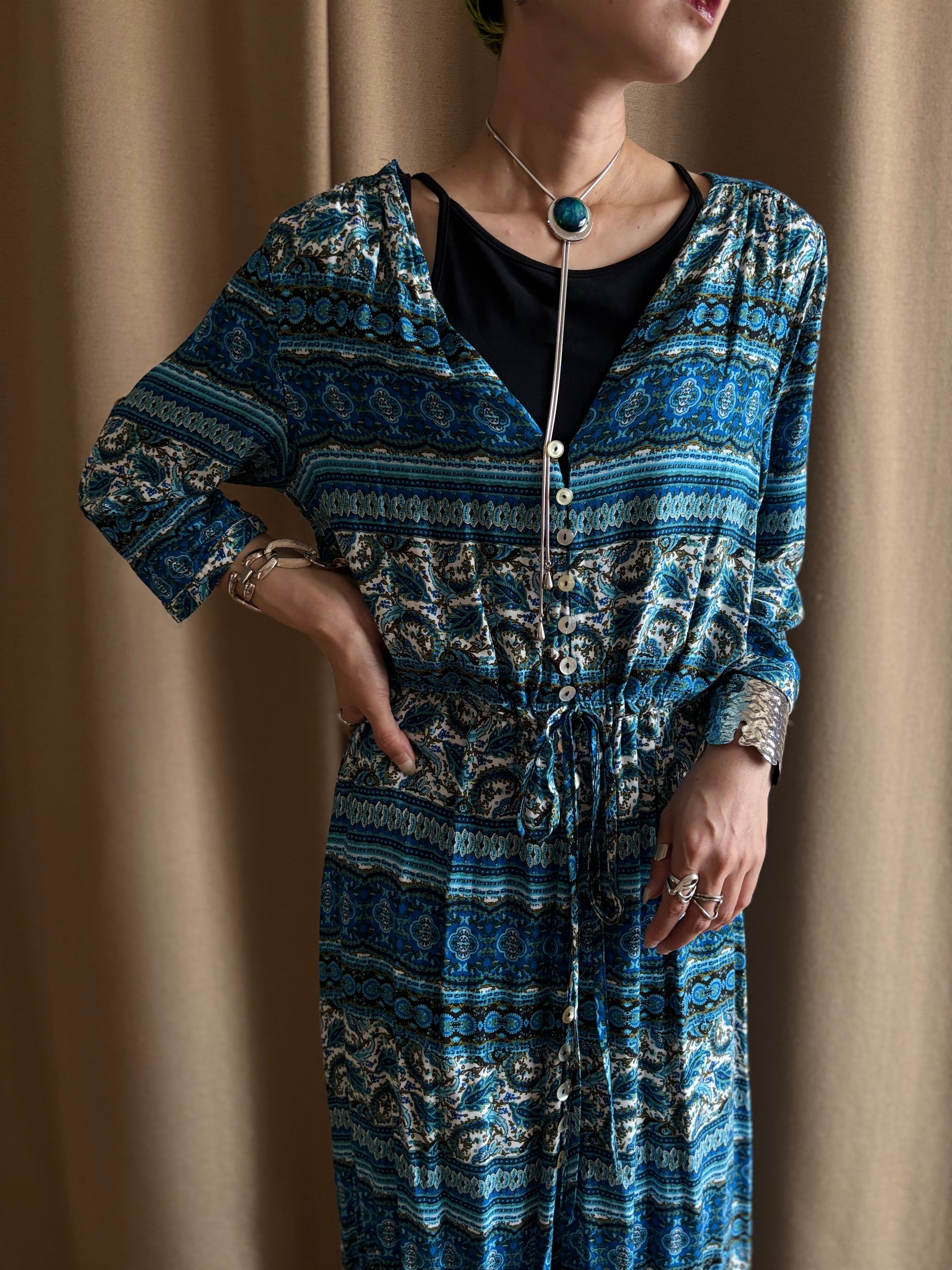 繊細なエスニック柄にブルーカラーが涼しげなインポートワンピース。