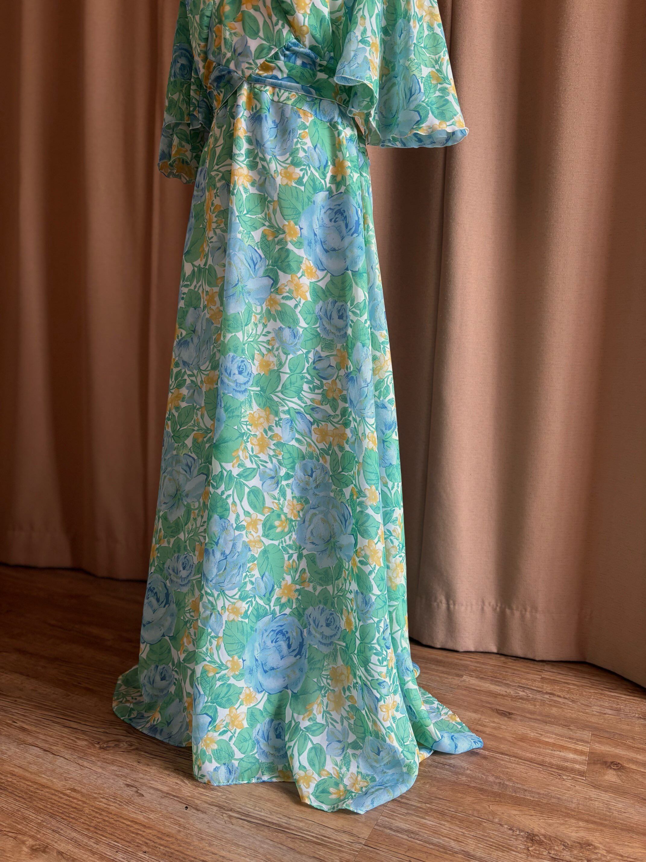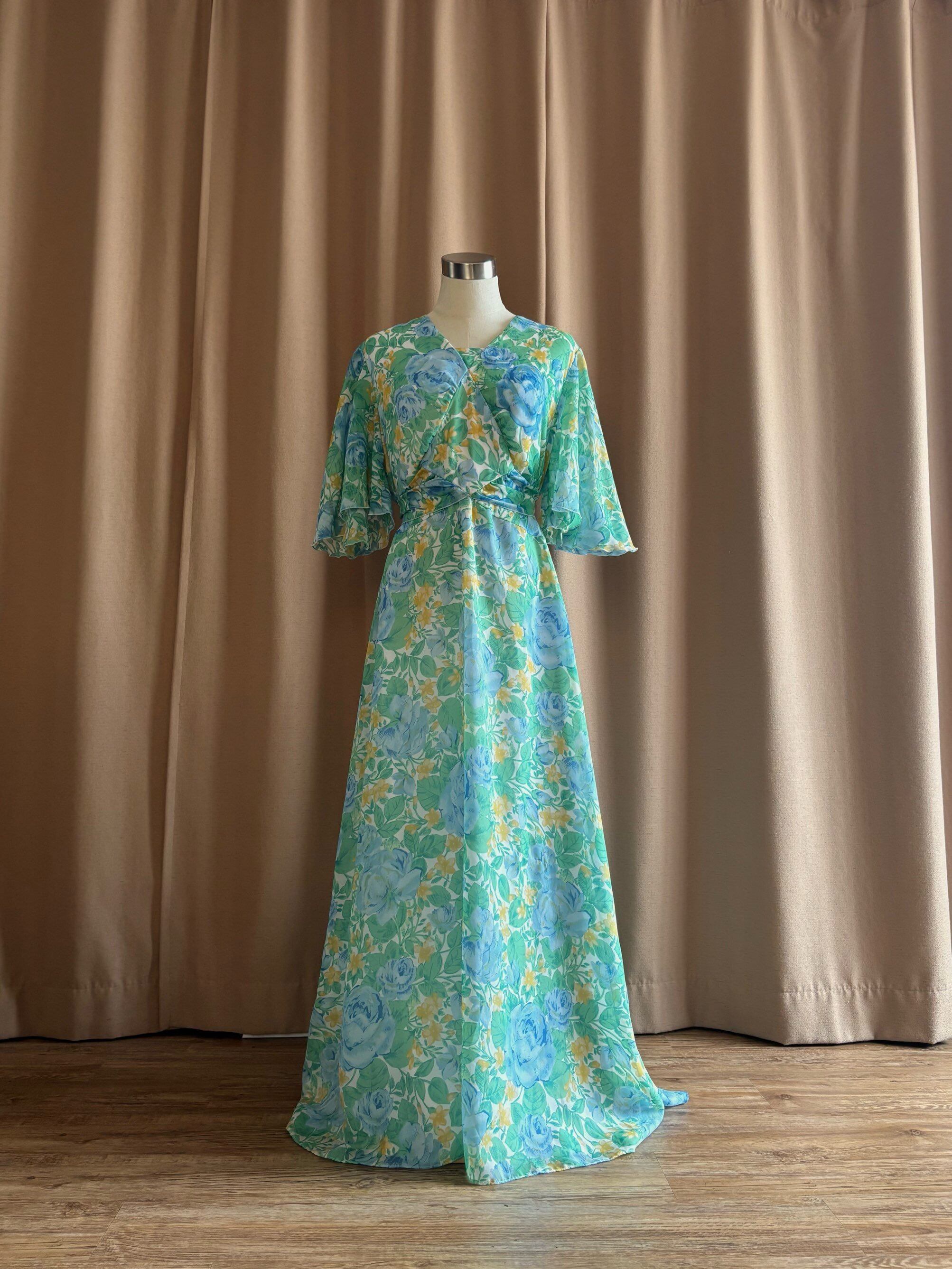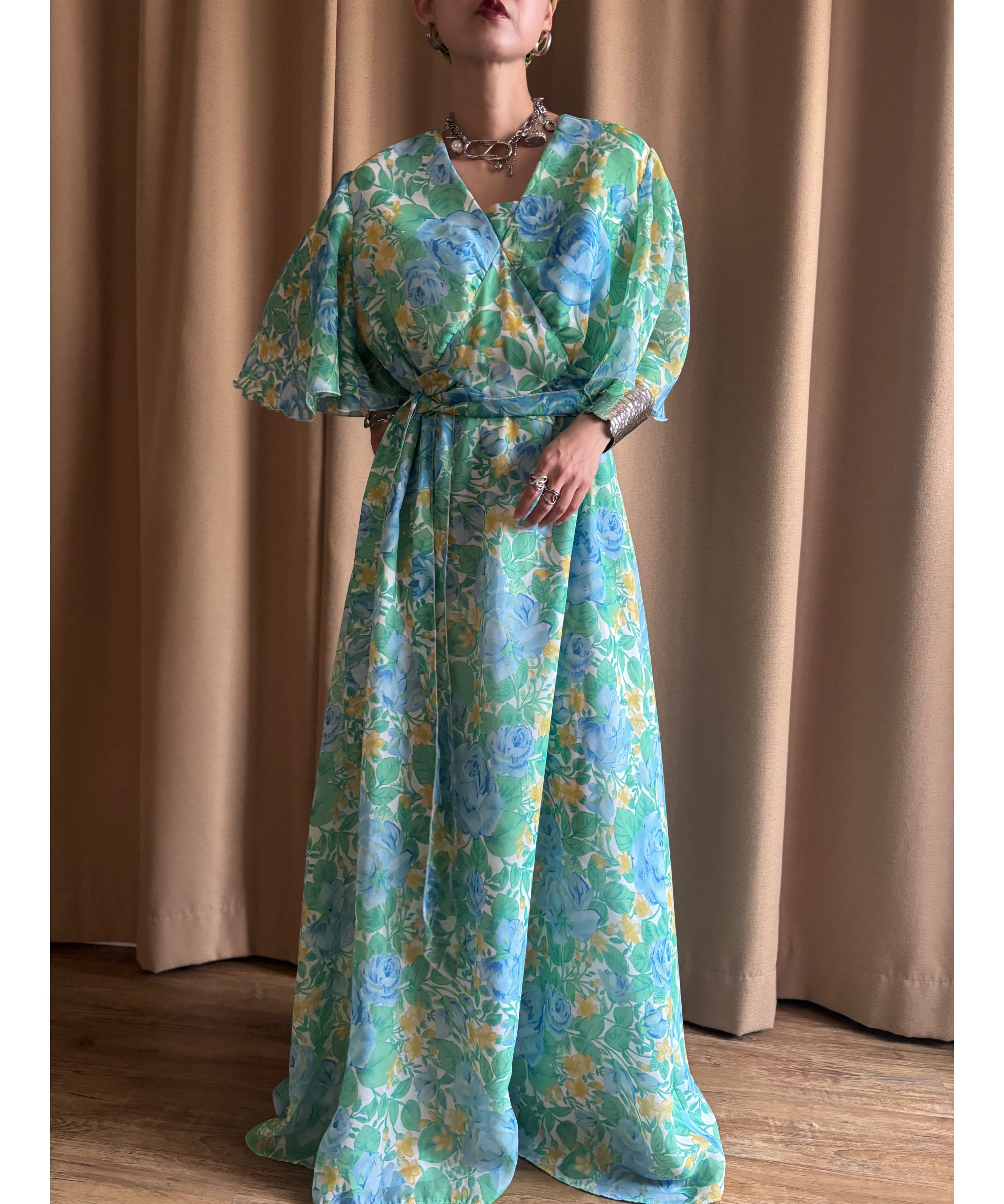 ブルー、イエロー、グリーンの色鮮やかなフラワー柄が美しいインポートワンピース。