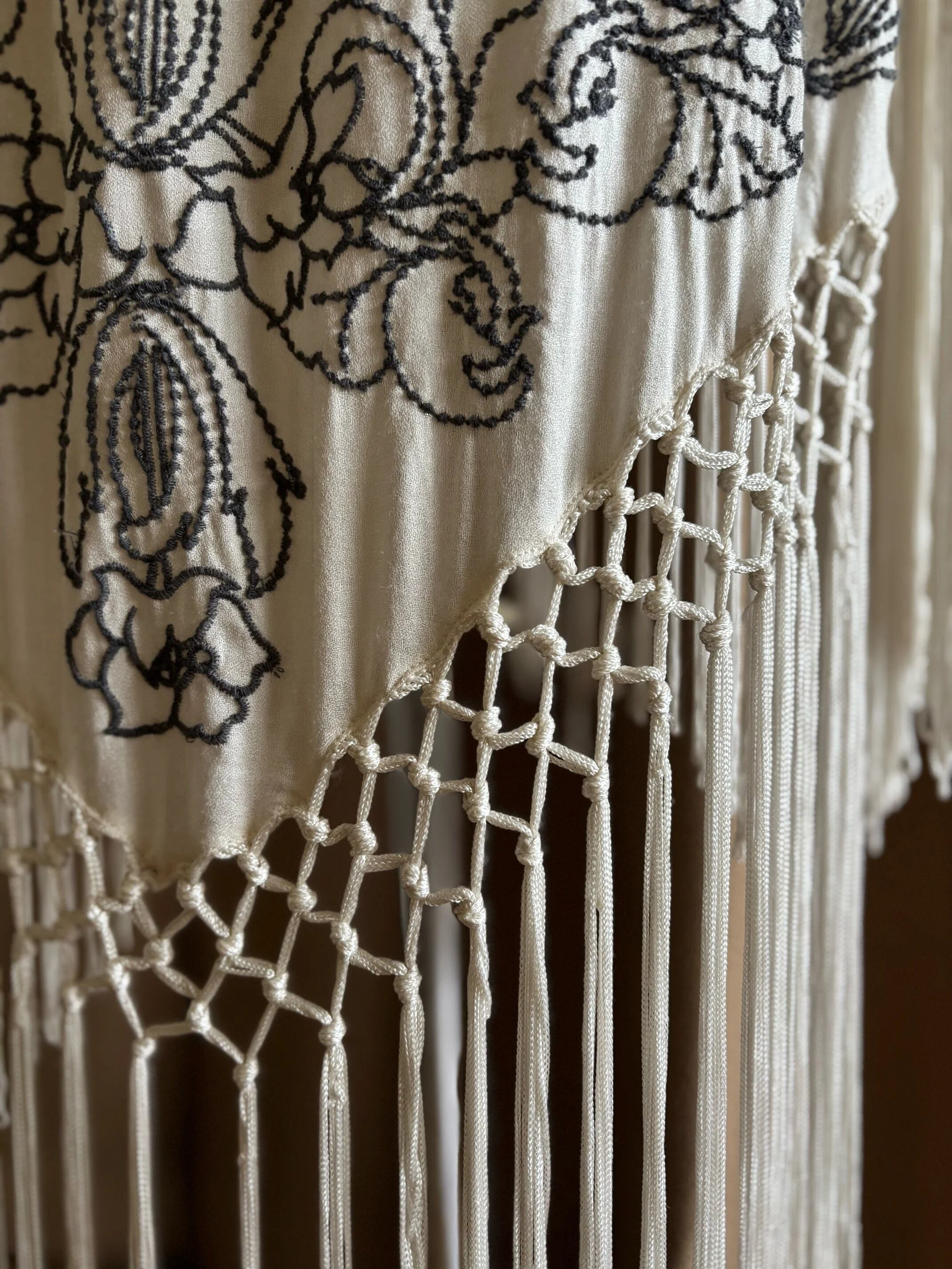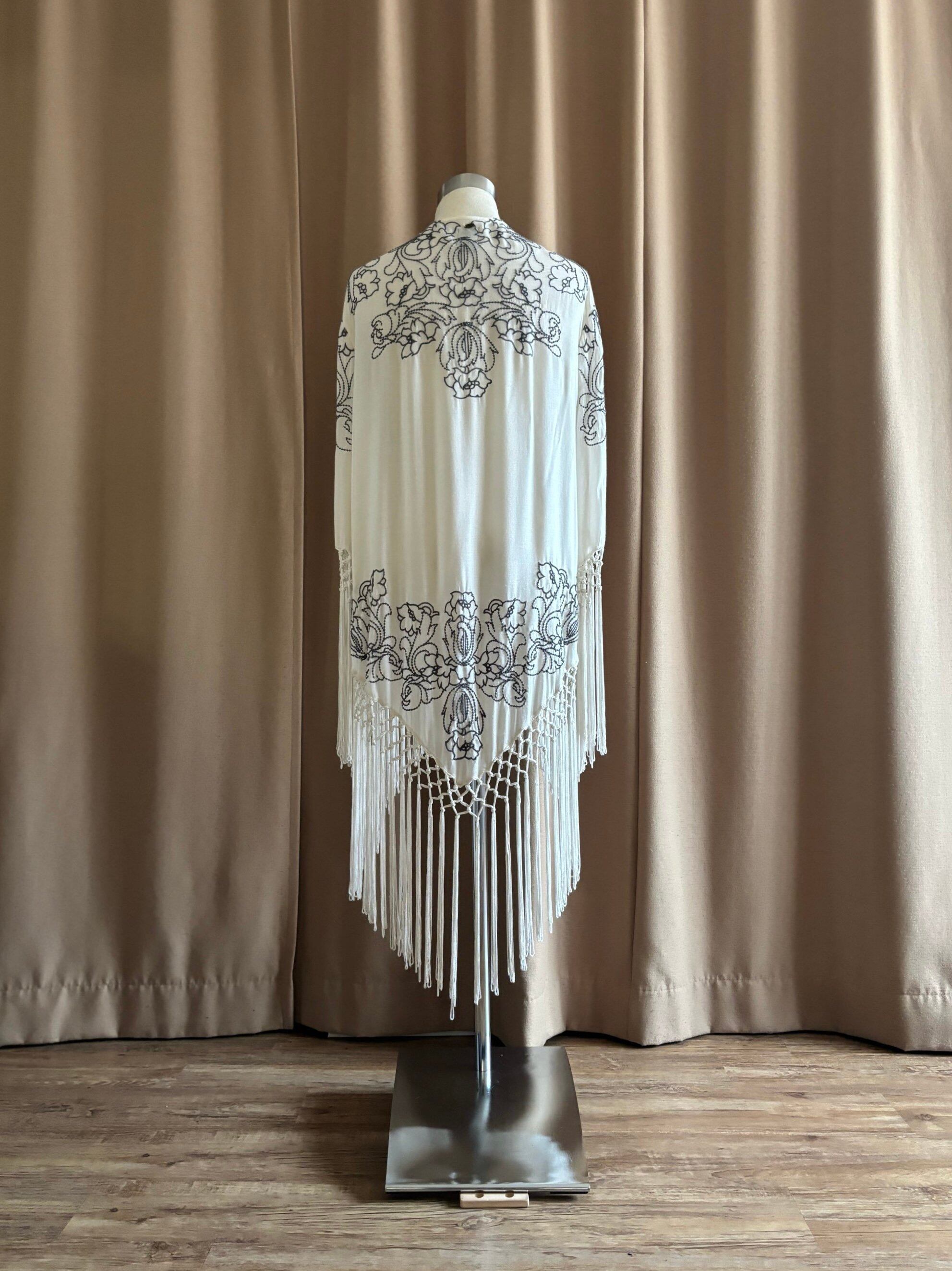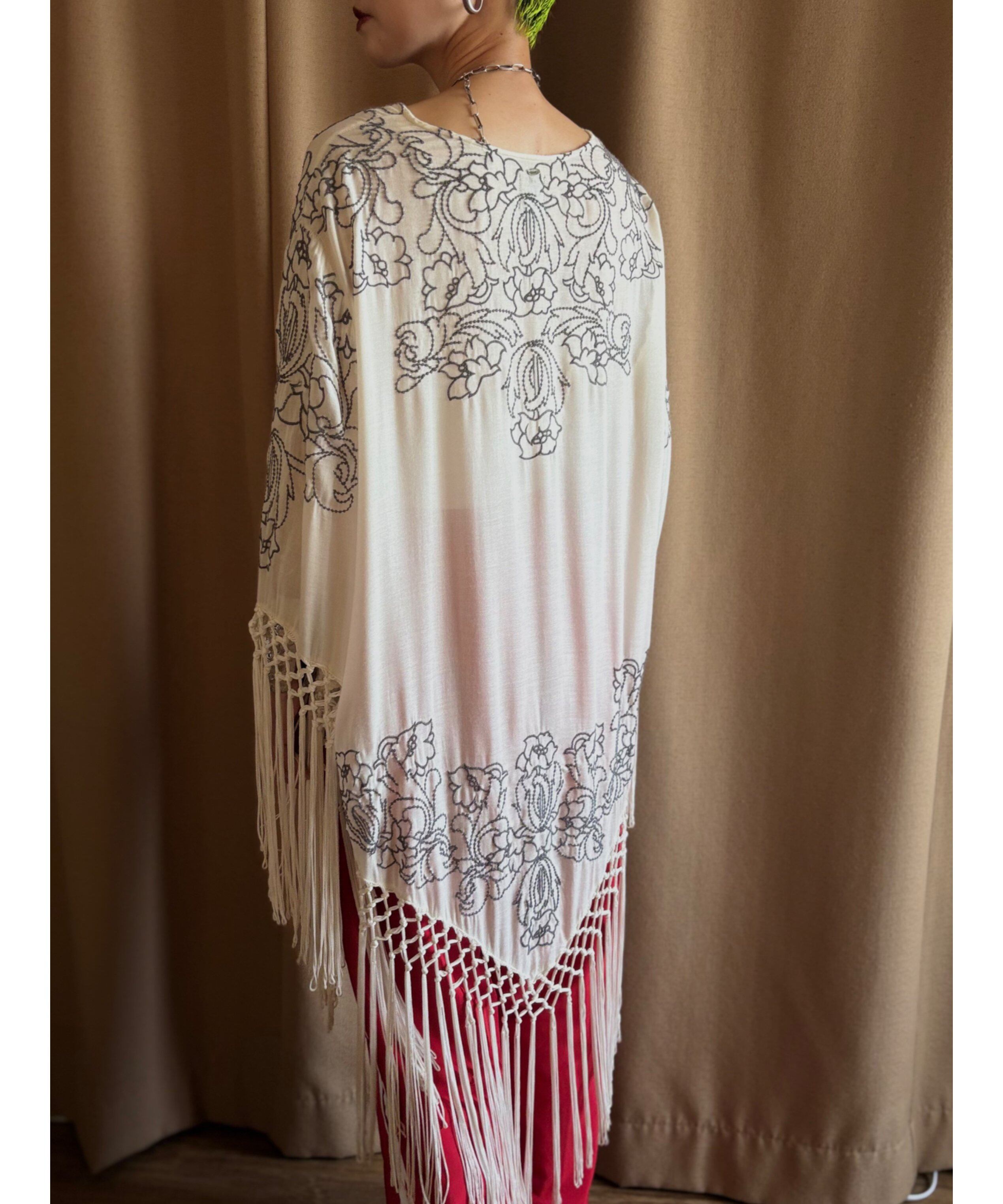 【B】所々点シミあり、肩など生地の傷みあり(縫い目が広がっています)、刺繍傷みあり(糸が出ている箇所あり)、毛羽立ちややあり、フリンジ毛羽立ちあり