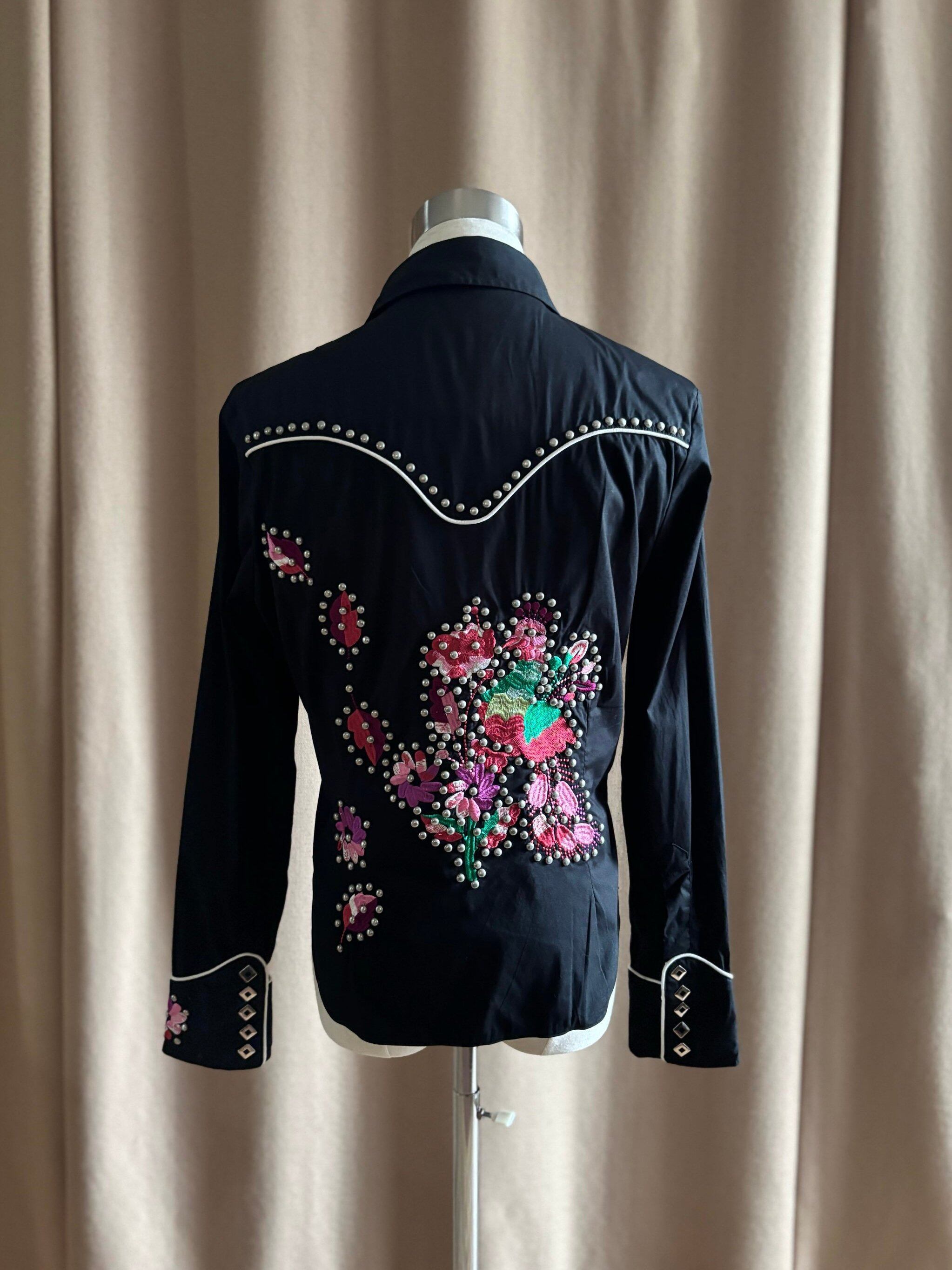 カラフルなフラワー刺繍を大胆に施し、重厚感抜群なメタルスタッズでエッジさをプラス。