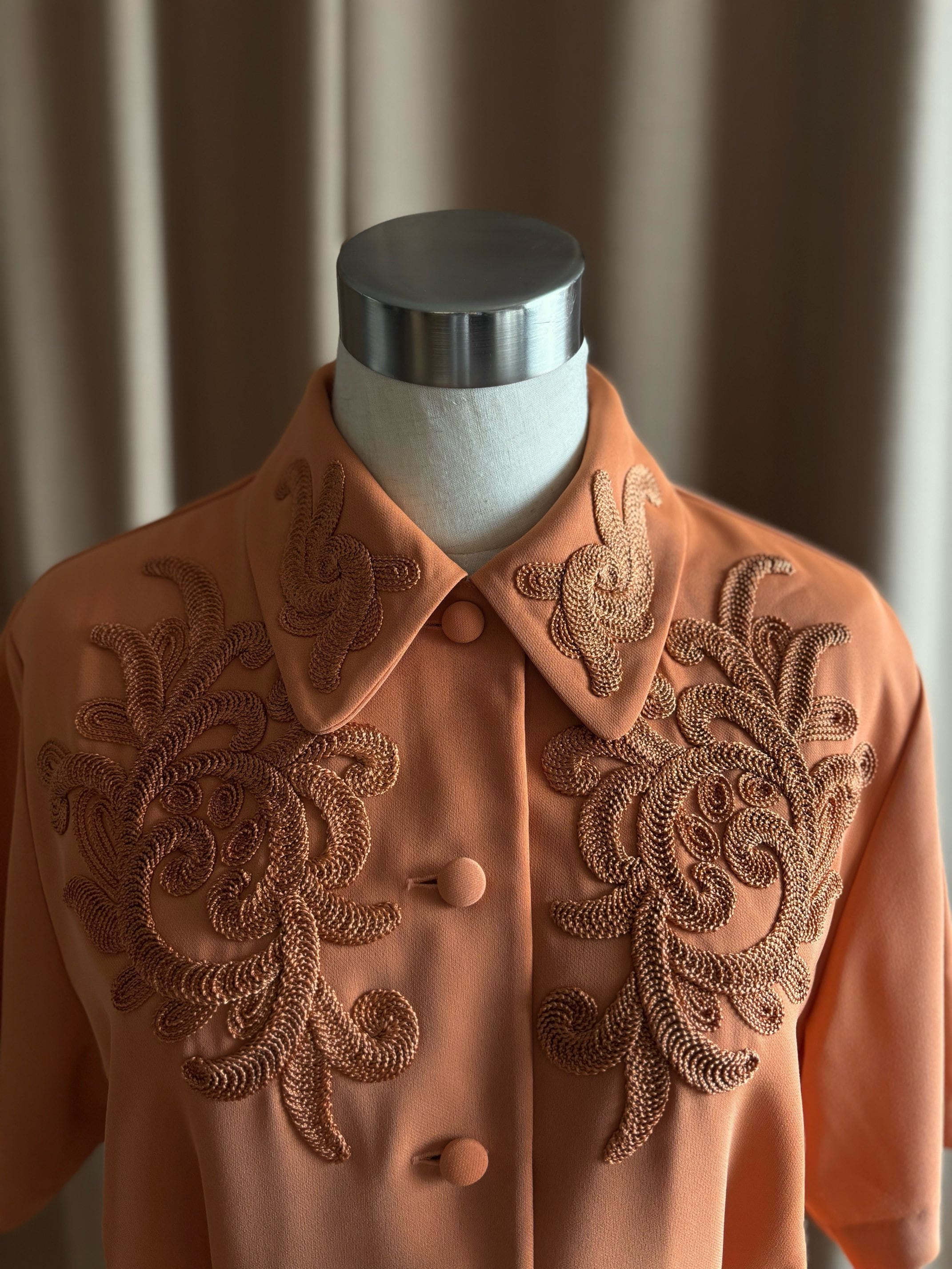 やや薄手のポリエステル素材で着心地良く、柔らかなオレンジカラーで華やかな印象に。