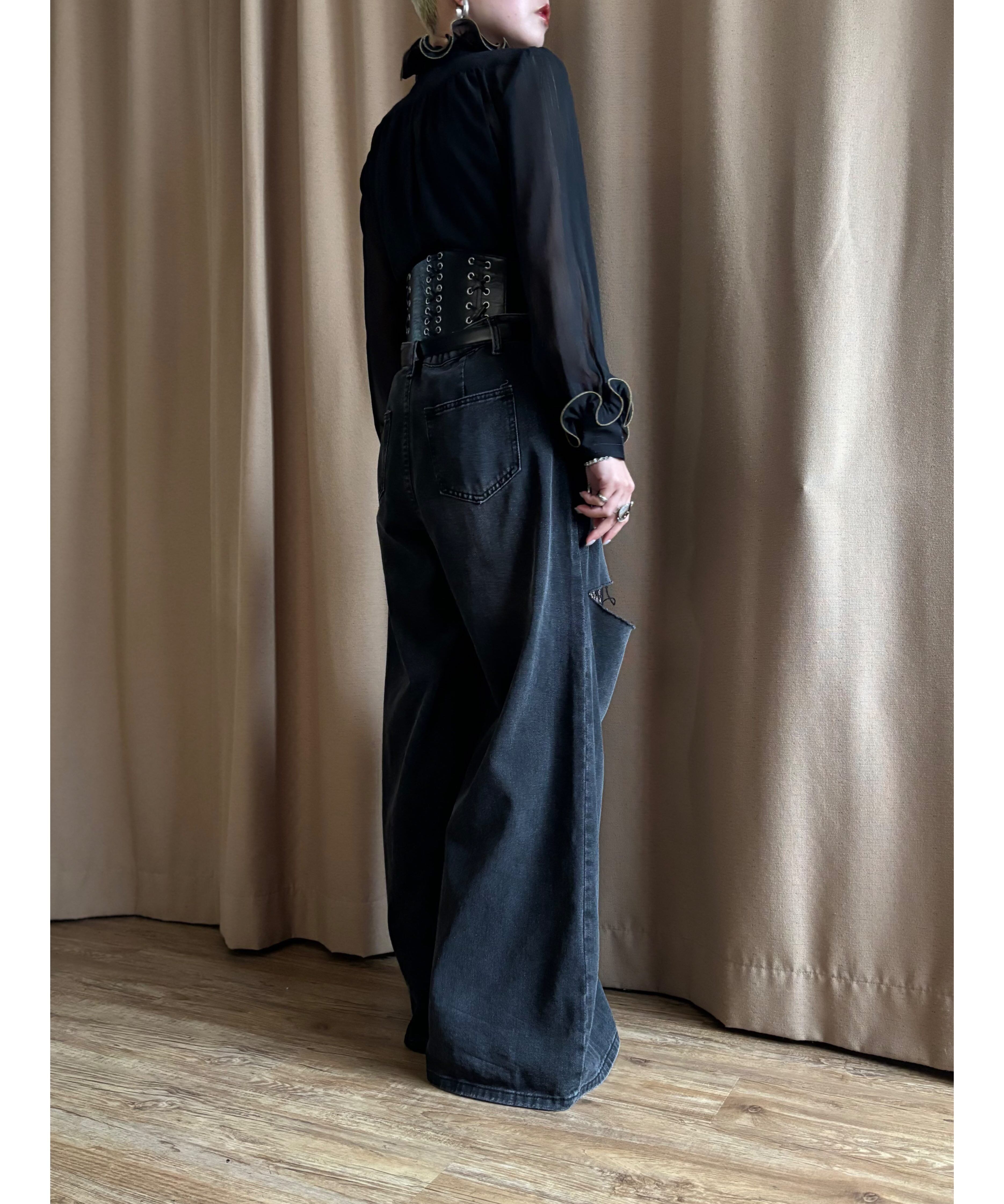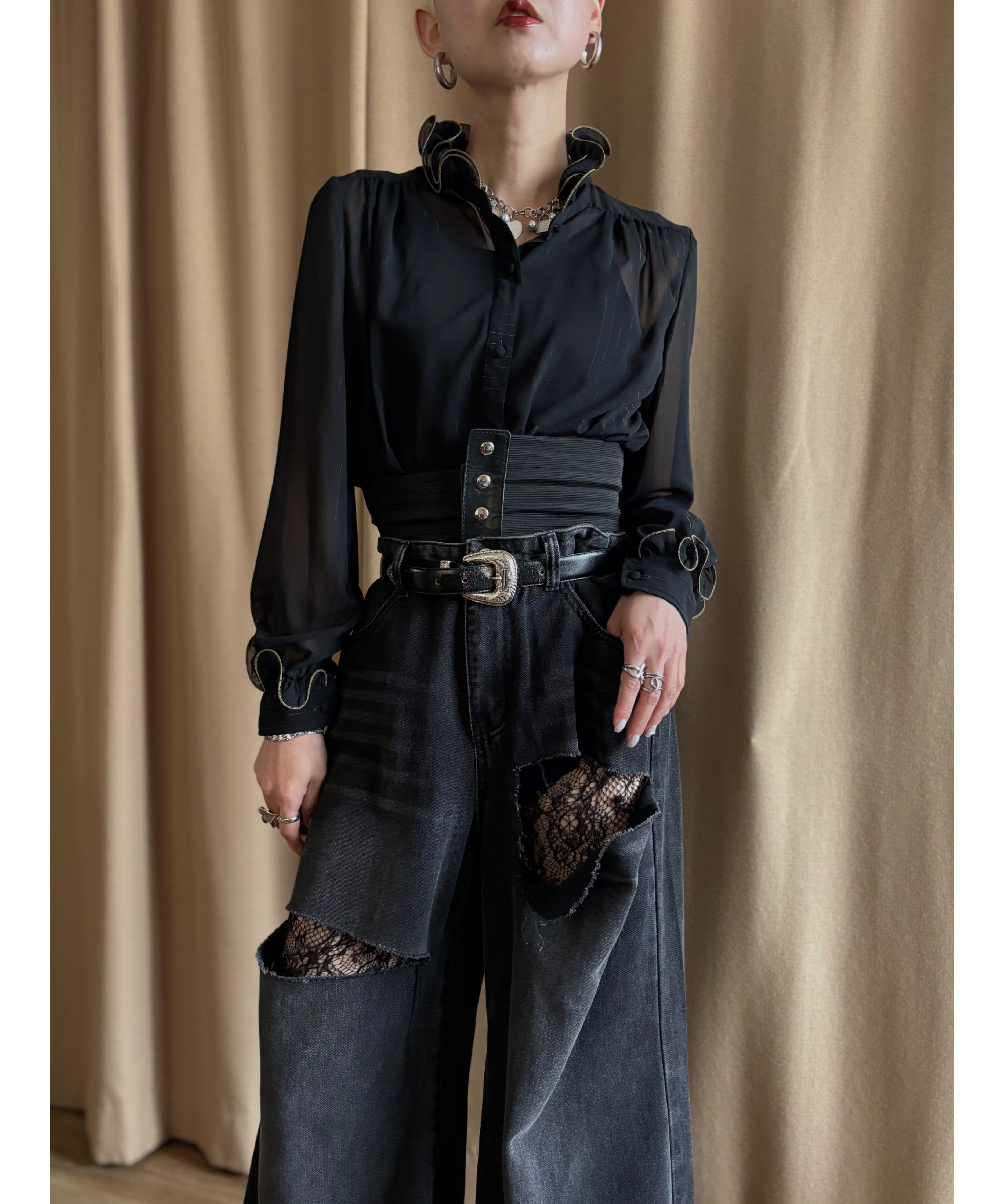 デコラティブなフリルデザインが目を惹くブラックシアーブラウス。
