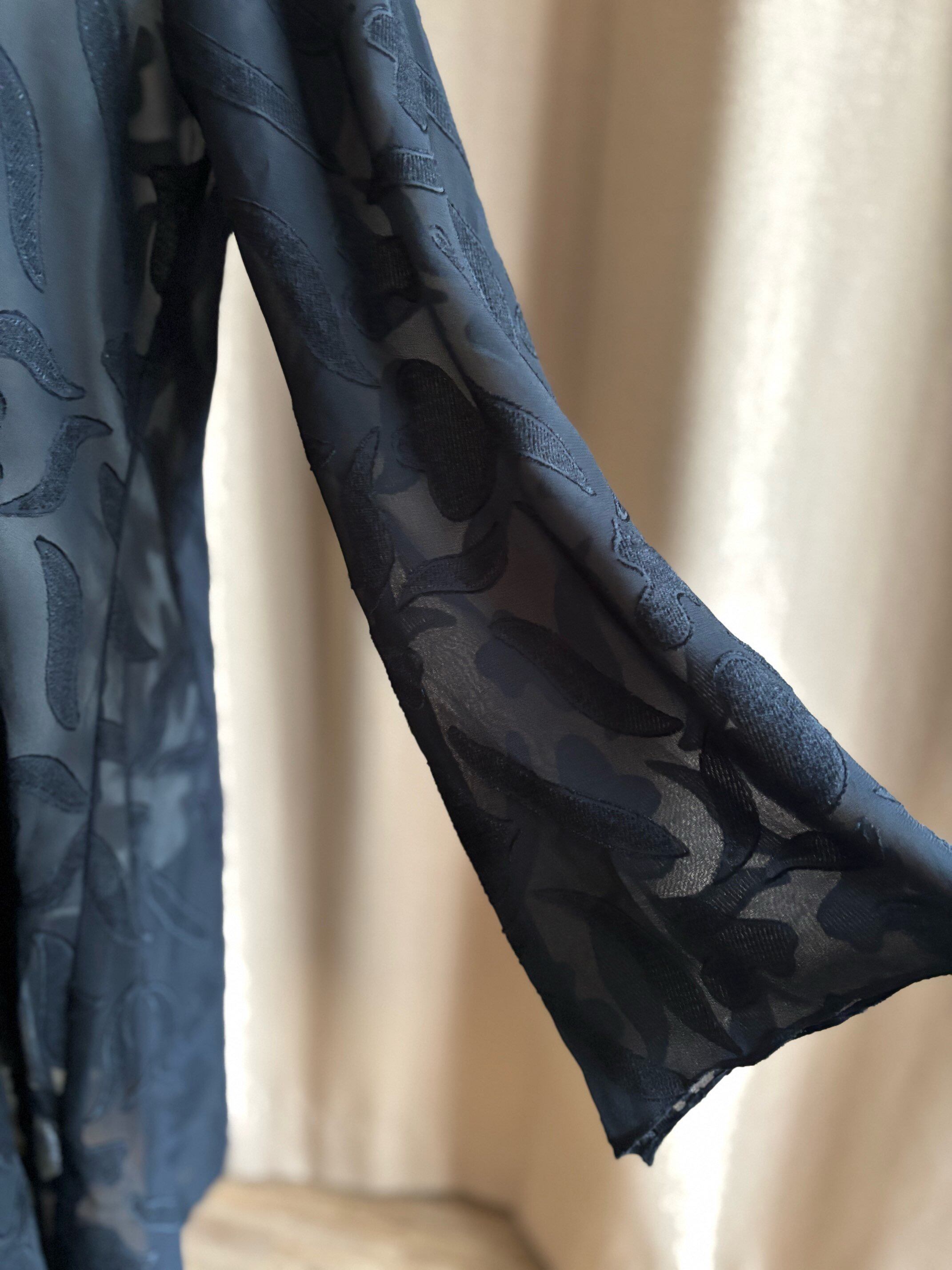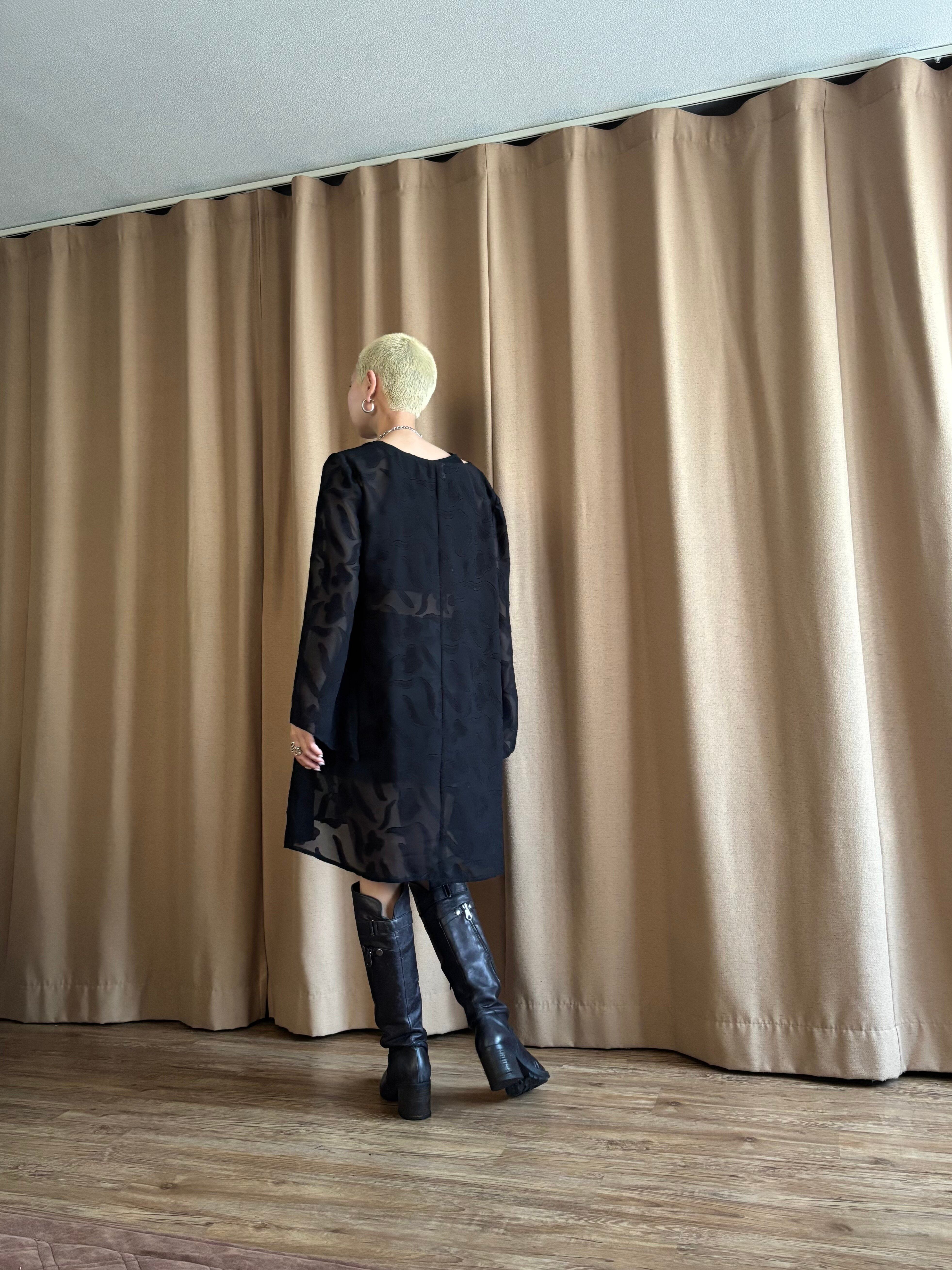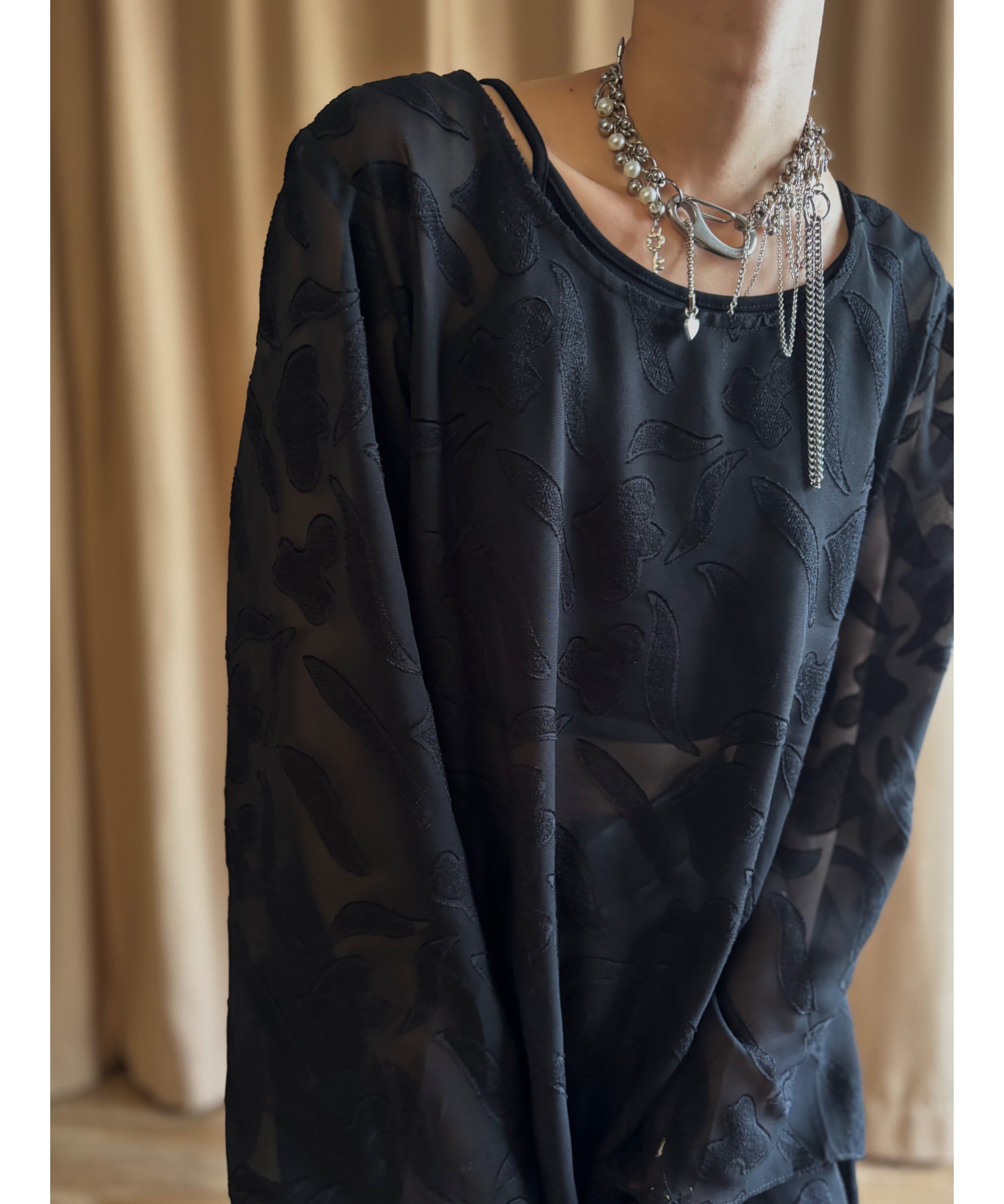 アブストラクトな立体柄とセンシュアルなブラックシアーが融合したモードなファブリックデザイン。