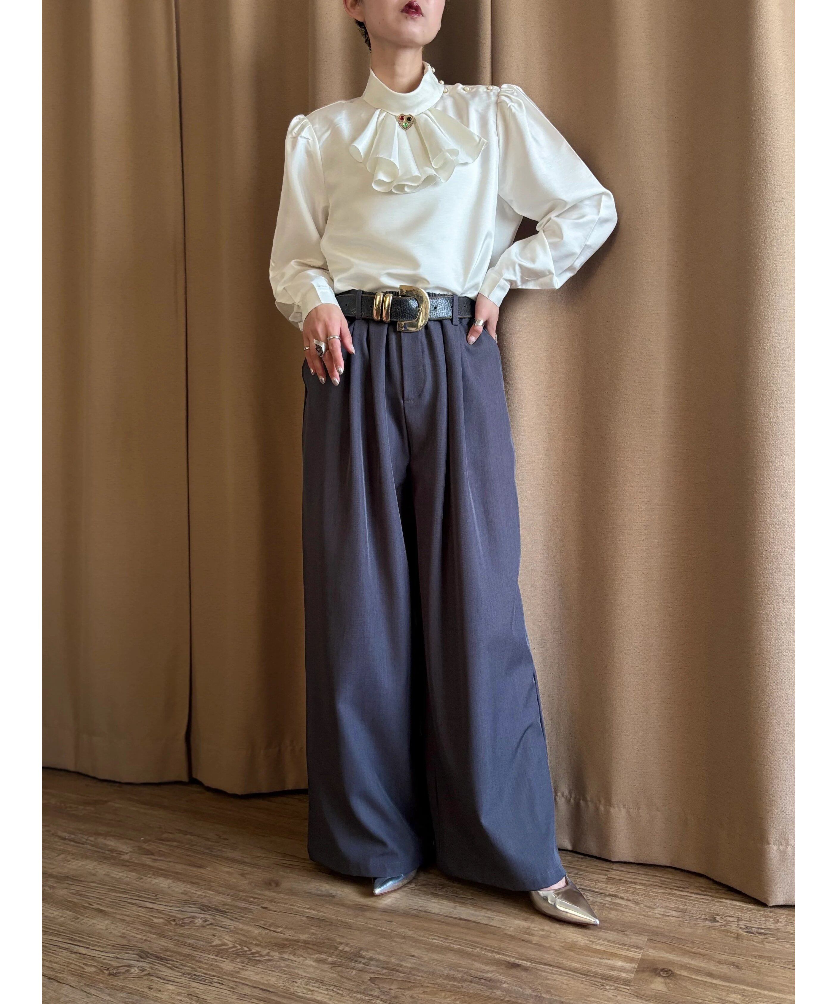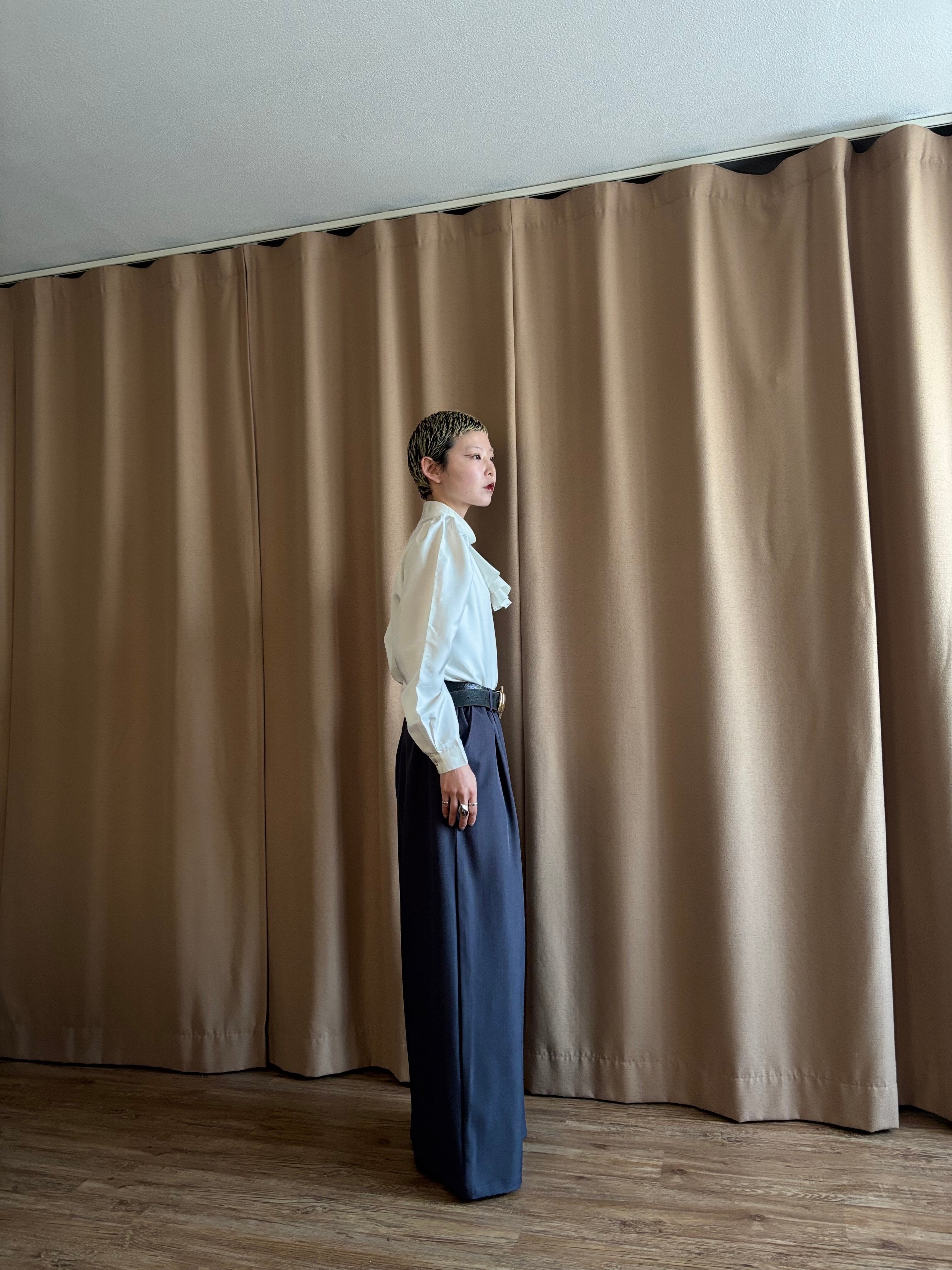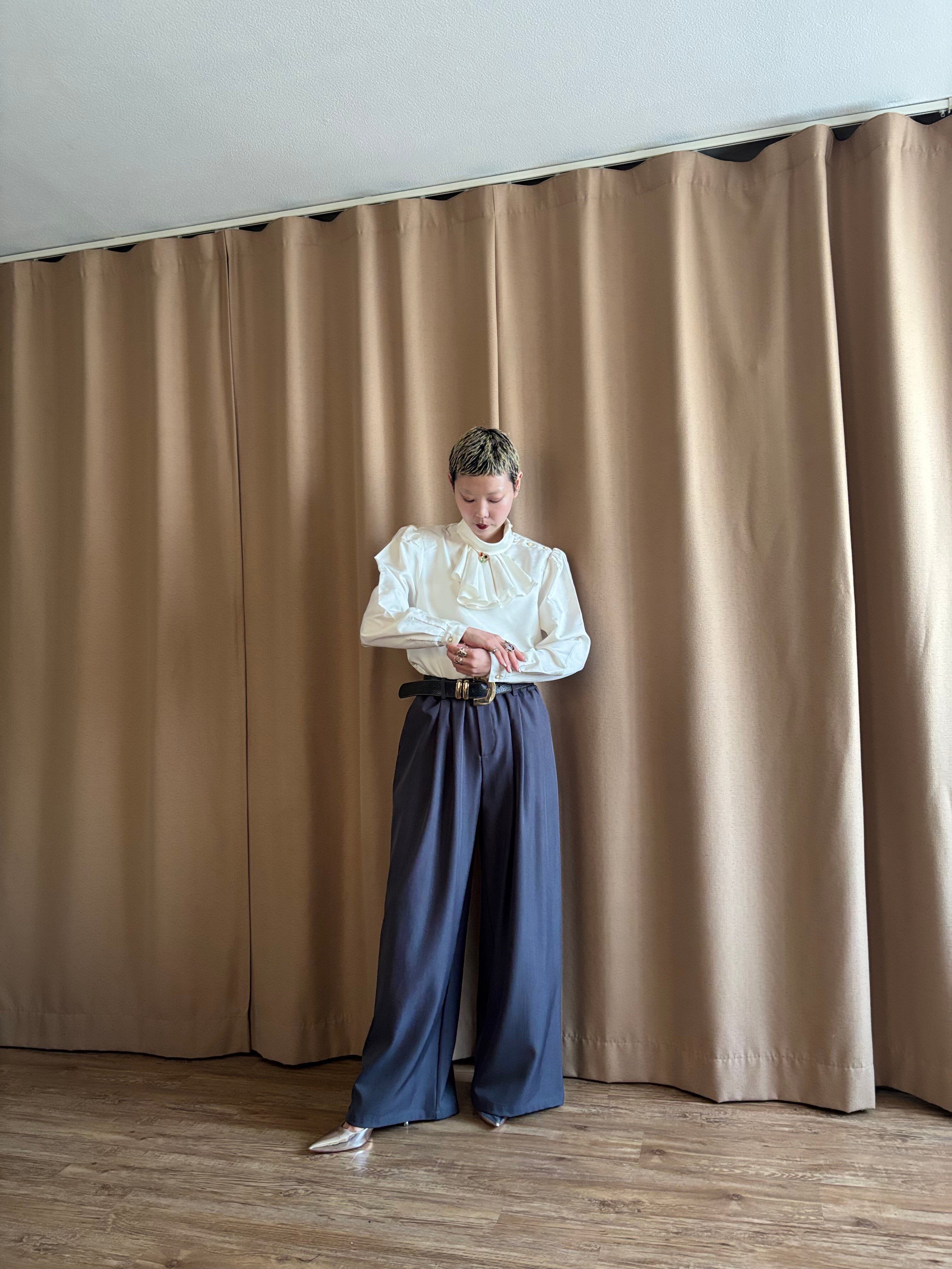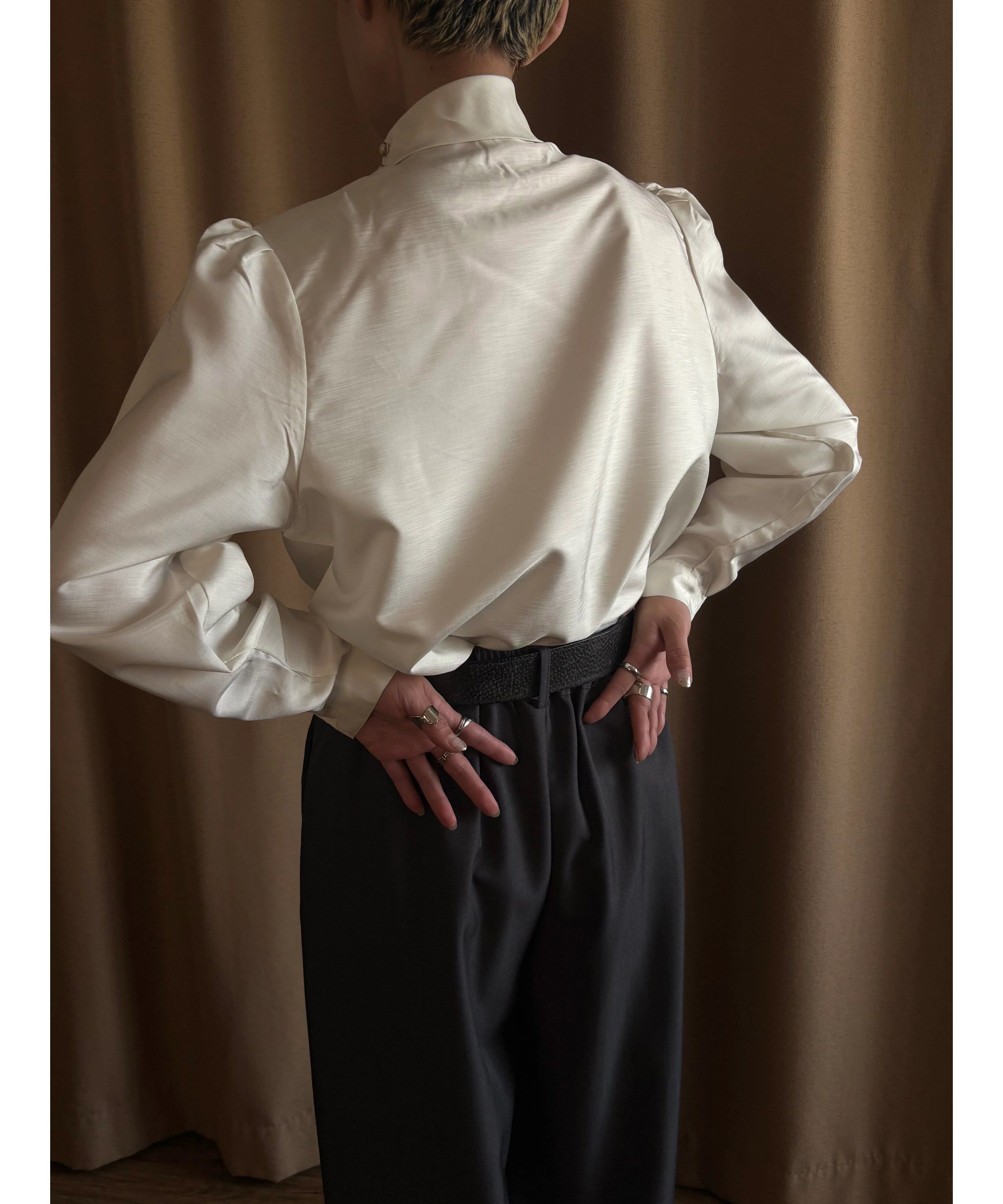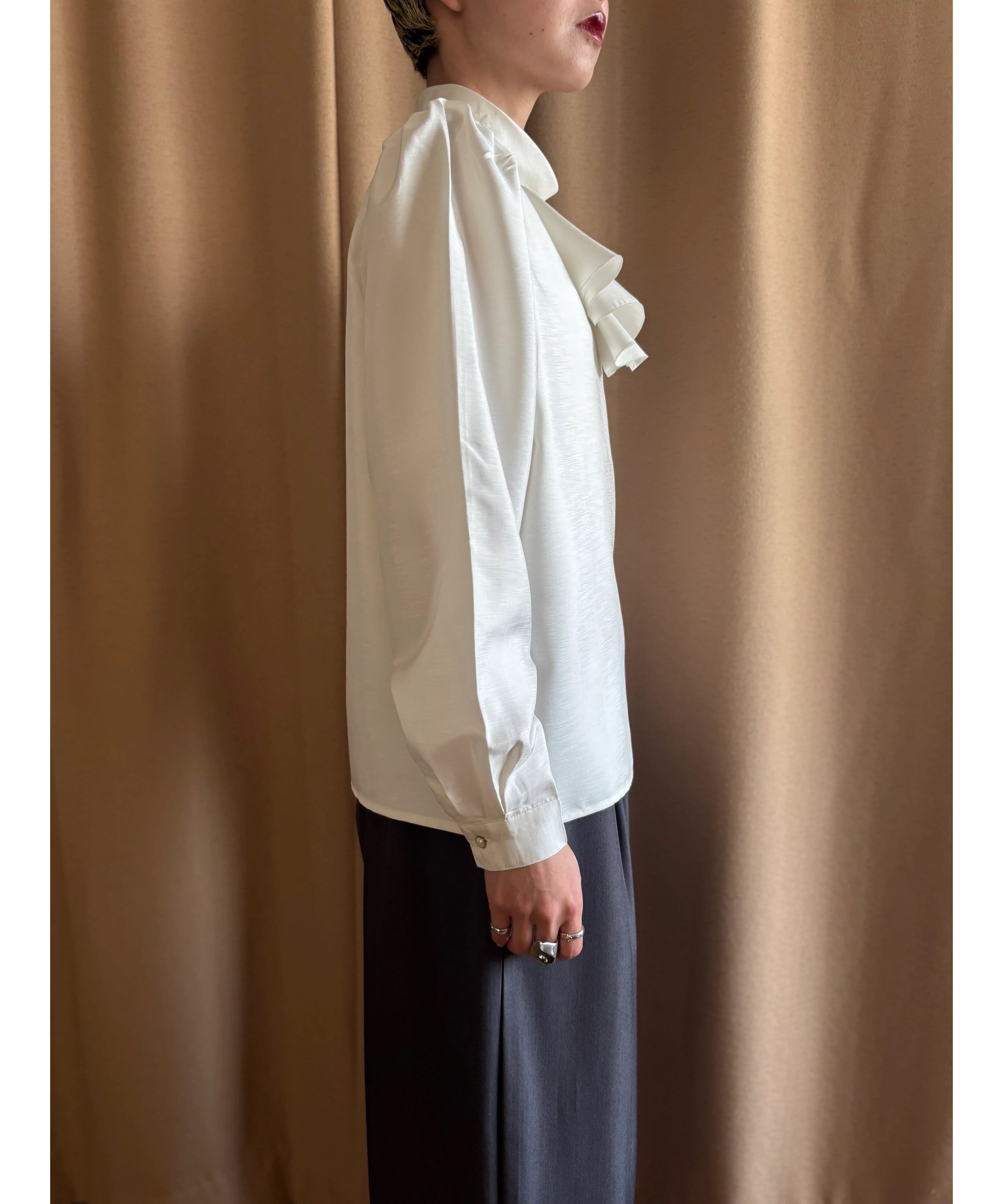 襟下にはギャザーフリルを施し、パワーショルダーの構築的なシルエットが美しいエレガントな一着。