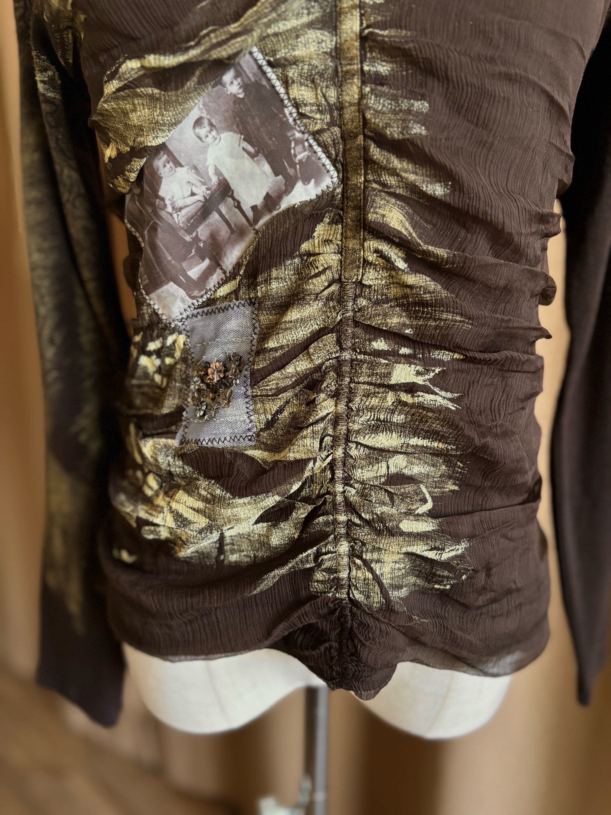 アートなペインティングデザインに、ノスタルジー溢れる西洋写真を転写した異素材パッチワークが目を惹く一着。