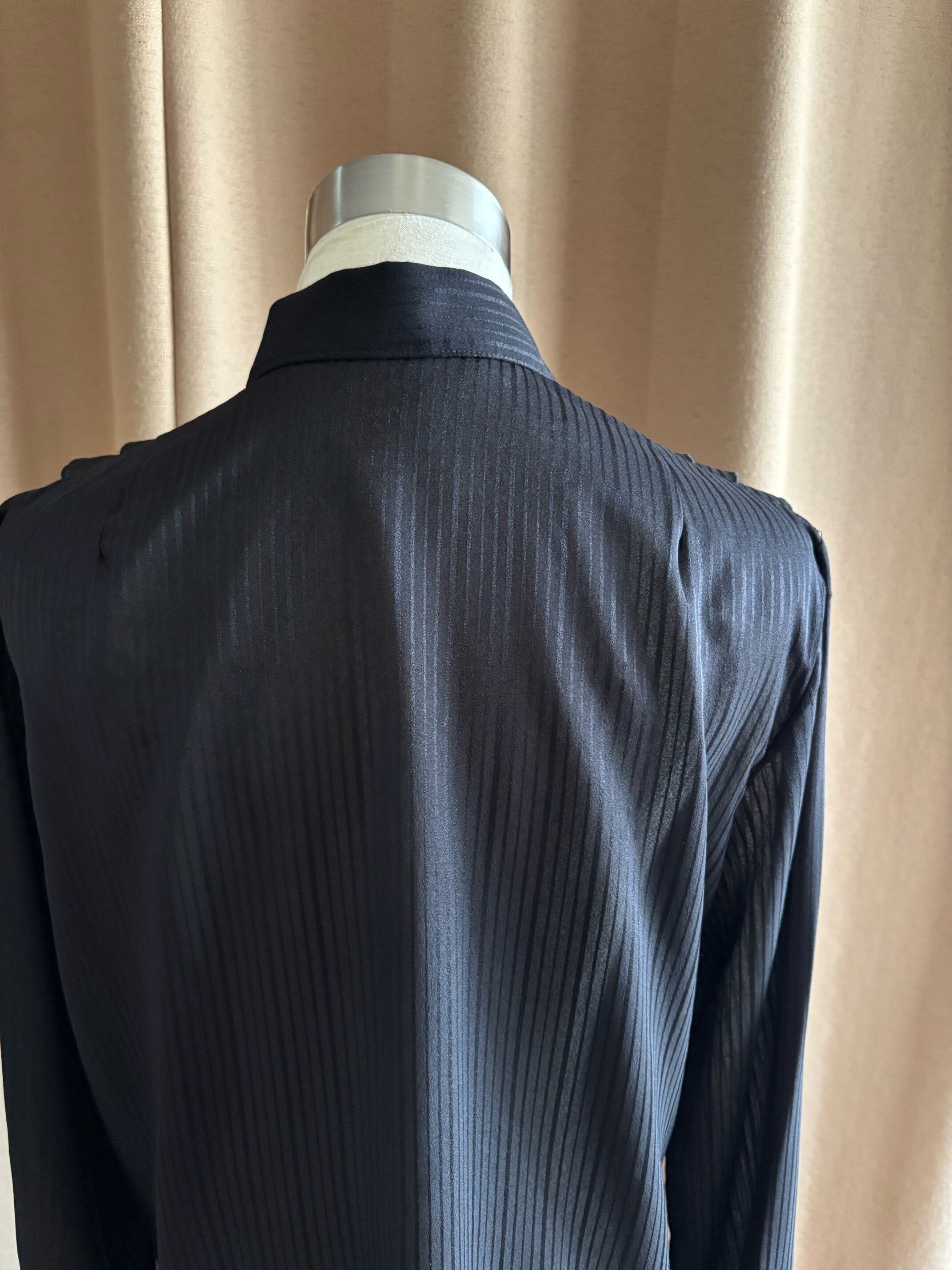上品な光沢が美しいストライプ柄に、ブラックシアーのセンシュアルな透け感で大人の魅力を放つ一着に。