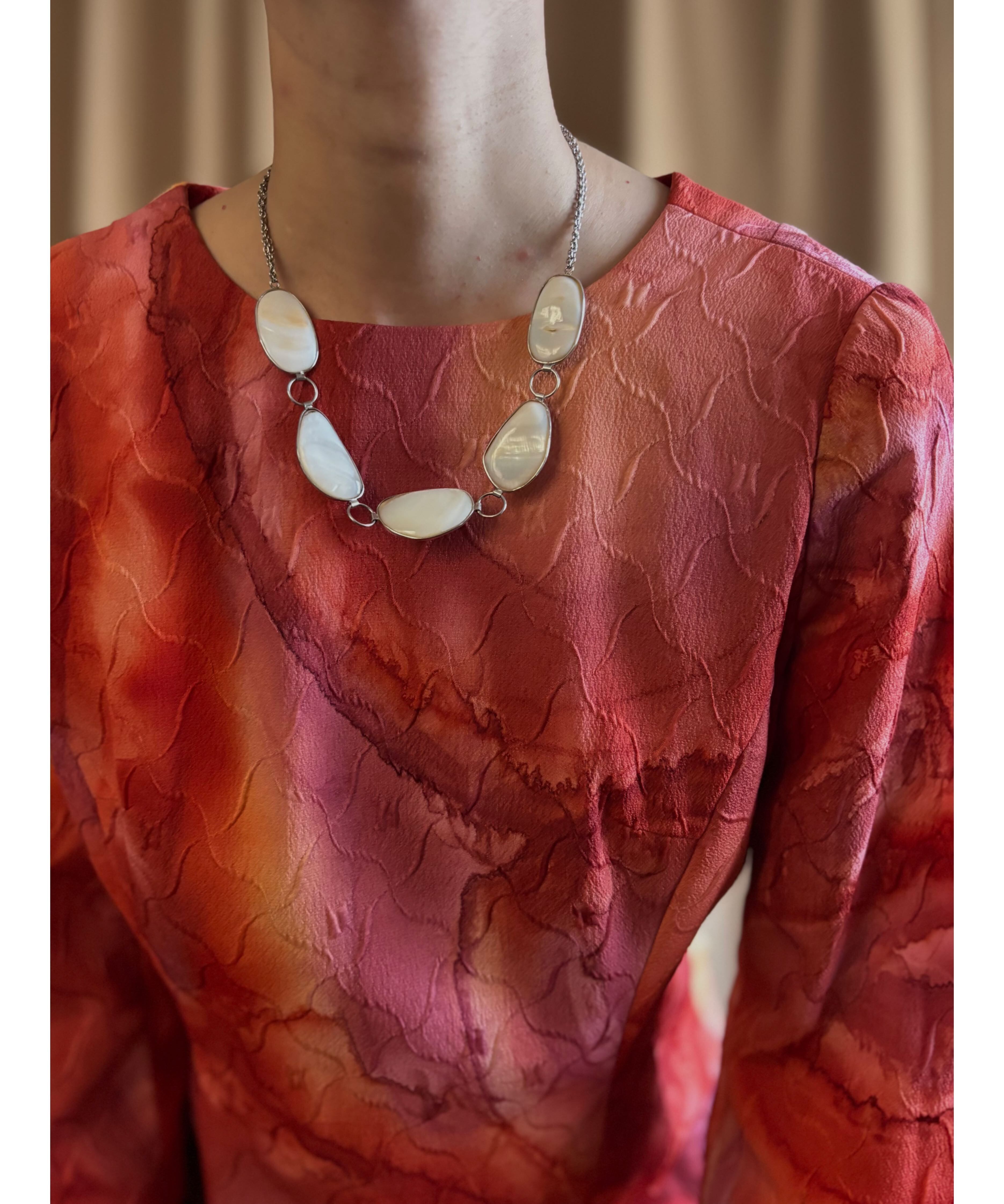 天然素材ならではの幻想的な輝きに、構築的なディテールに落とし込むことでモードな印象に。