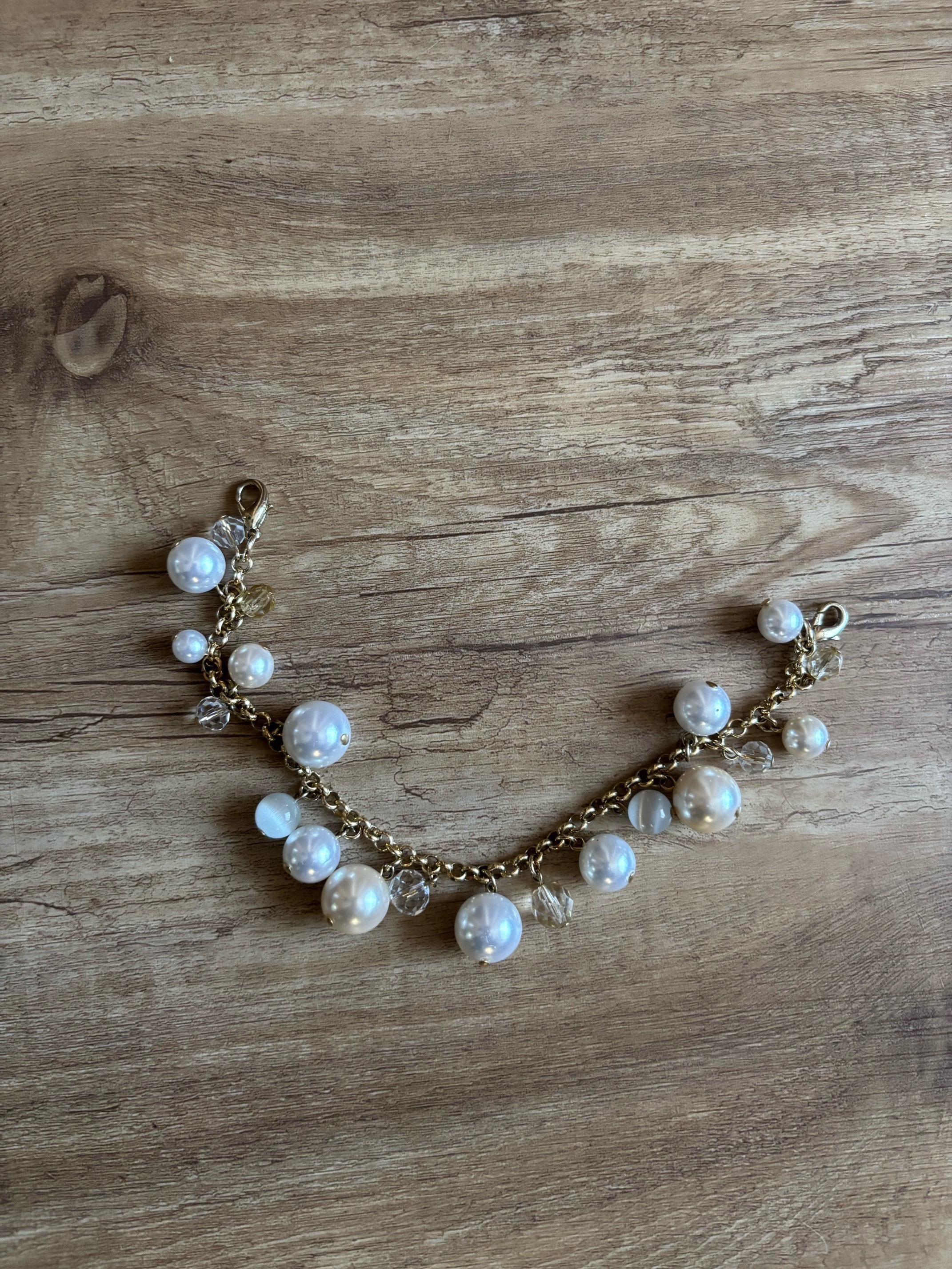 ゴールドチェーンとパールチェーンを組み合わせた華やぎ溢れるデザイン。