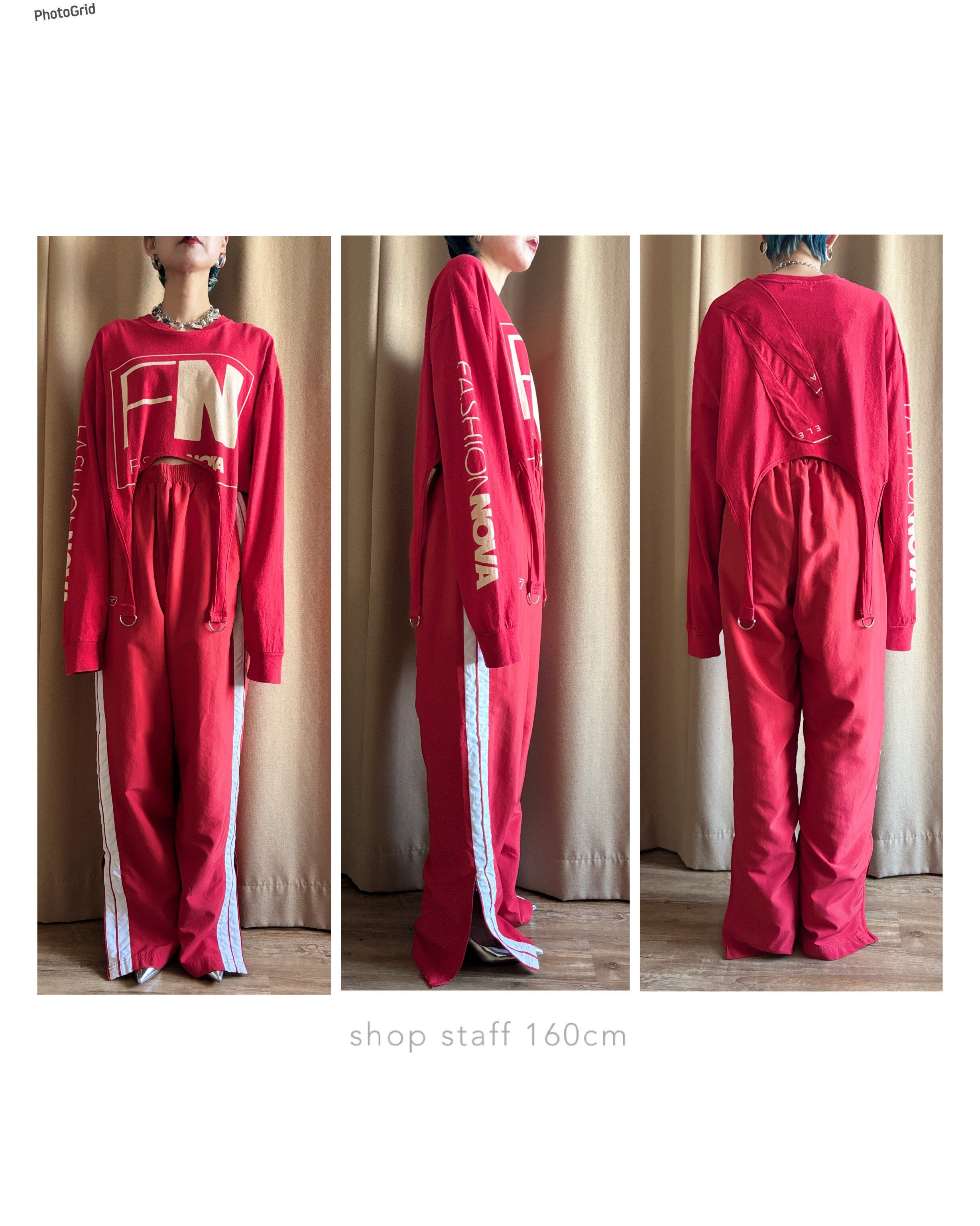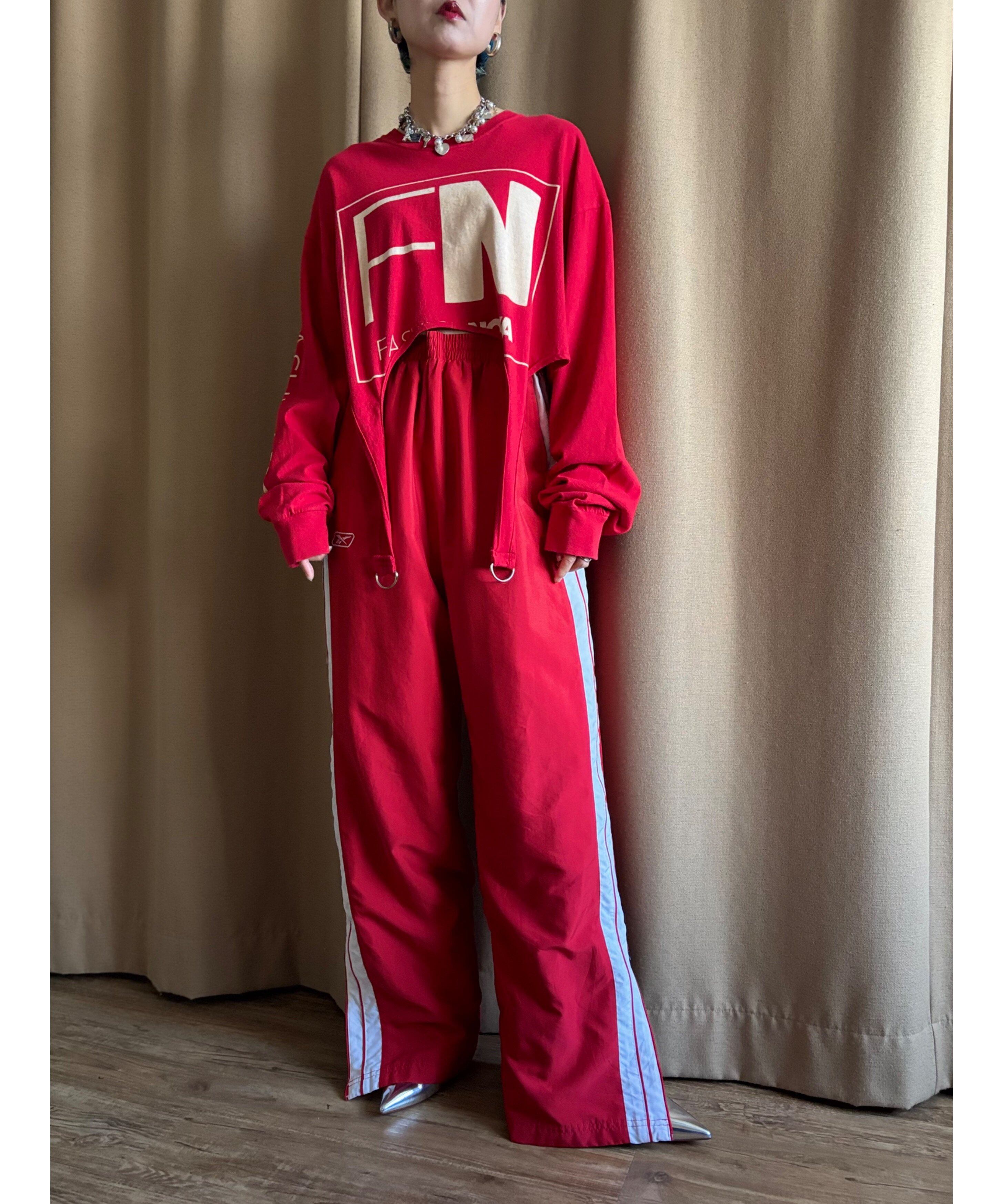 インポート古着ならではの遊び心溢れるロゴデザインに、裾ガーターベルトでトレンドライクに仕上げた唯一無二のアイテム。