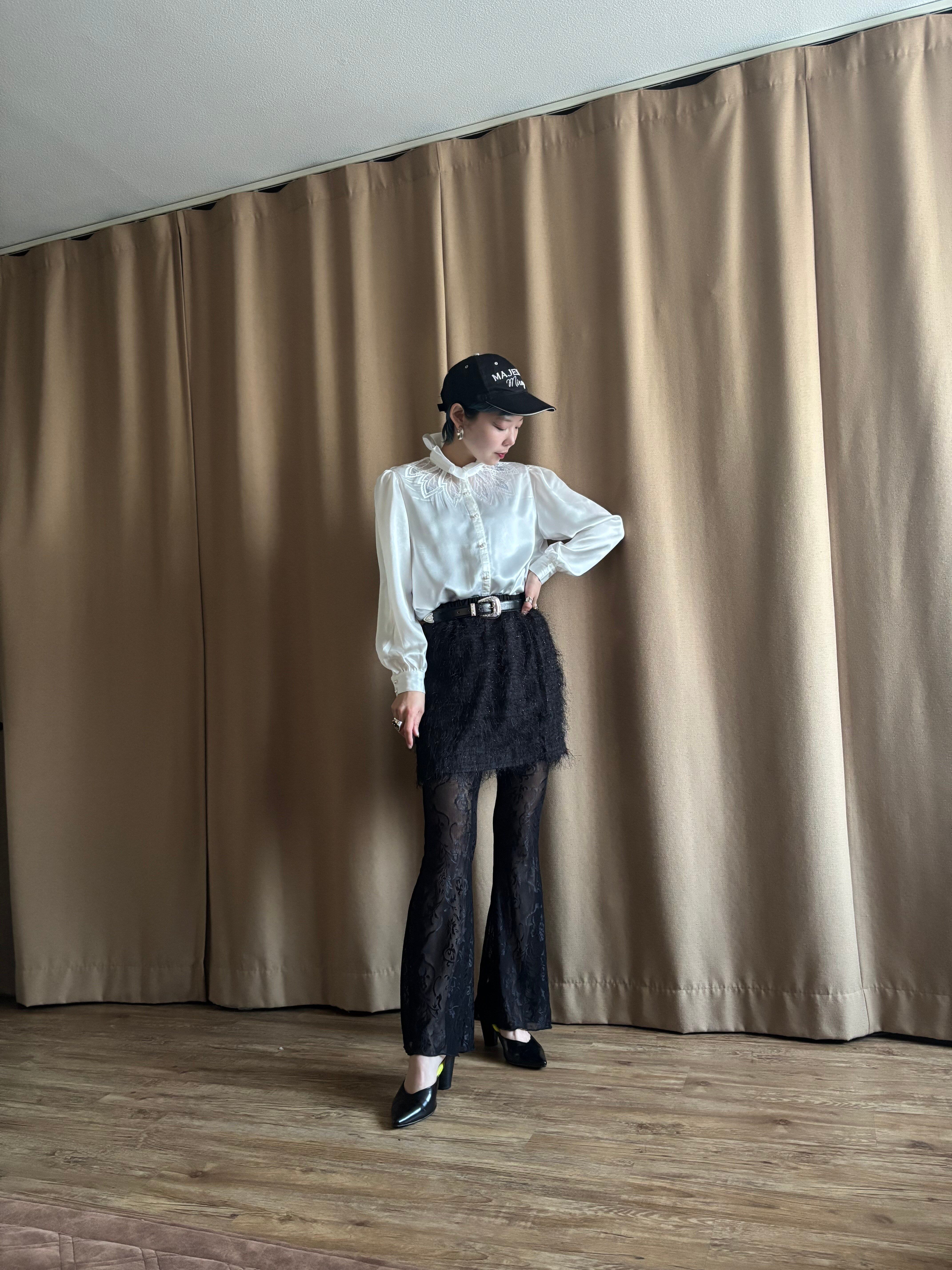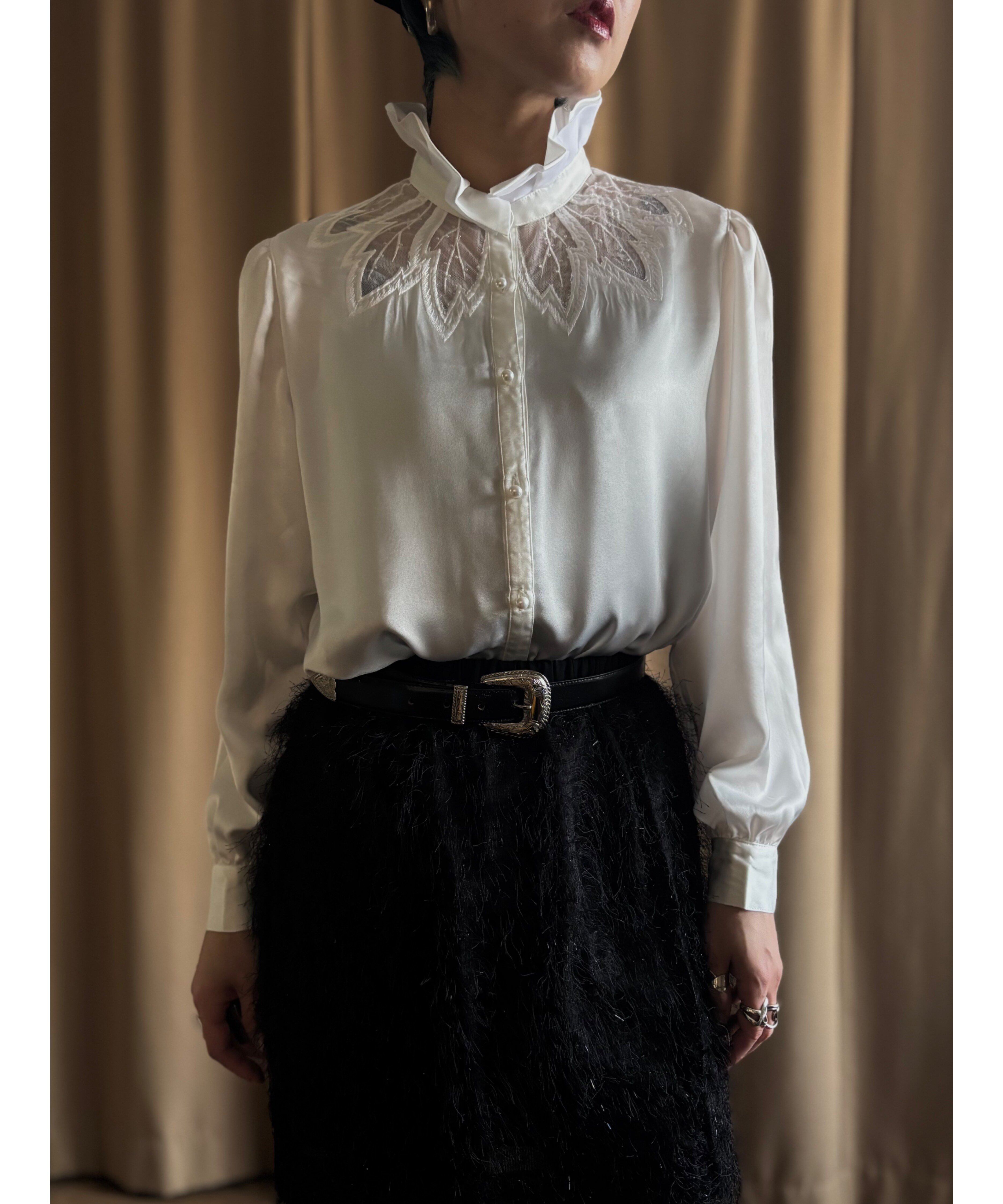 構築的なハイネックフリルに、フロント刺繍レースが高級感溢れる拘りのディテール。