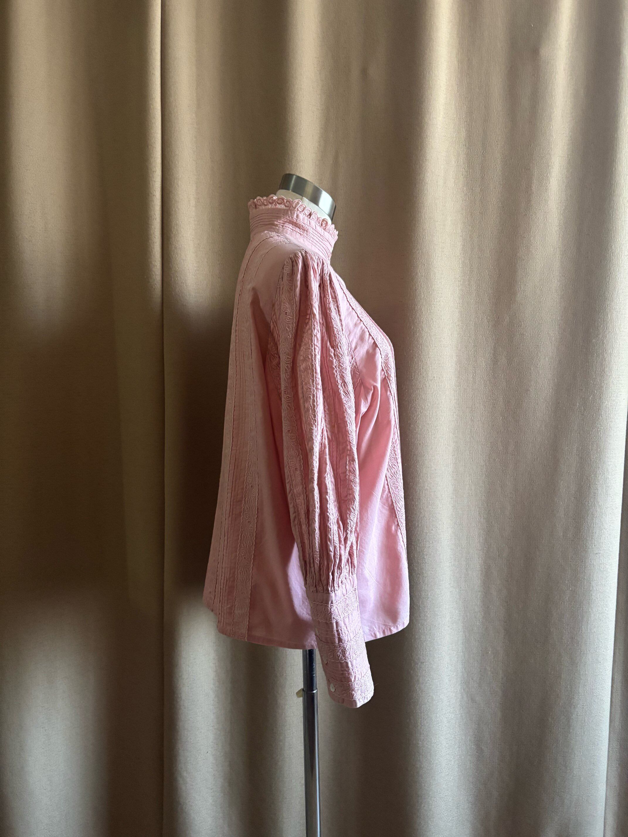 4連ボタンのロングカフスやフリルハイネックなど細部にまで拘りを感じるクラシカルなディテールが目を惹きます。