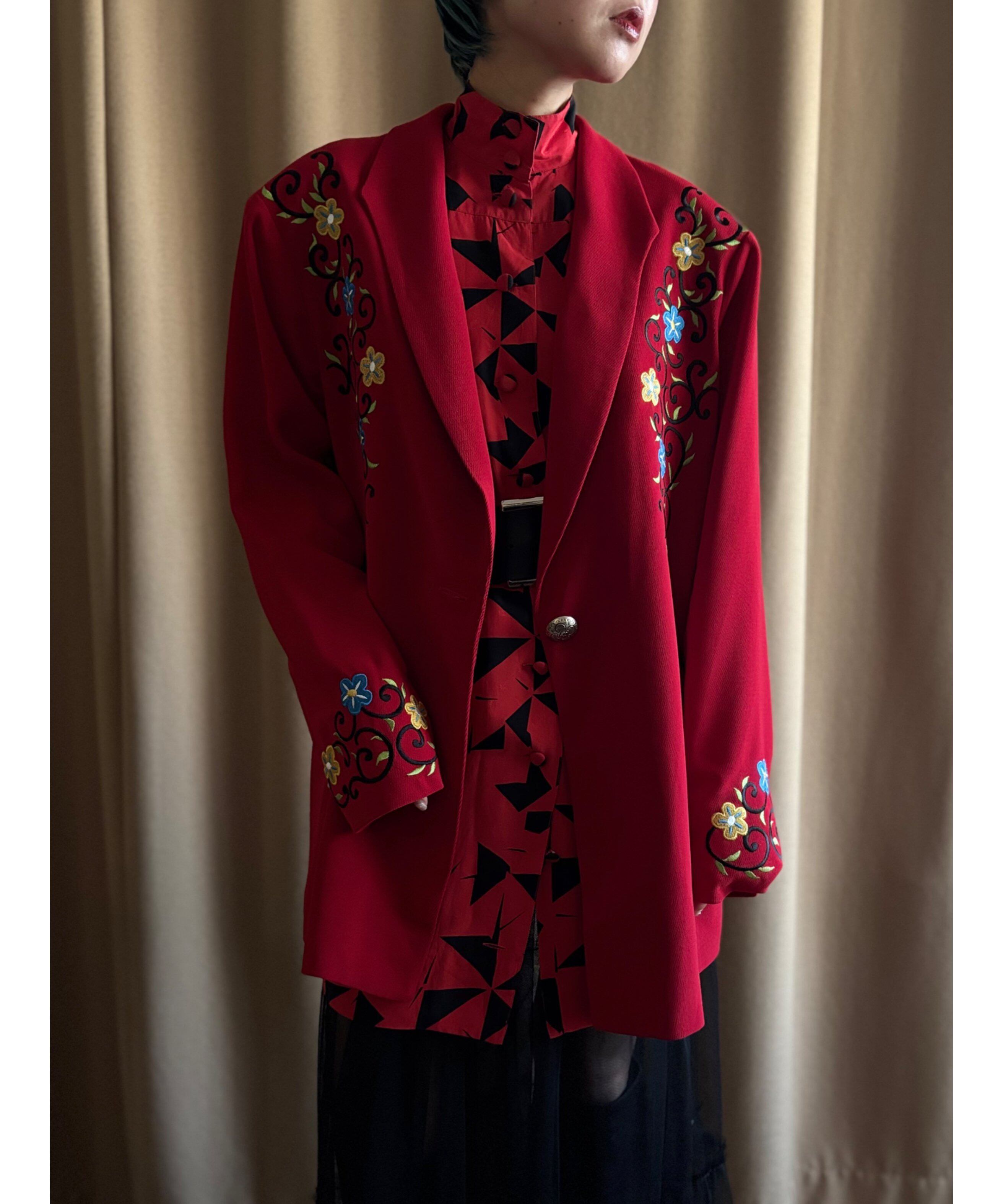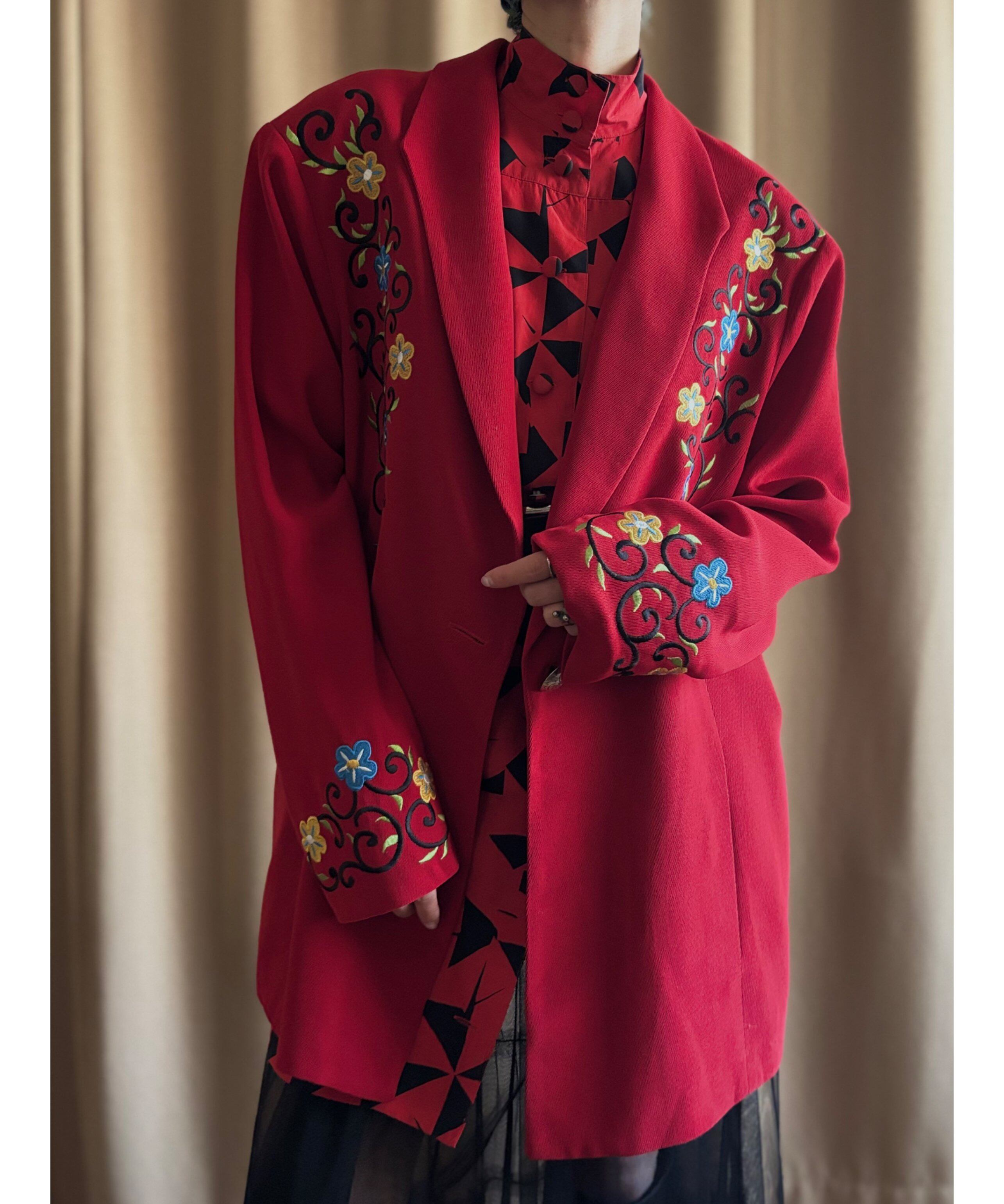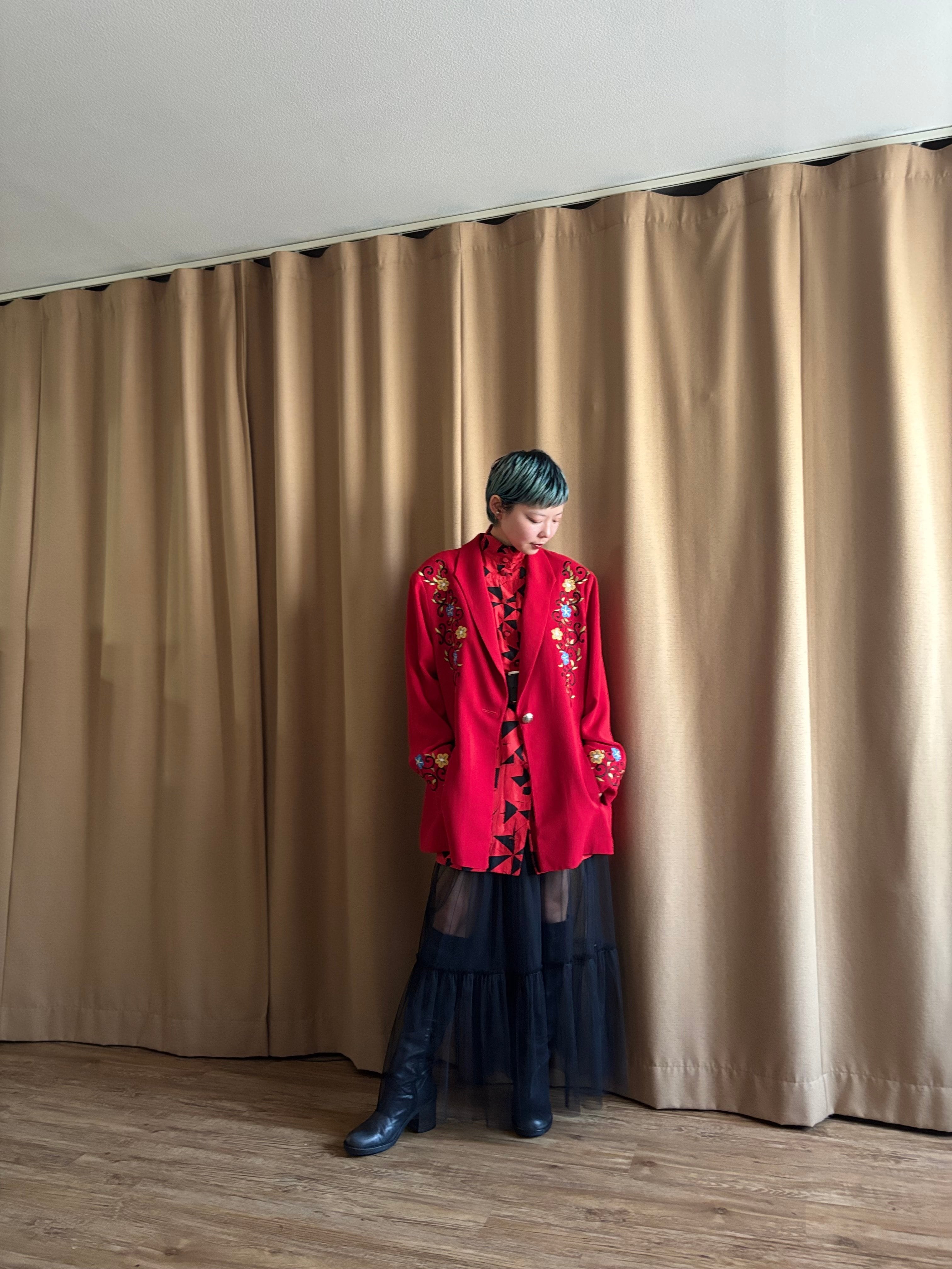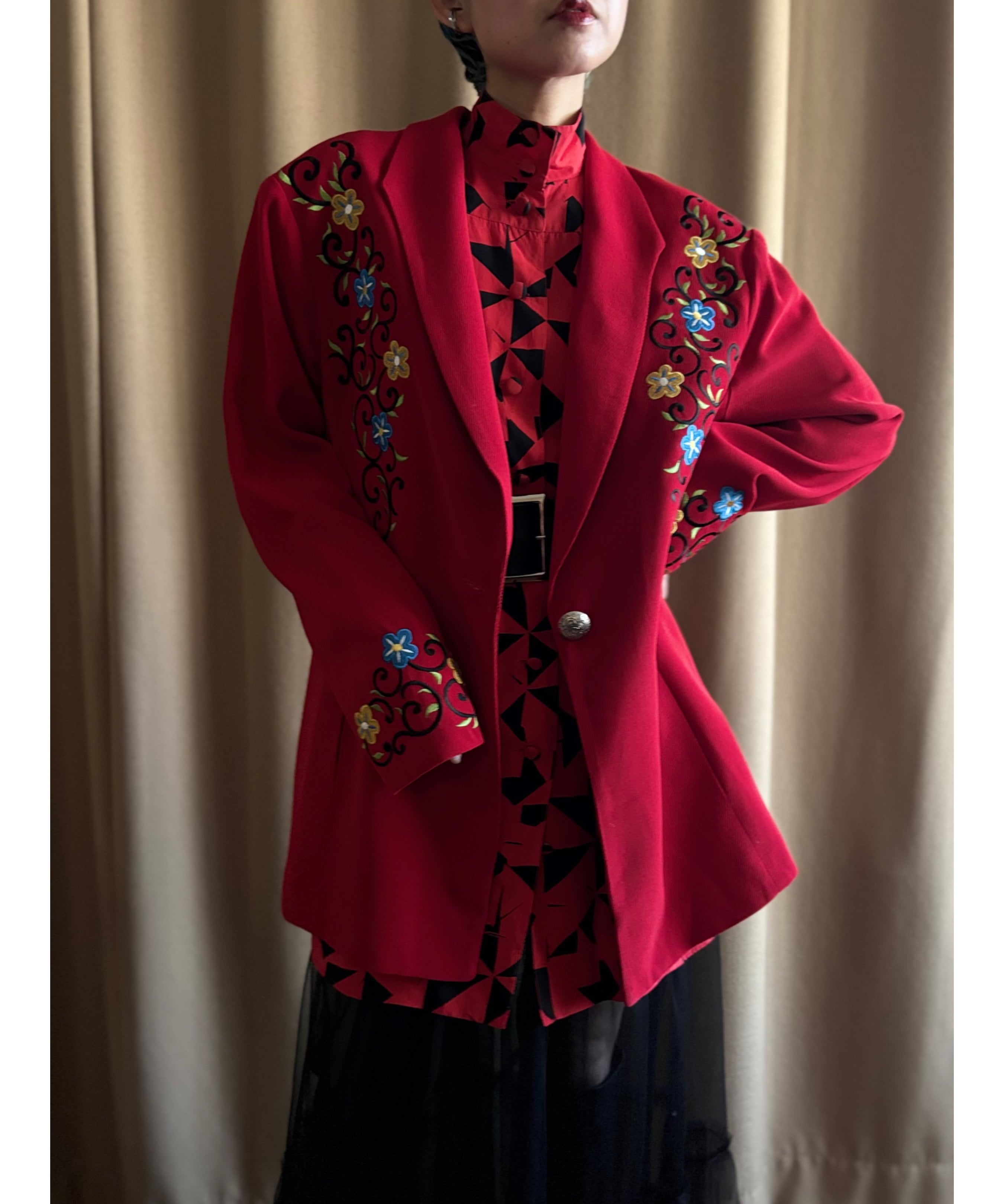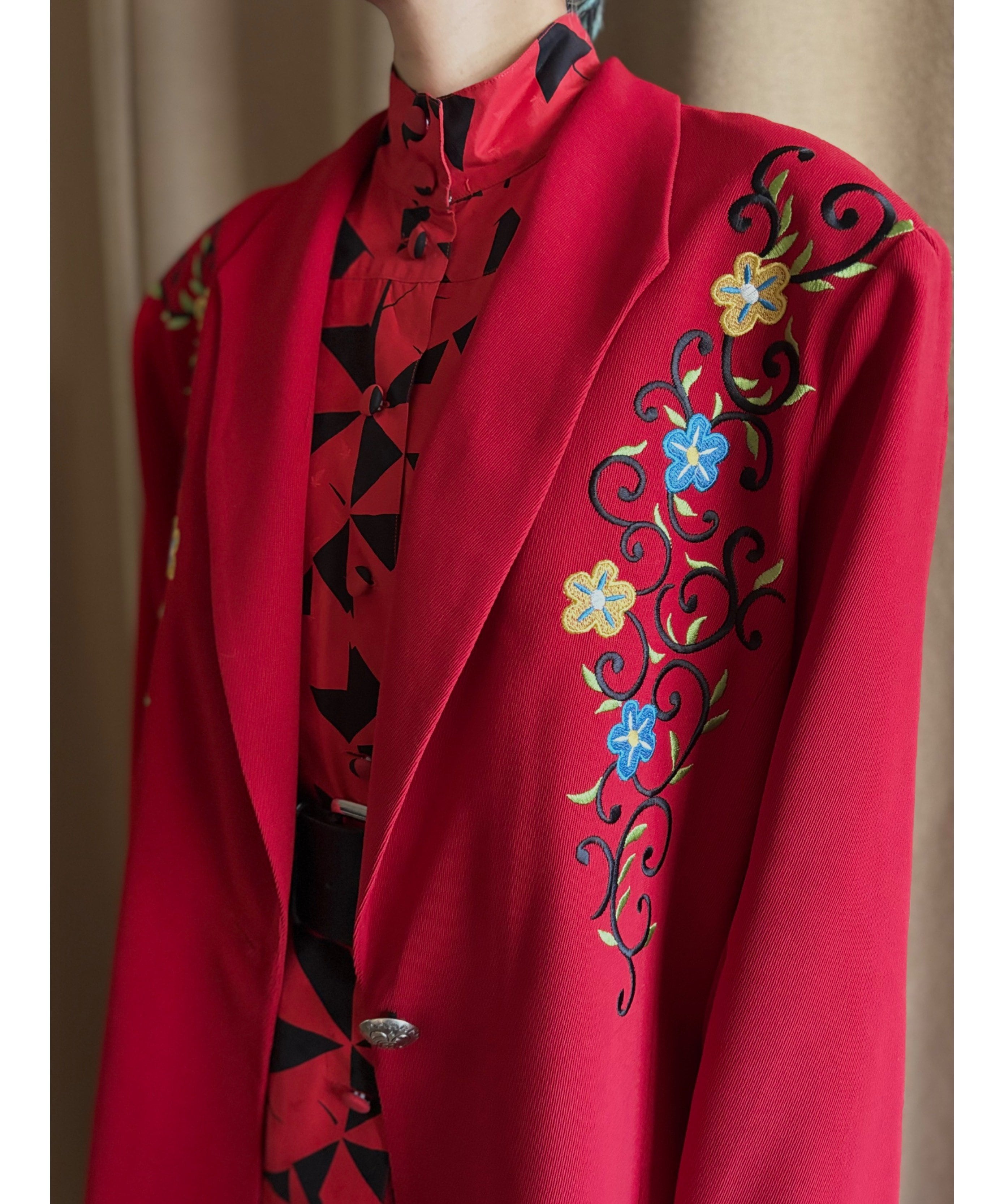 色鮮やかなレッド×花柄刺繍のレトロなディテールに、パワーショルダー×オーバーサイズシルエットでモードに落とし込んだ拘りの一着。