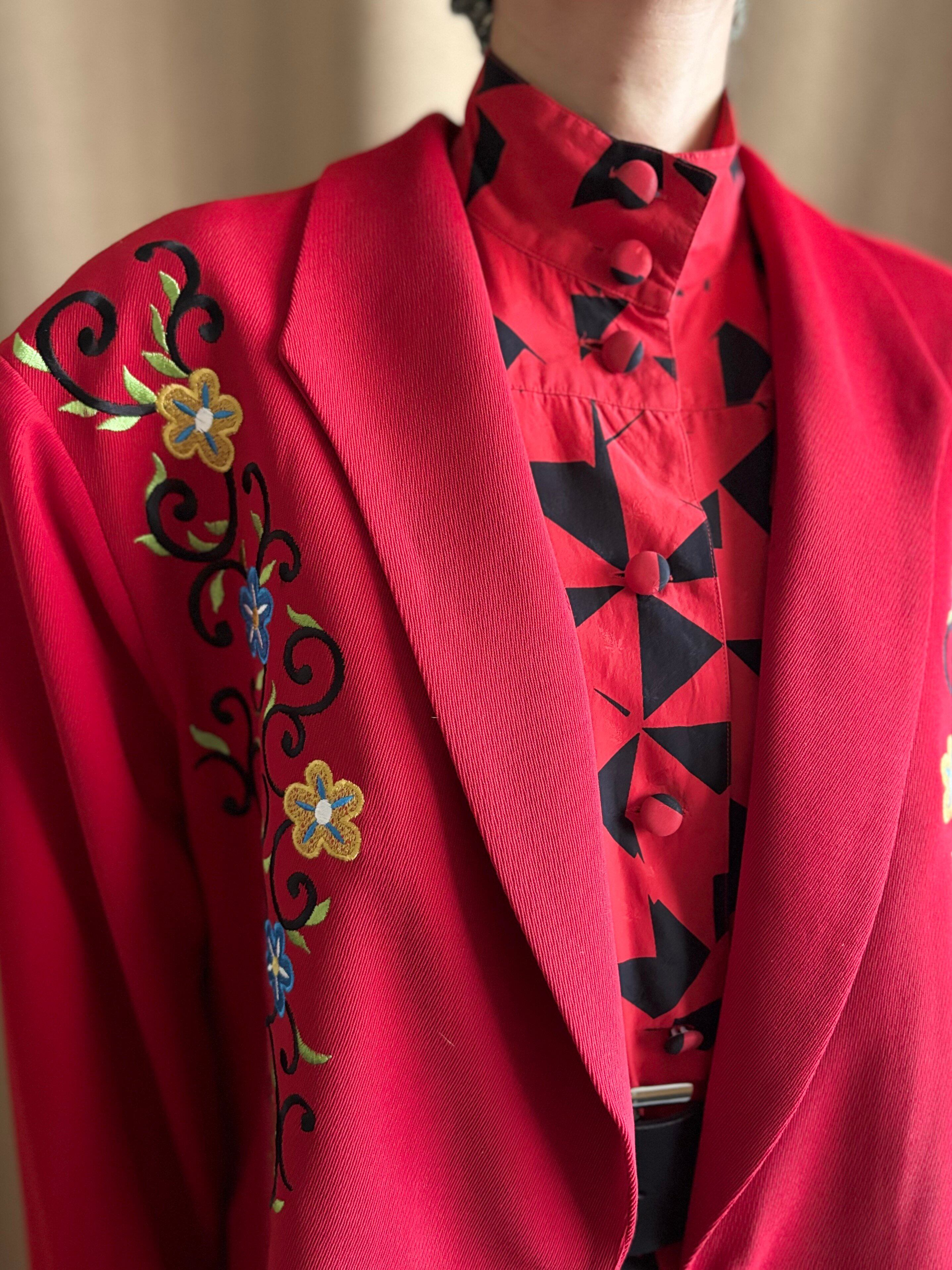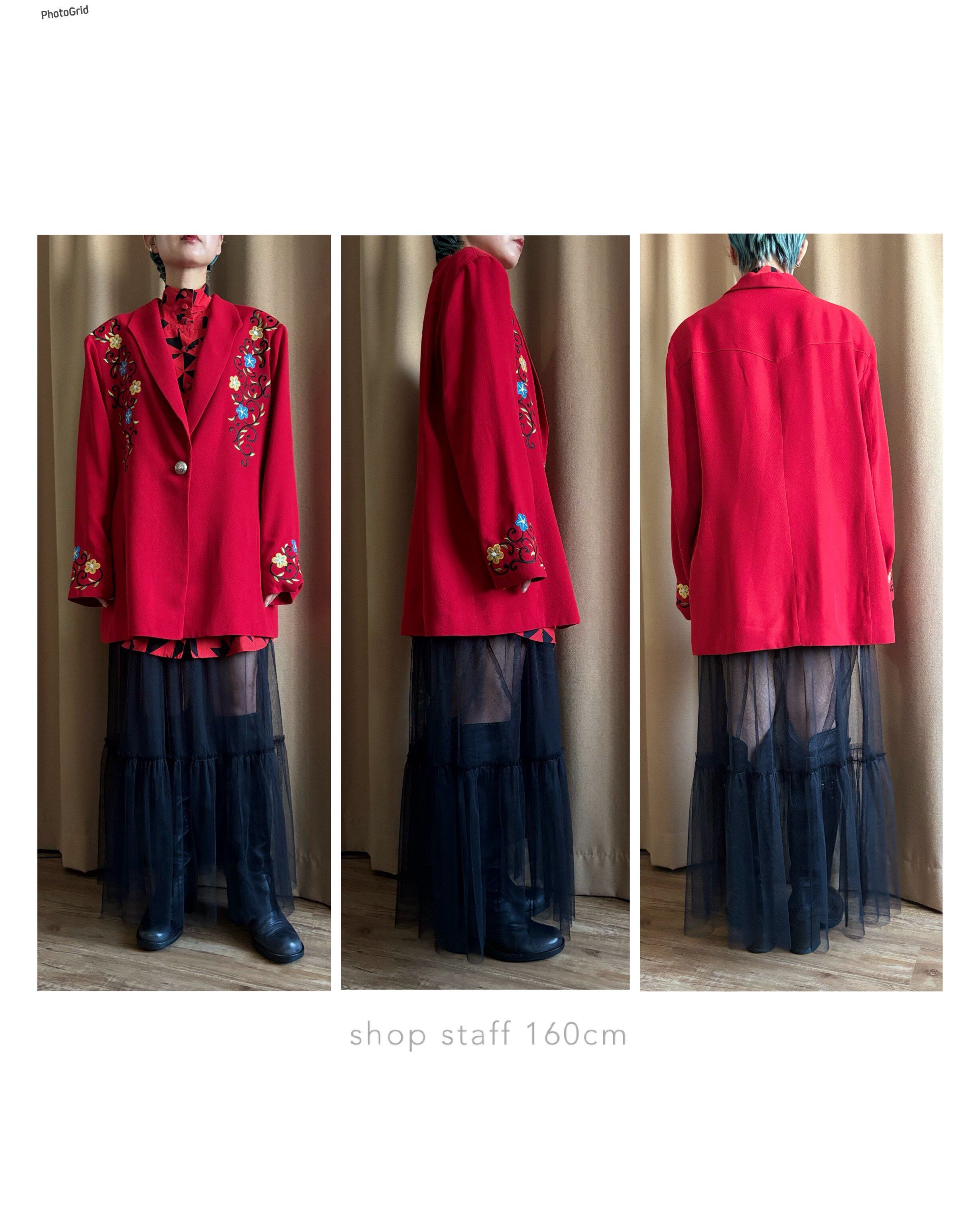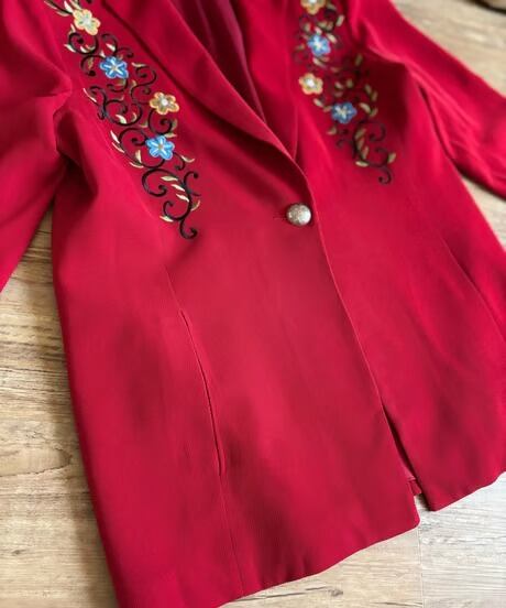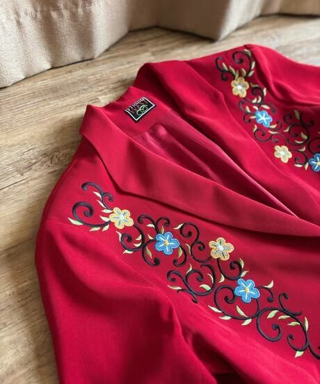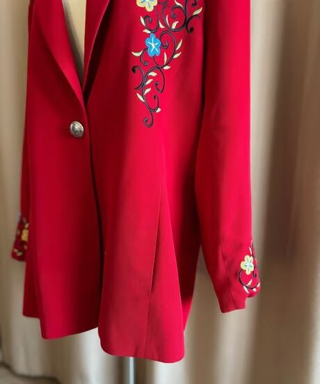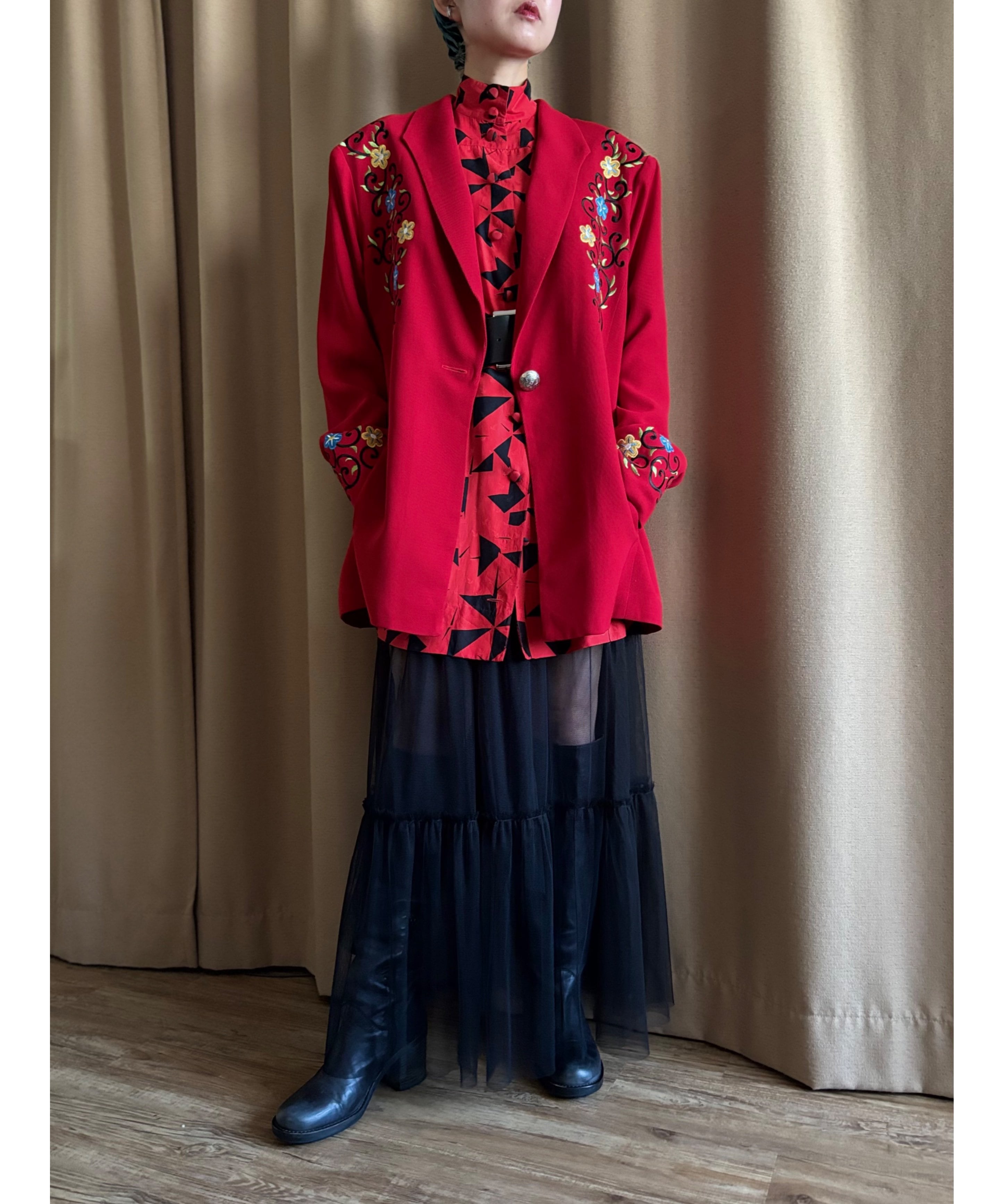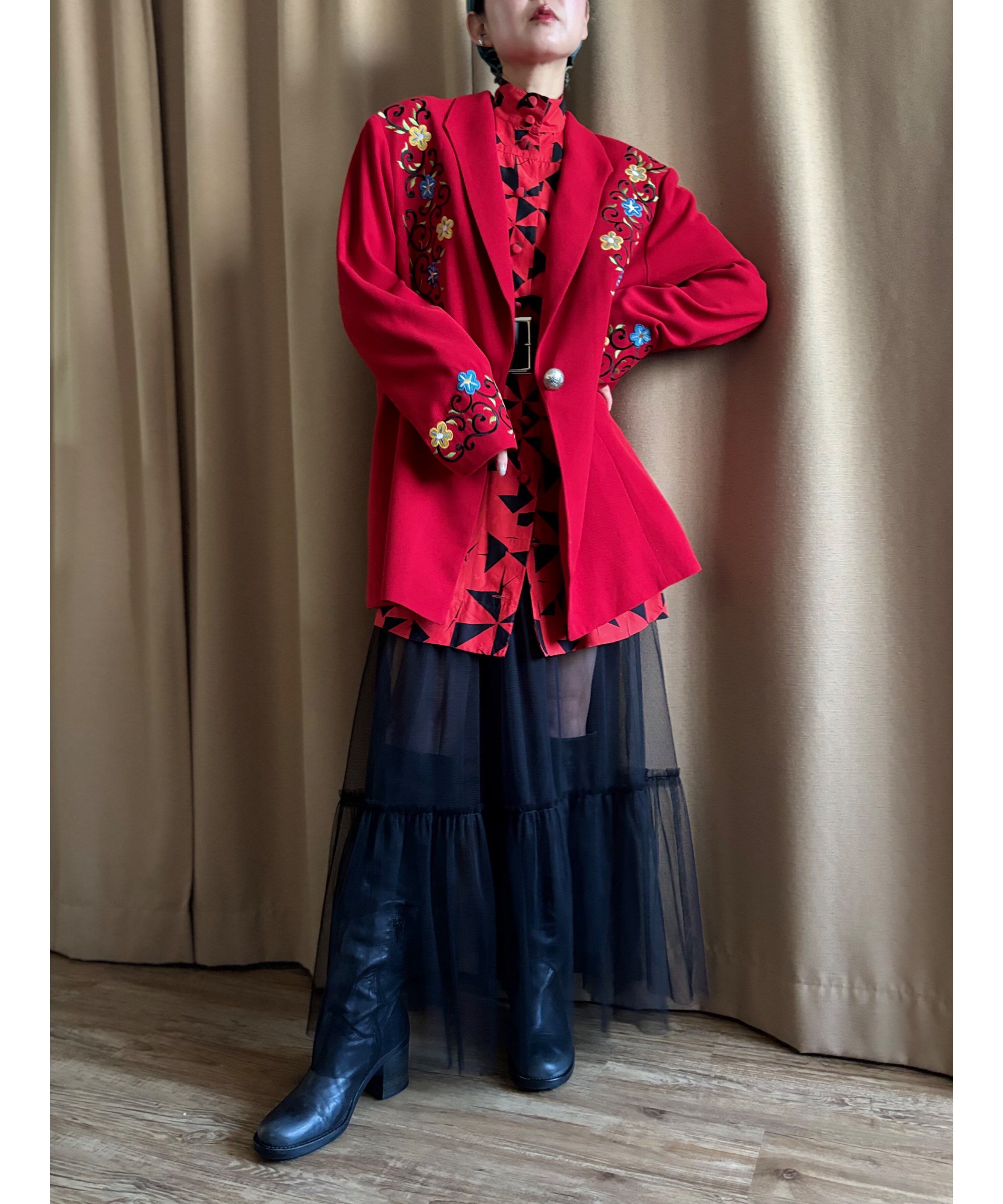 色鮮やかなレッド×花柄刺繍のレトロなディテールに、パワーショルダー×オーバーサイズシルエットでモードに落とし込んだ拘りの一着。