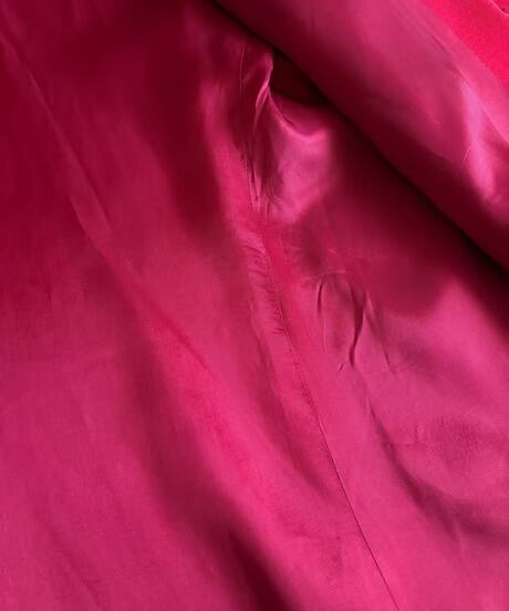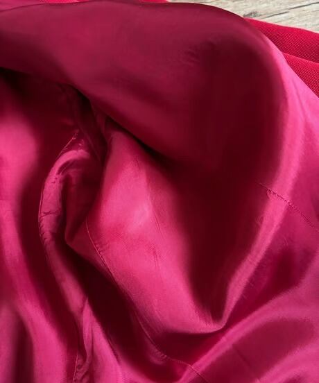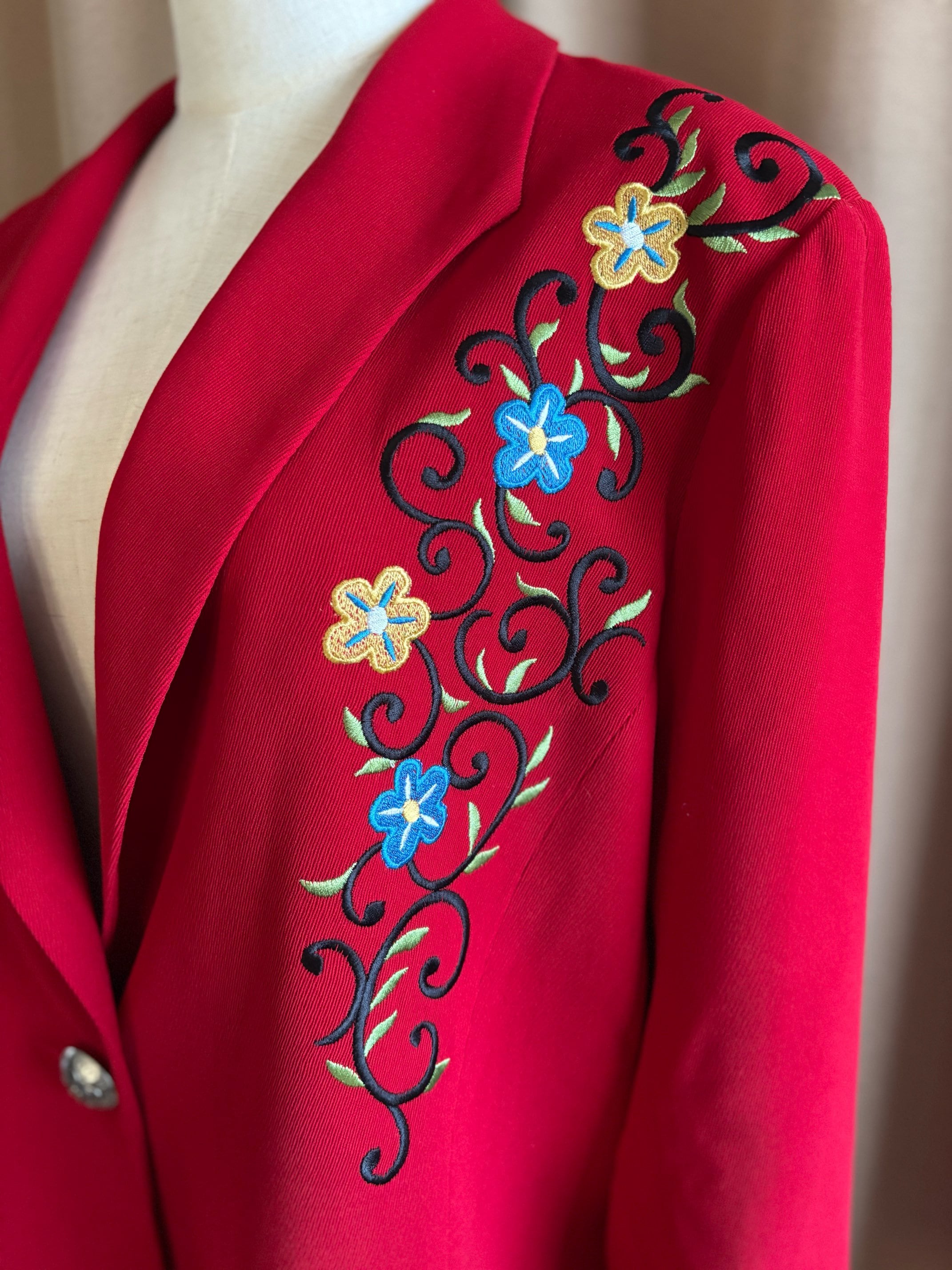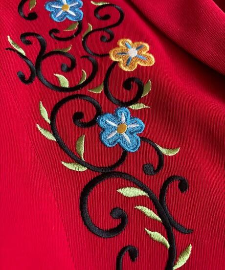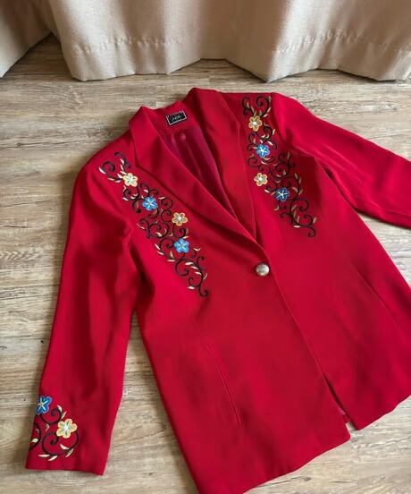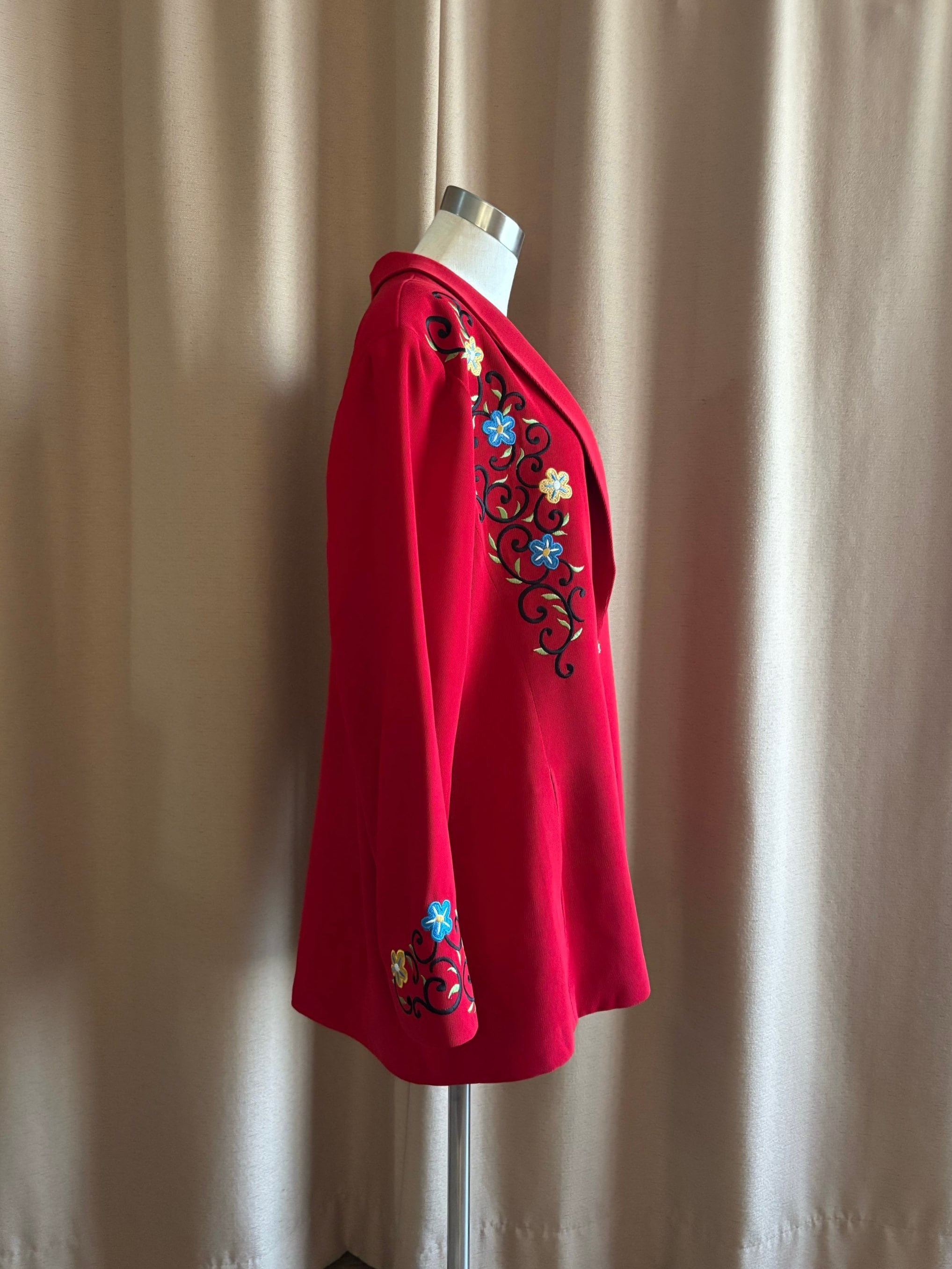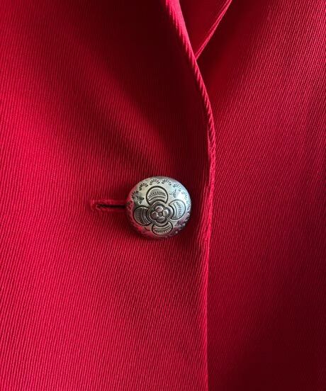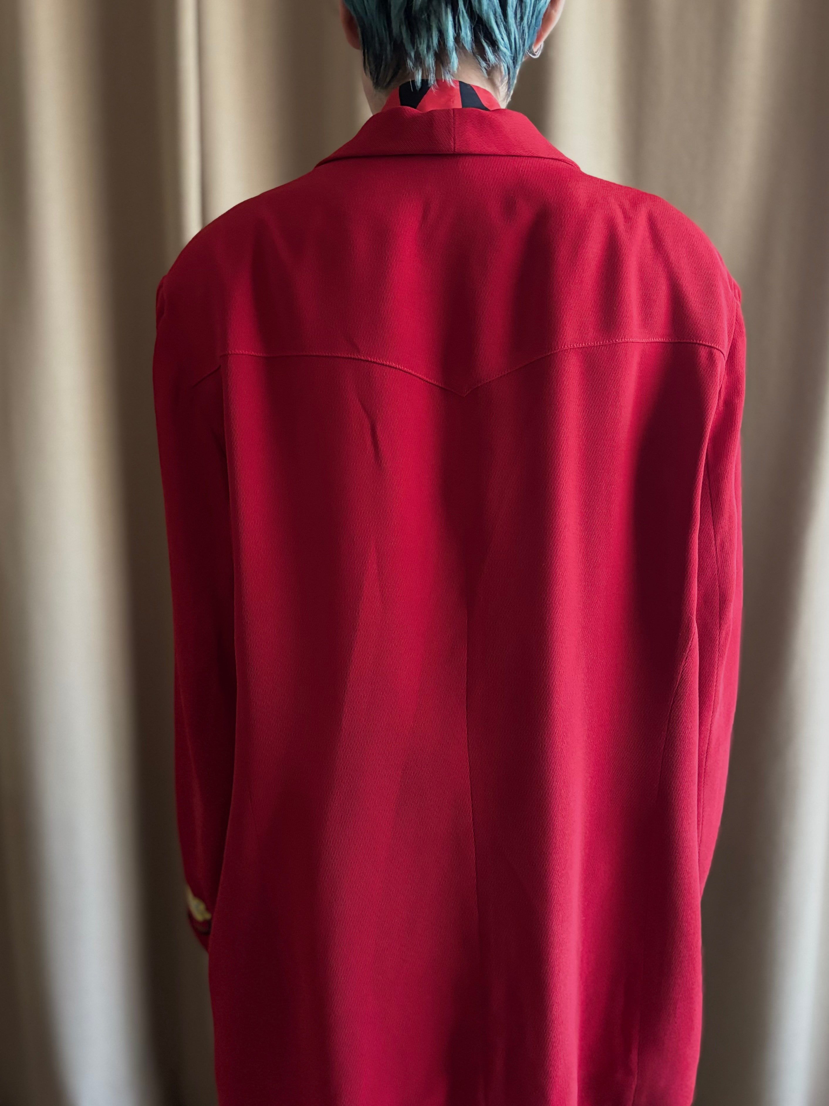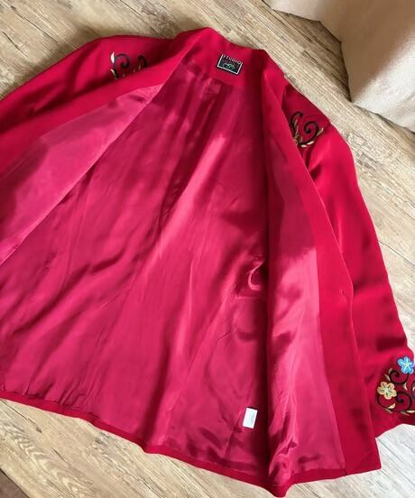 色鮮やかなレッド×花柄刺繍のレトロなディテールに、パワーショルダー×オーバーサイズシルエットでモードに落とし込んだ拘りの一着。