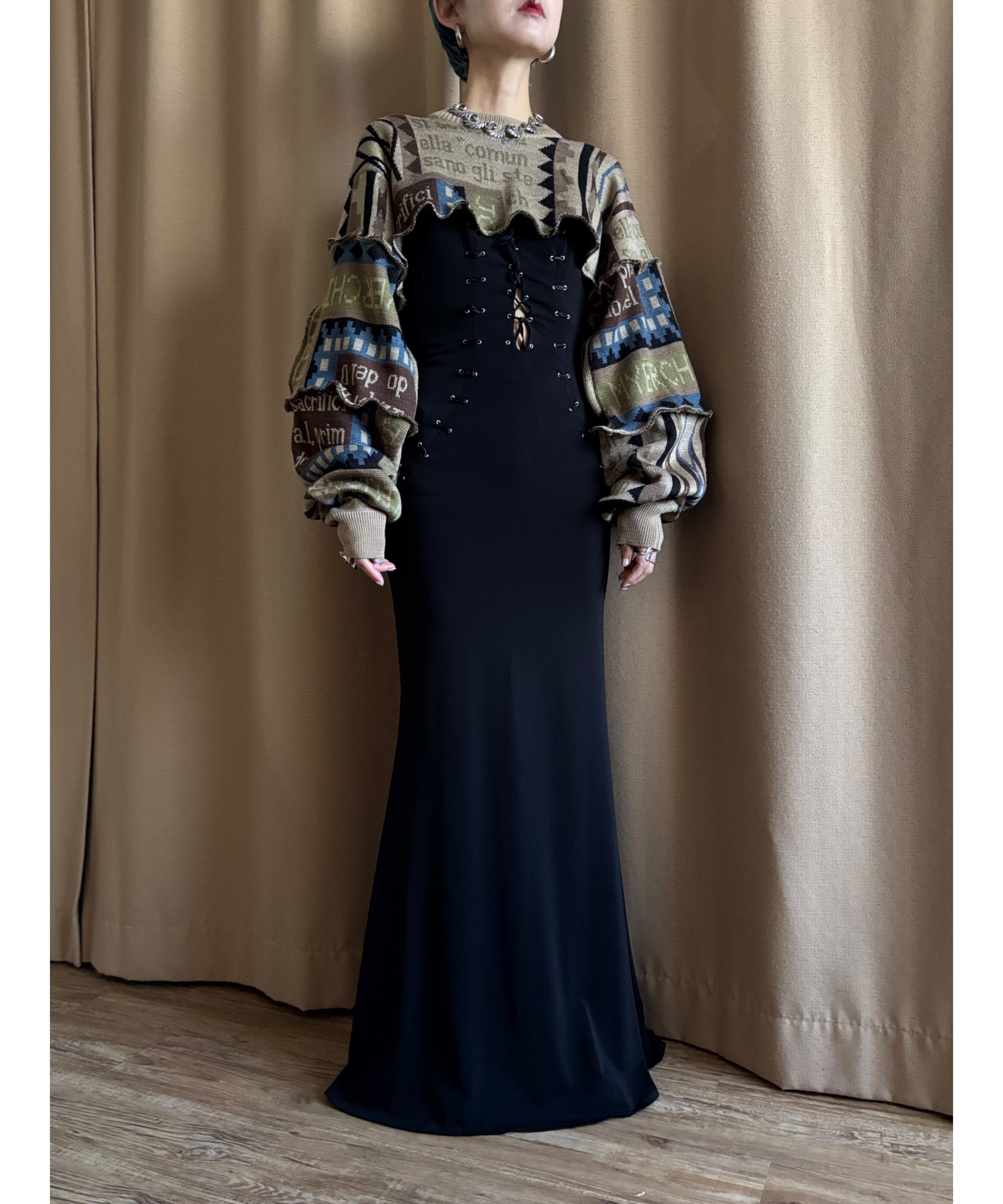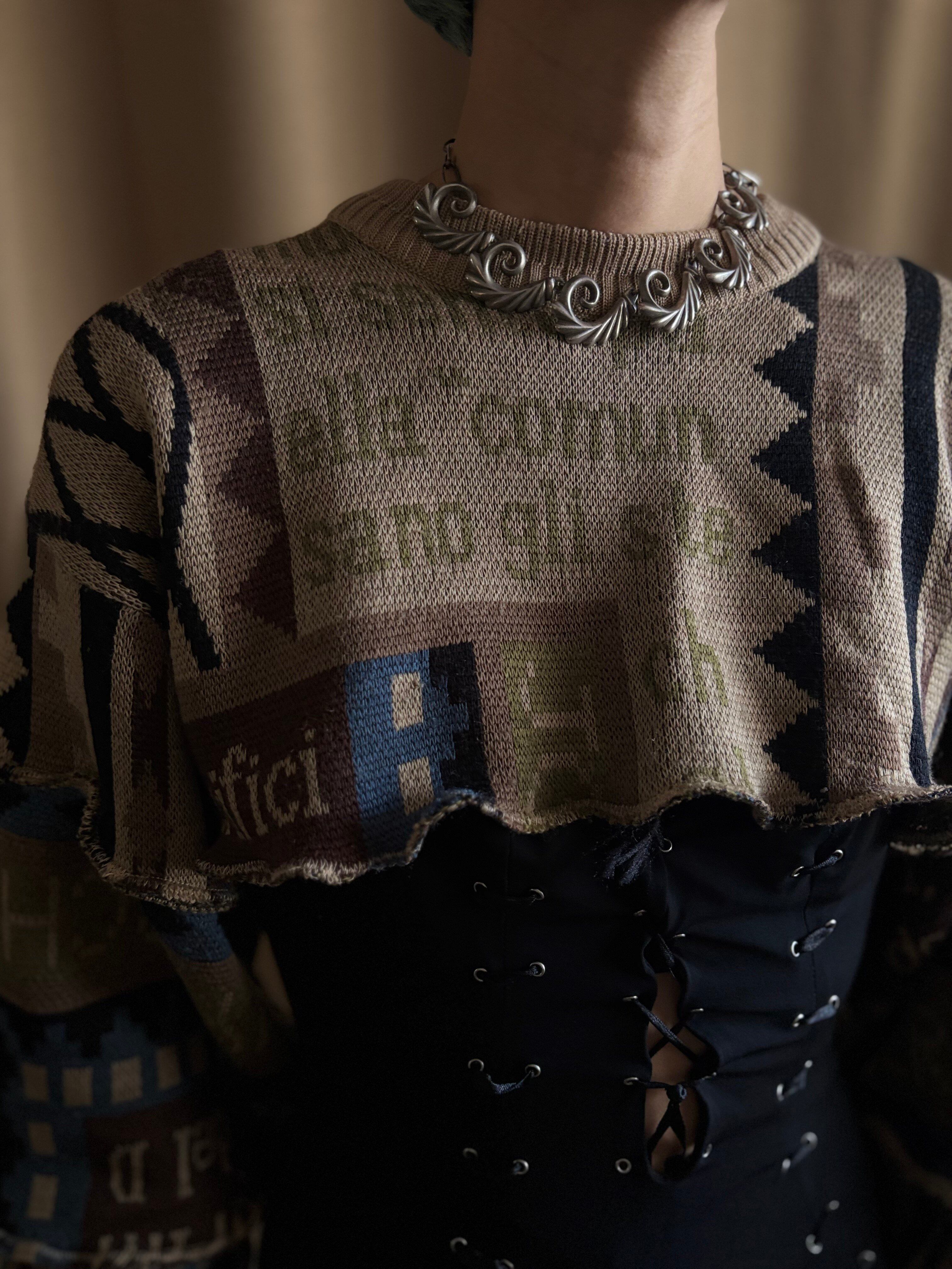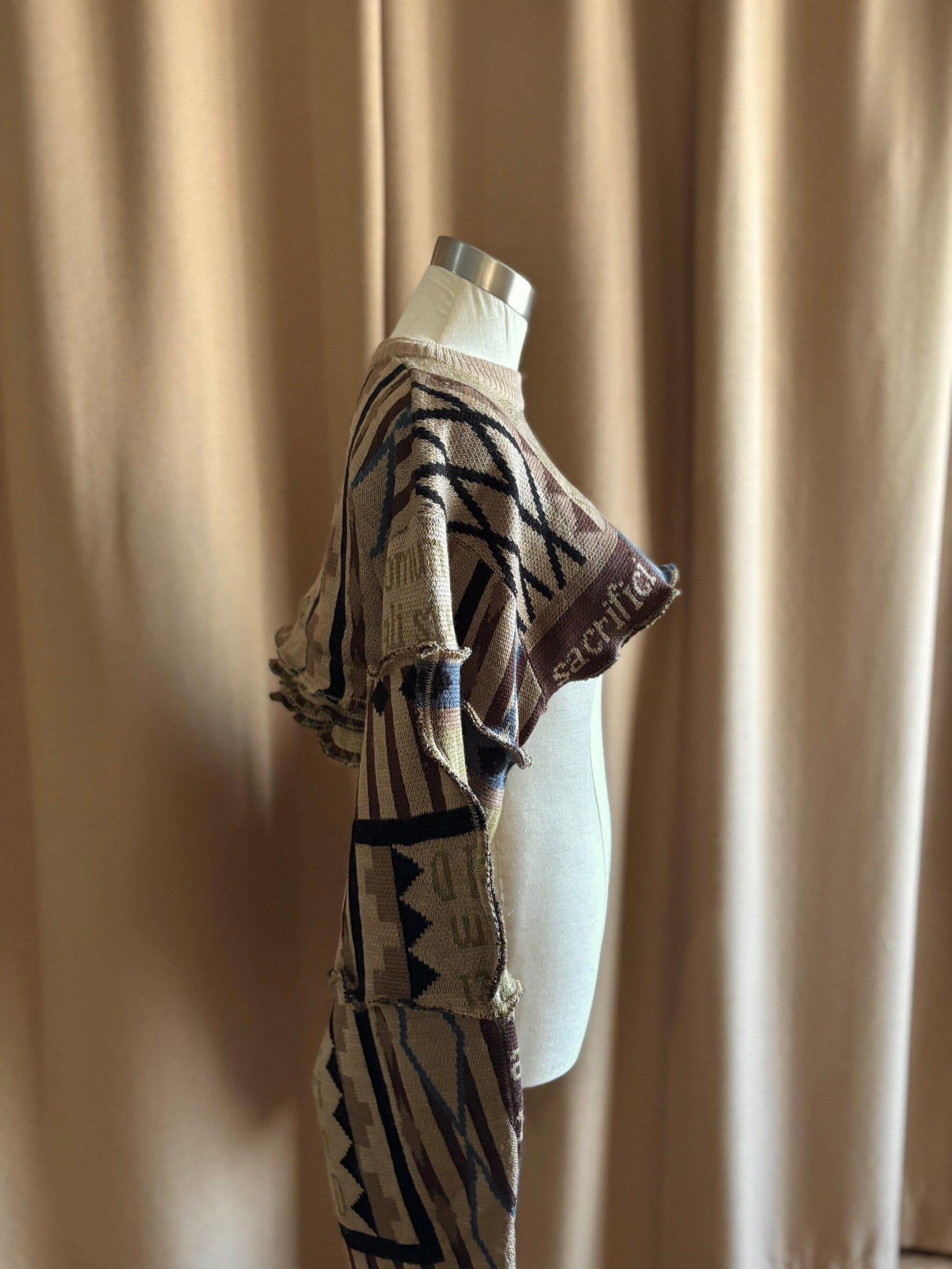 ベージュ×ブラウンのビターな配色にロゴデザインが個性的なリメイクニット。