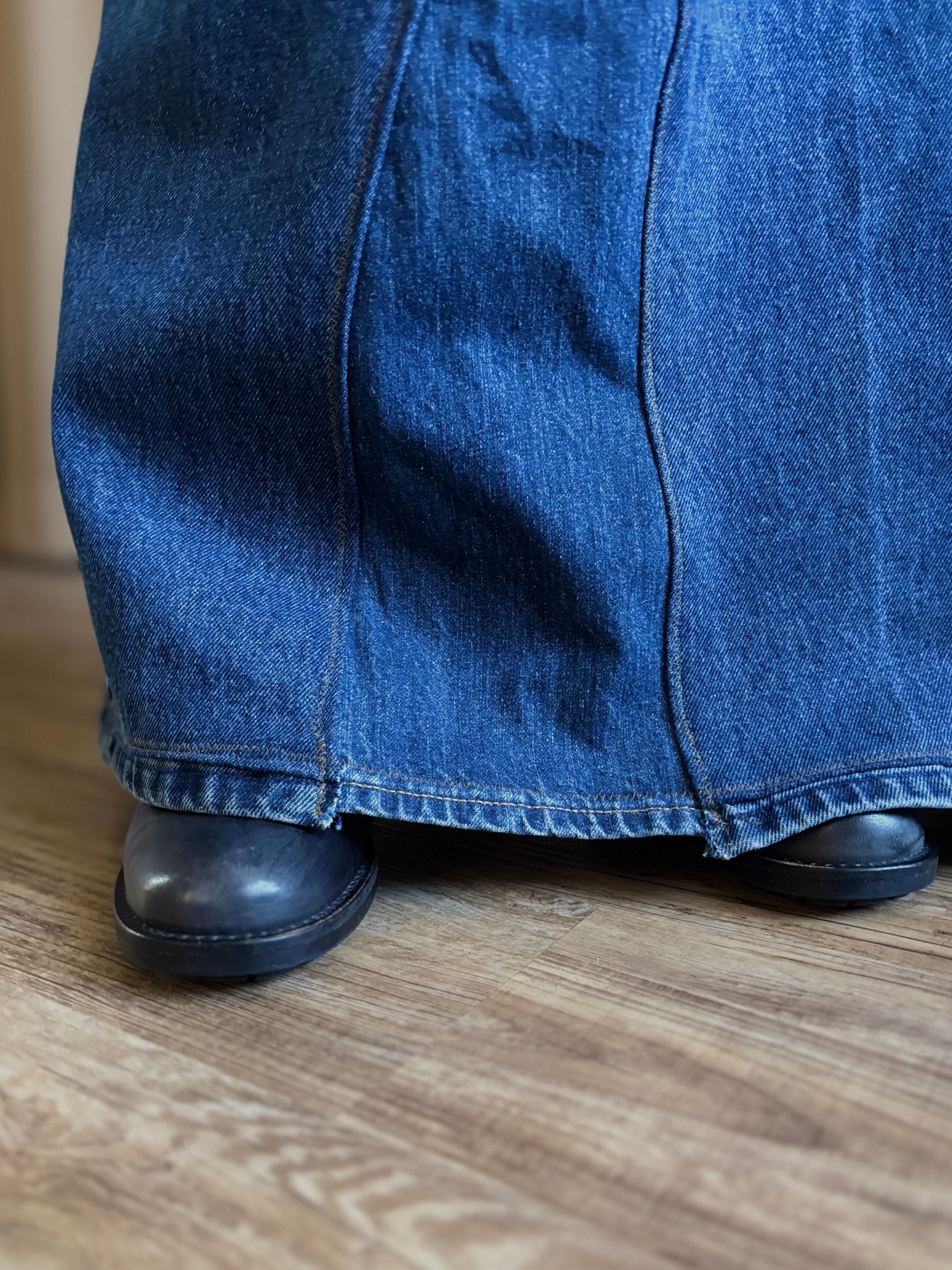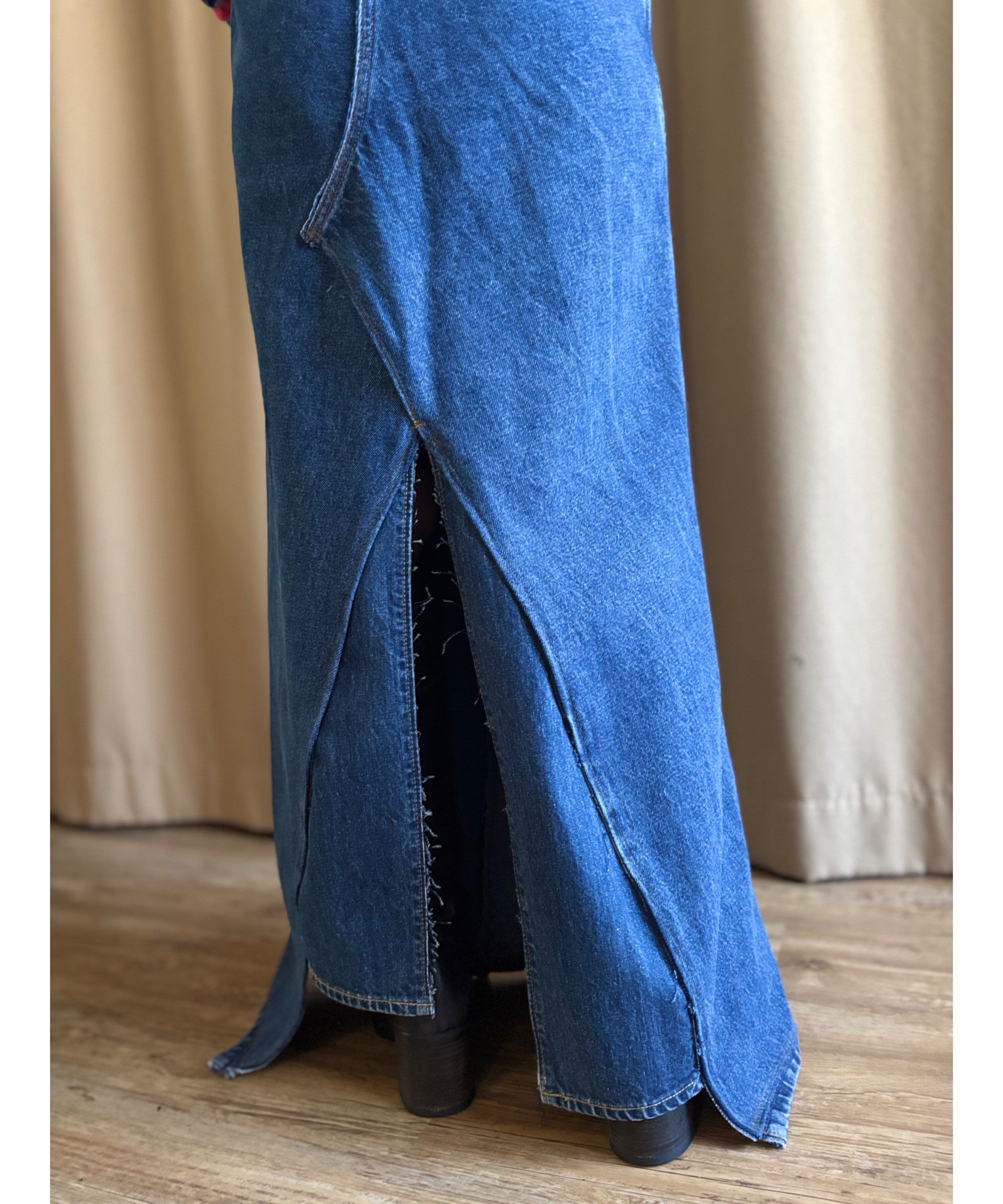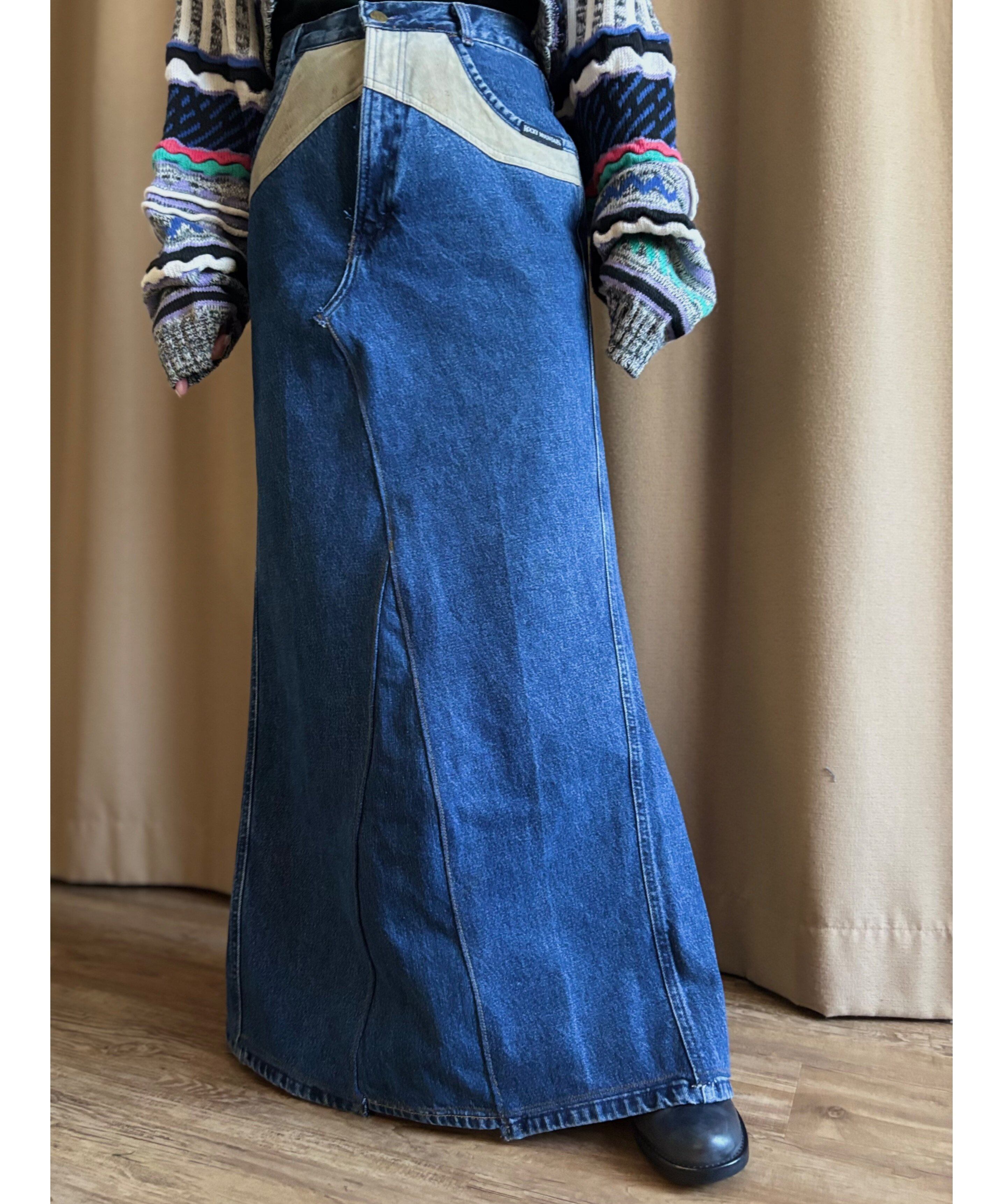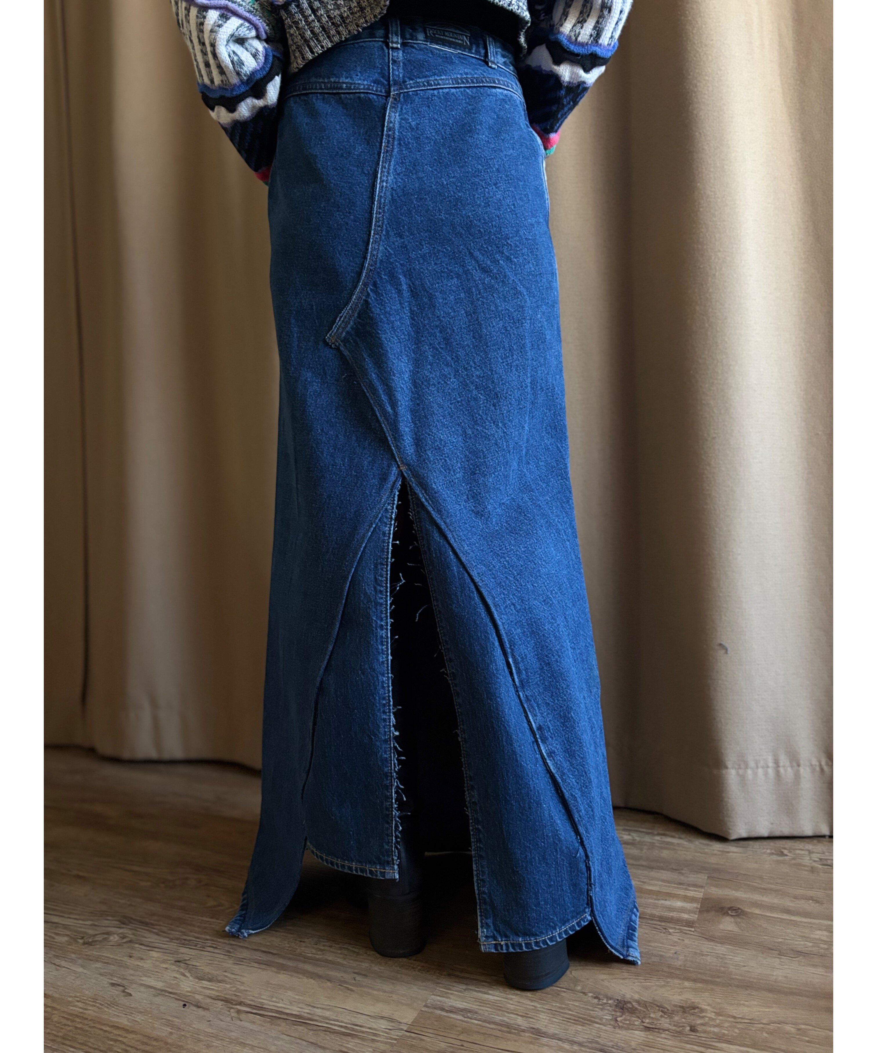 フロントデザイン切り替えがポイントのリメイクデニムスカート。