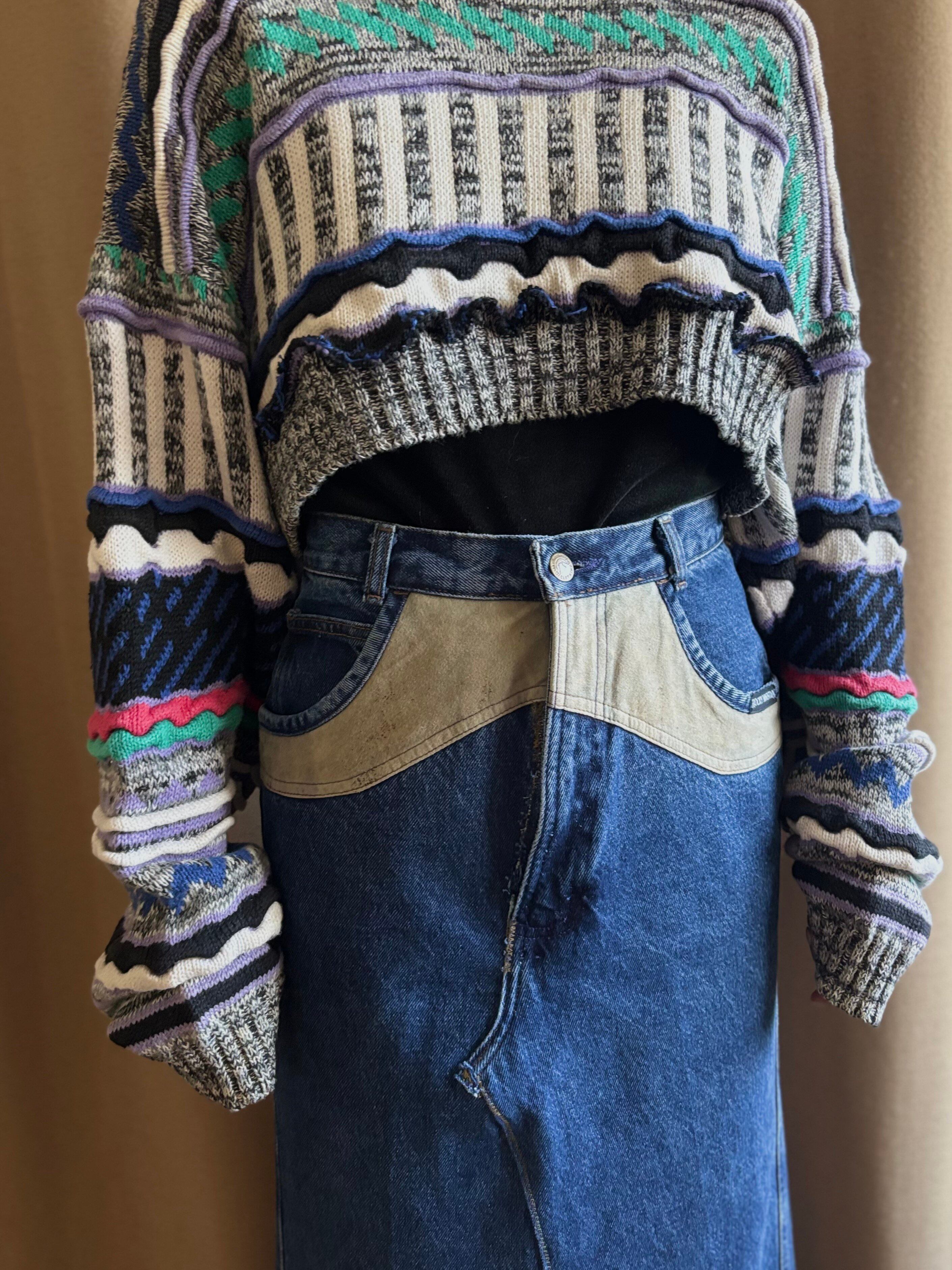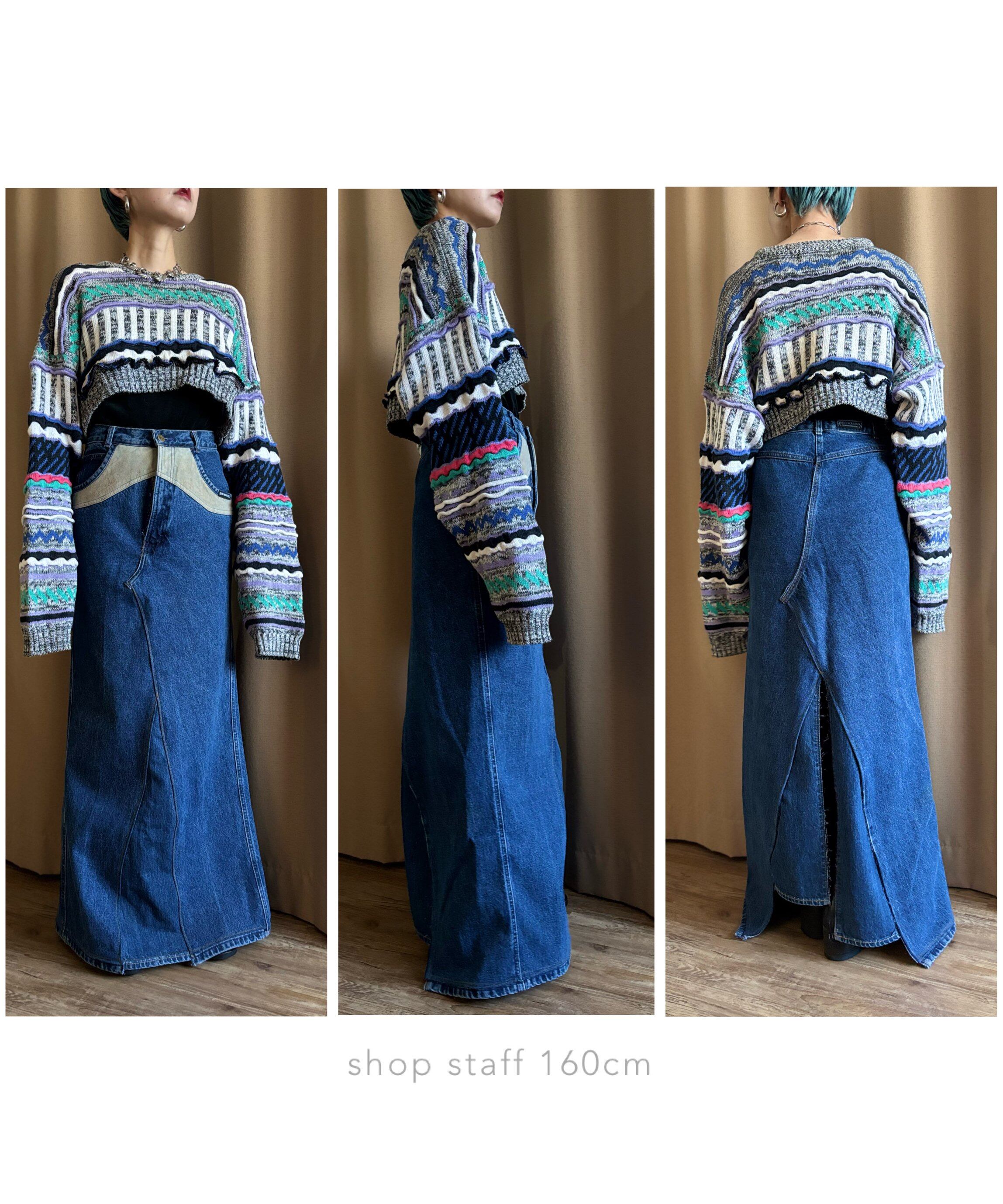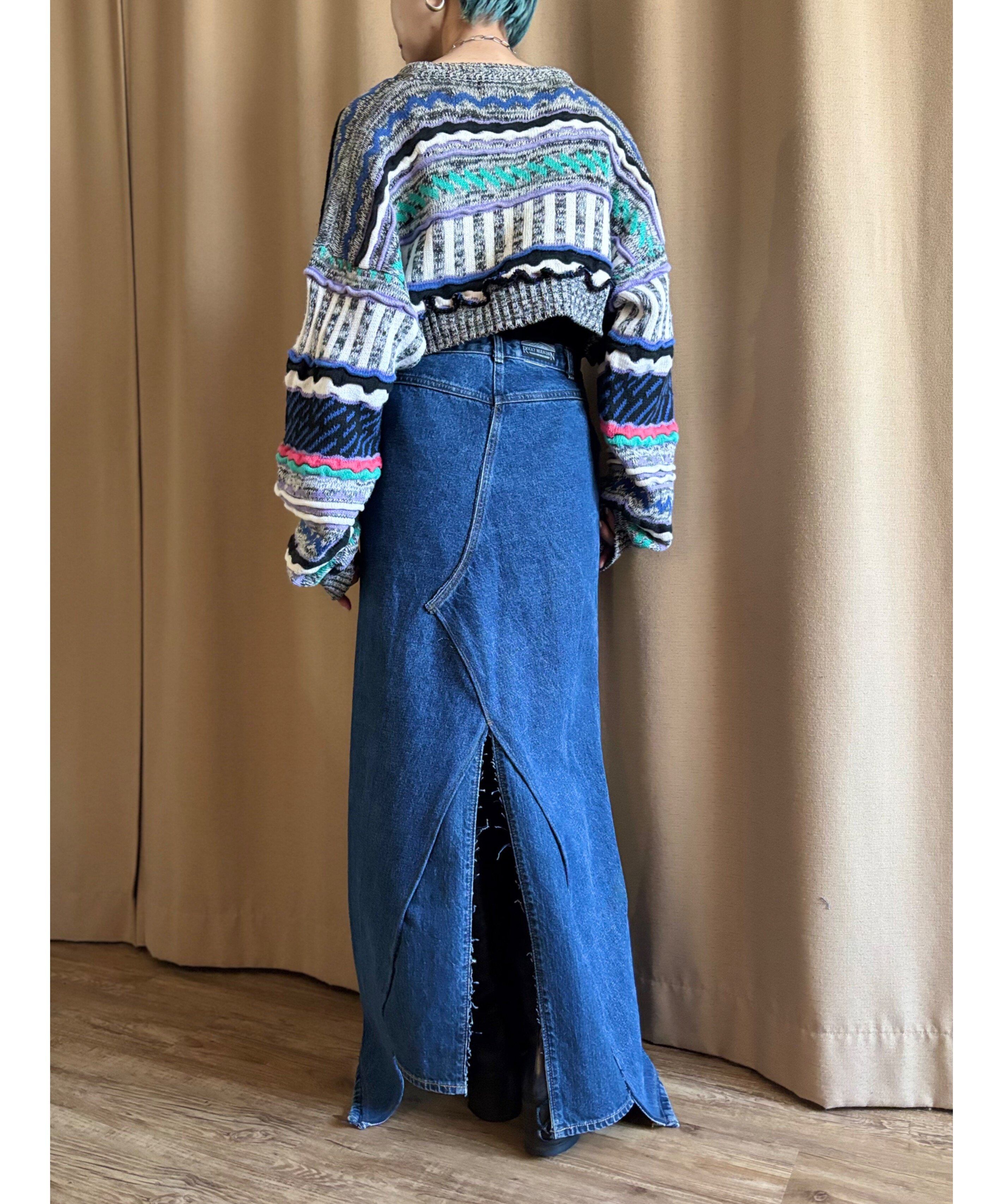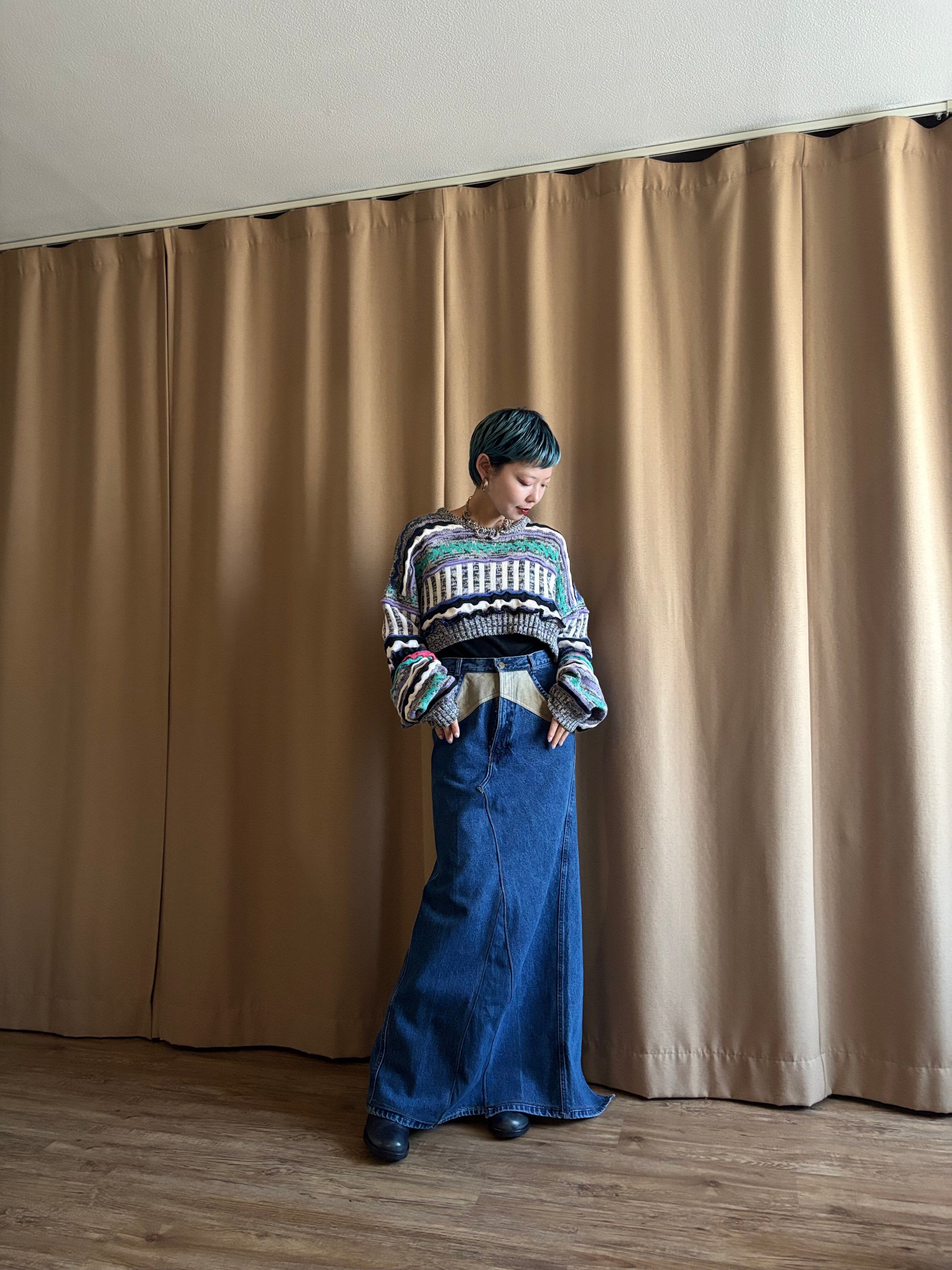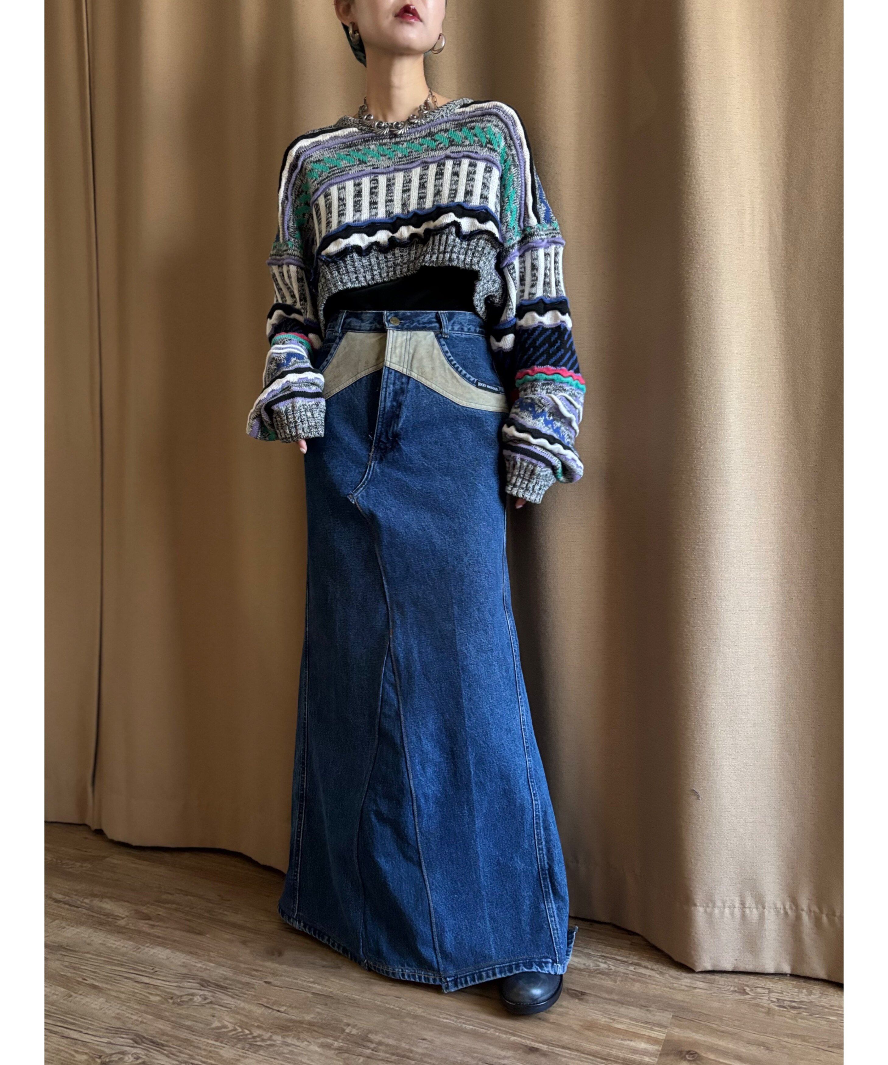 フロントデザイン切り替えがポイントのリメイクデニムスカート。