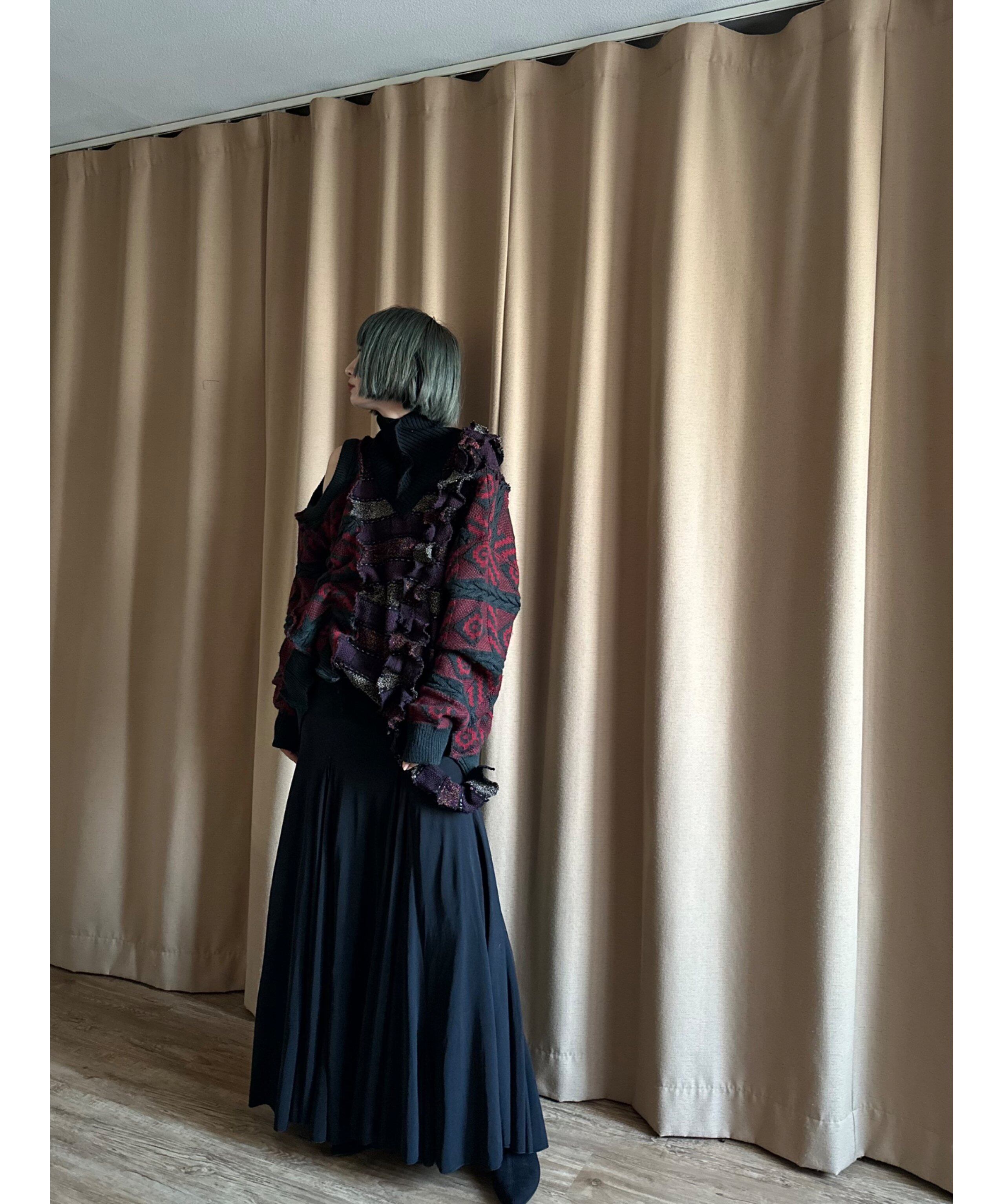 アシンメトリーフリルや縫い付け部分を強調させた立体感溢れるディテールが魅力。