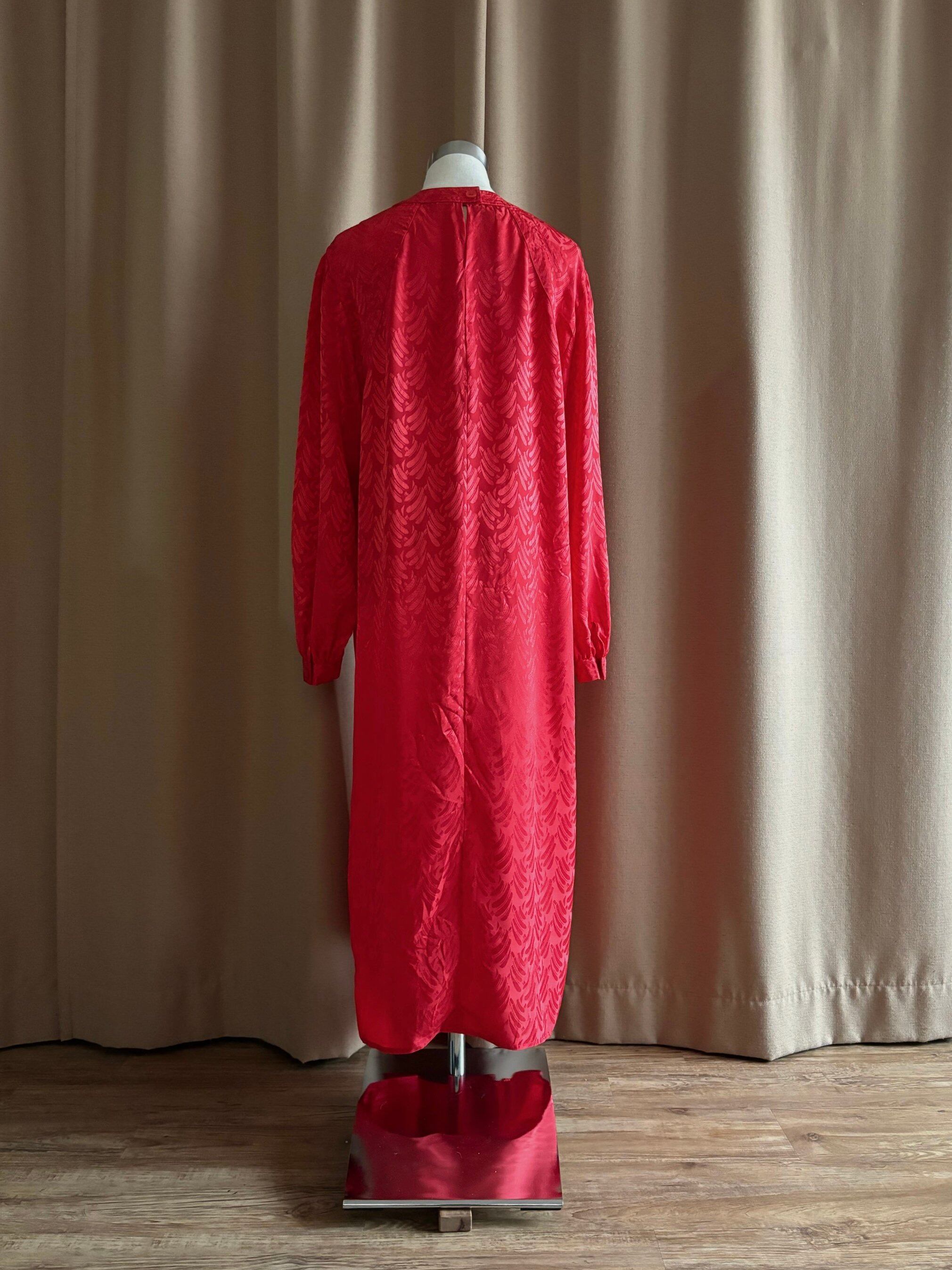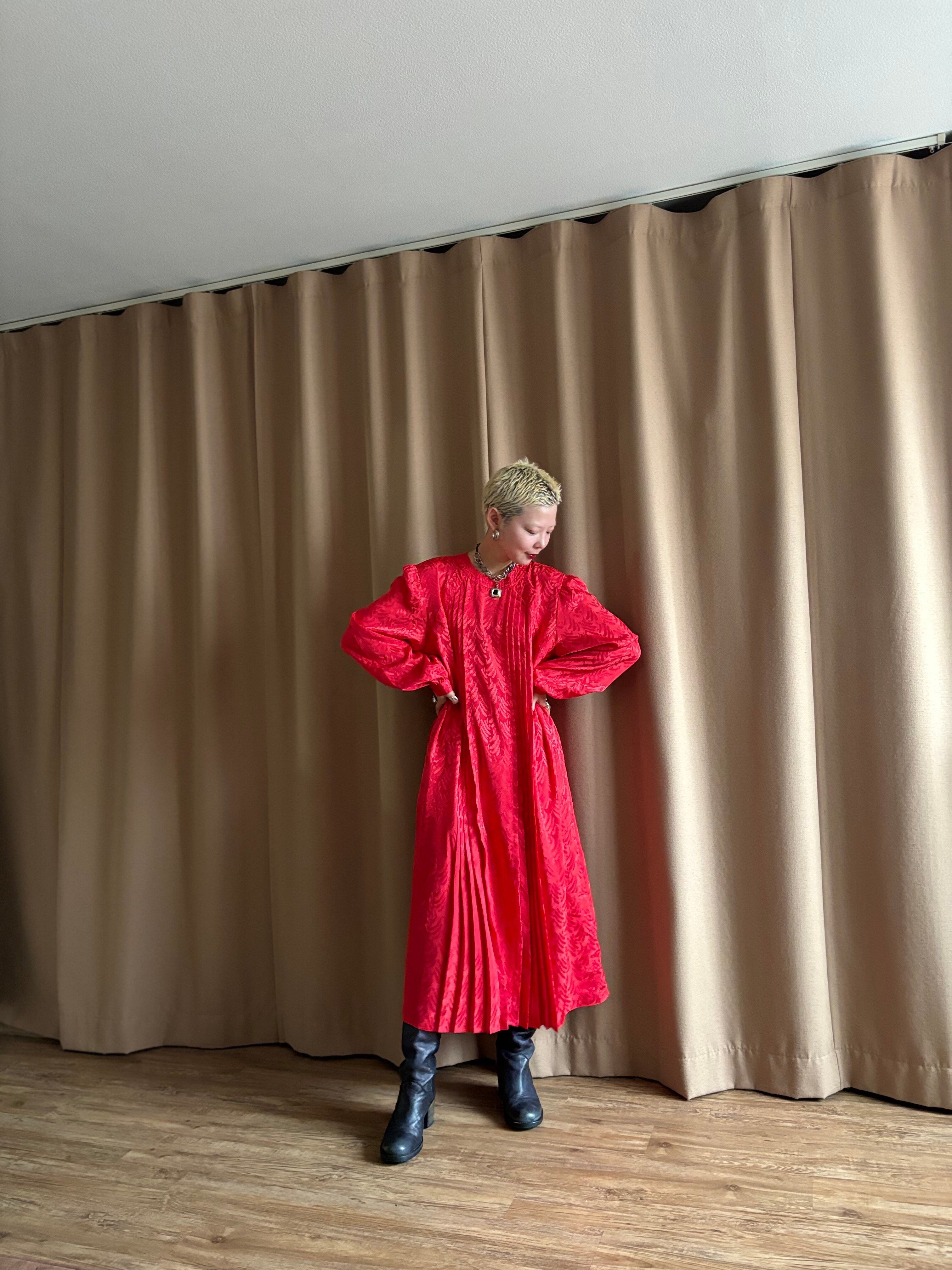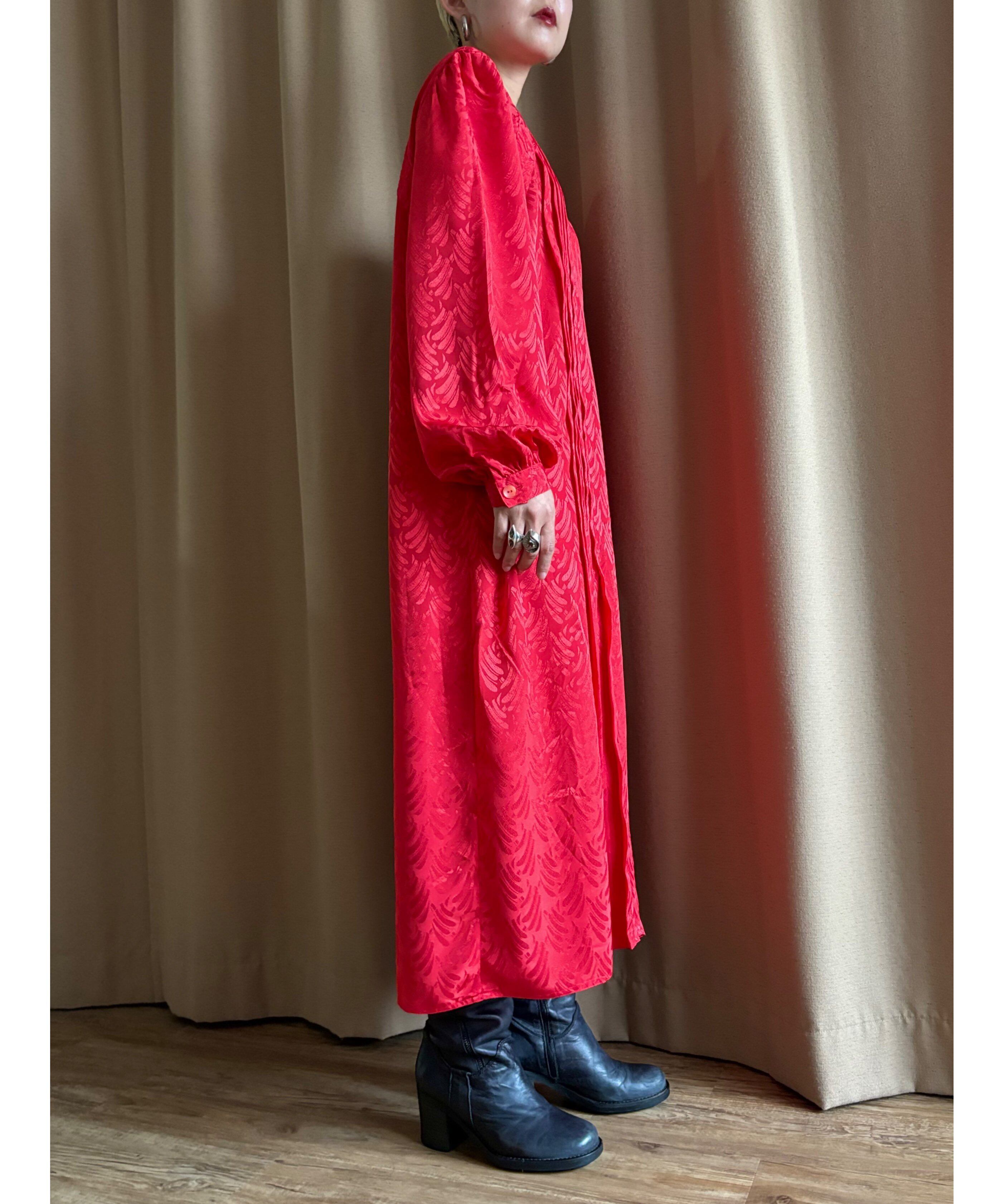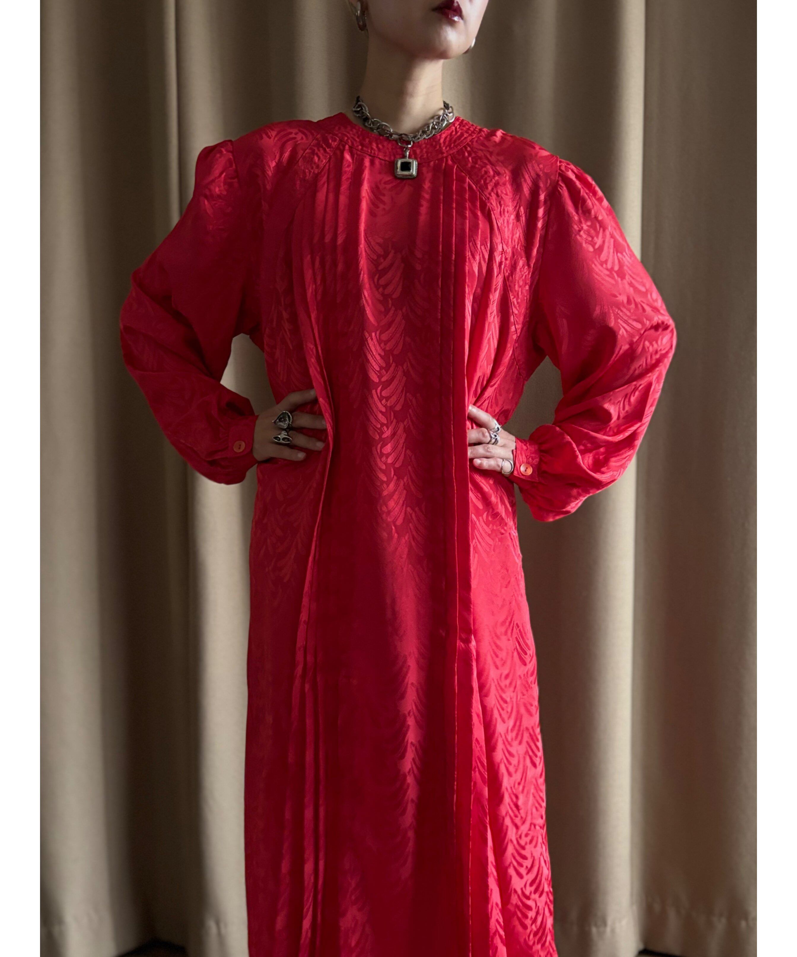 色鮮やかなレッドカラーに、上品に煌めくジャガード柄がリュクスに映えるインポートワンピース。