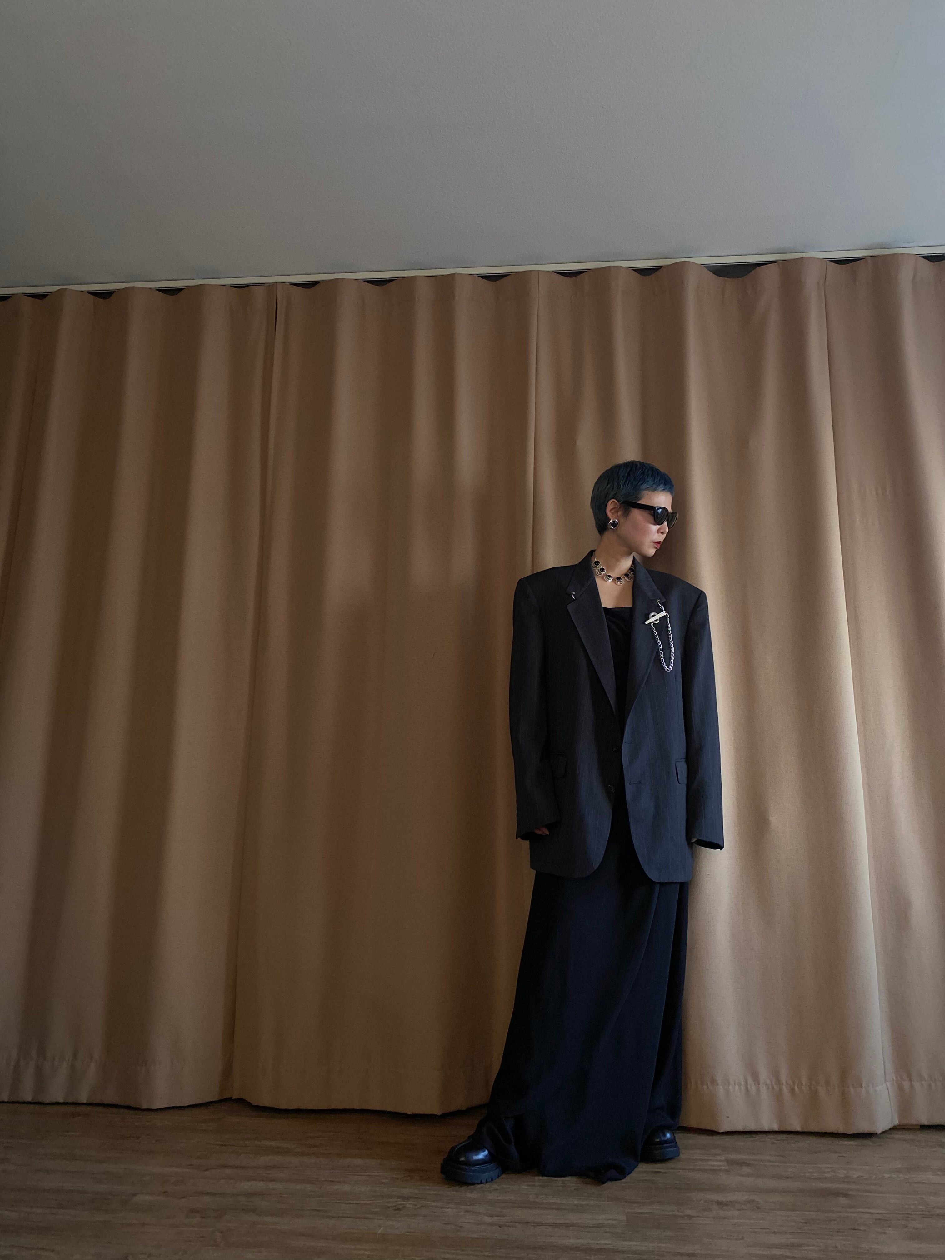 肩パッド入りのビッグショルダーに襟元にはハトメ金具を施すことでエッジの効いた拘りのデザインに。