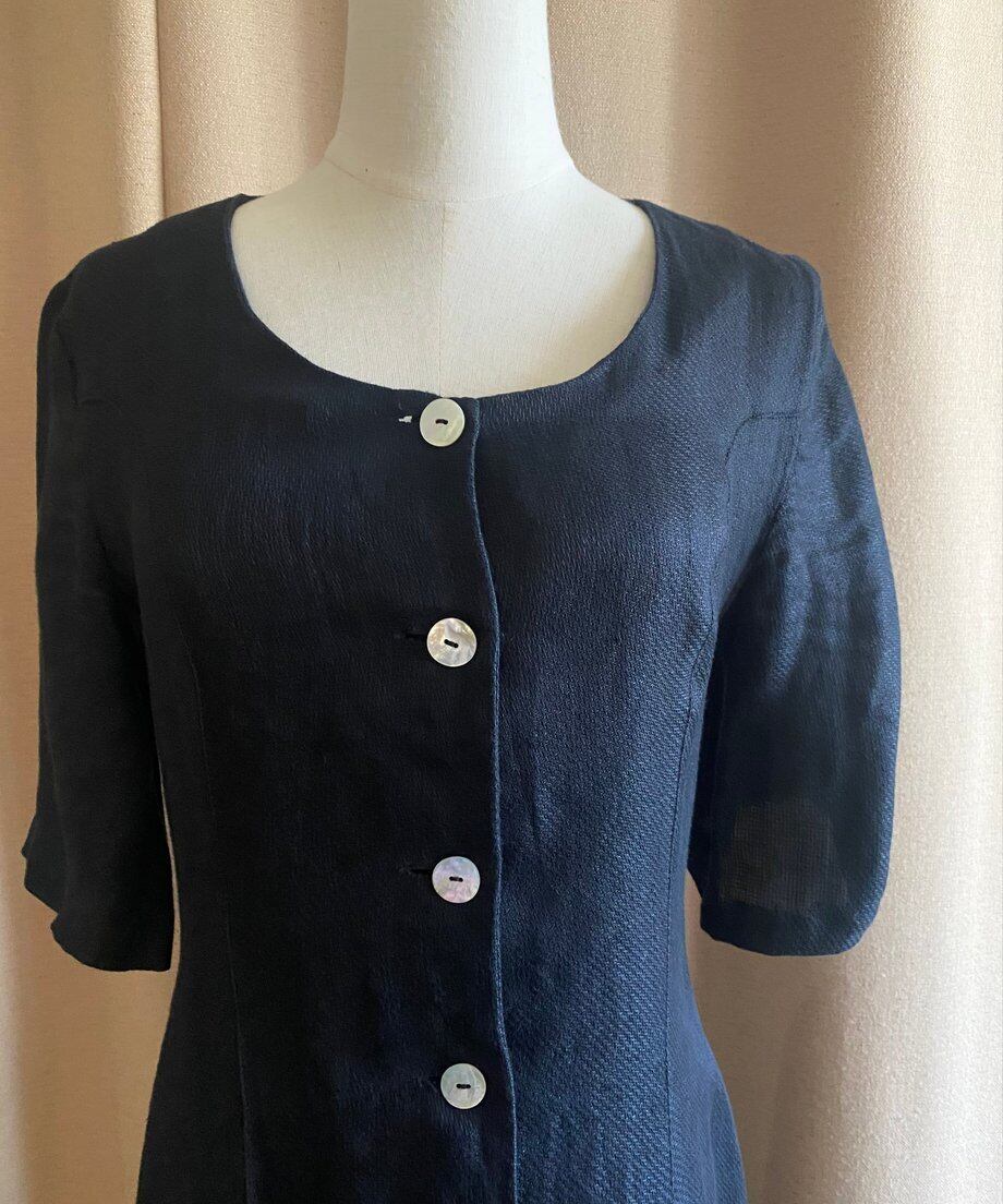 シンプルでありながらも美しいウエストラインやシェルボタンの輝きなど細部にまで拘りを感じる洗練されたディテールが魅力。