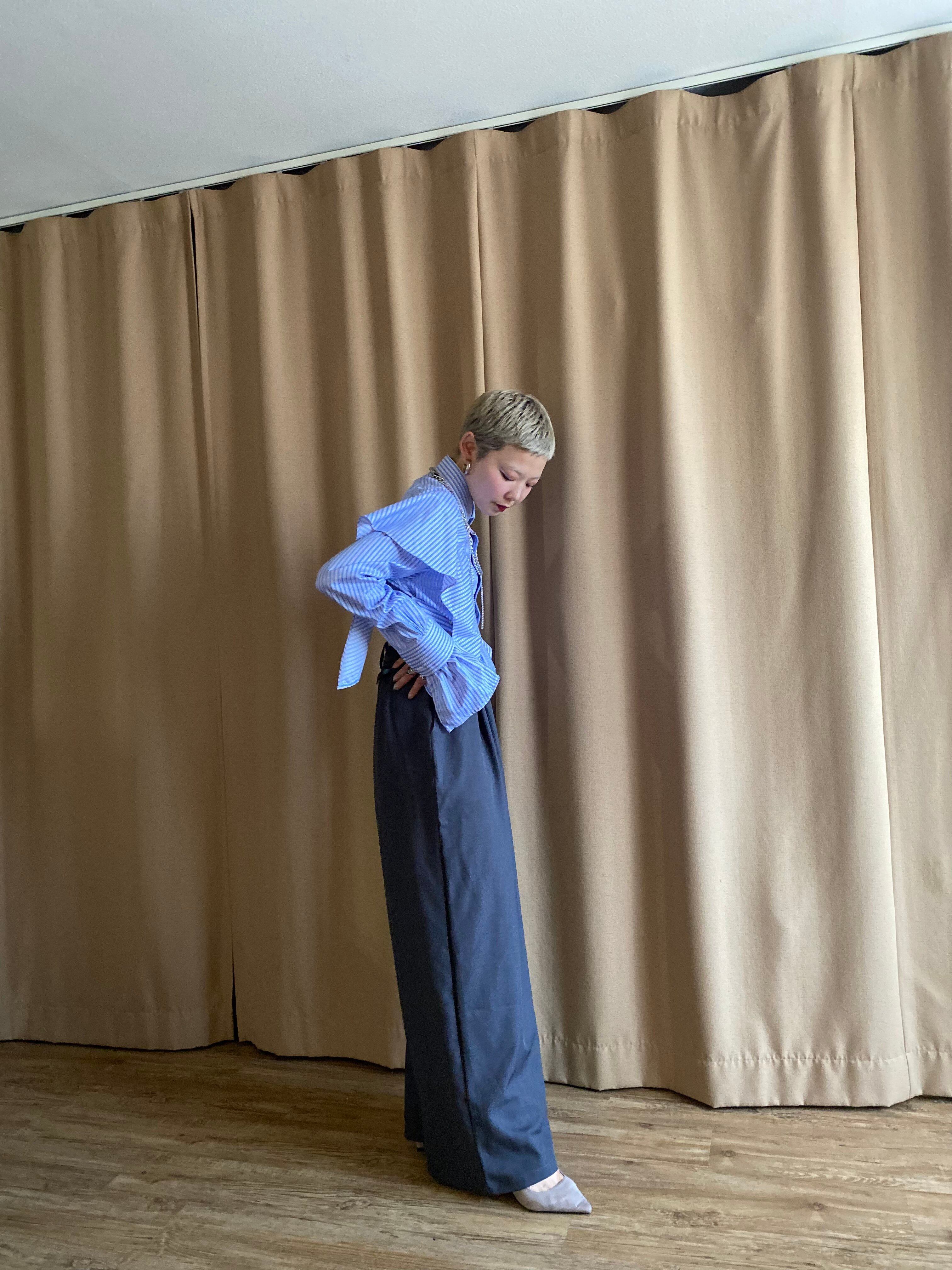 手がすっぽりと隠れるフリルロングスリーブはカフスボタンを外すことでスリットのように見立てた抜け感の出る着こなしに◎