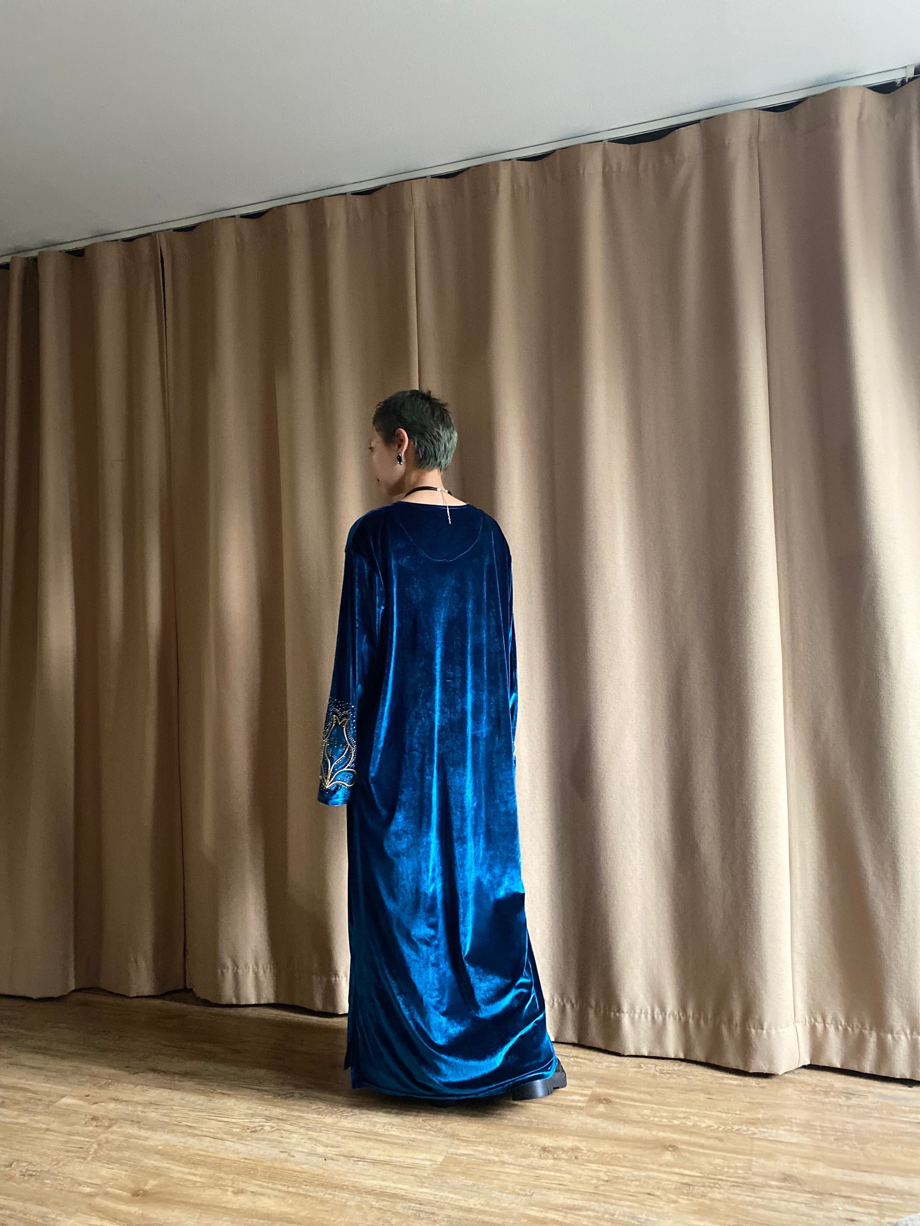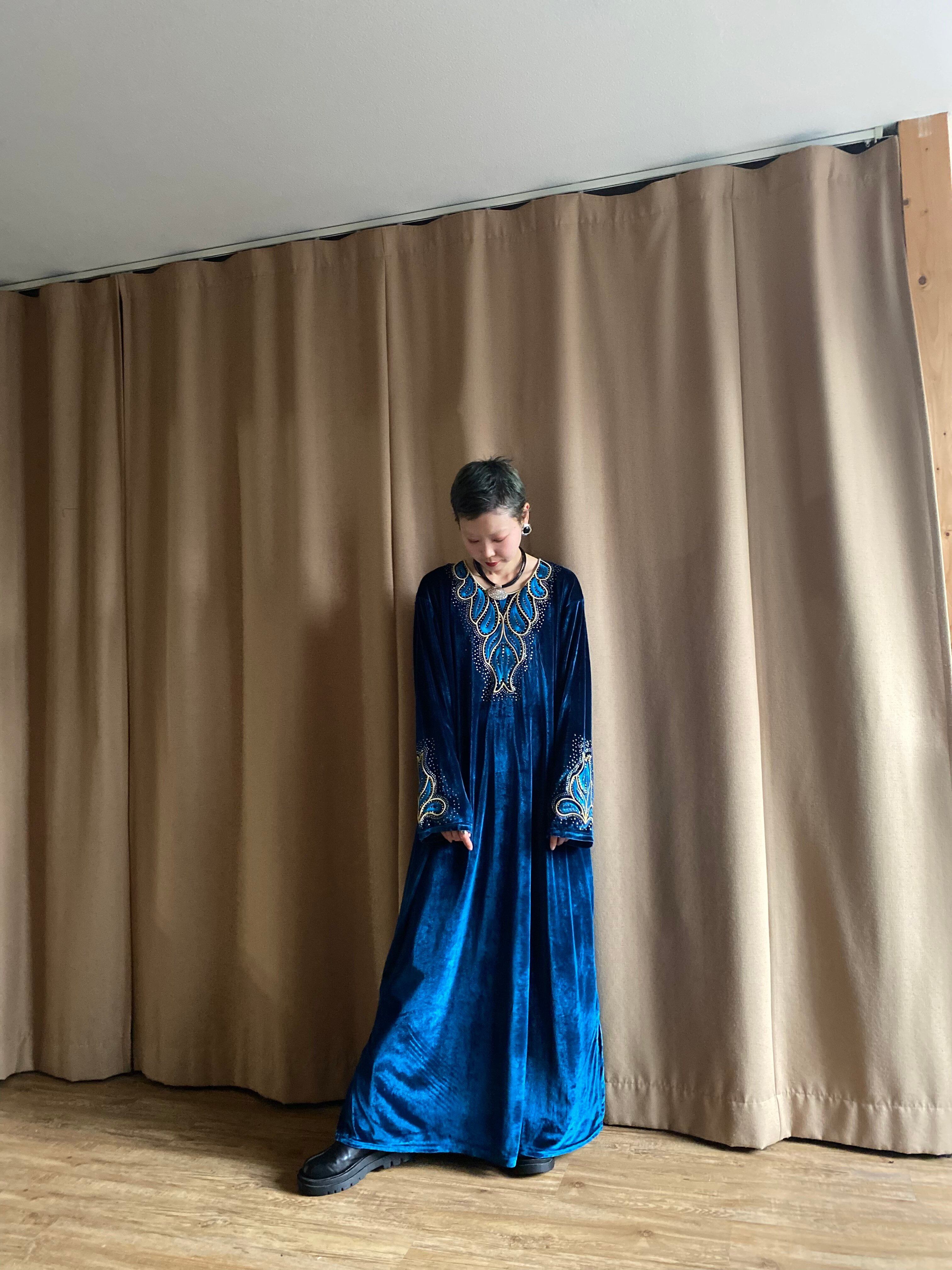 大胆な刺繍デザインにラインストーンの輝きがラグジュアリーさ漂う、エスニックヴィンテージワンピース。