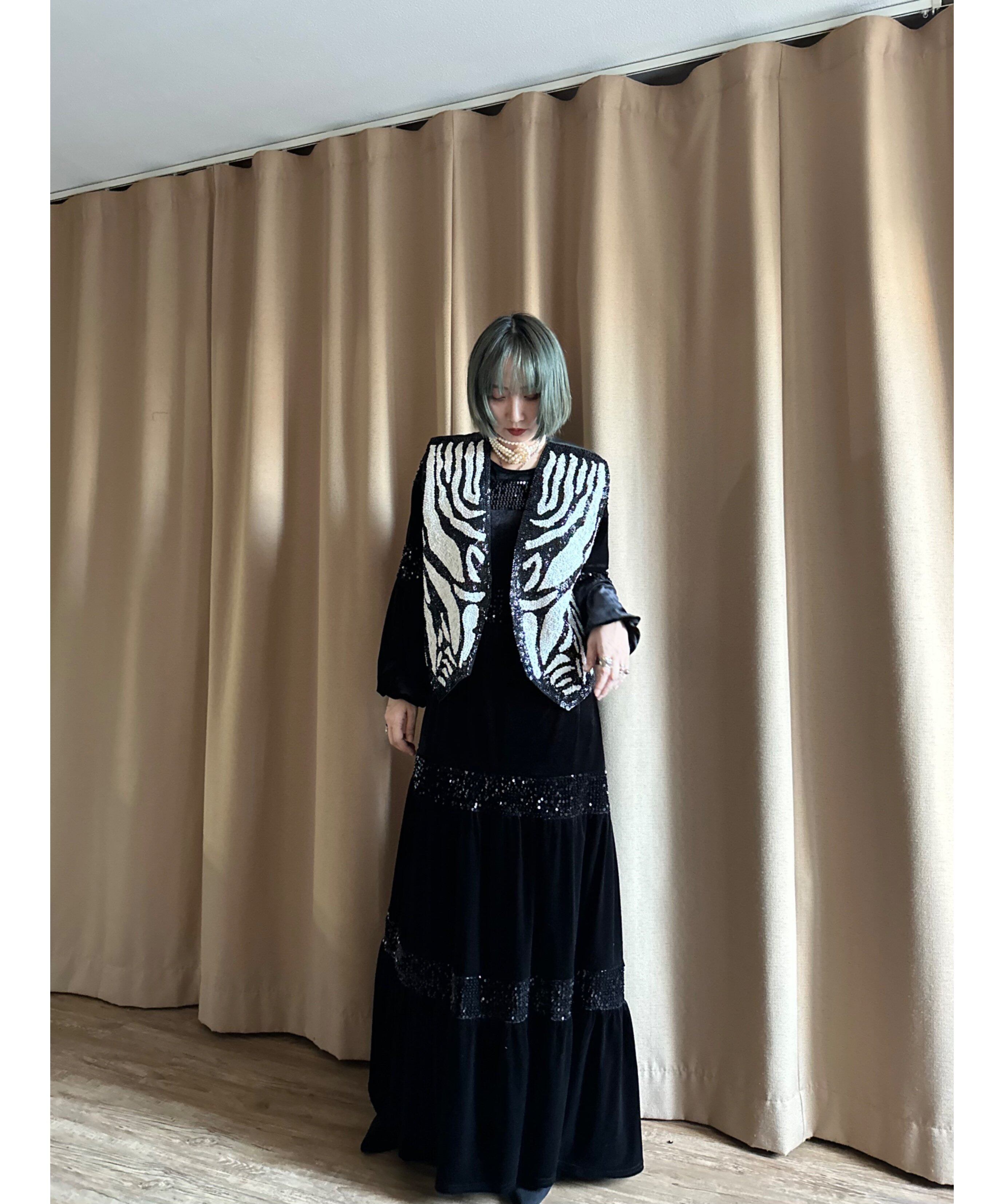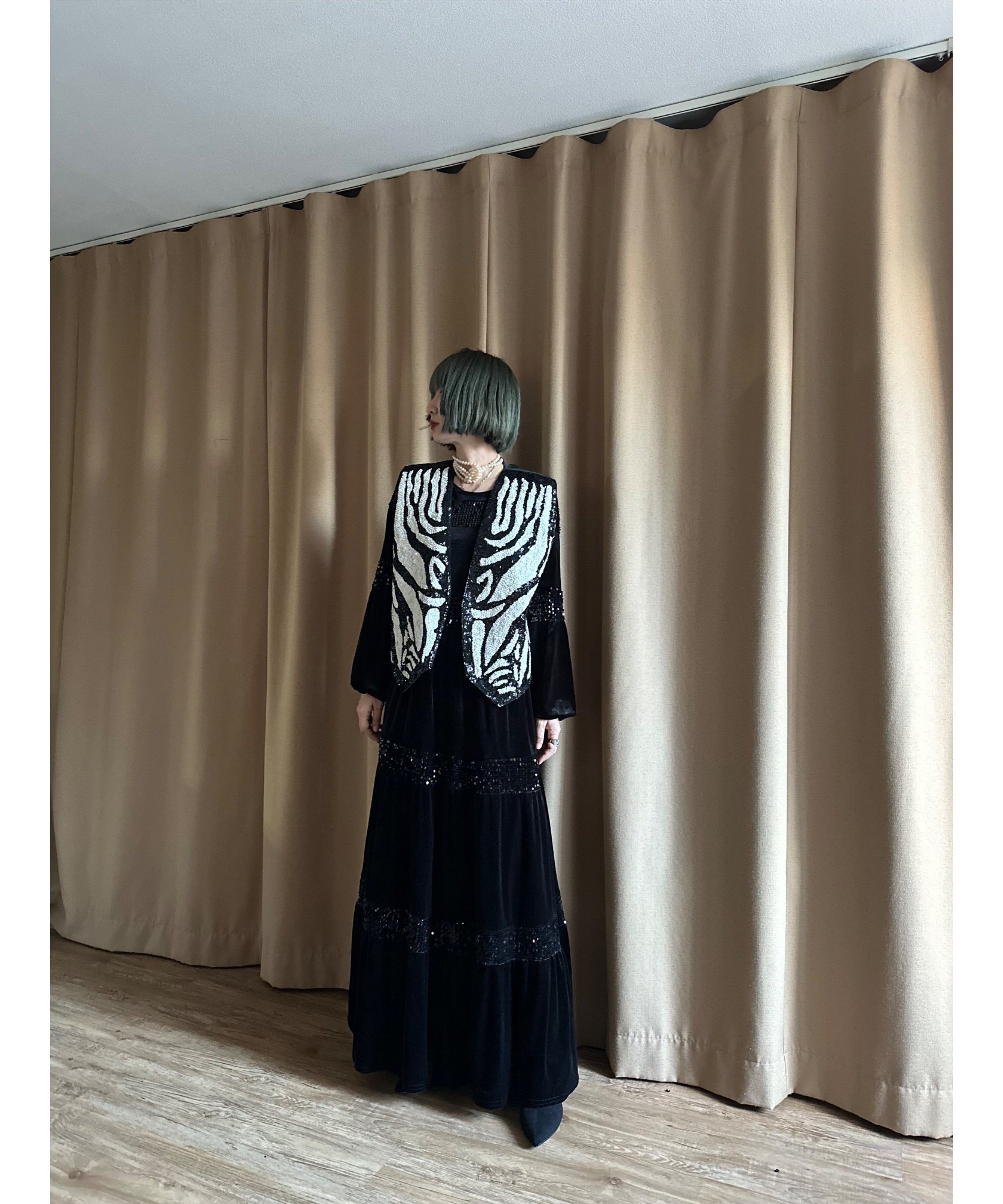 贅沢にあしらわれた重厚感あるスパンコールにエッジィなゼブラ柄デザインが目を奪うインポートベスト。