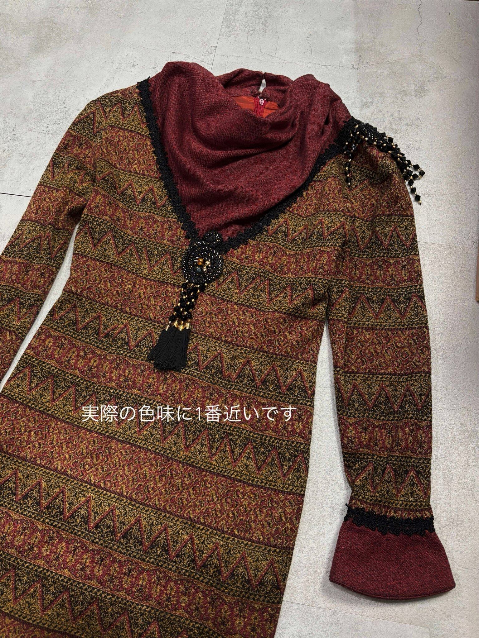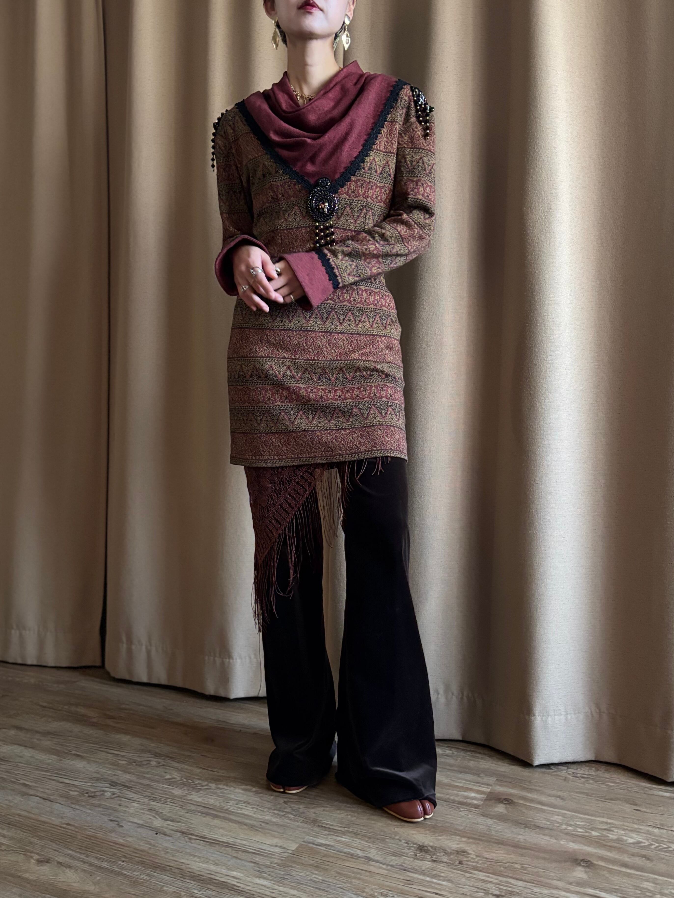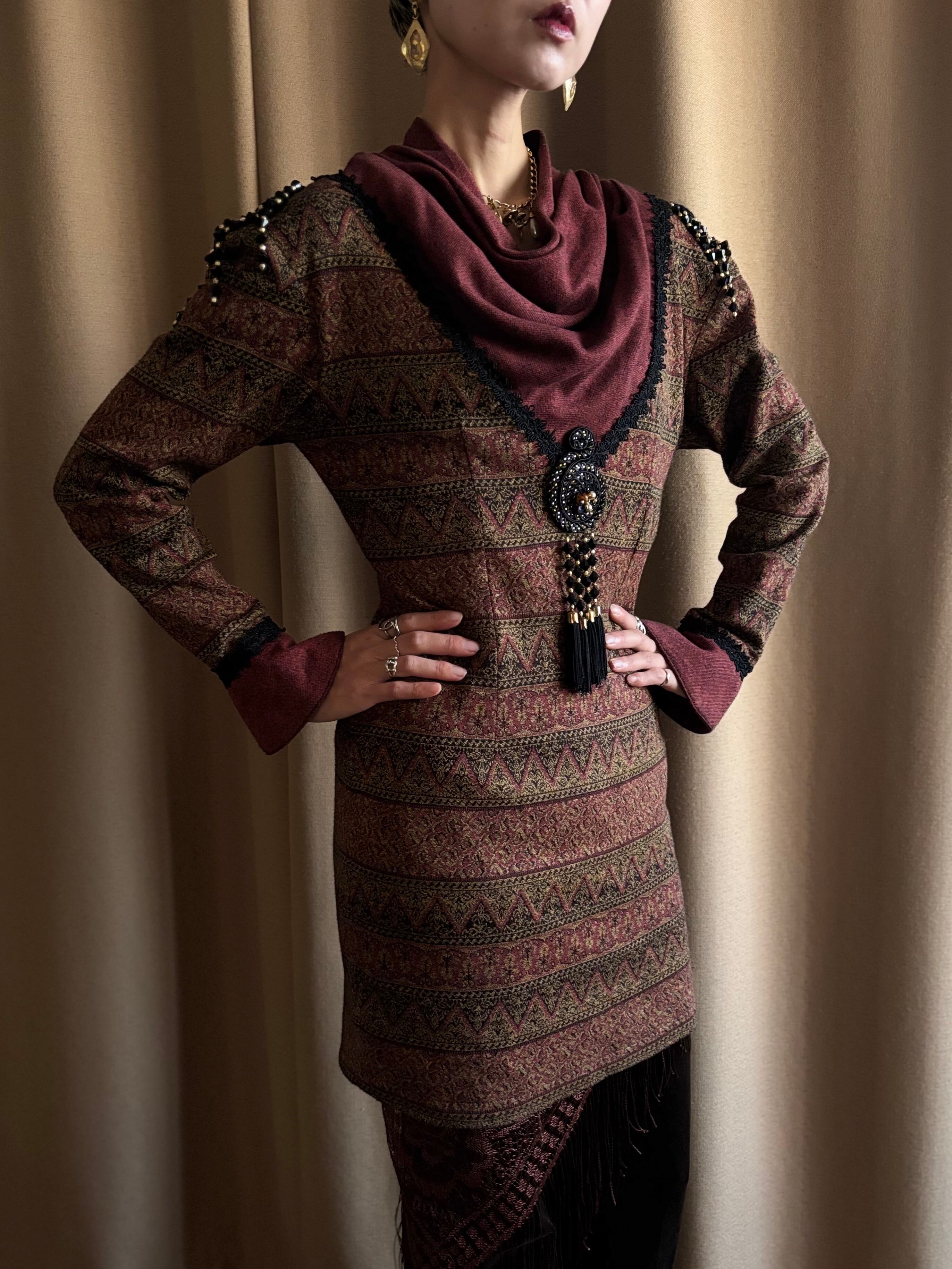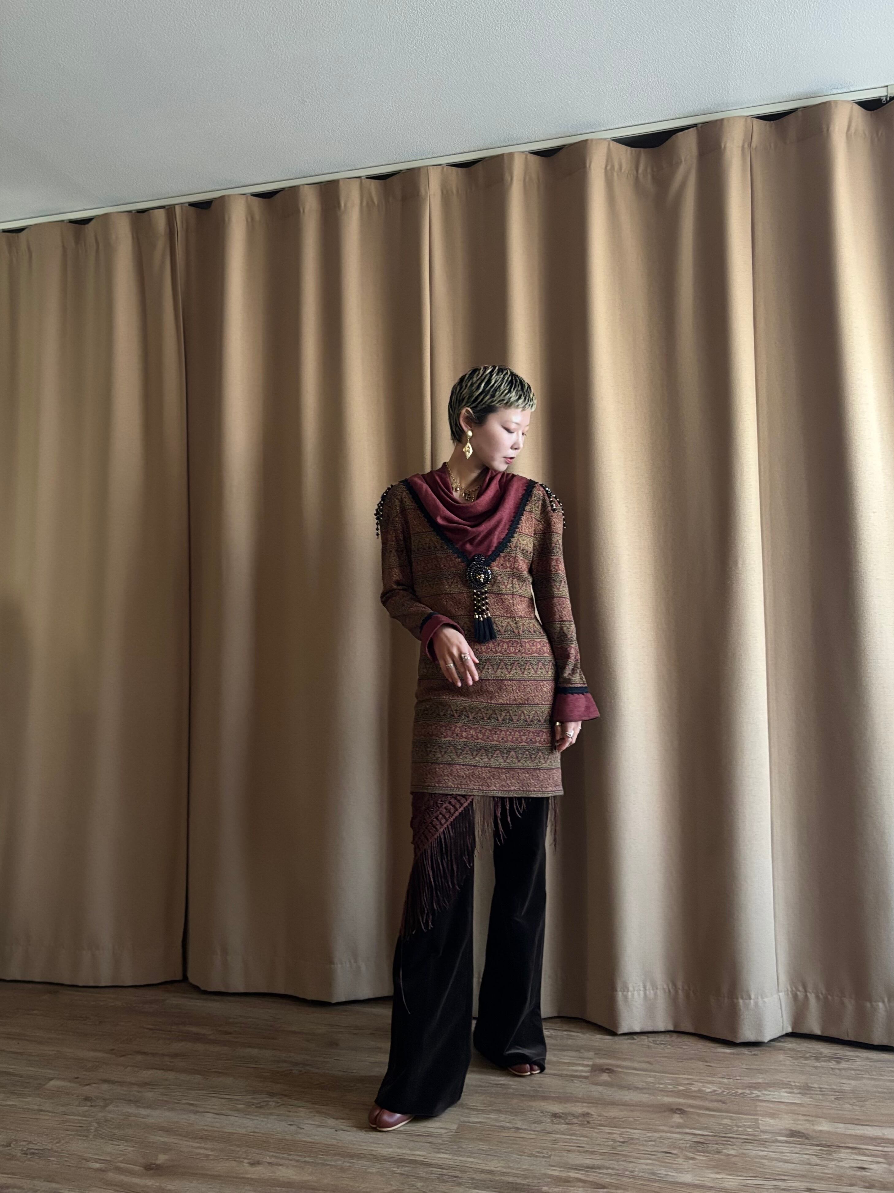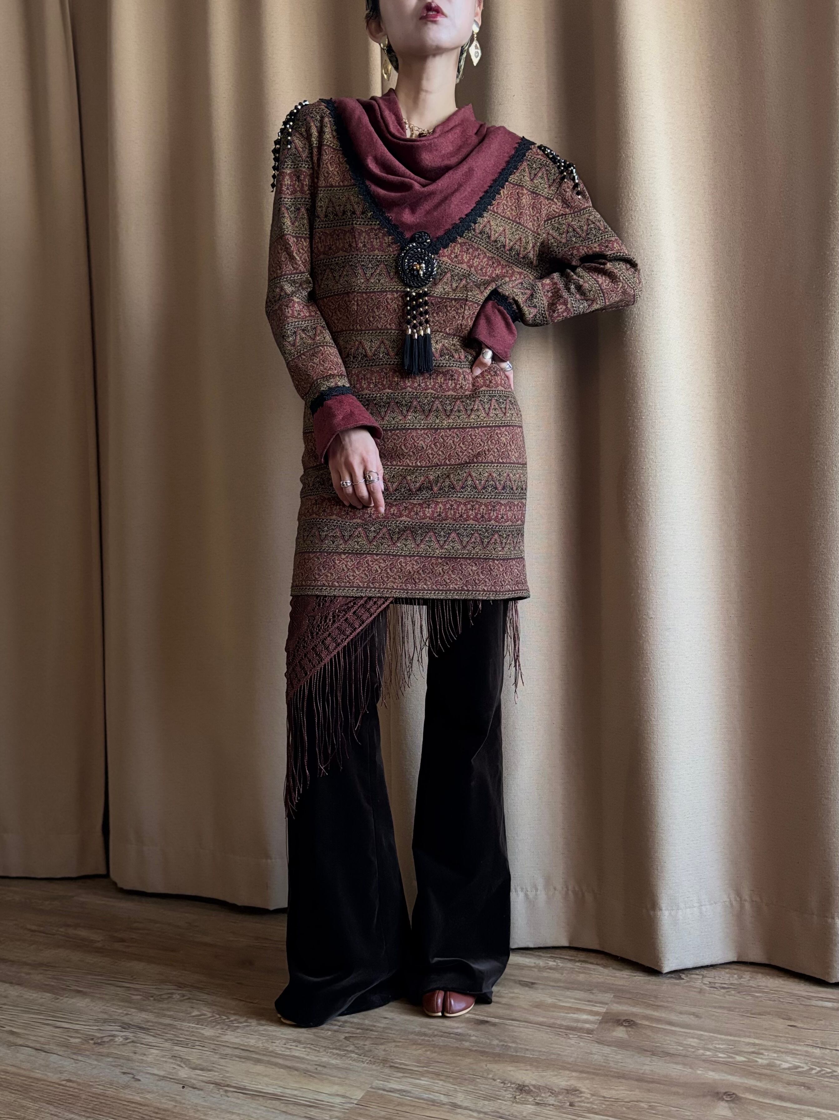 エスニック調の織り柄をベースに、深みのあるバーガンディのスヌード風デザインが目を惹くニットチュニック。