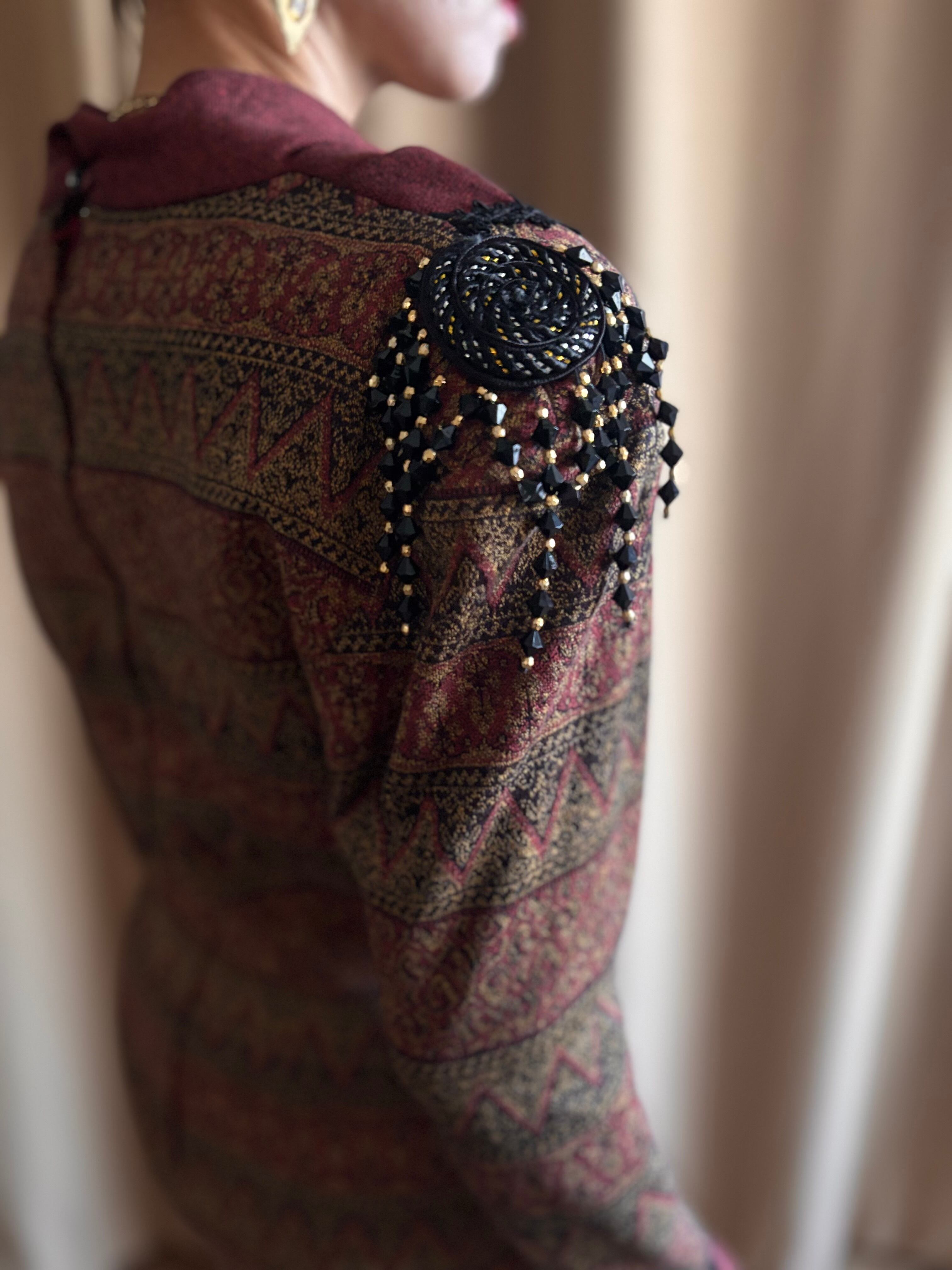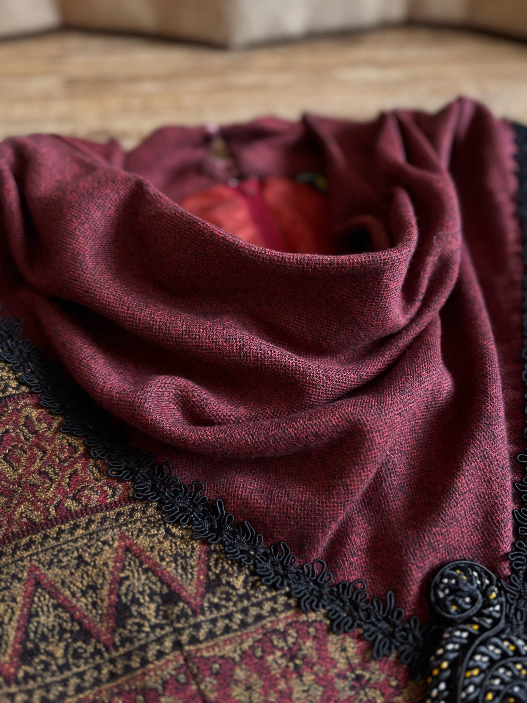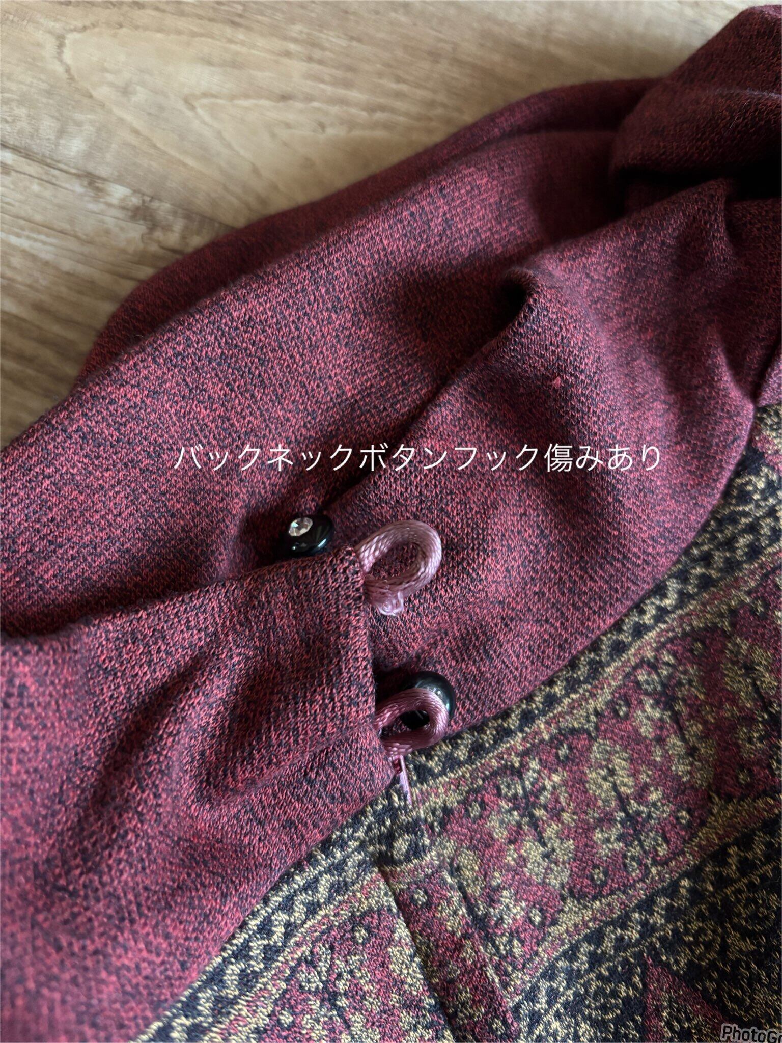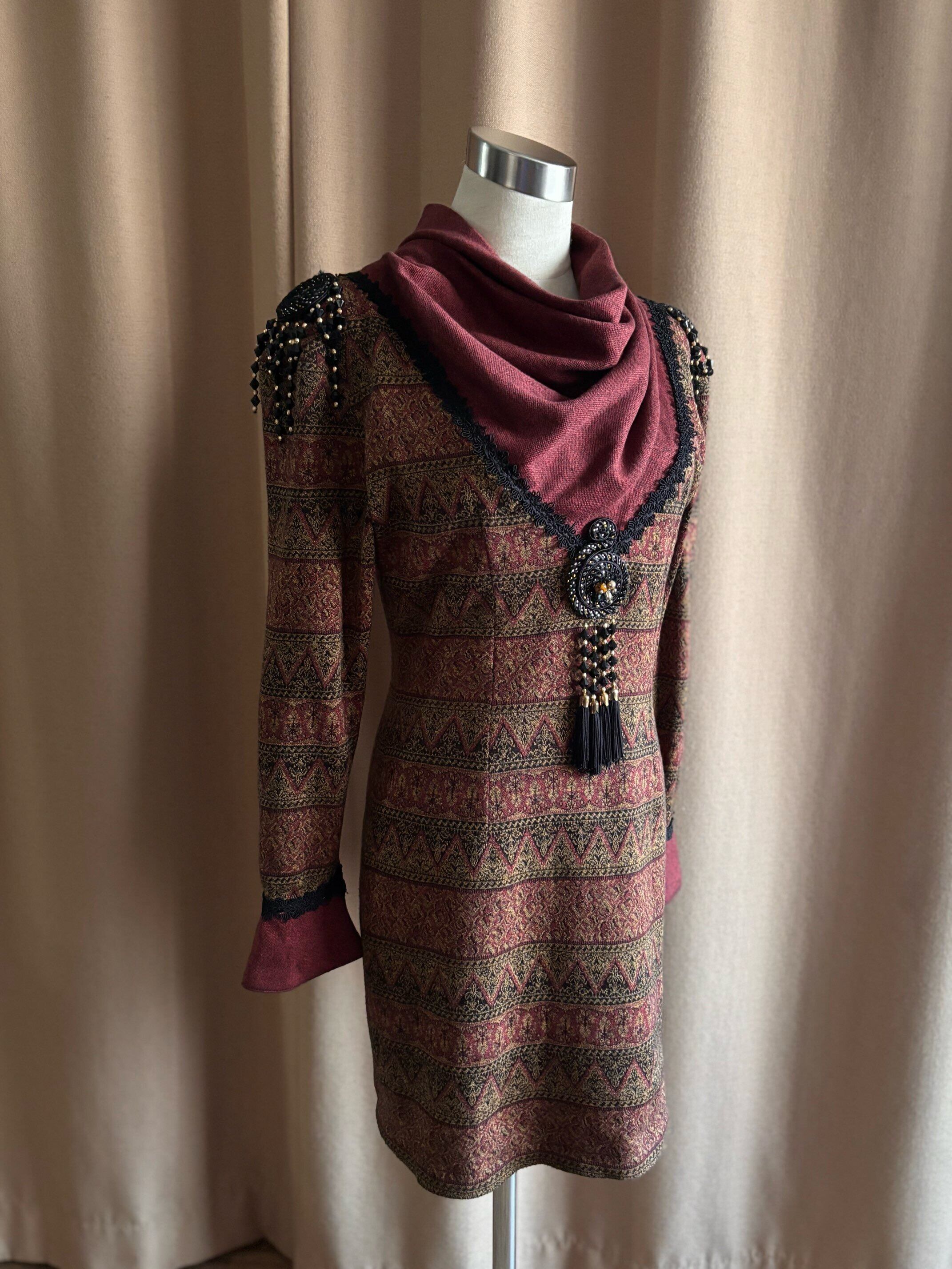 エスニック調の織り柄をベースに、深みのあるバーガンディのスヌード風デザインが目を惹くニットチュニック。