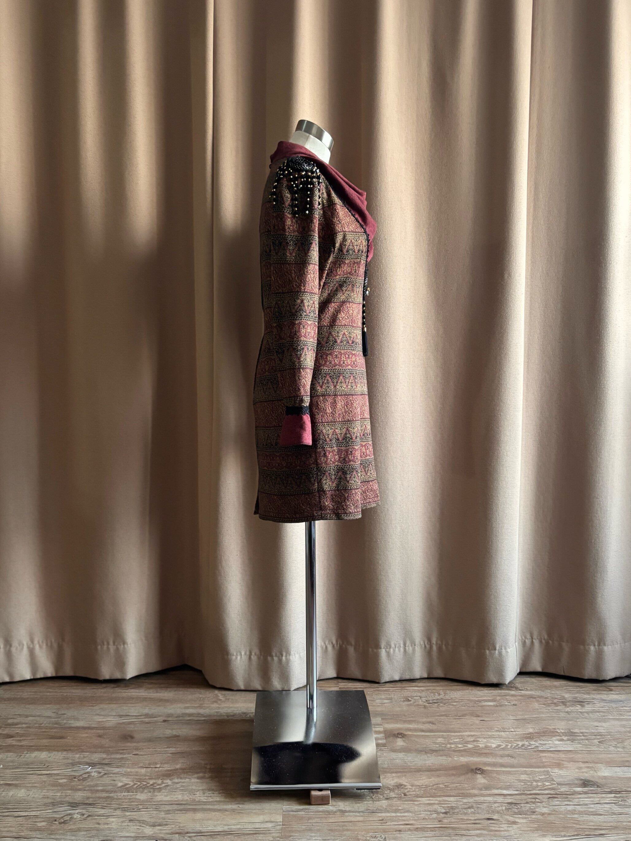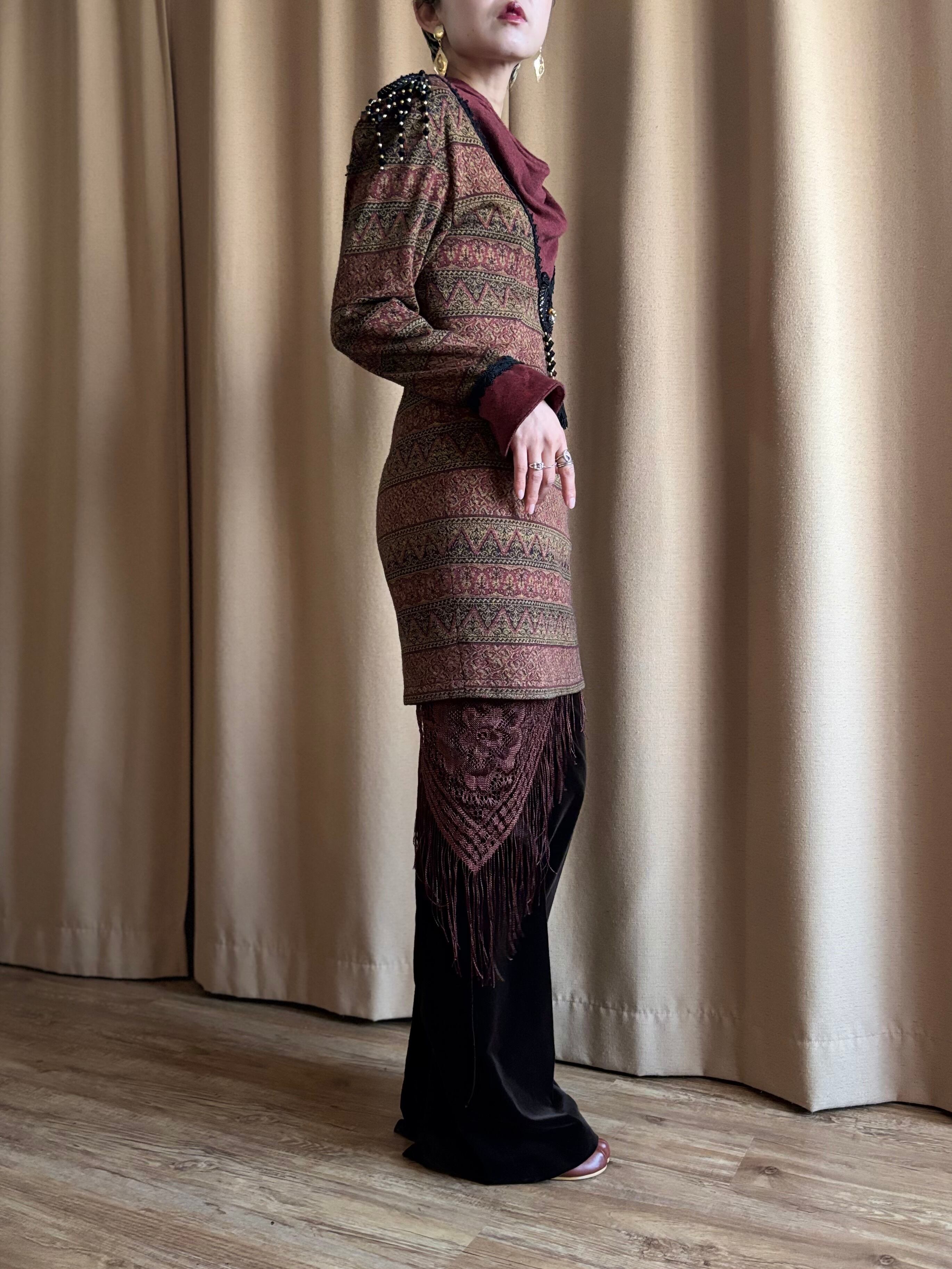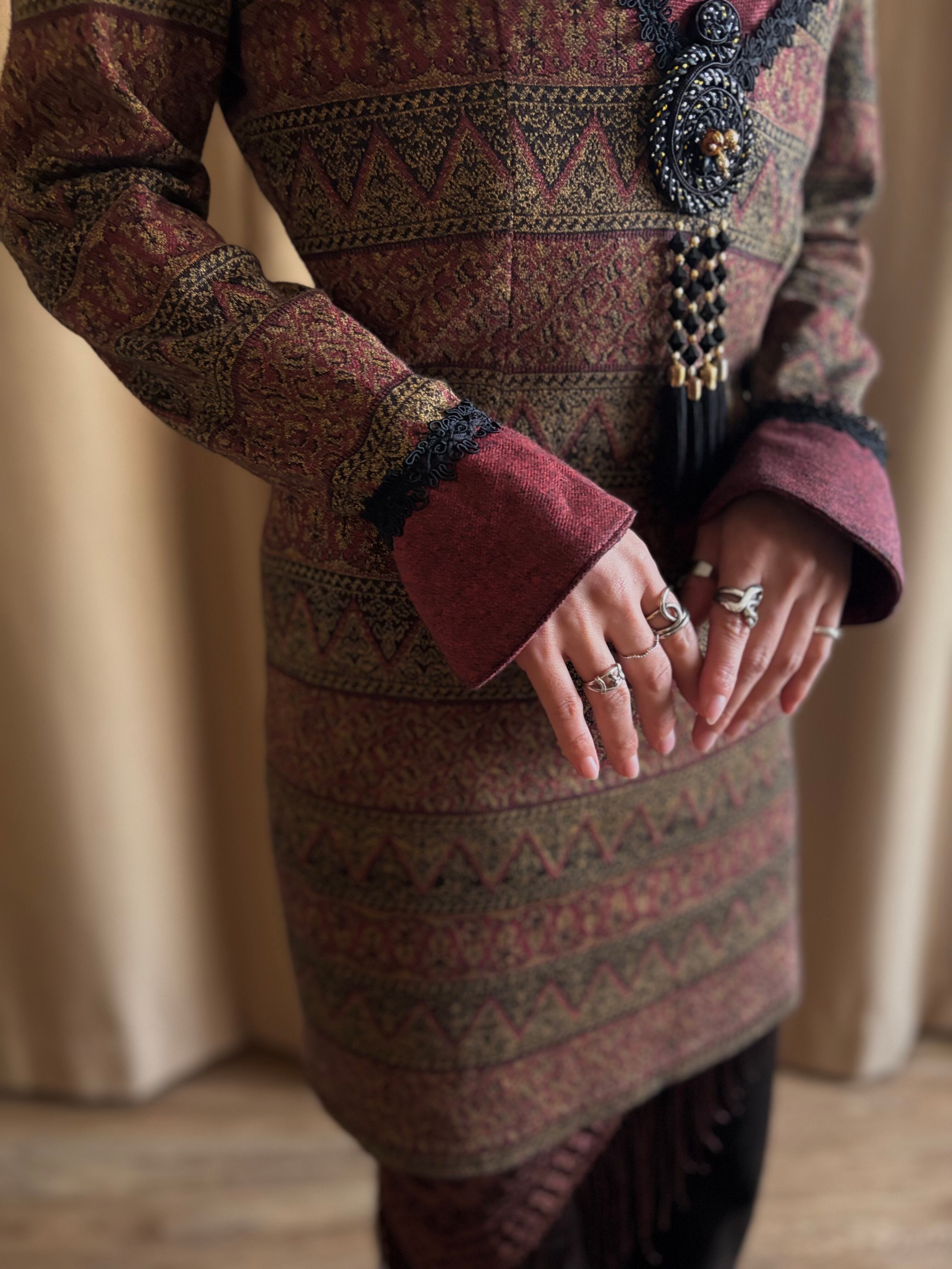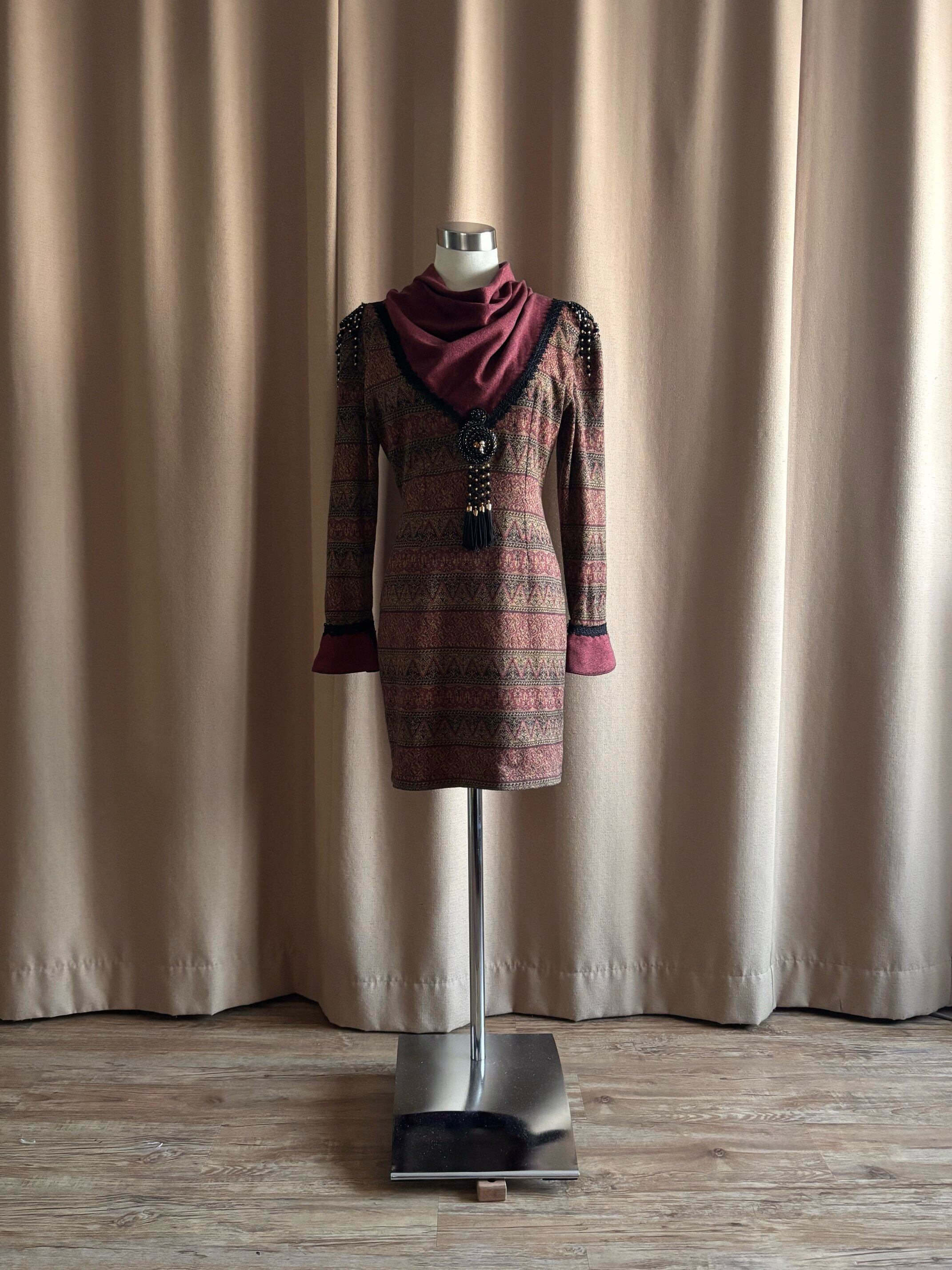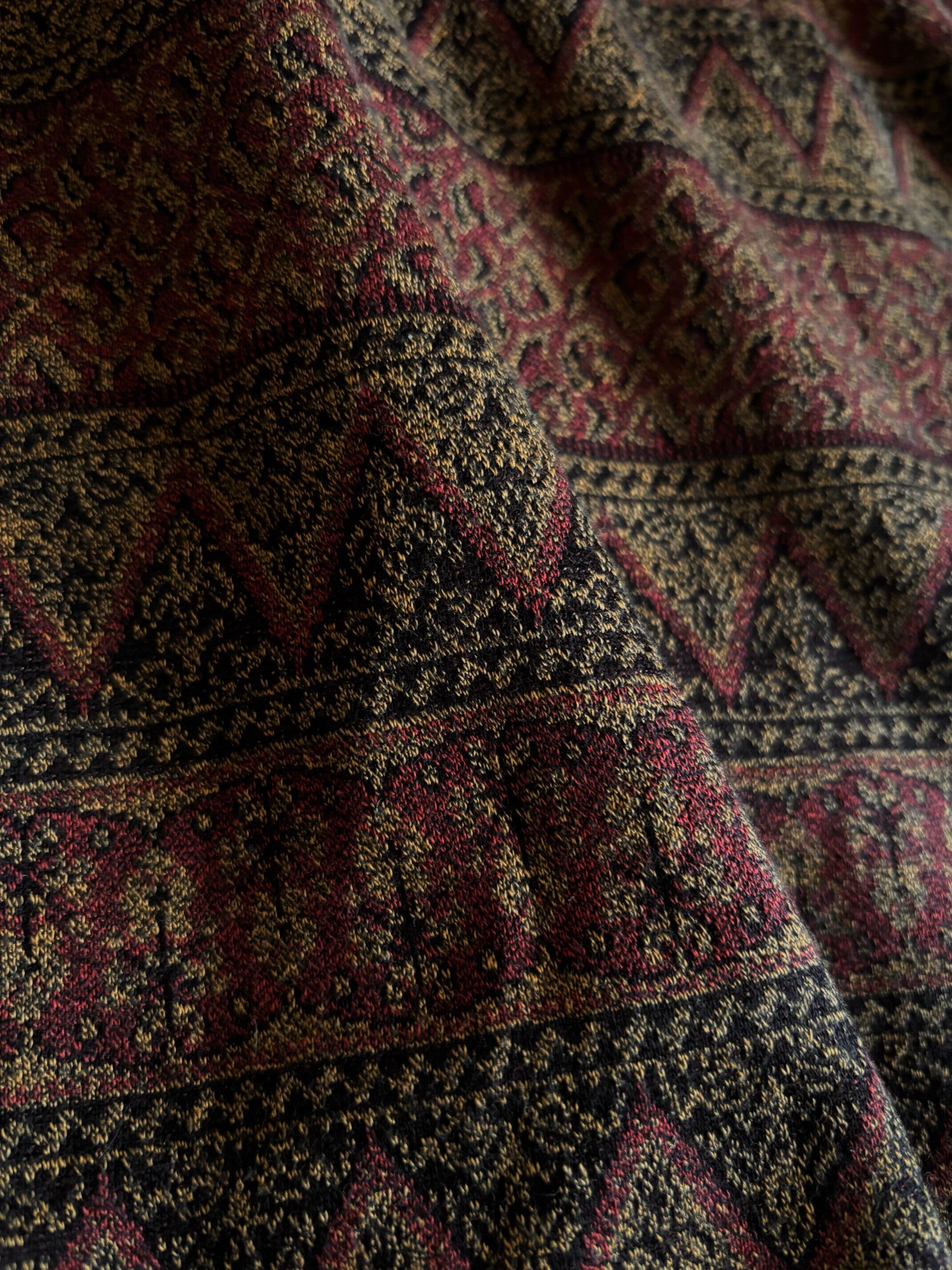 エスニック調の織り柄をベースに、深みのあるバーガンディのスヌード風デザインが目を惹くニットチュニック。