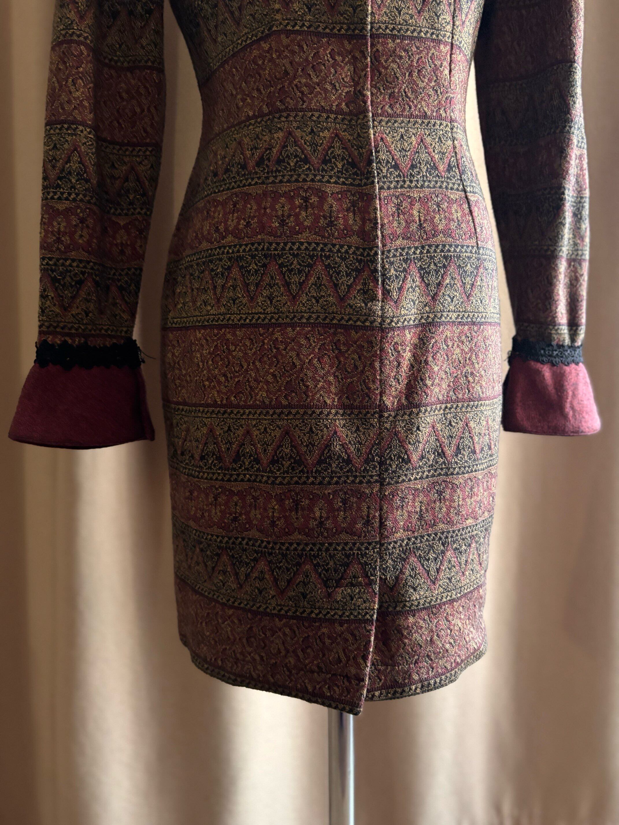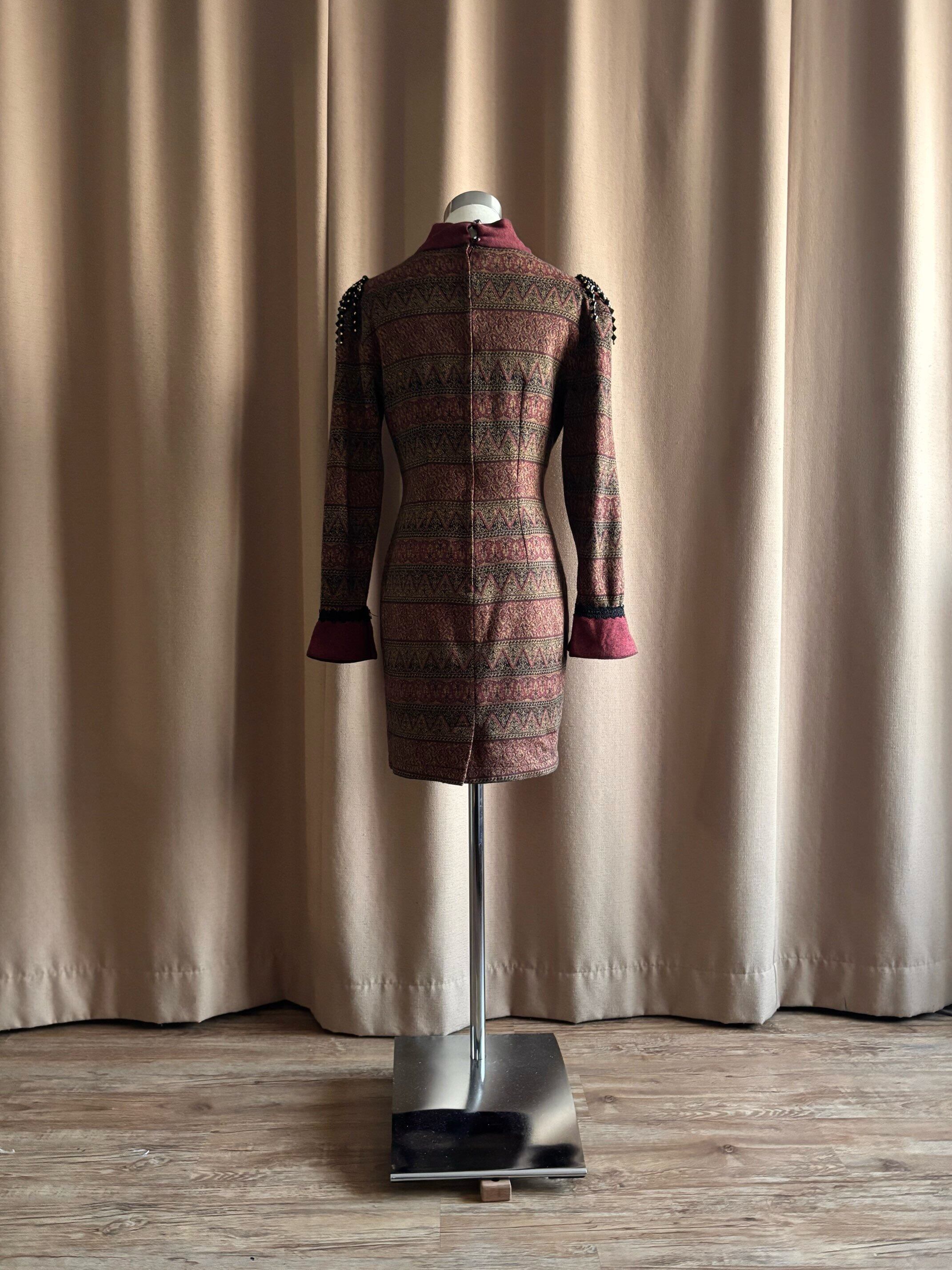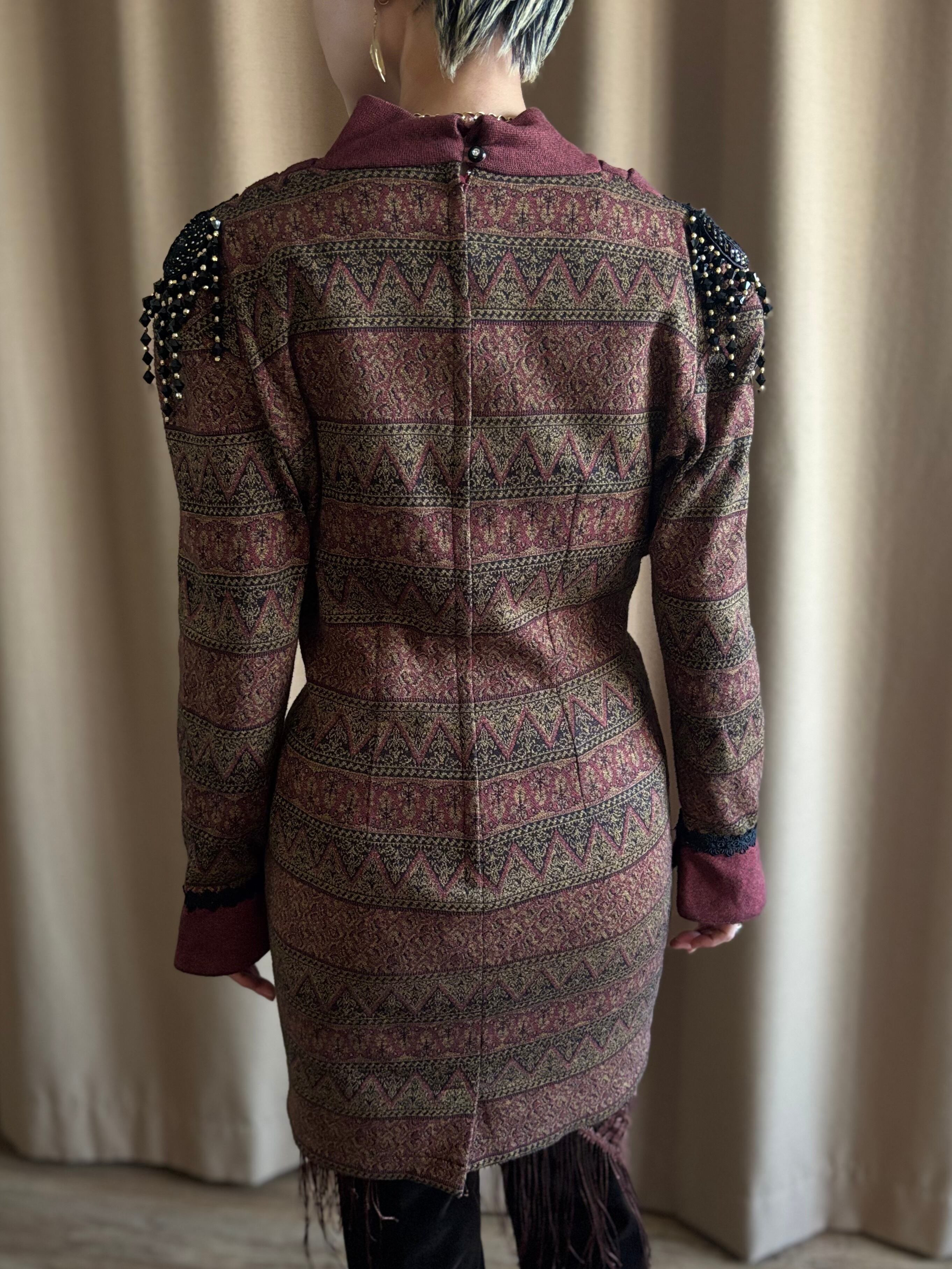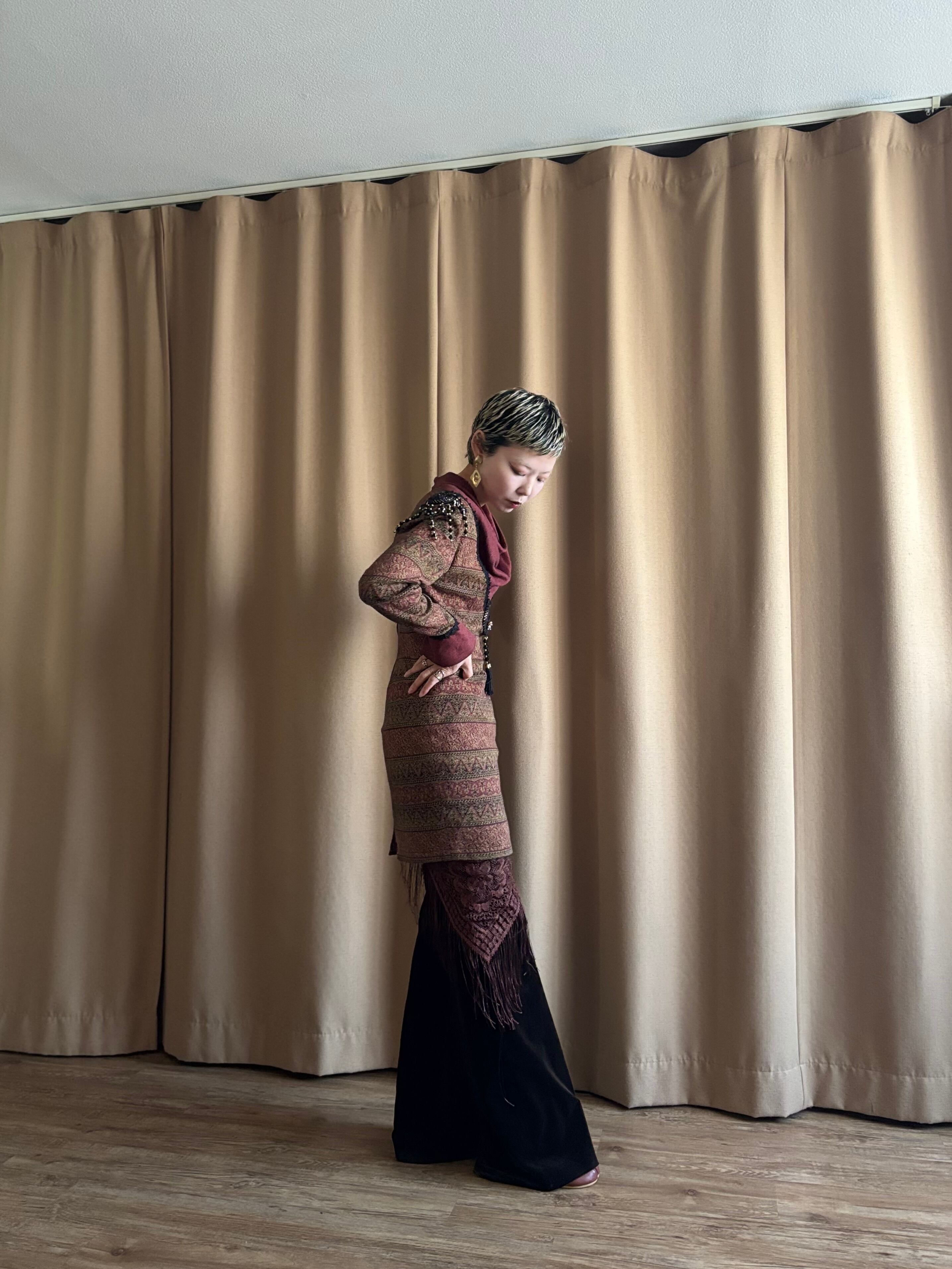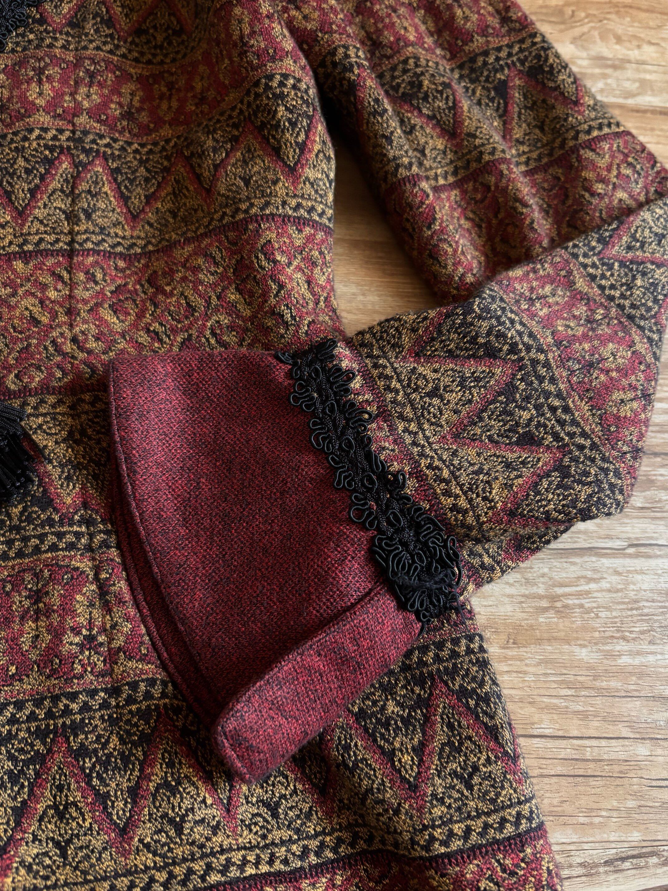 エスニック調の織り柄をベースに、深みのあるバーガンディのスヌード風デザインが目を惹くニットチュニック。