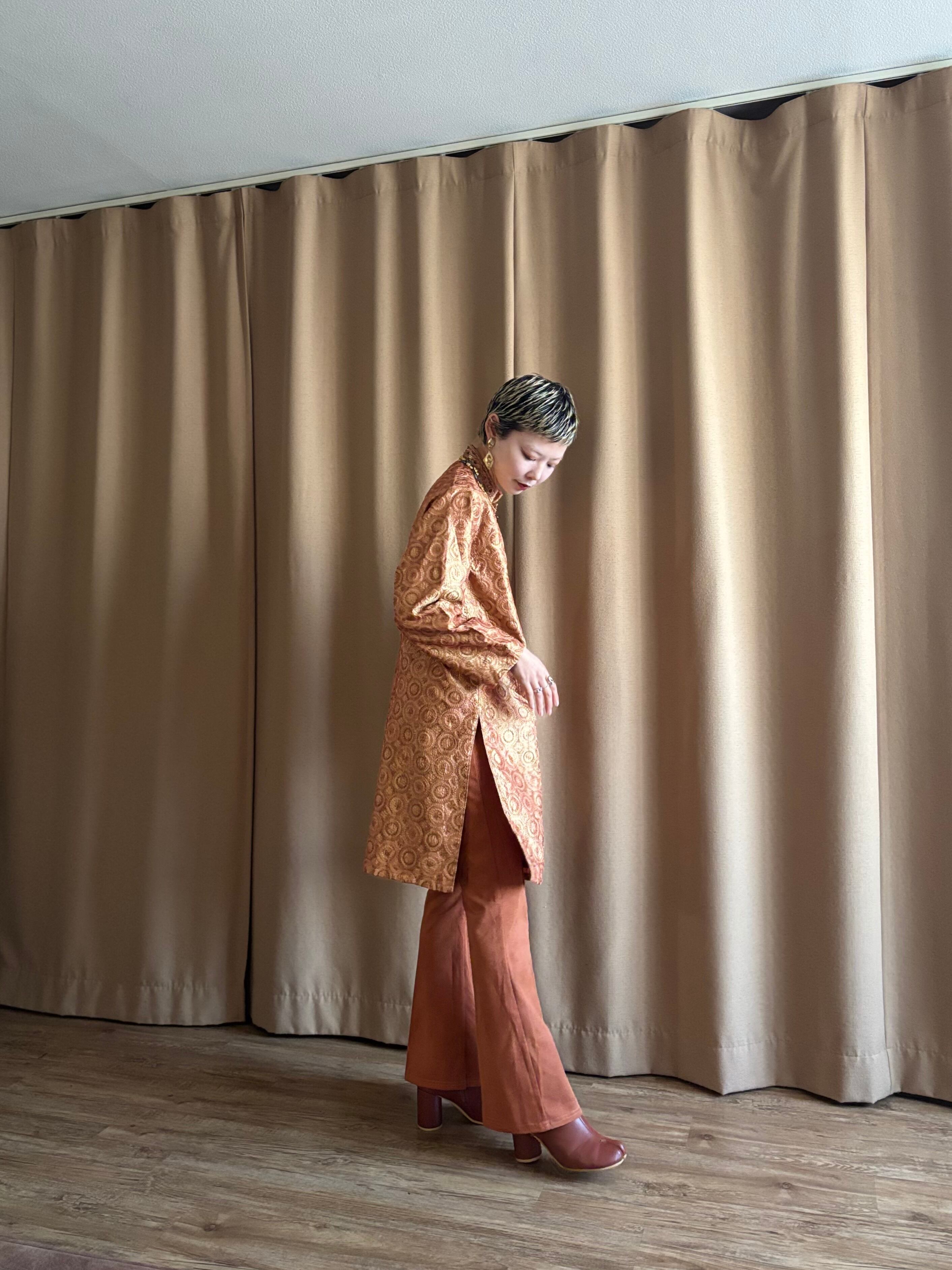 柔らかな光沢を帯びた生地が動くたびにさりげない表情を生み、上品にスタイリングを格上げしてくれる逸品。