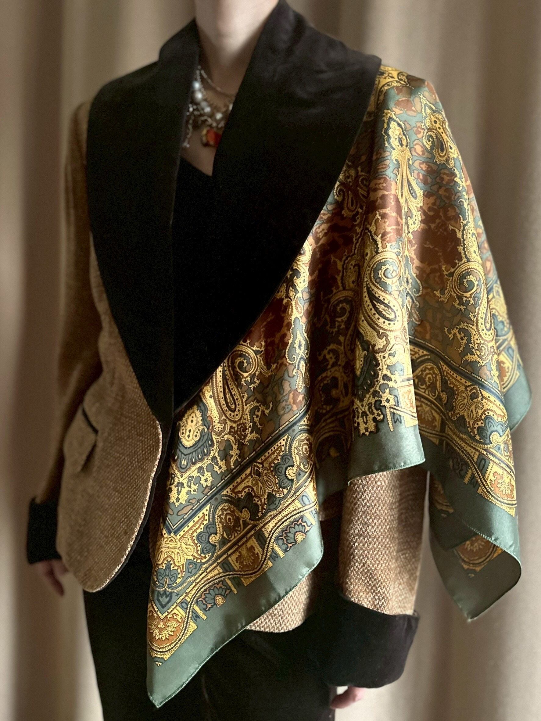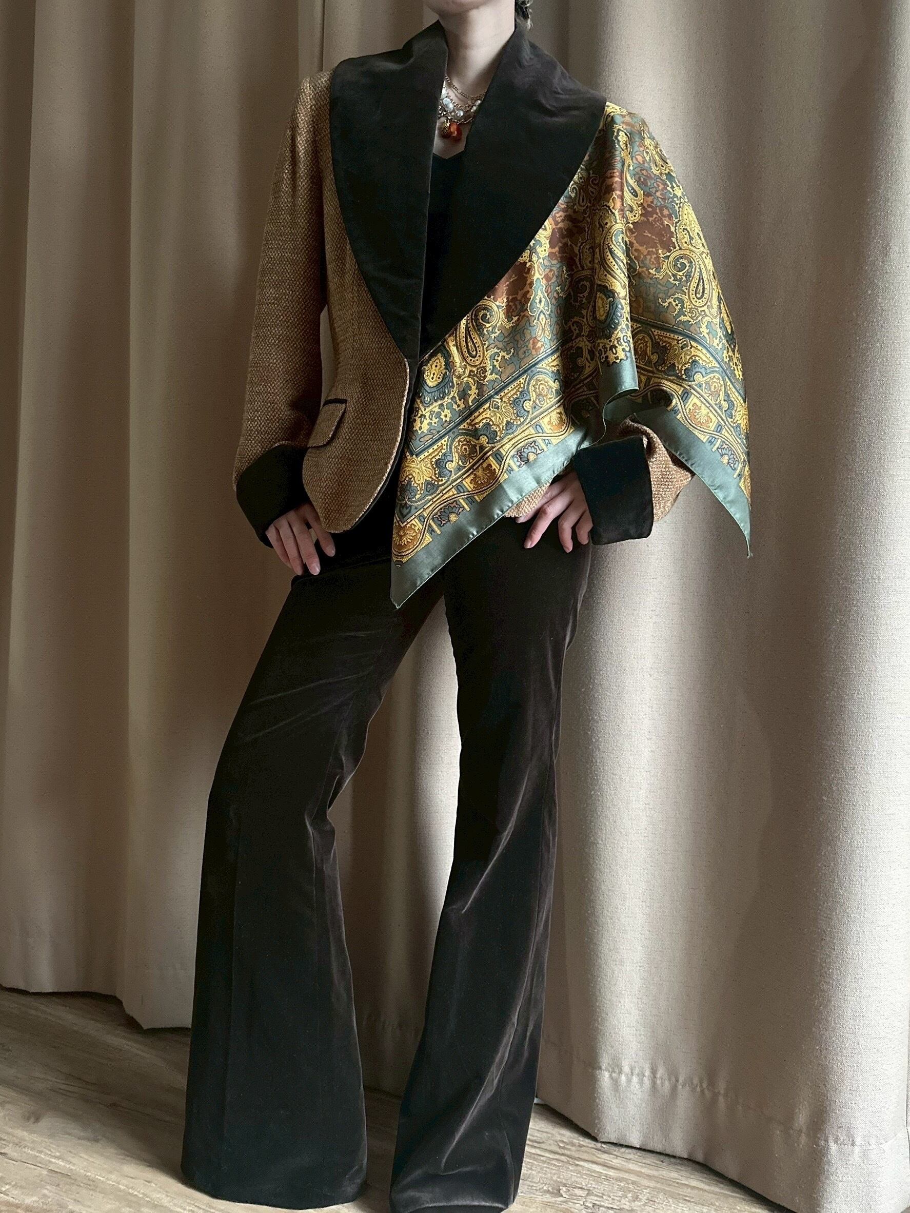 重厚感のあるショールカラージャケットに、クラシックなスカーフとゴールドブローチを組み合わせた、ラグジュアリーなセットアイテム。