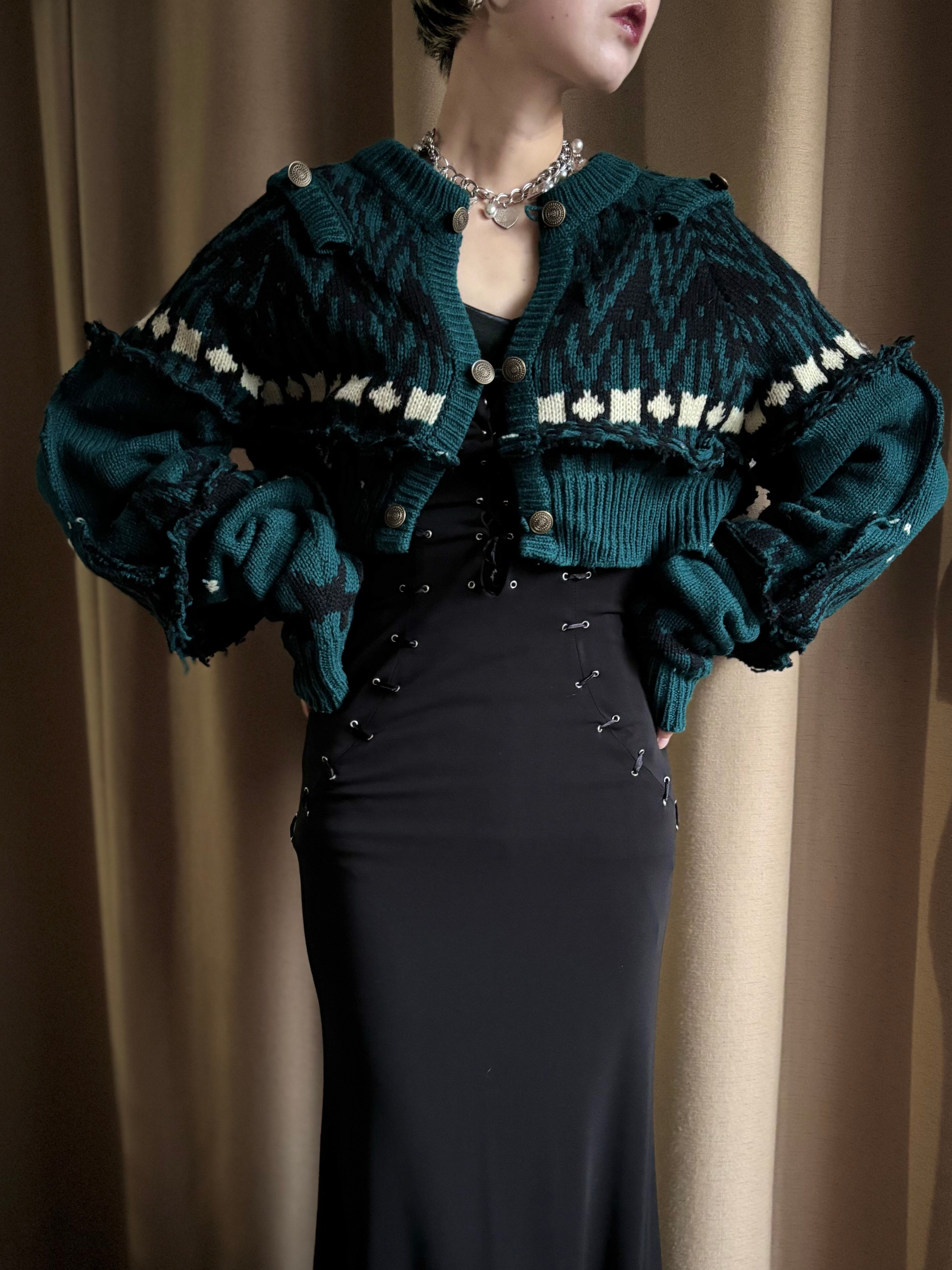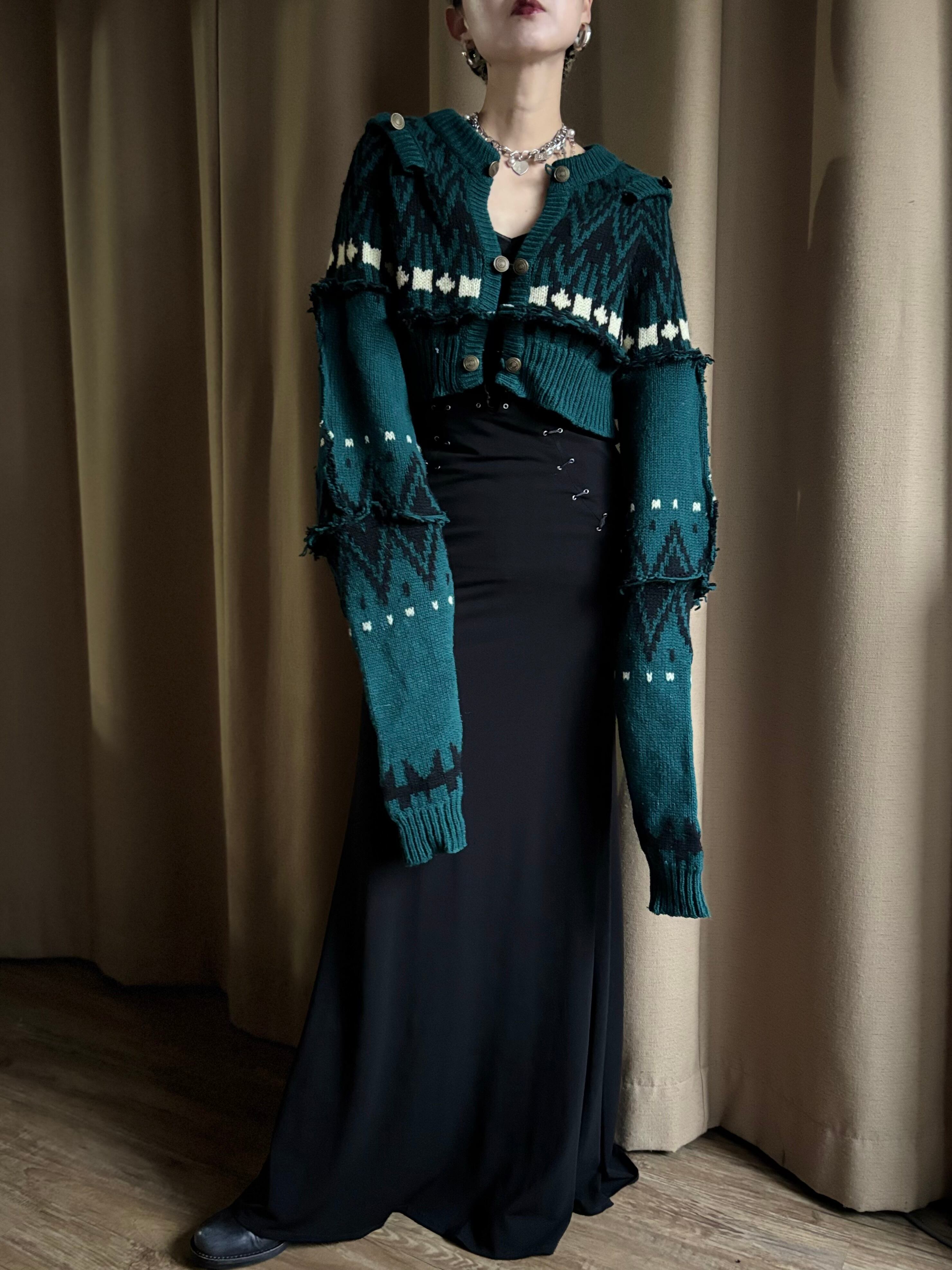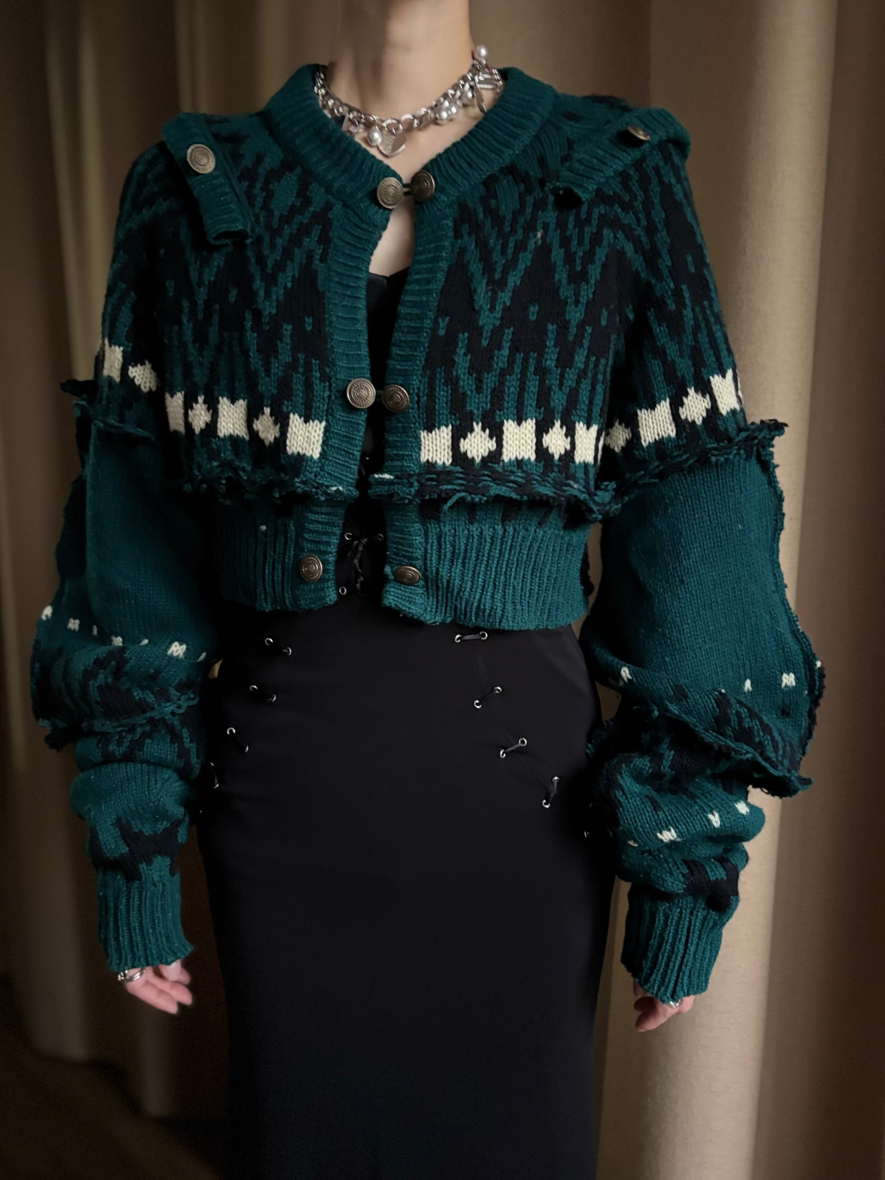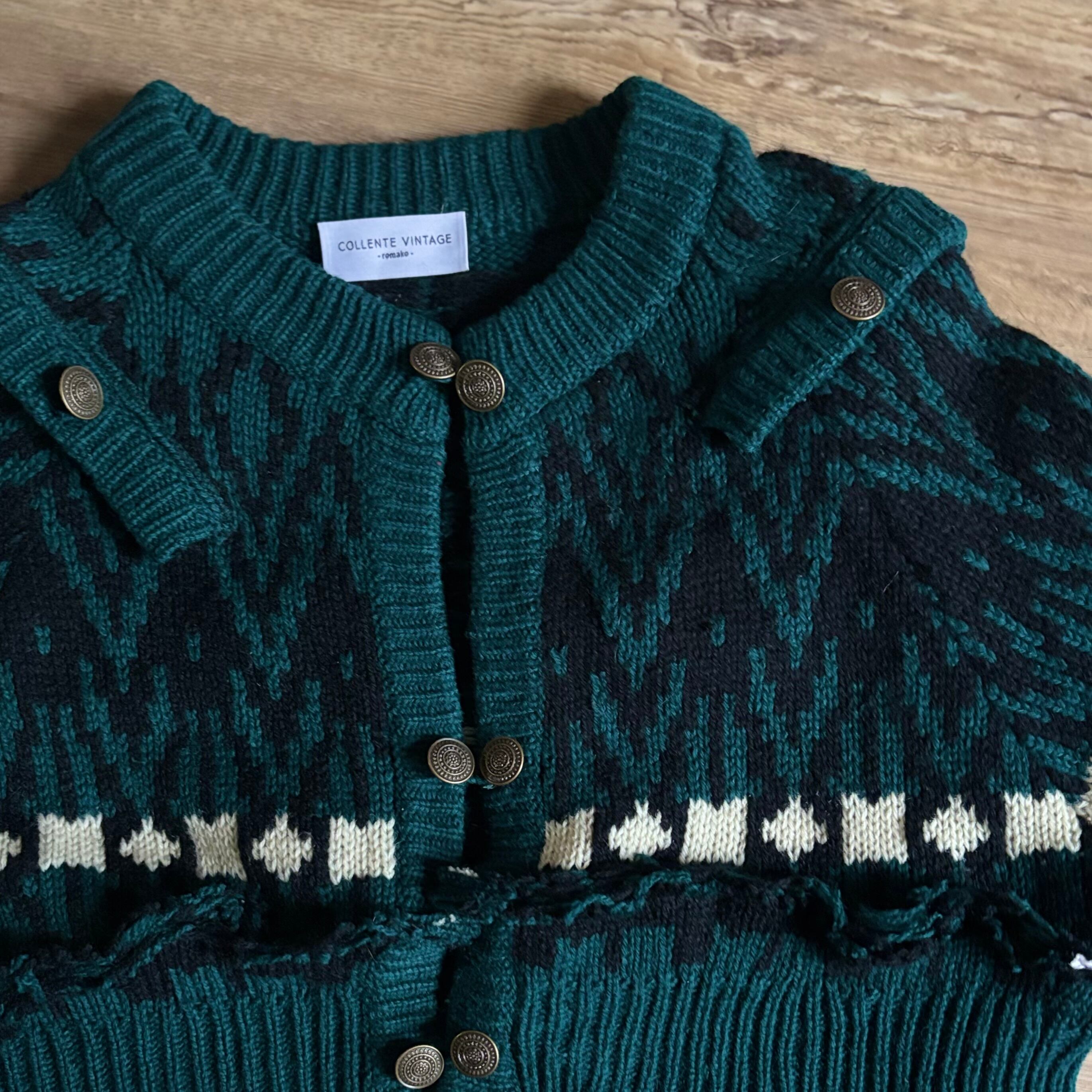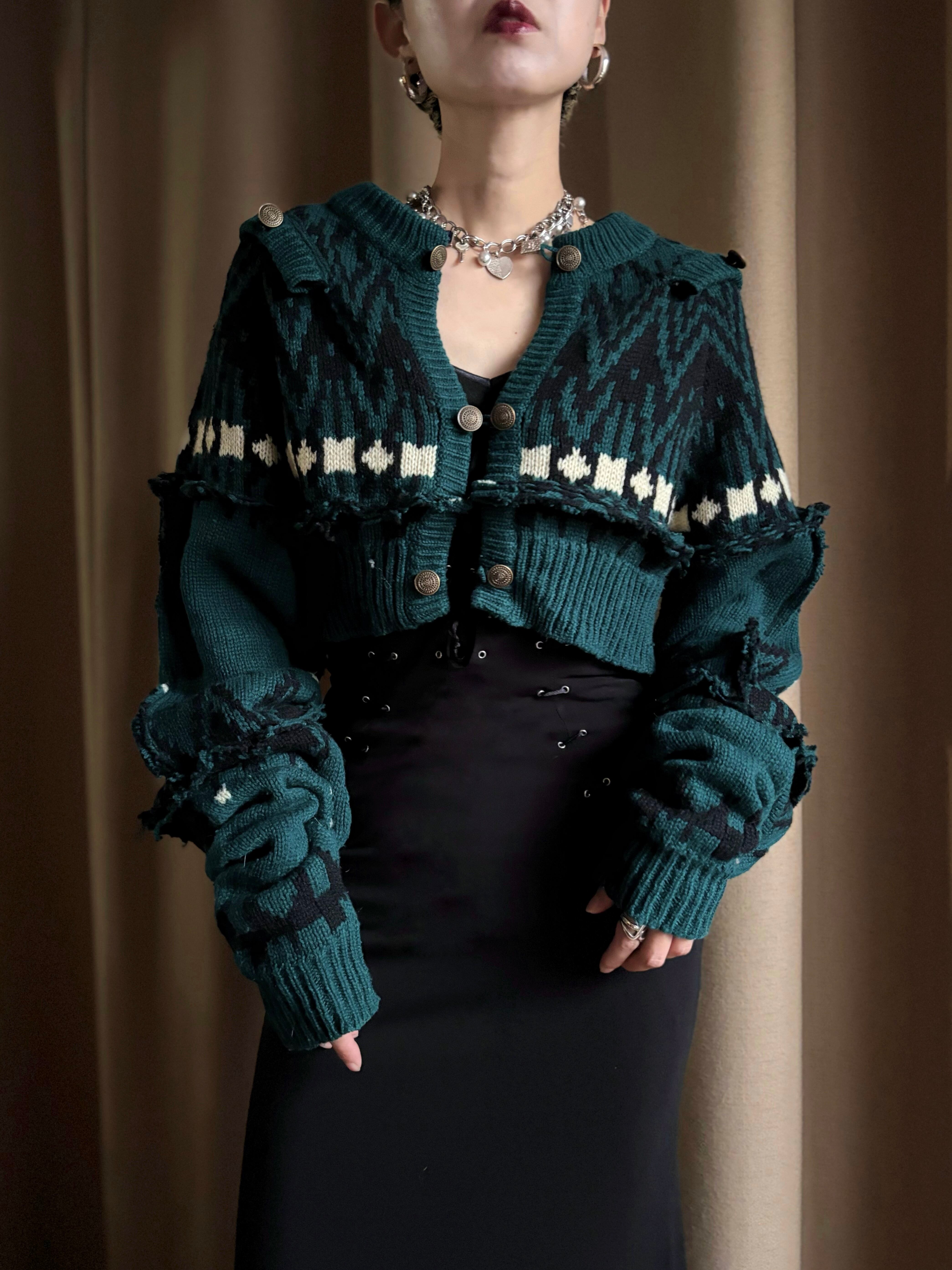 深みのあるグリーンが大人の魅力を放つリメイクニットカーディガン。