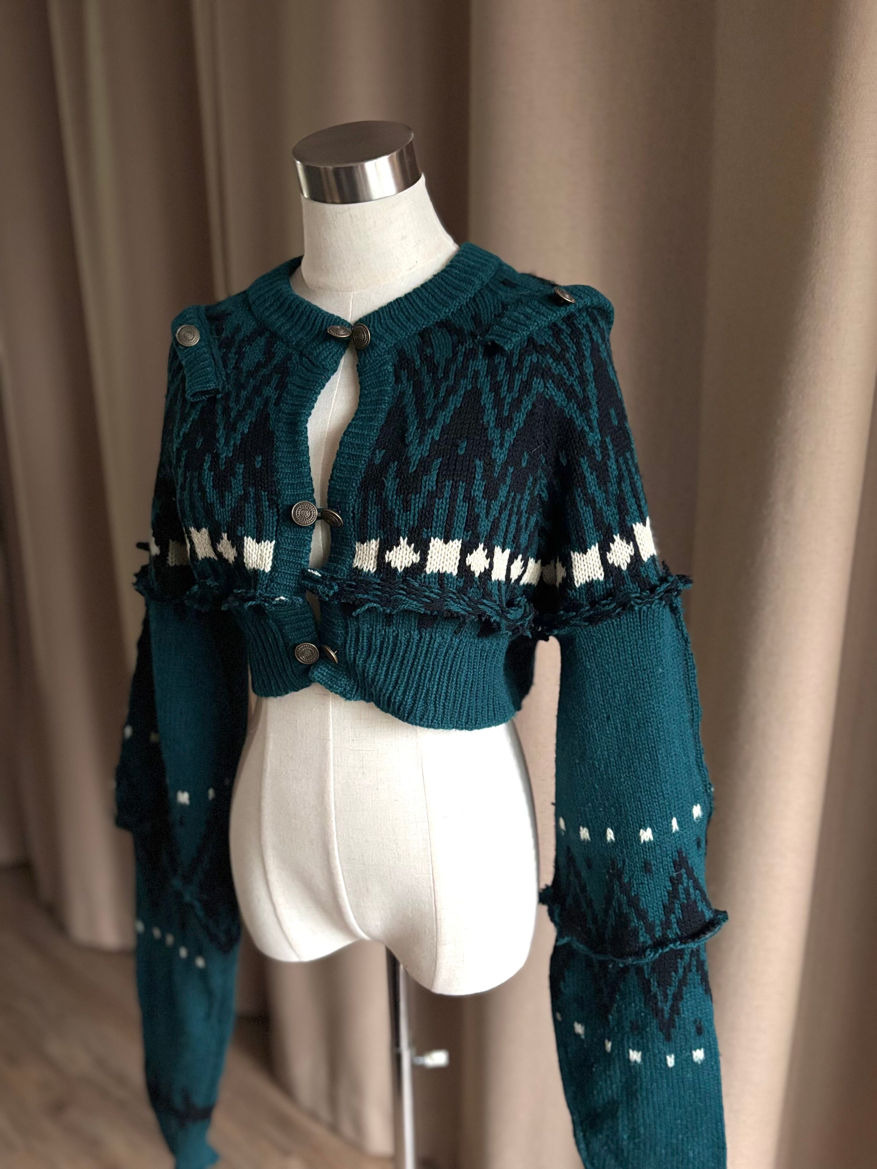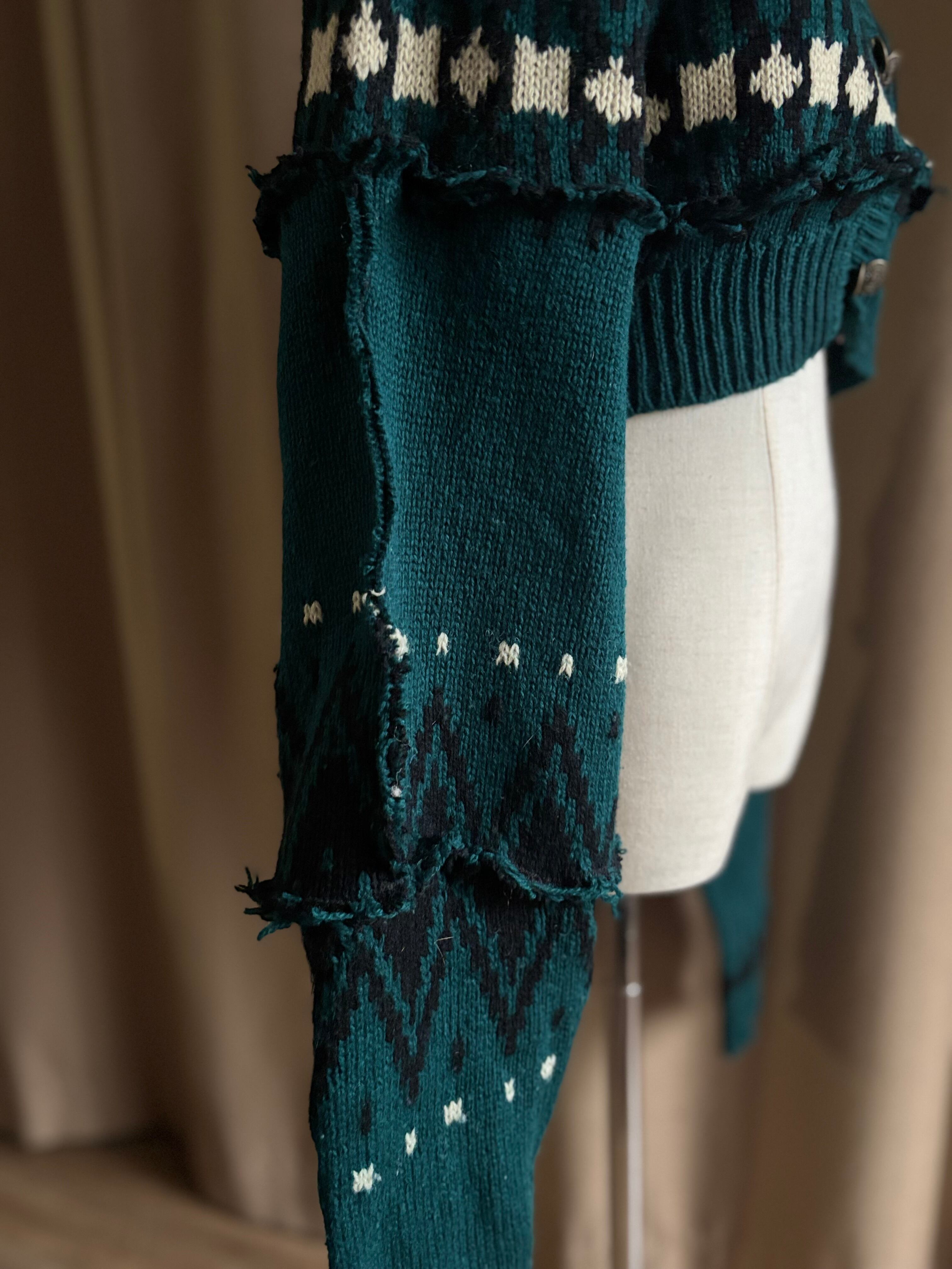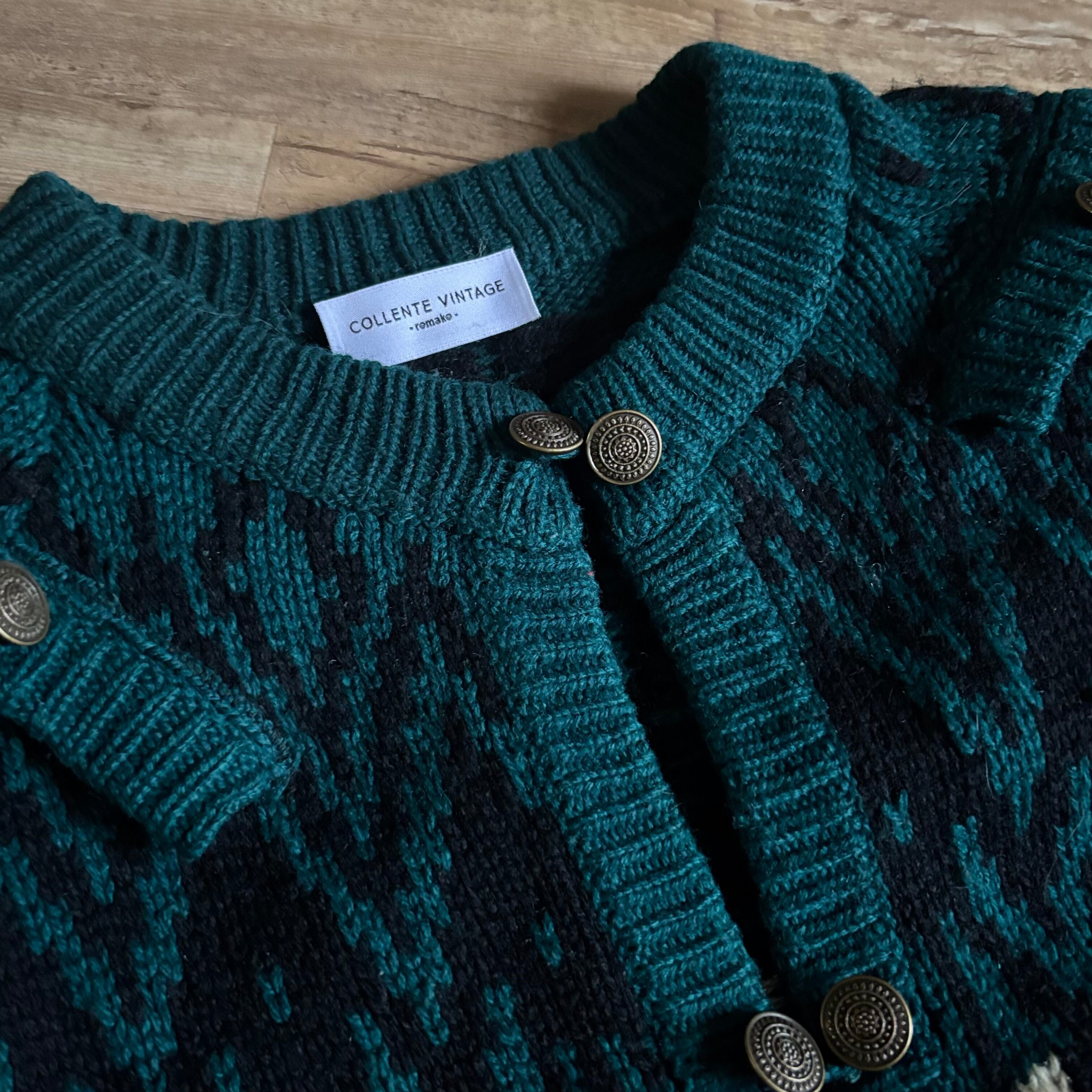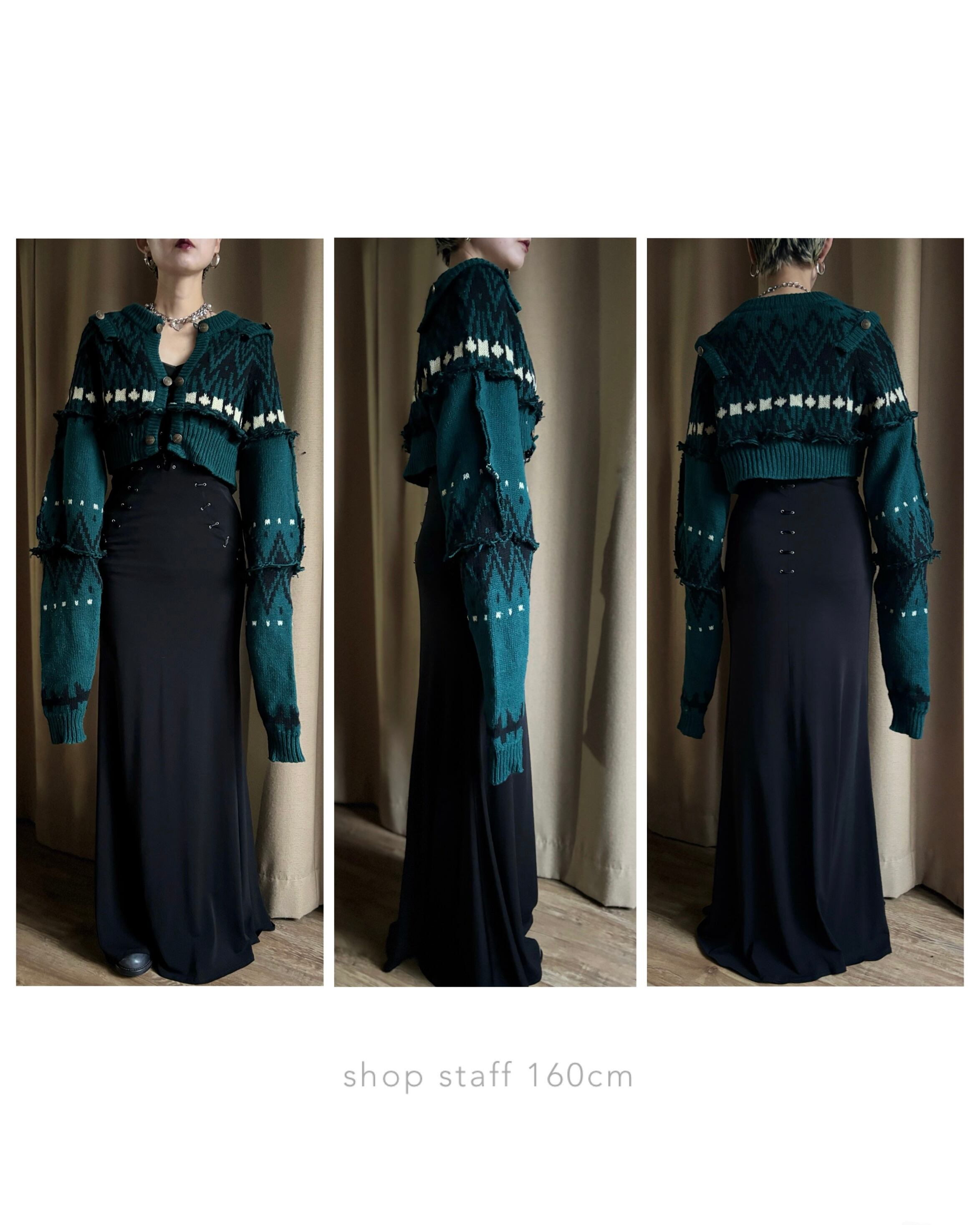 深みのあるグリーンが大人の魅力を放つリメイクニットカーディガン。
