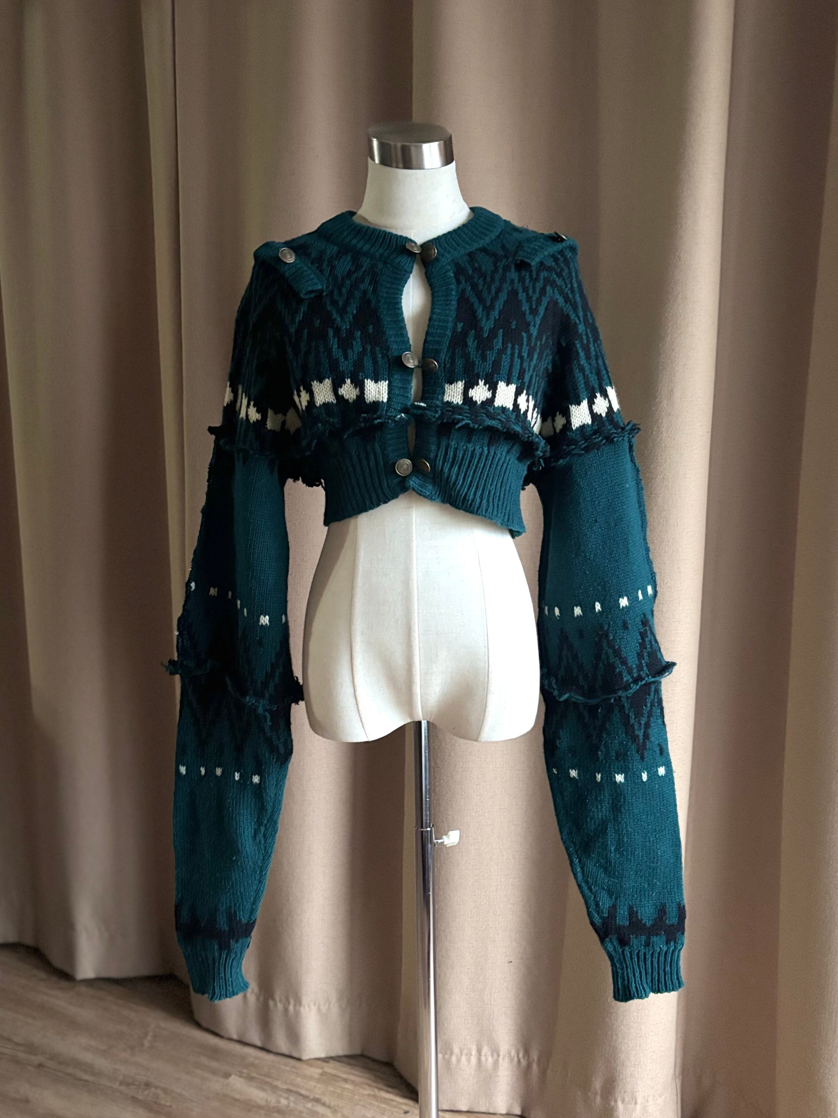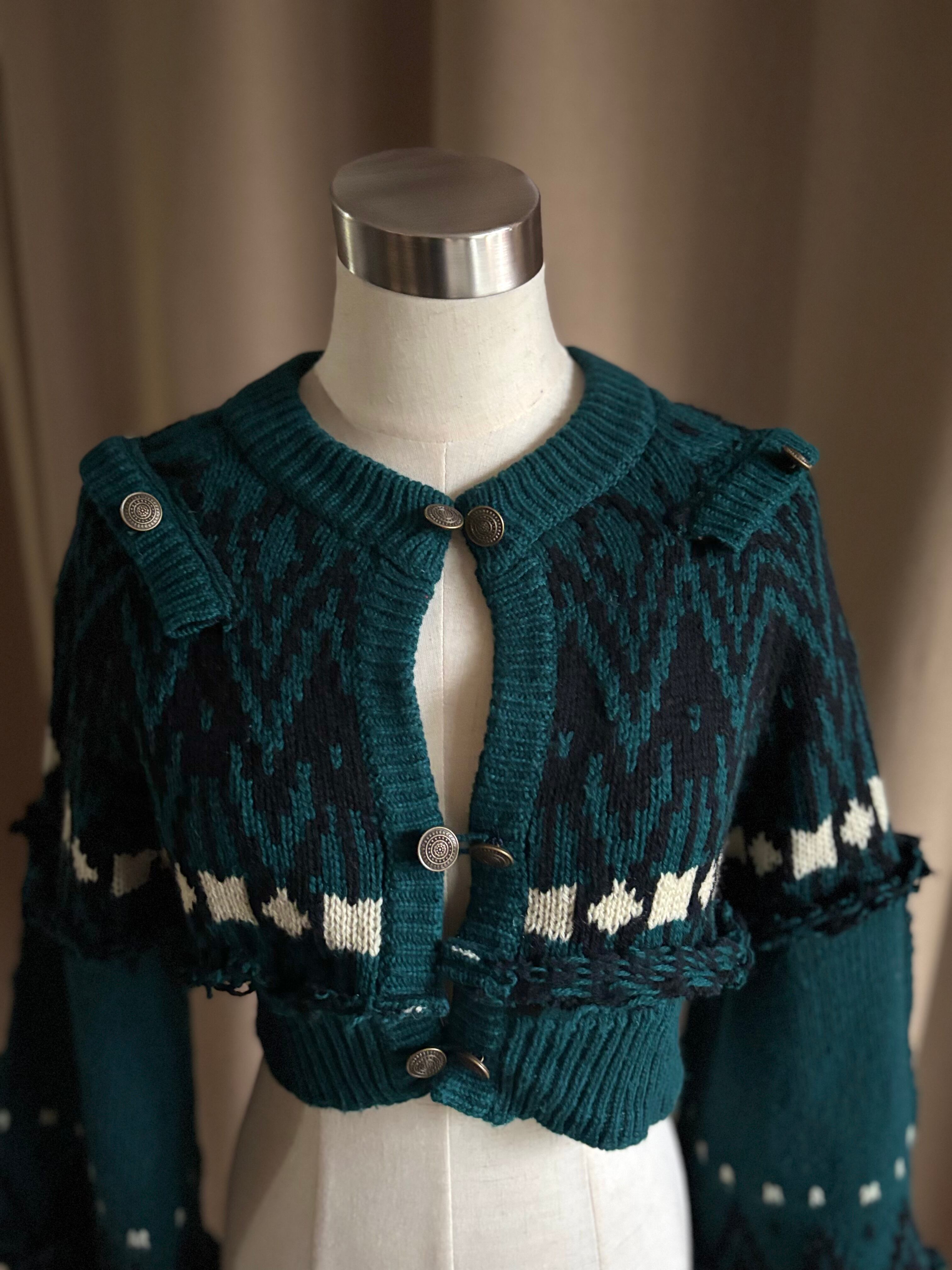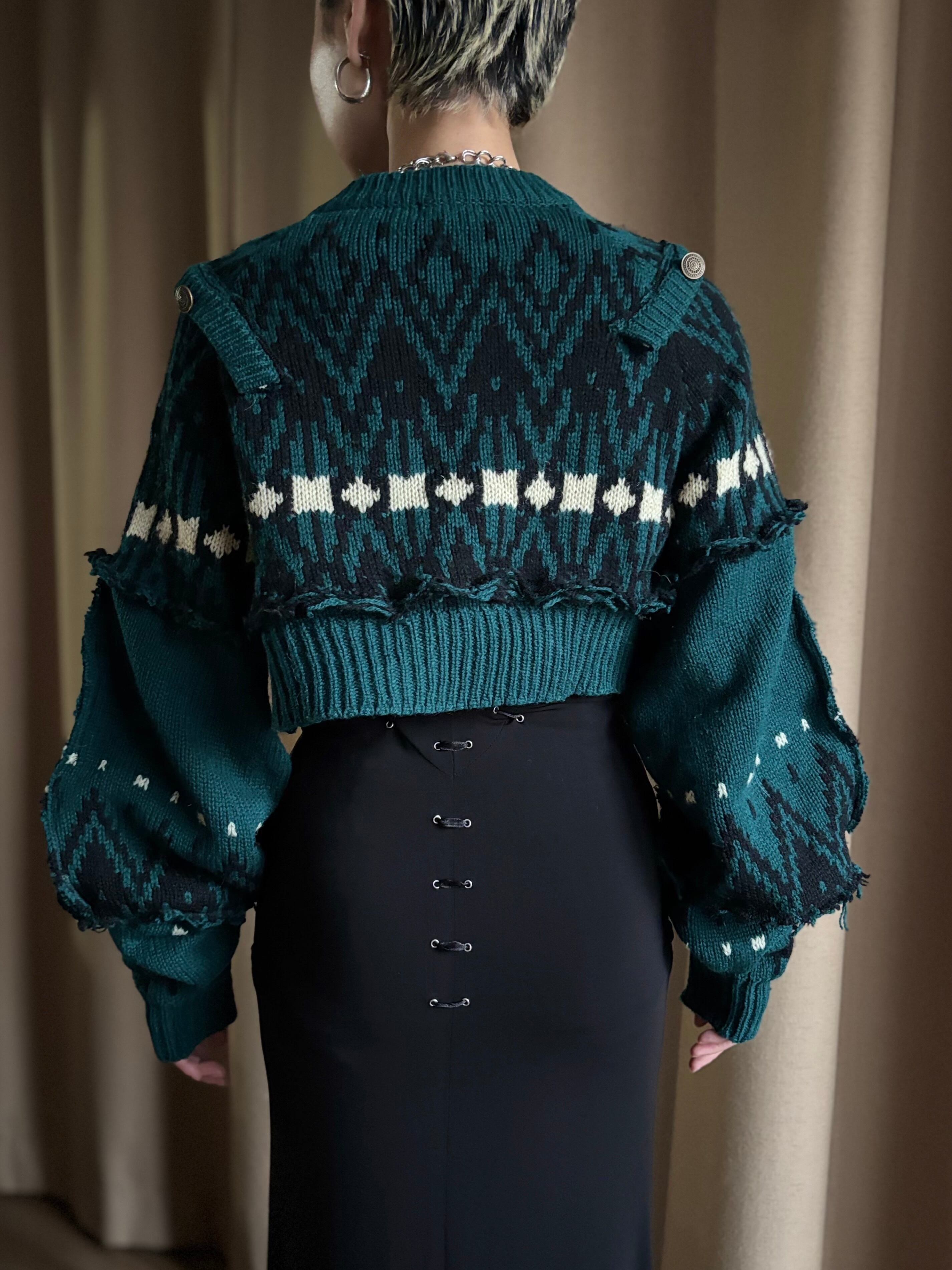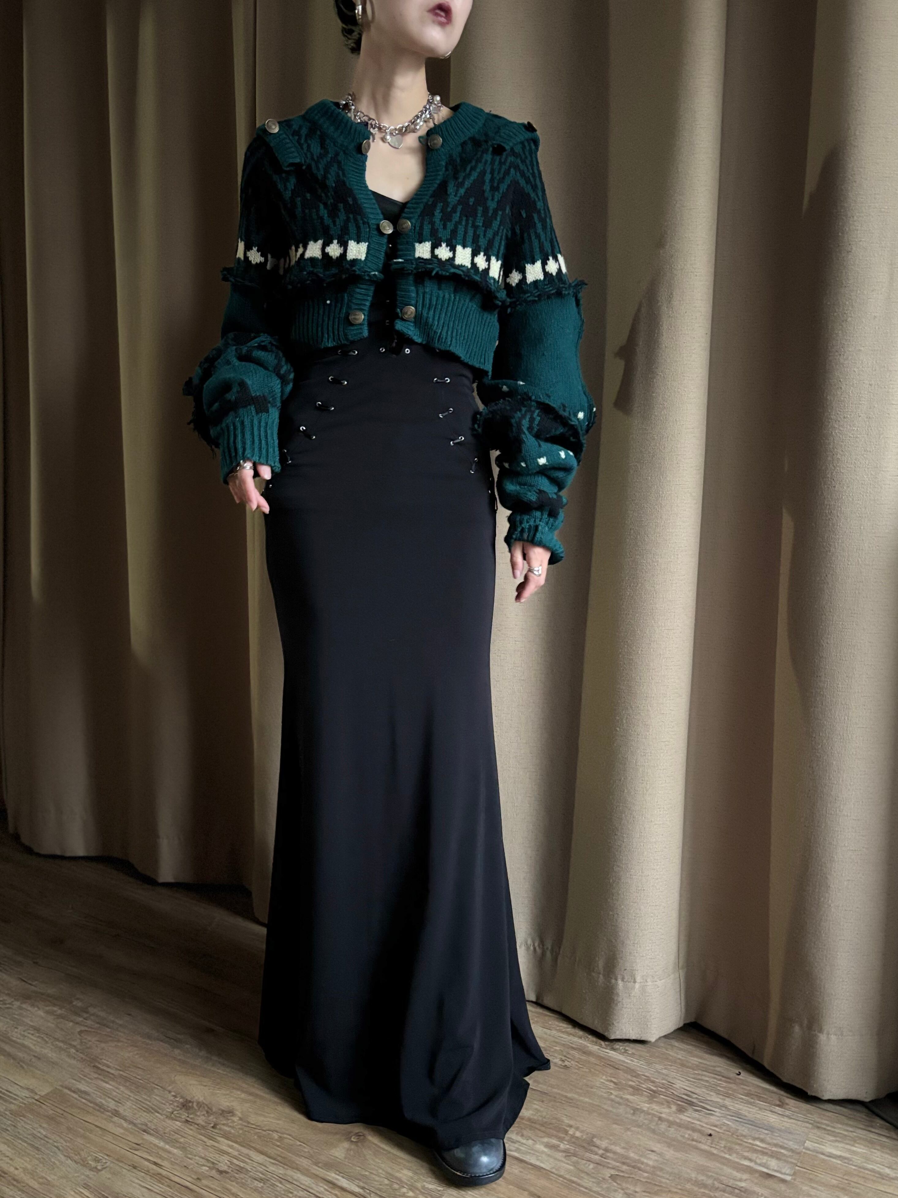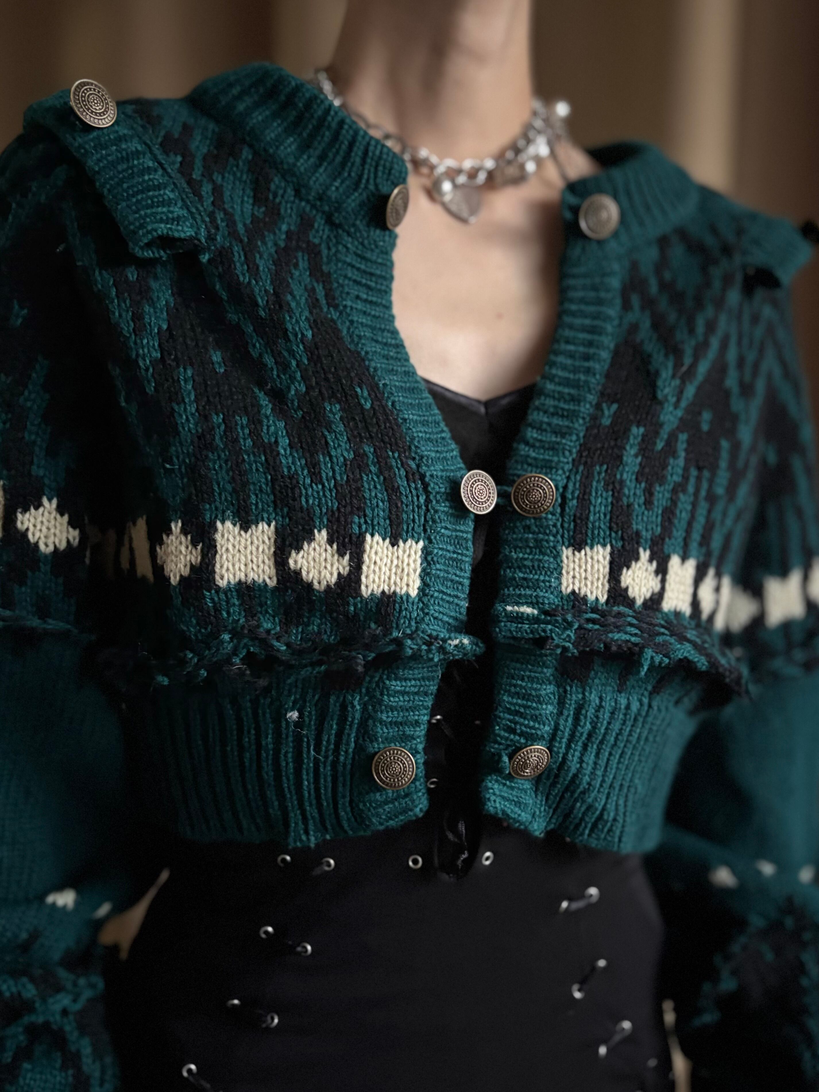 深みのあるグリーンが大人の魅力を放つリメイクニットカーディガン。