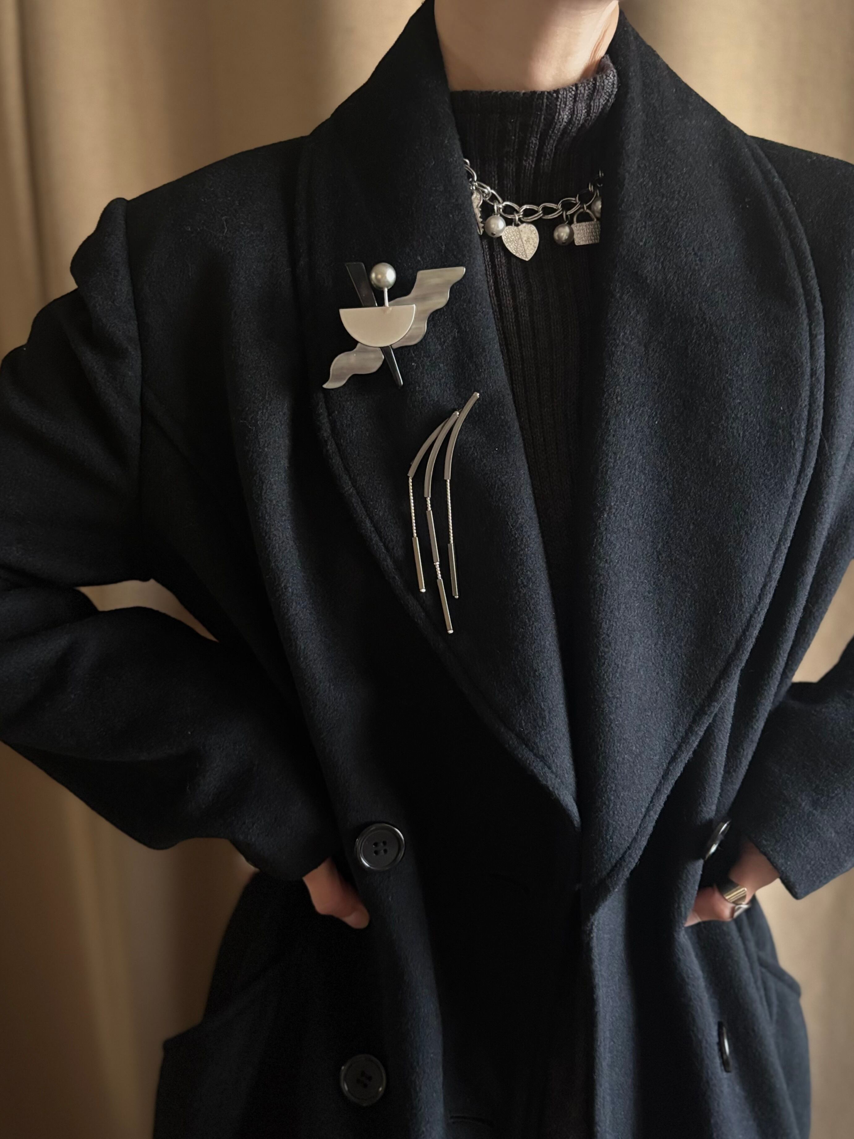 シルバー×ブラックの幾何学的なヴィンテージブローチが個性を放ち、コーディネートを一気に格上げ。