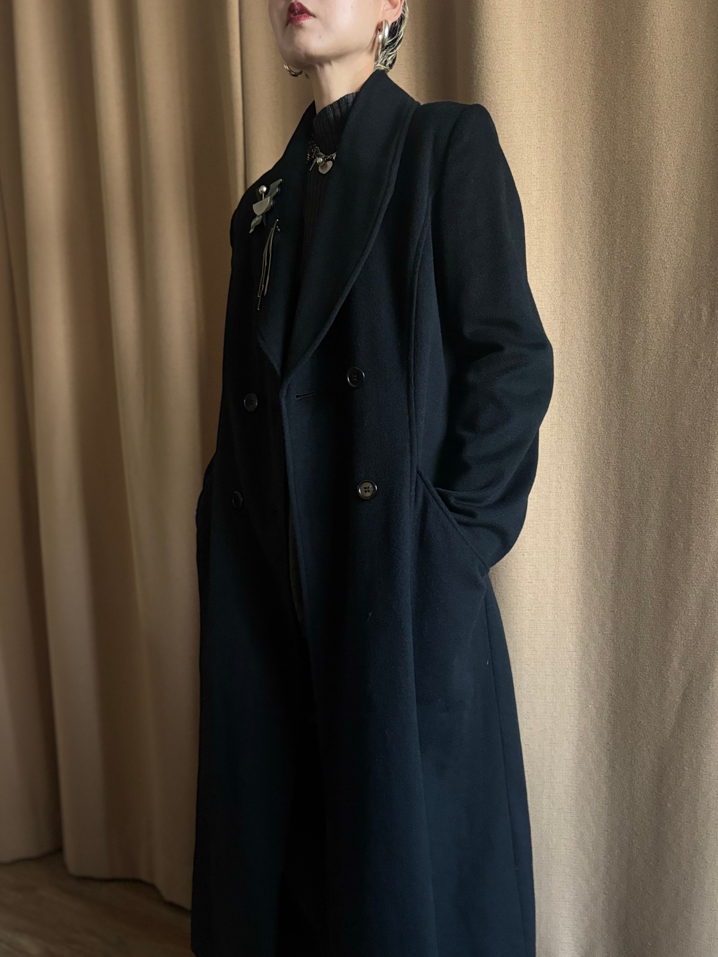 ヴィンテージブローチがセットになった、モードを纏うブラックロングコート。