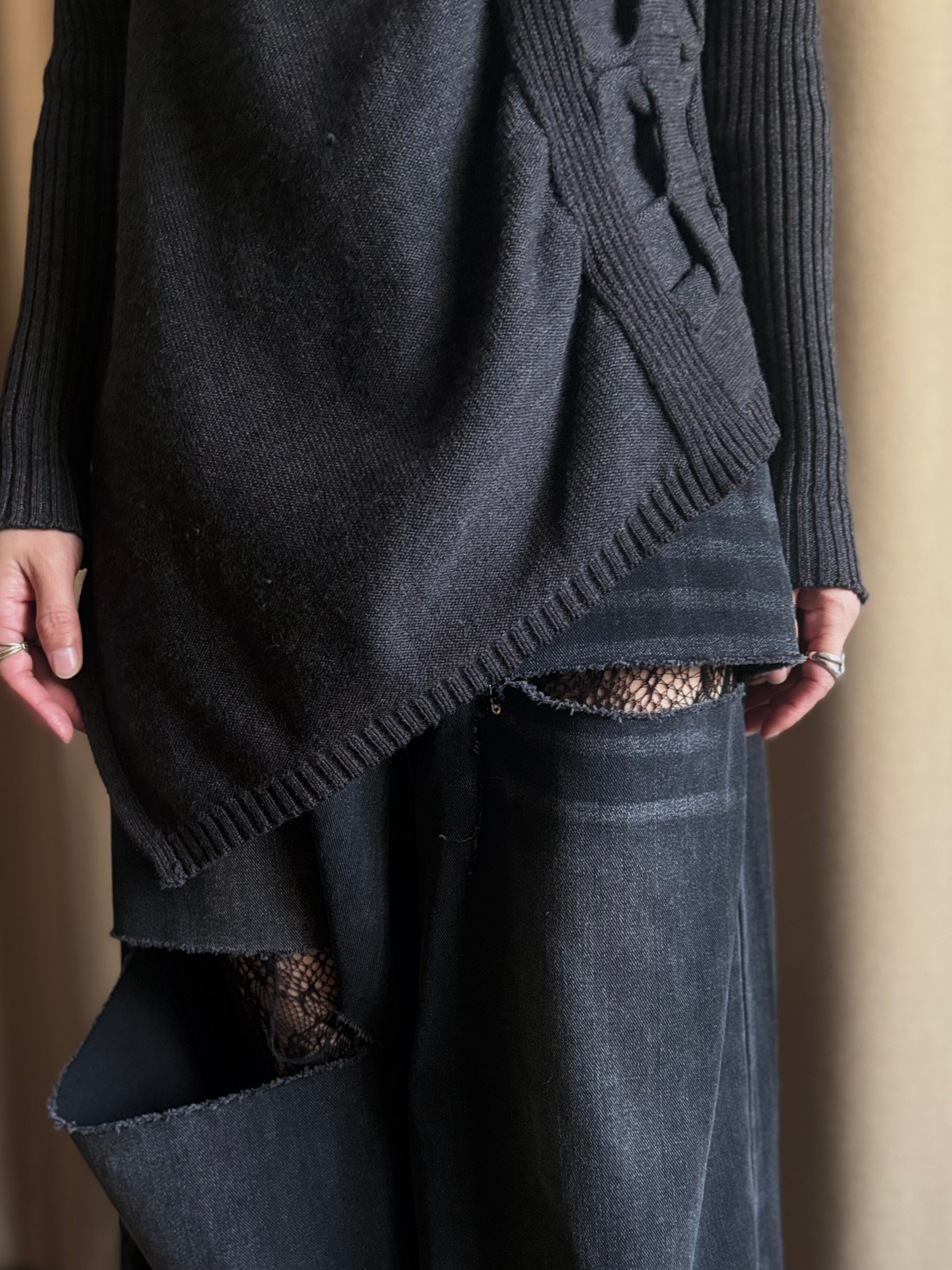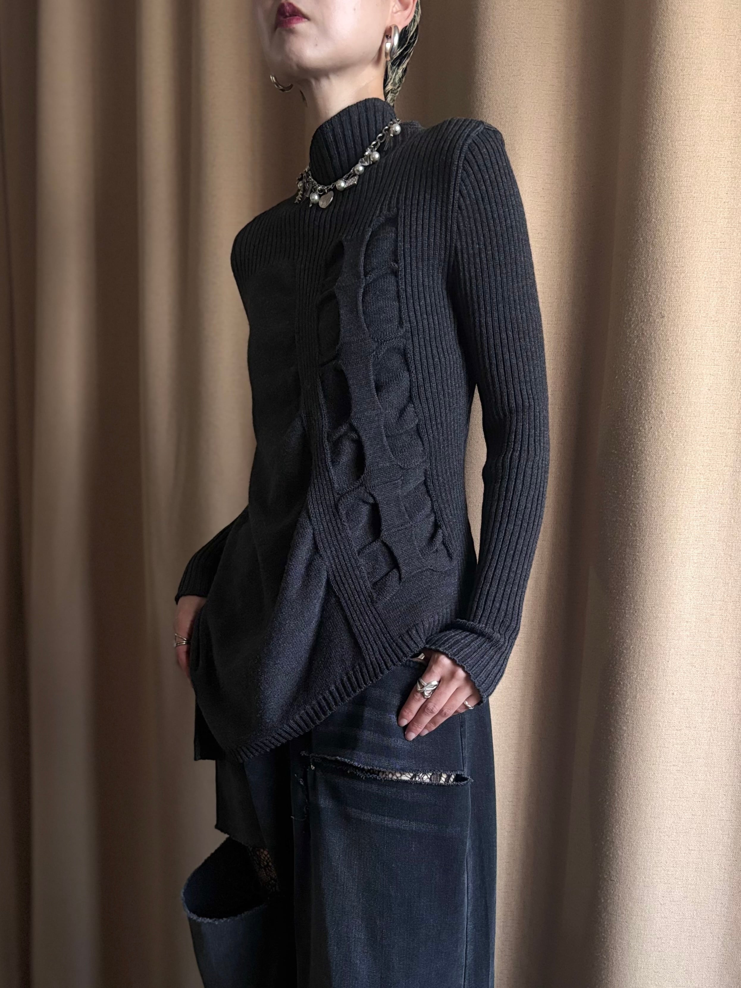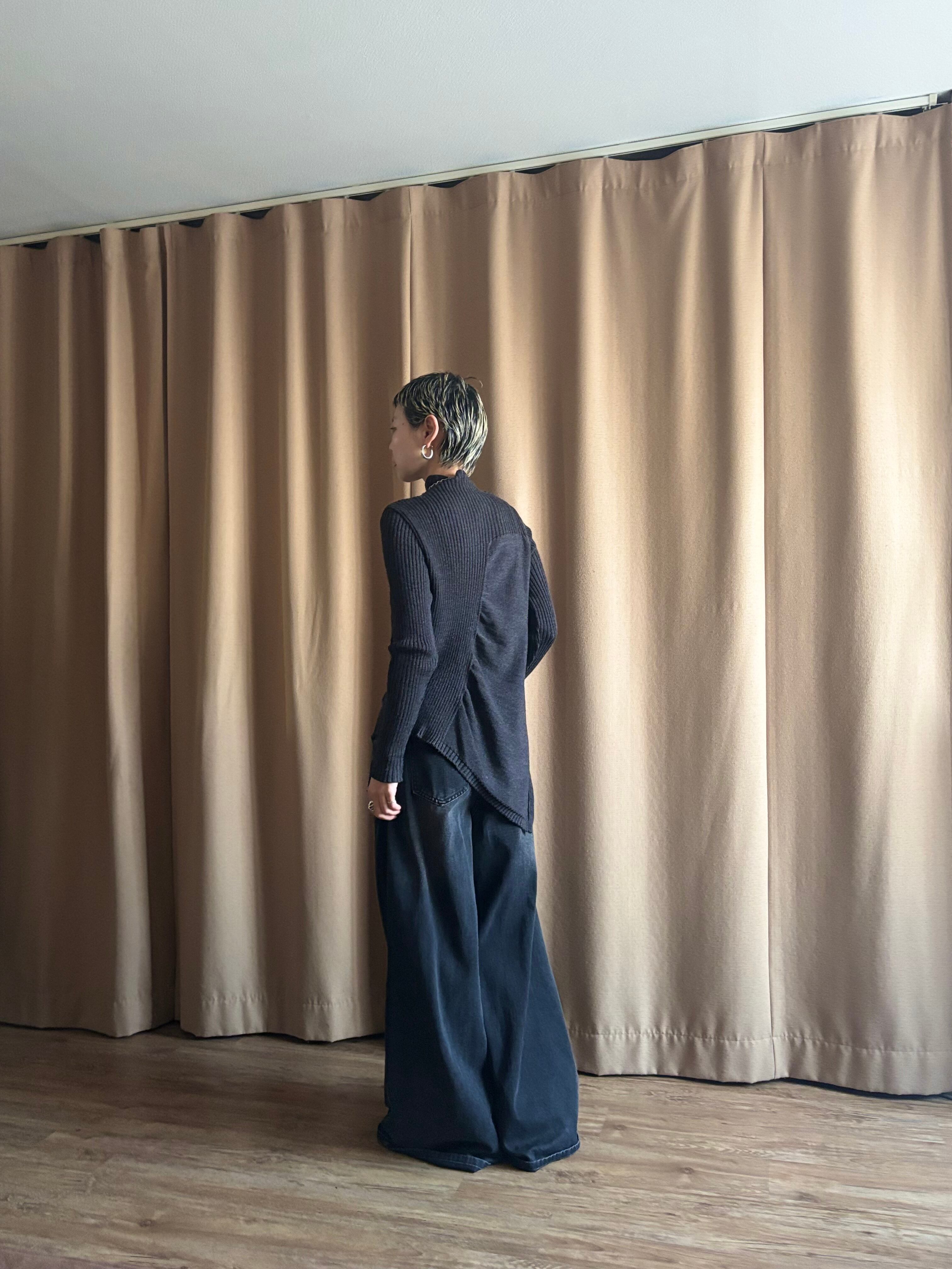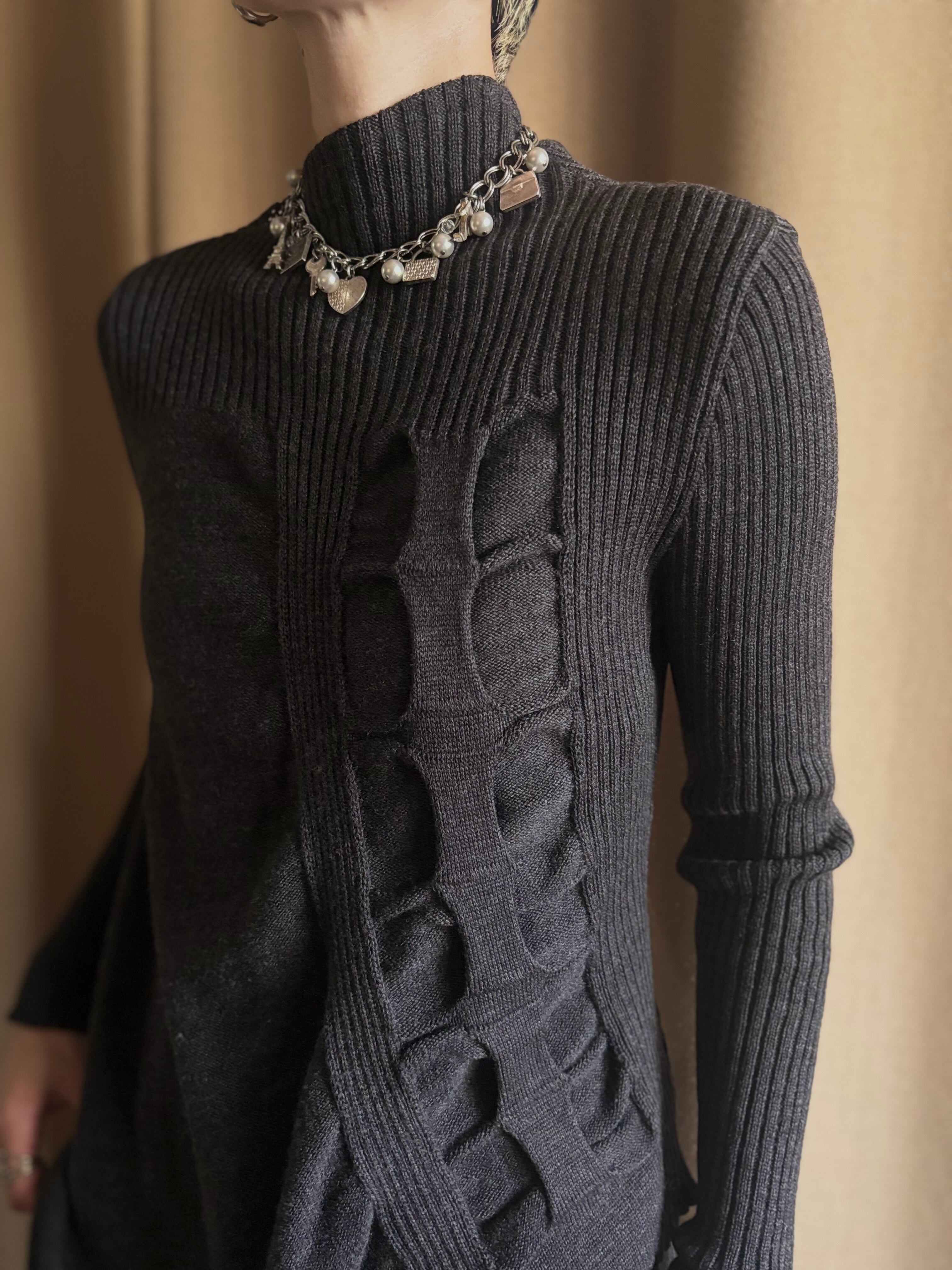 フロントに施された立体的な編みディテールと、流れるような斜めラインがシルエットに奥行きを生み出し、着るだけでスタイルにニュアンスを添えてくれます。