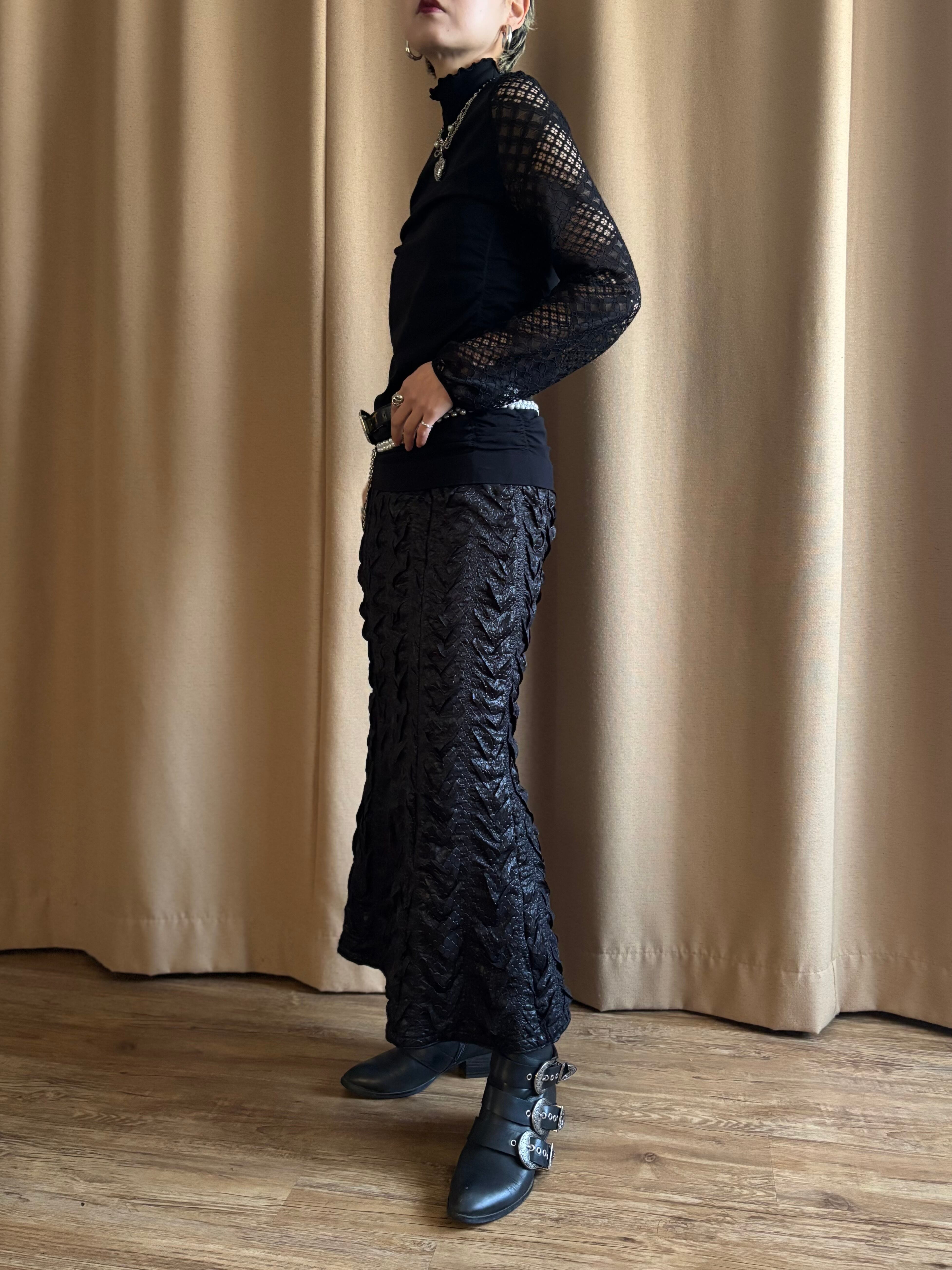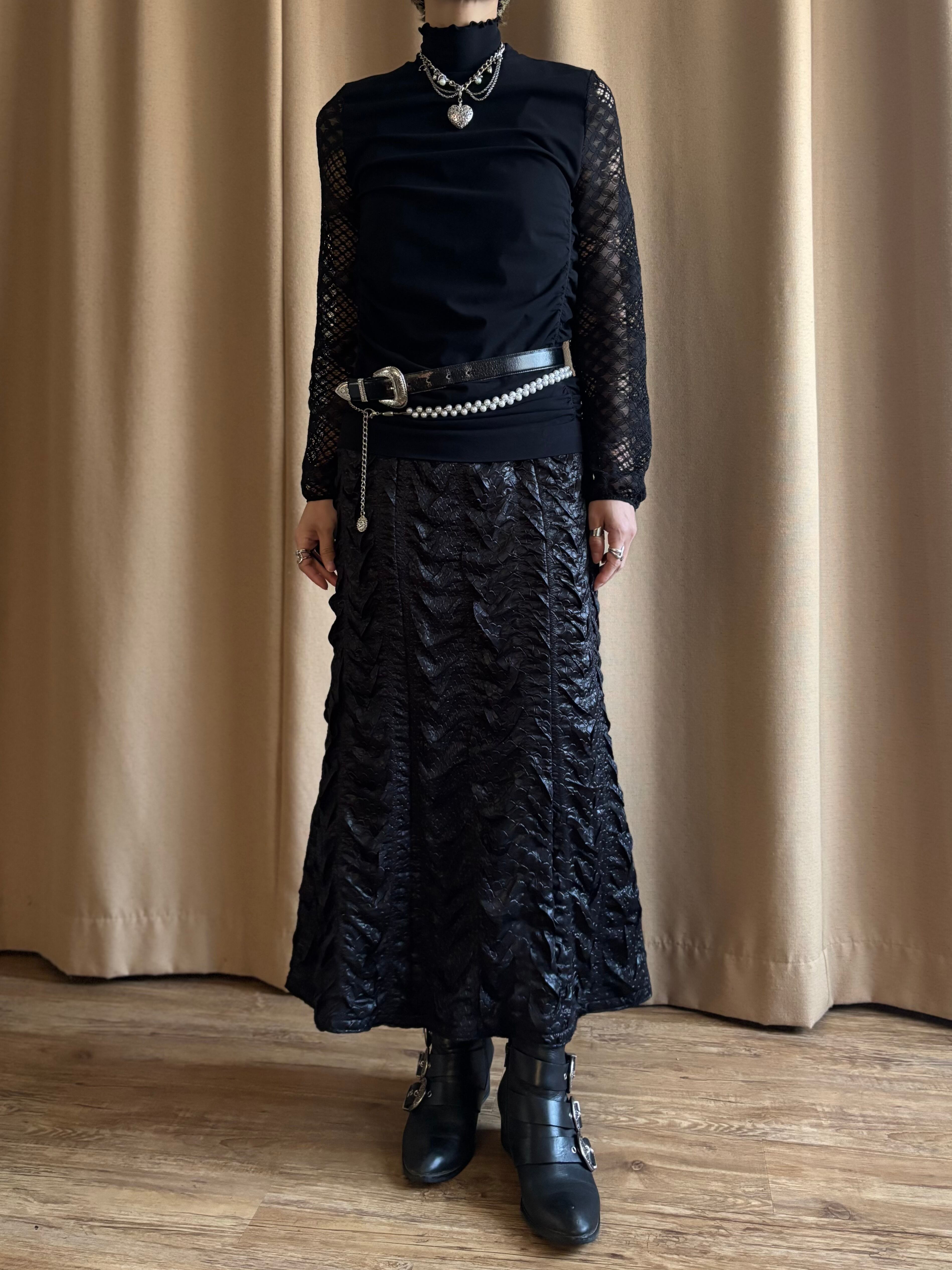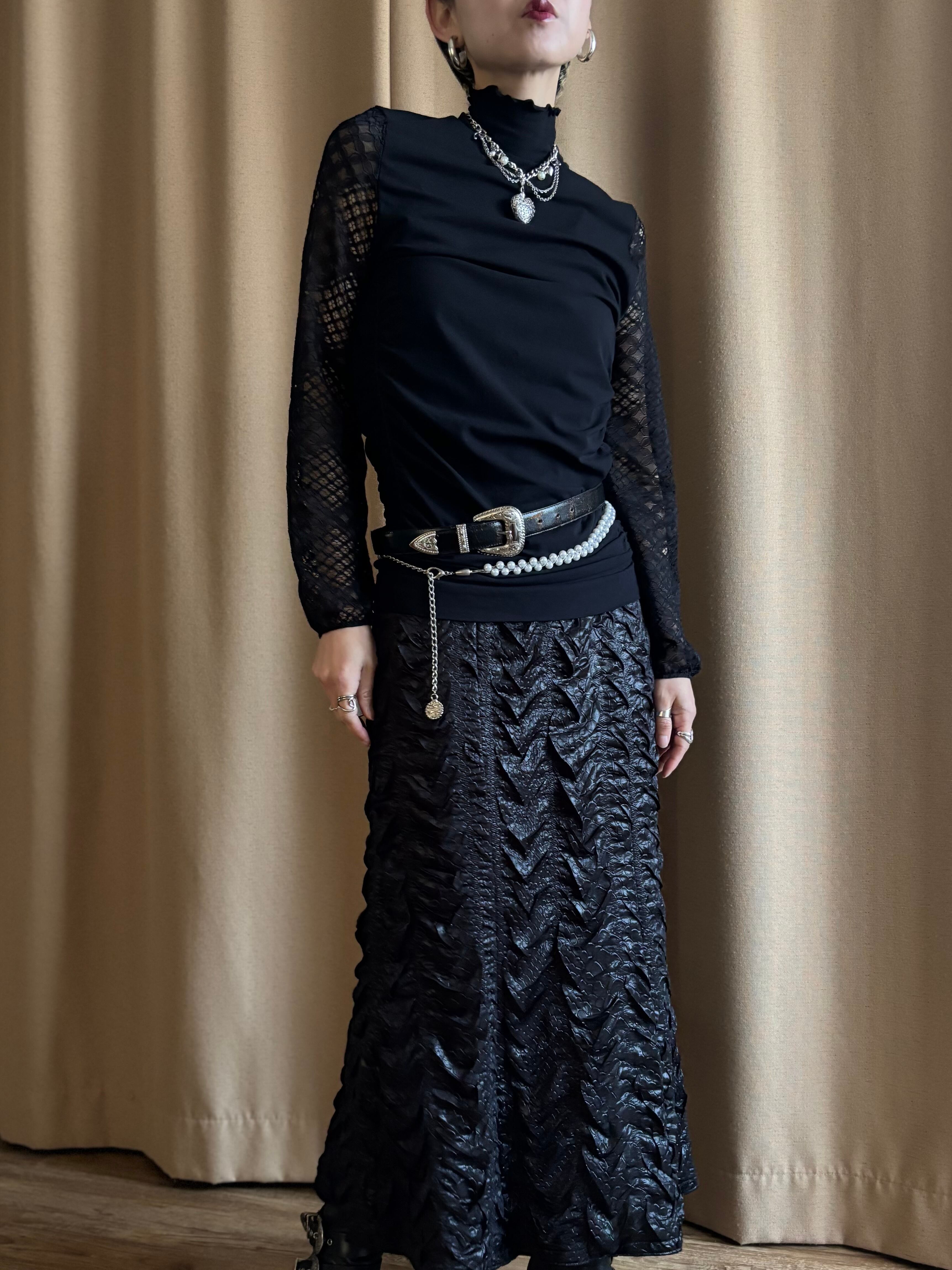 光の角度によって艶が変化する素材感が動くたびに表情を生み出し、装いにアーティスティックな存在感を添えます。