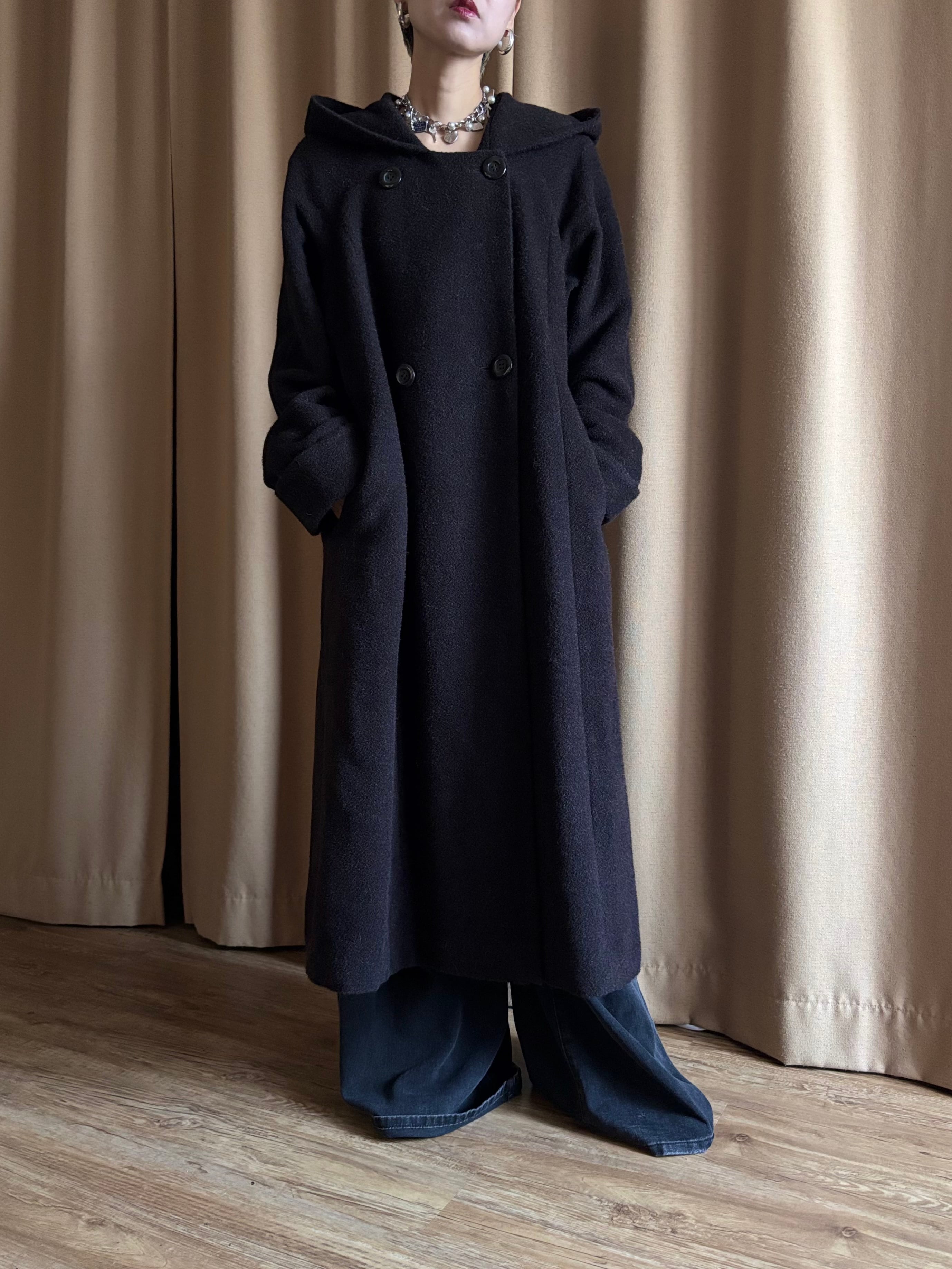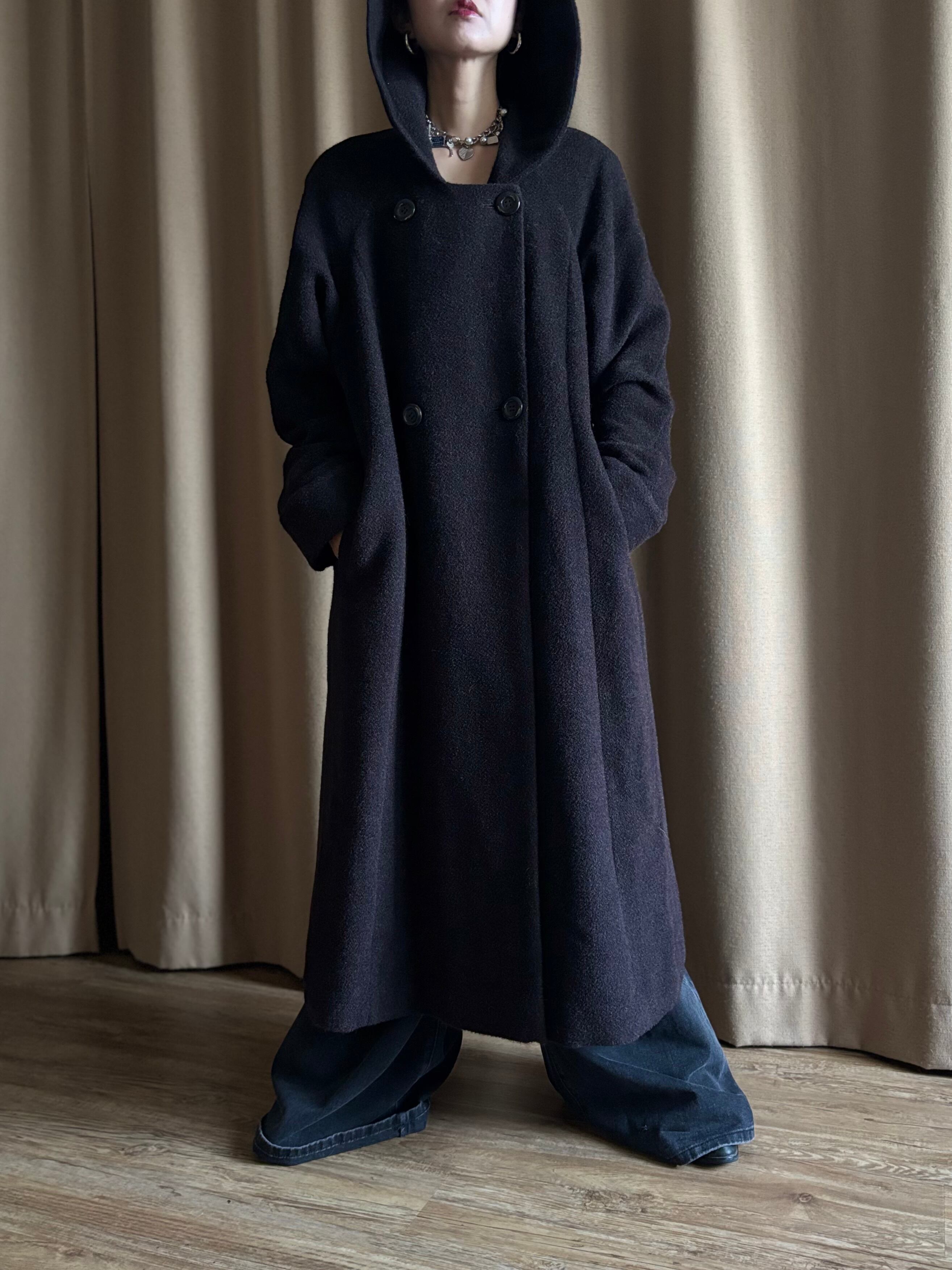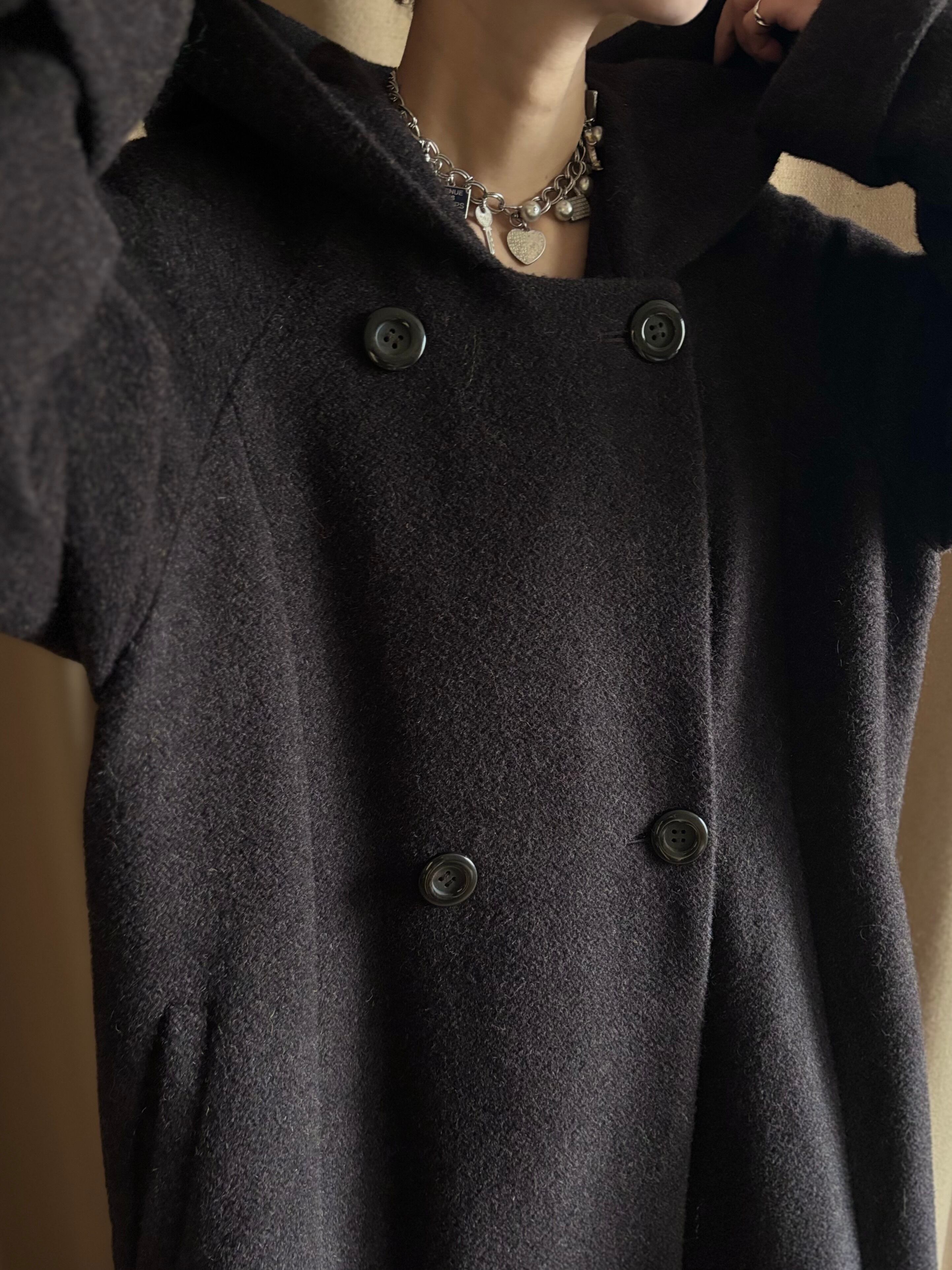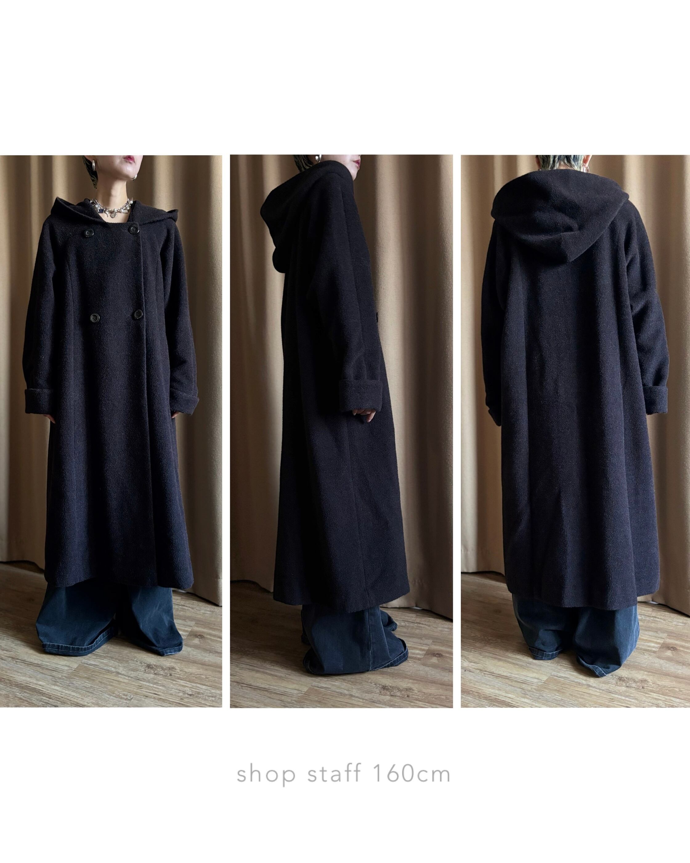 深みのあるダークブラウンにフーディーが旬な日本製ロングコート。
