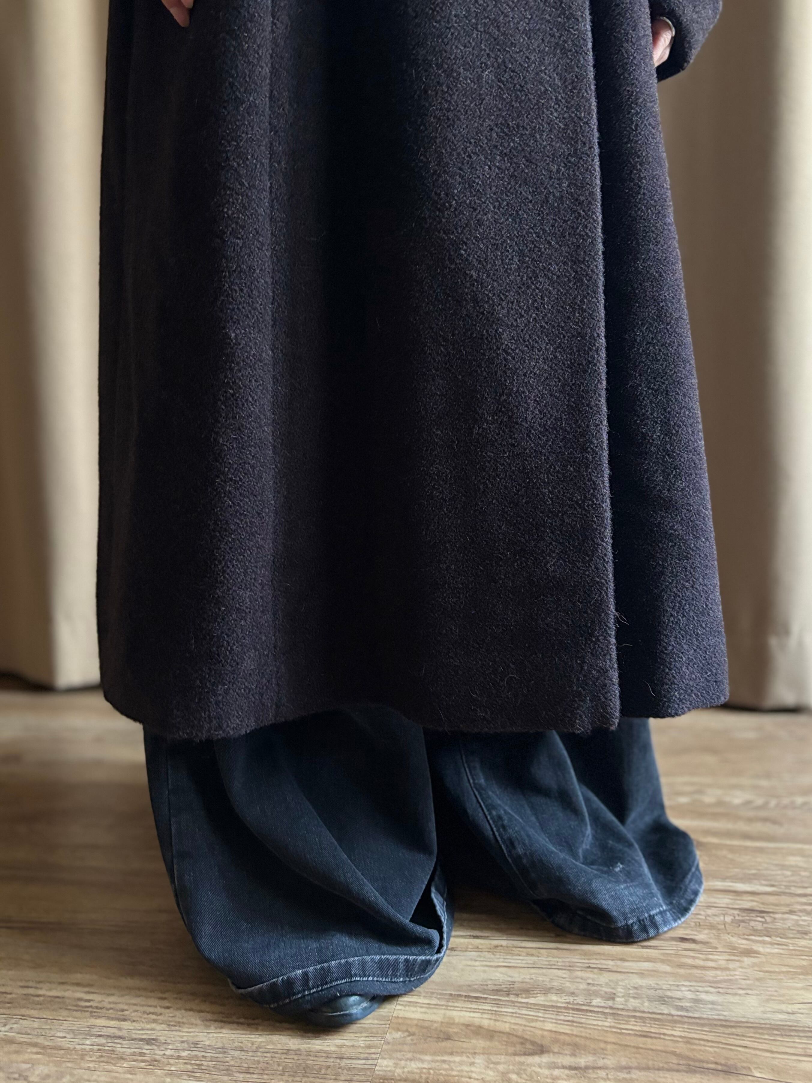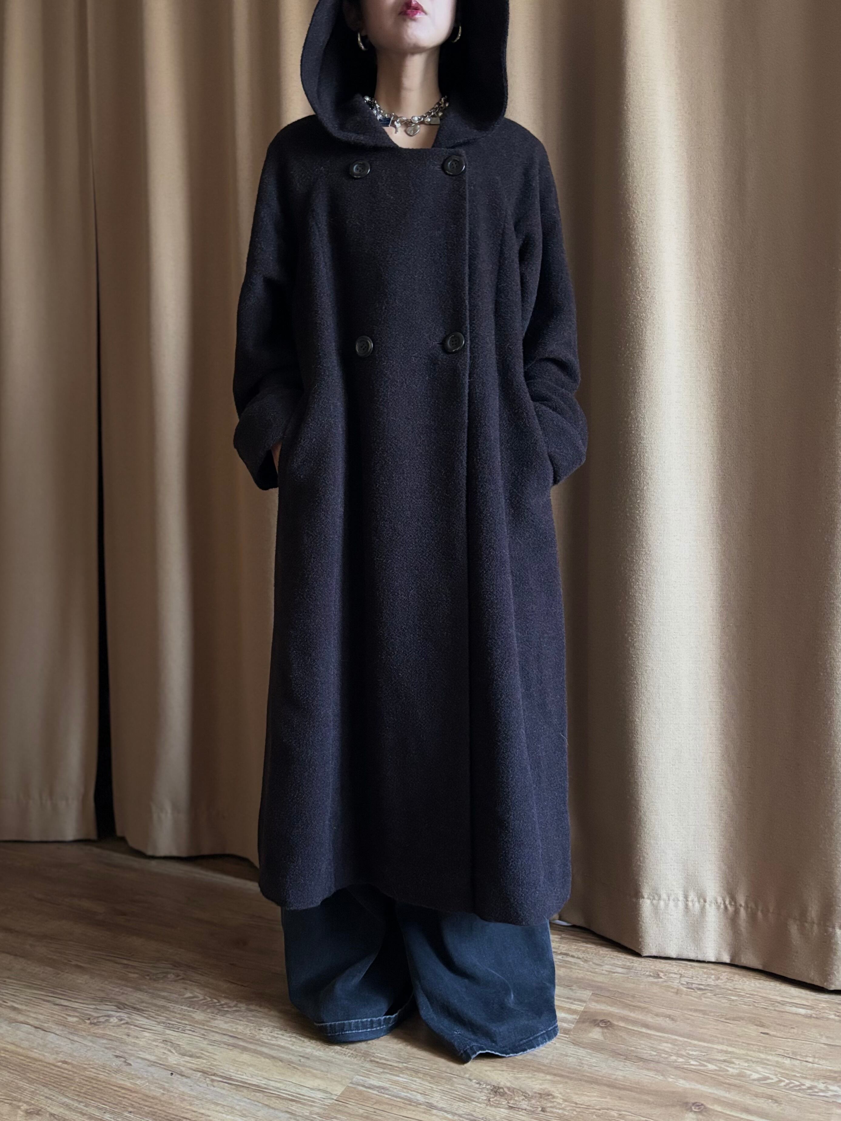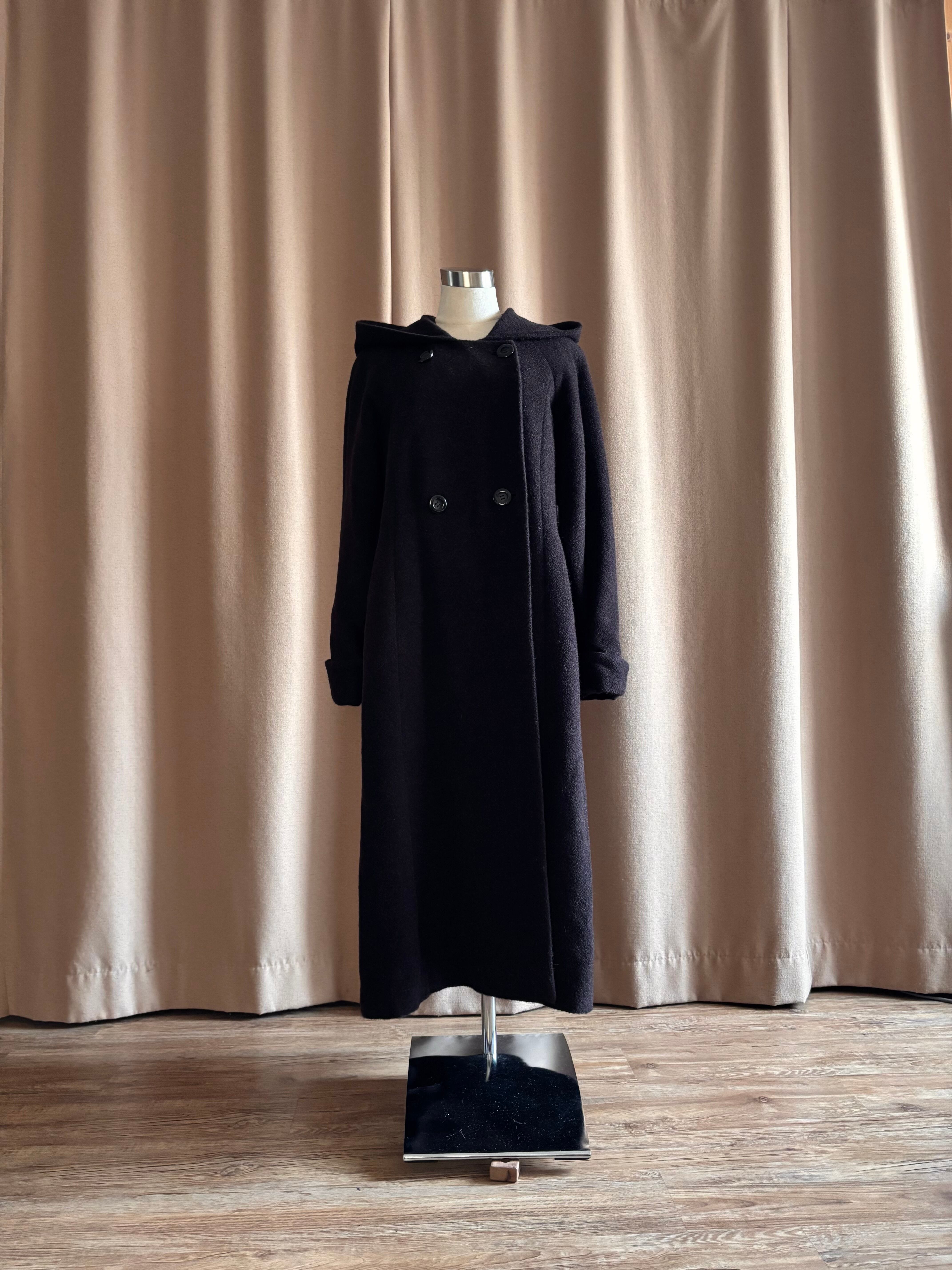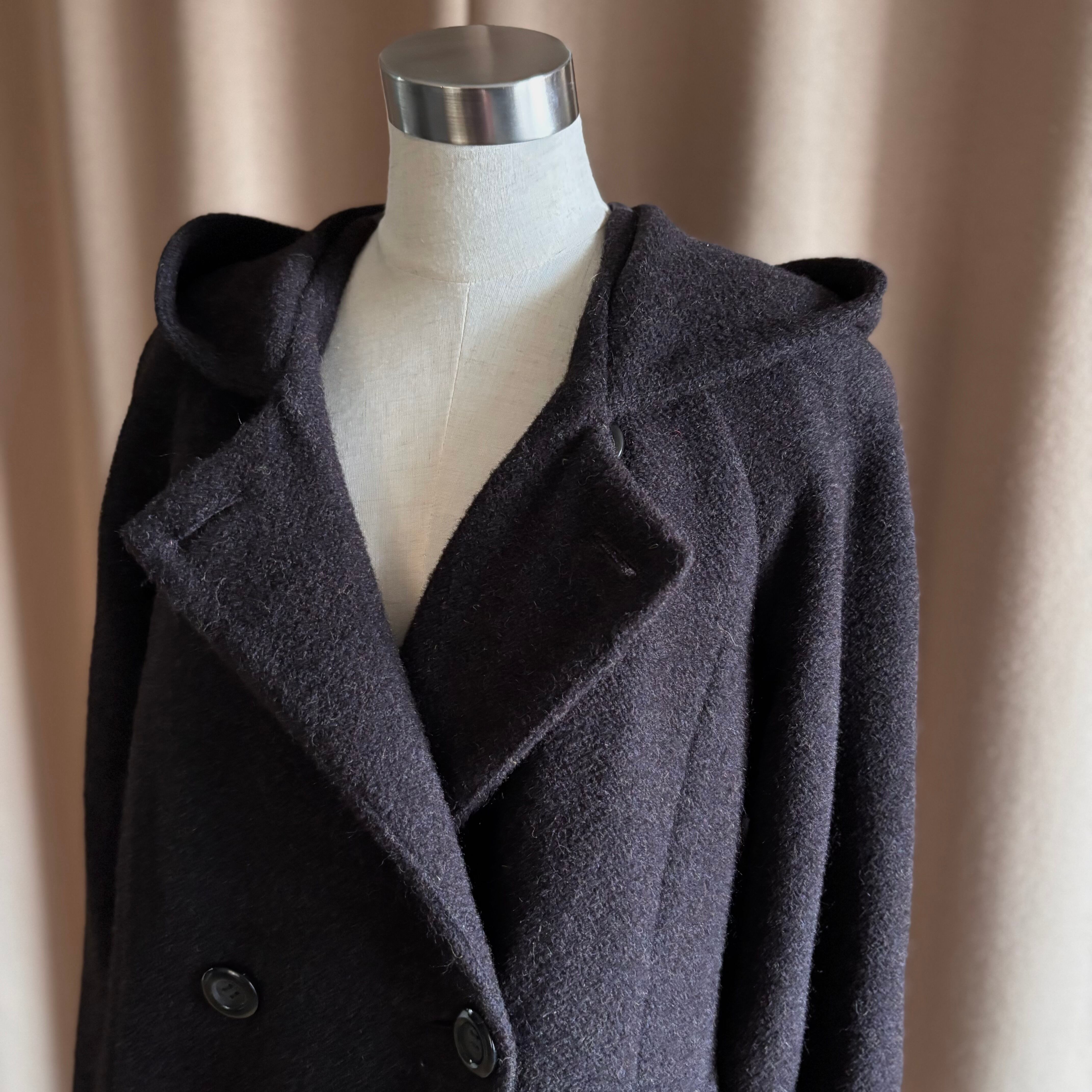 深みのあるダークブラウンにフーディーが旬な日本製ロングコート。